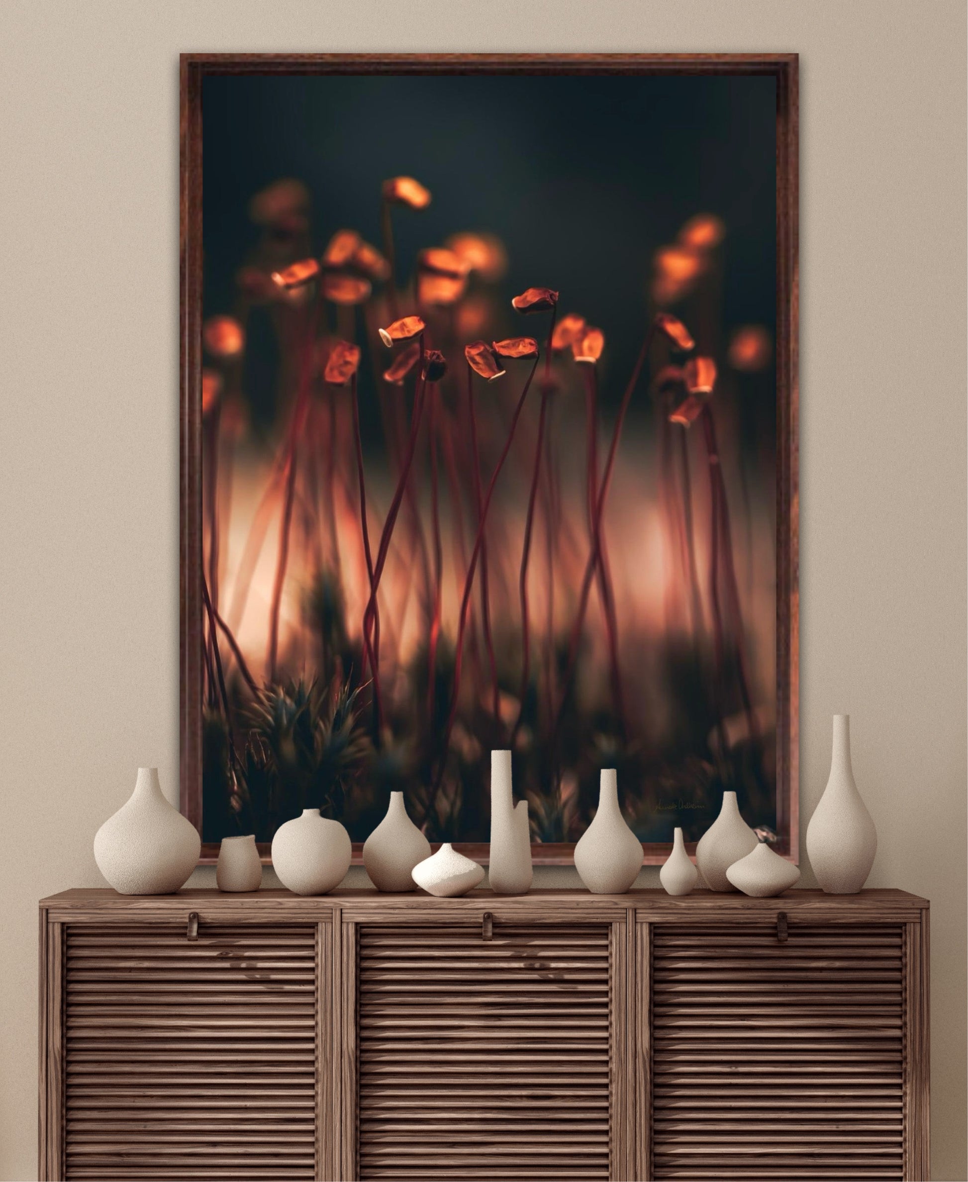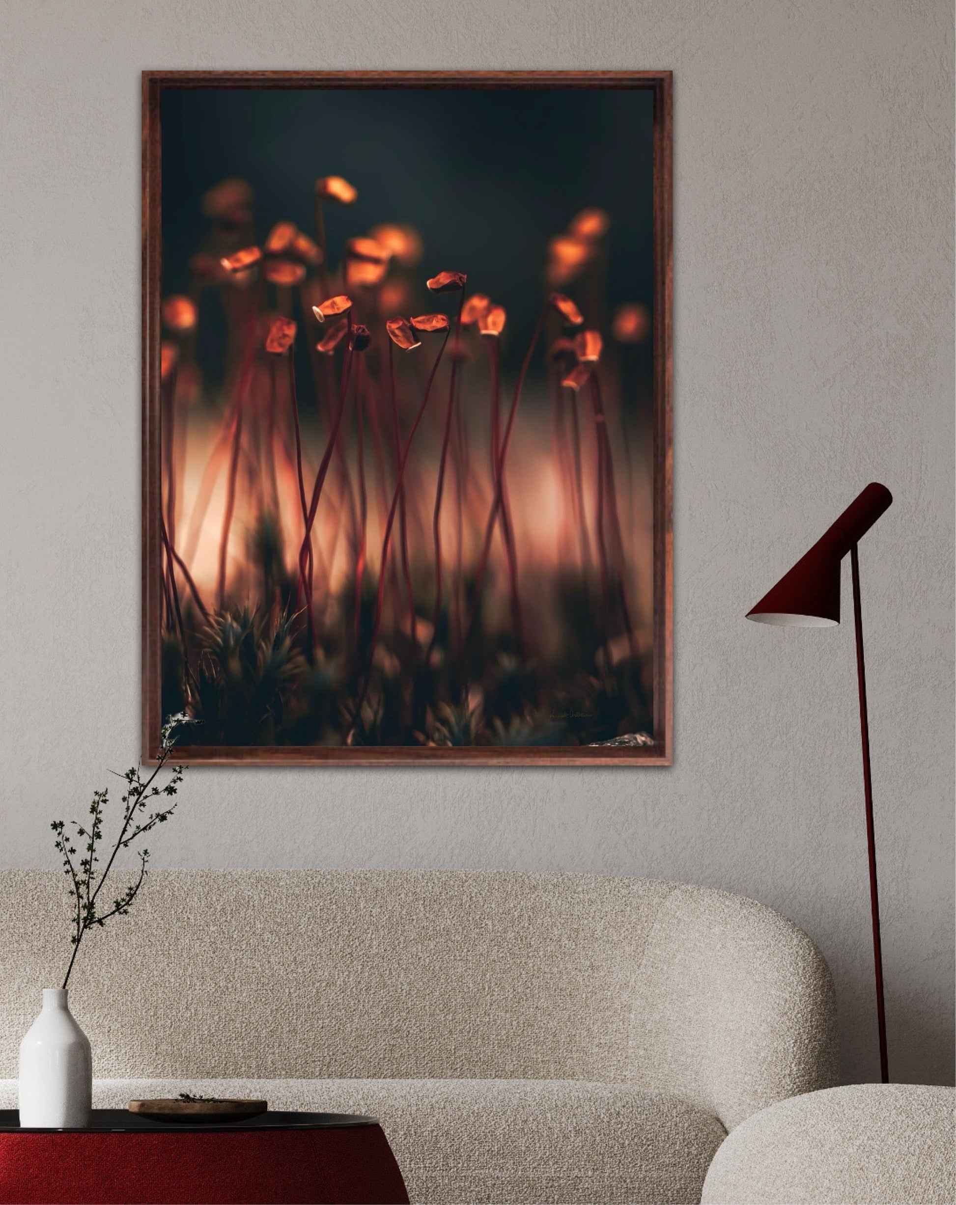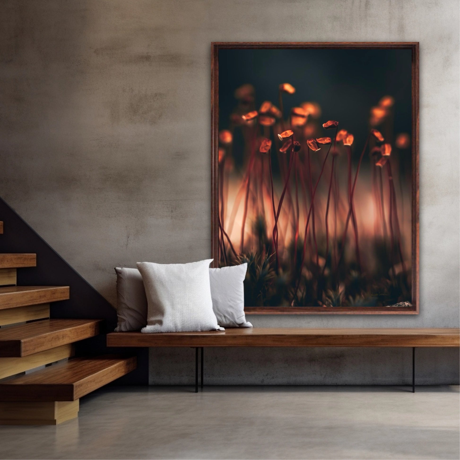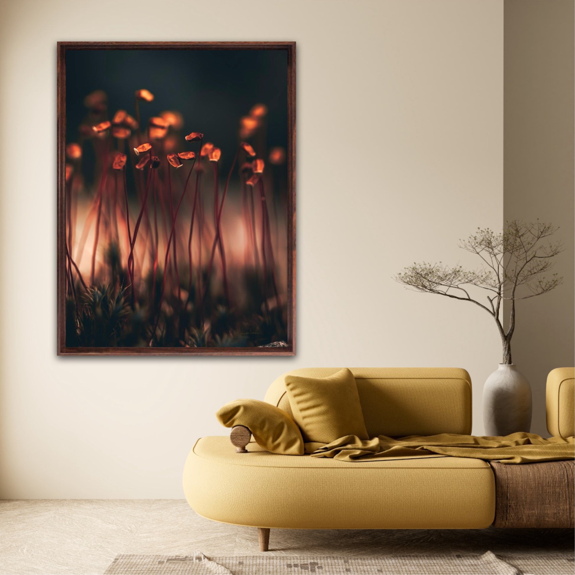 Beautiful photographic wall art of a tiny moss straw in golden, amazing warm light. This artwork will make you feel grounded and at peace.