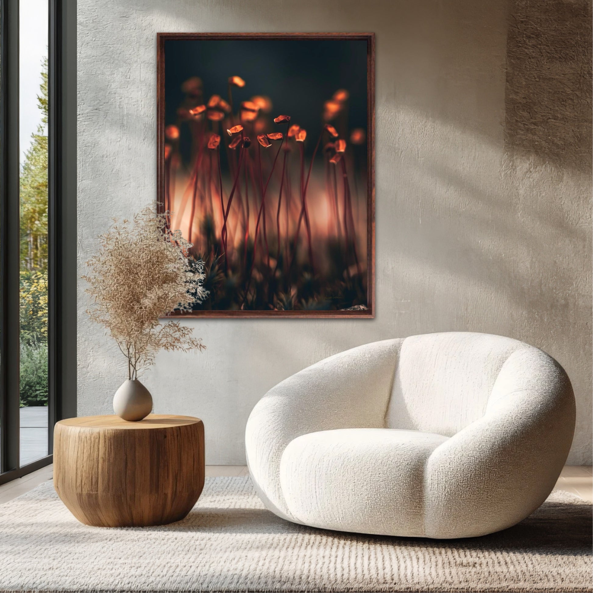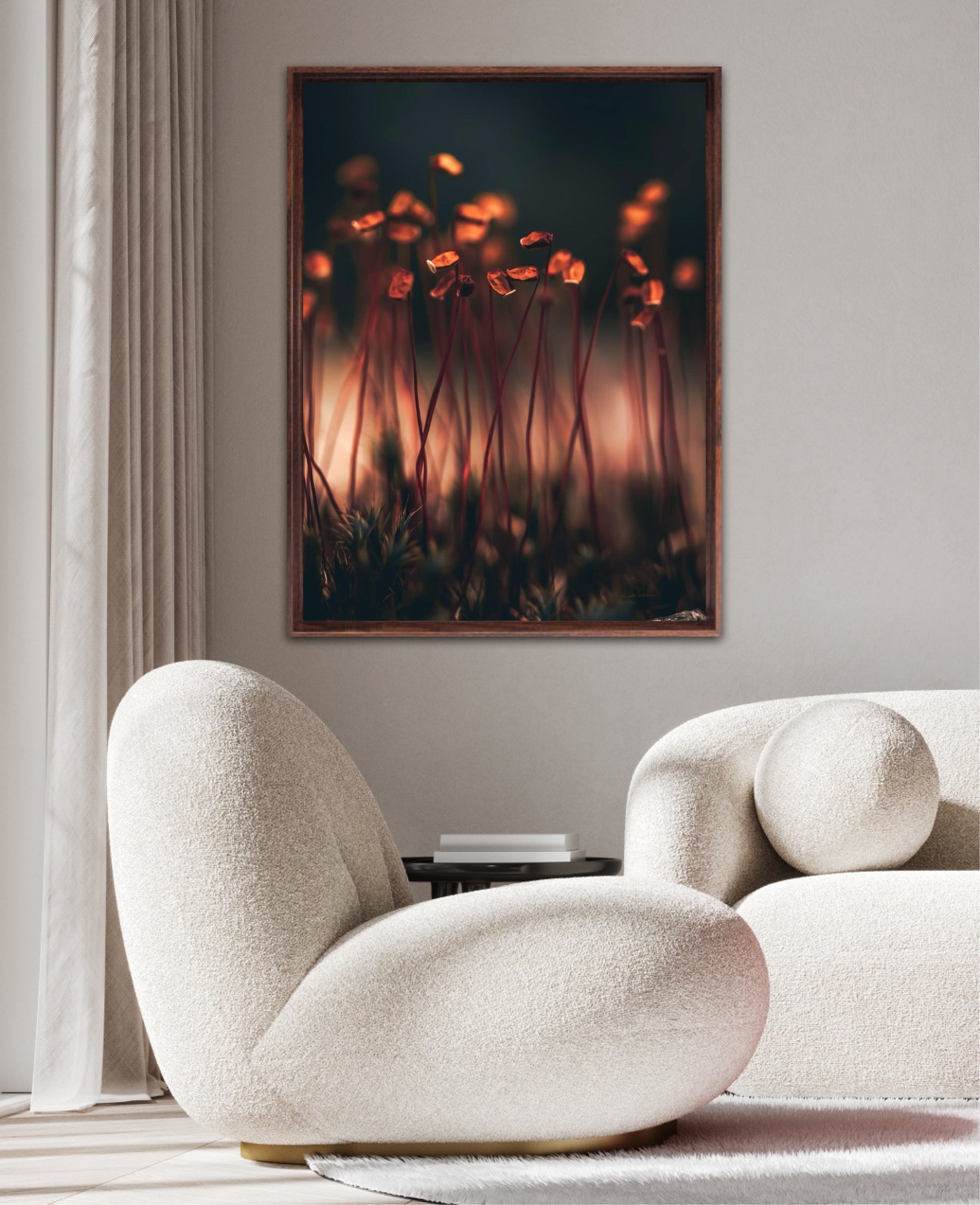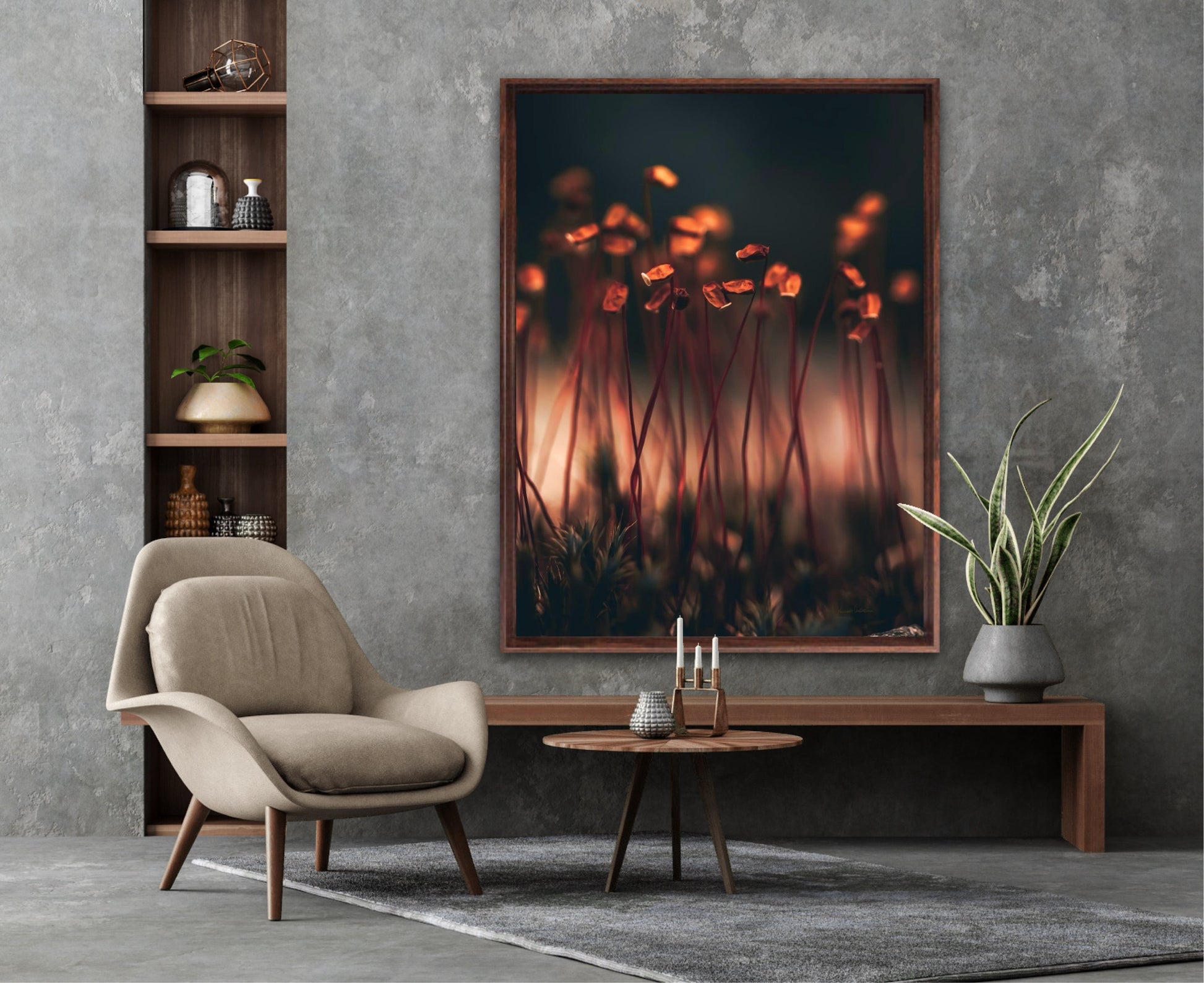 Beautiful photographic wall art of a tiny moss straw in golden, amazing warm light. This artwork will make you feel grounded and at peace.