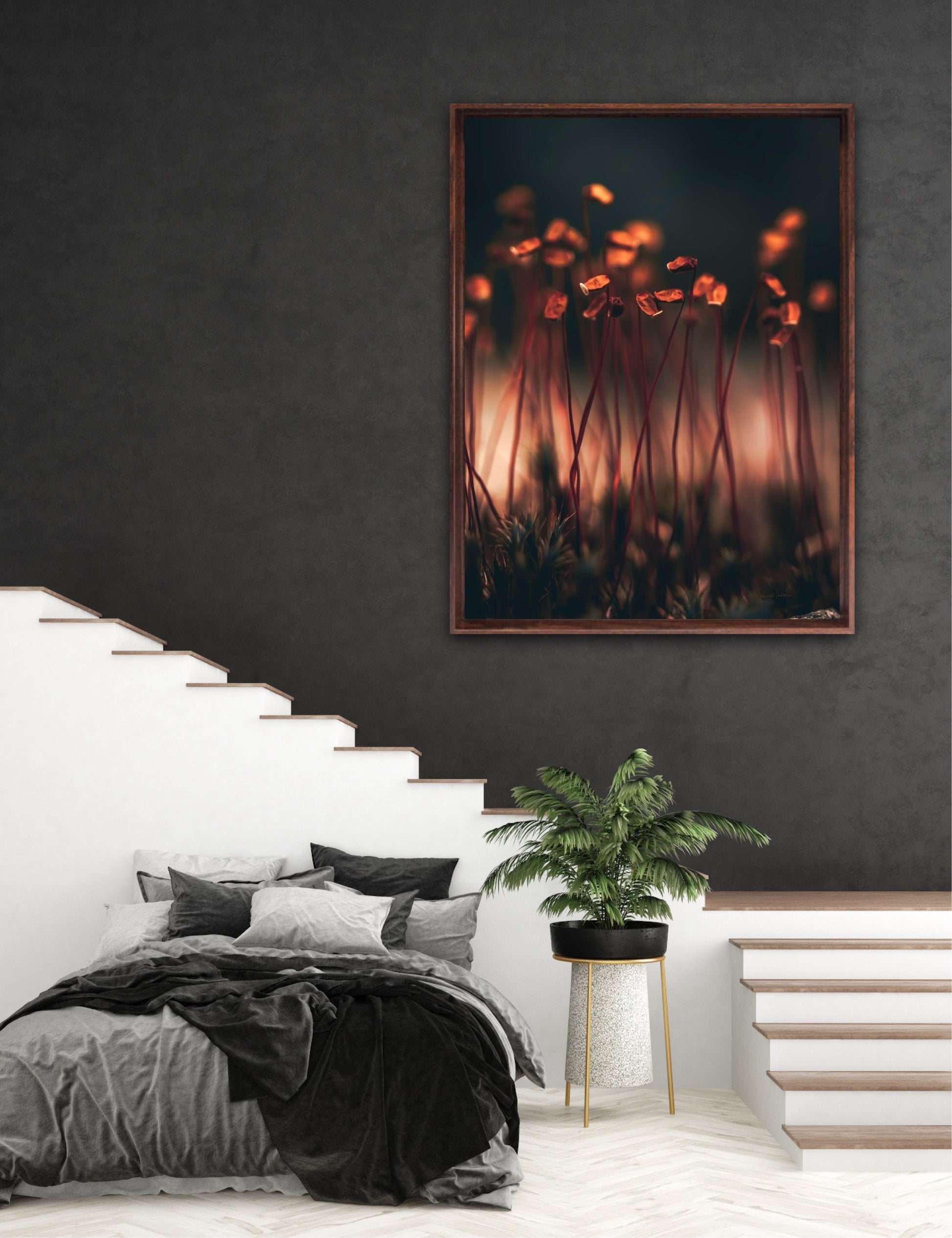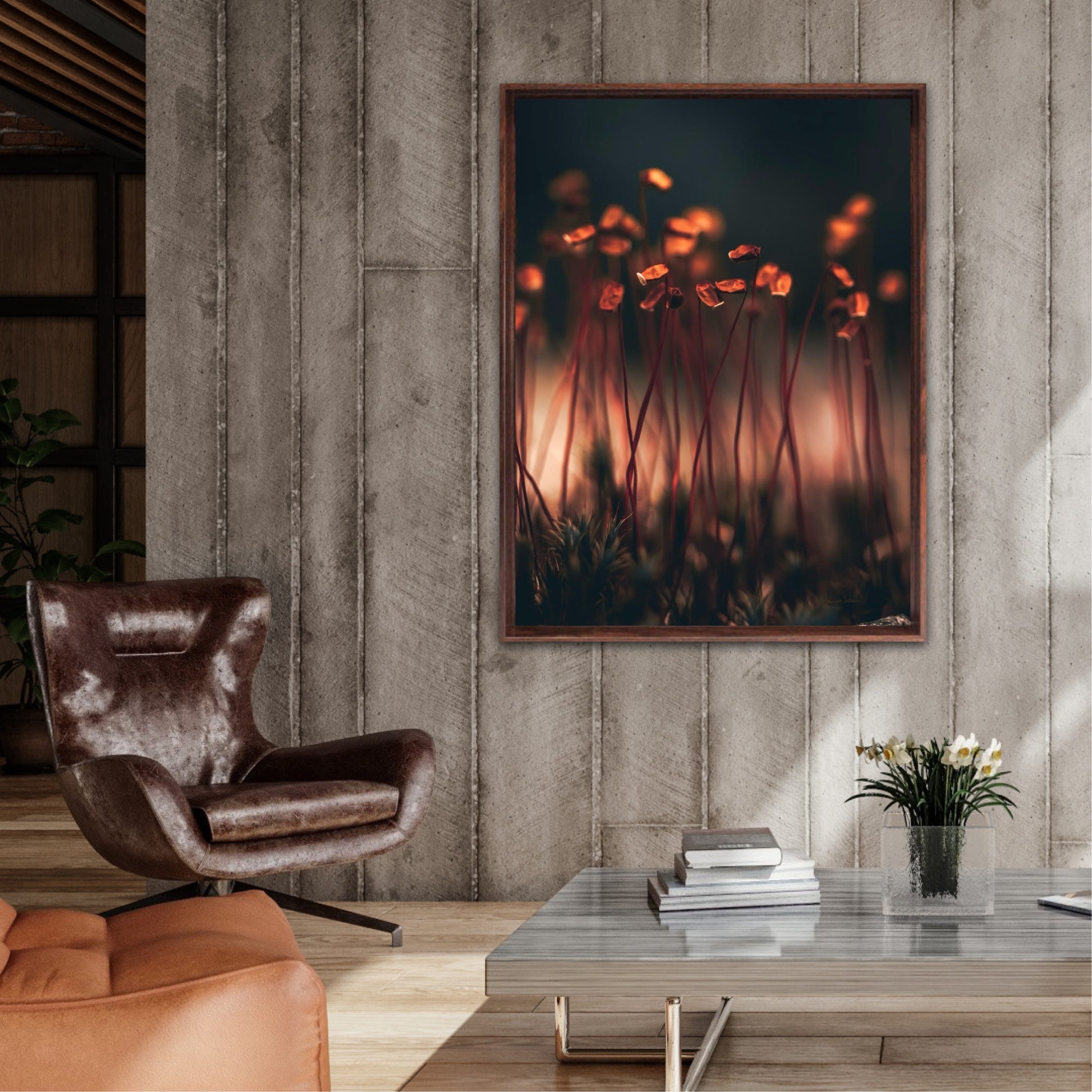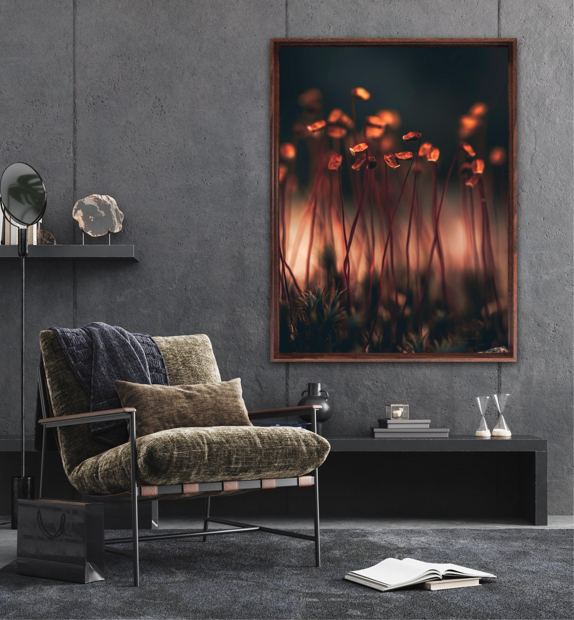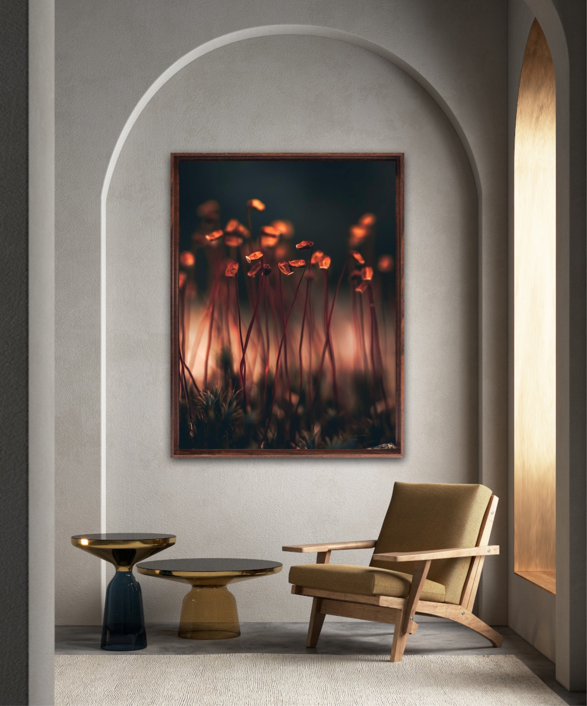 Beautiful photographic wall art of a tiny moss straw in golden, amazing warm light. This artwork will make you feel grounded and at peace.