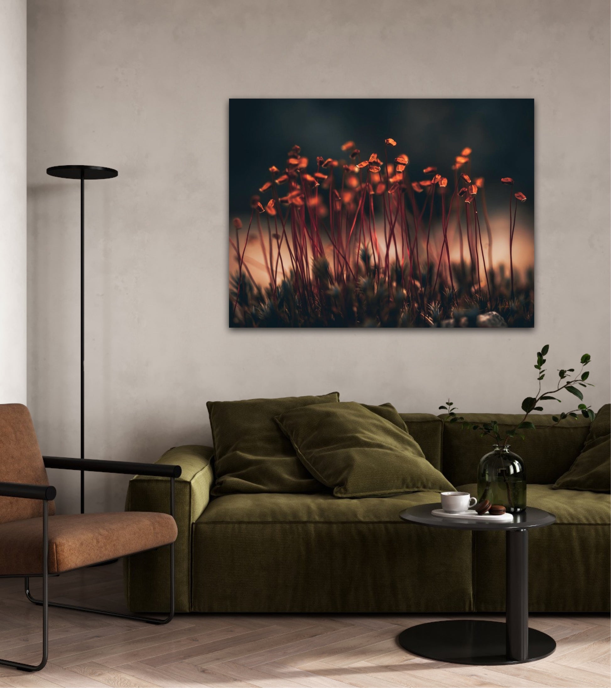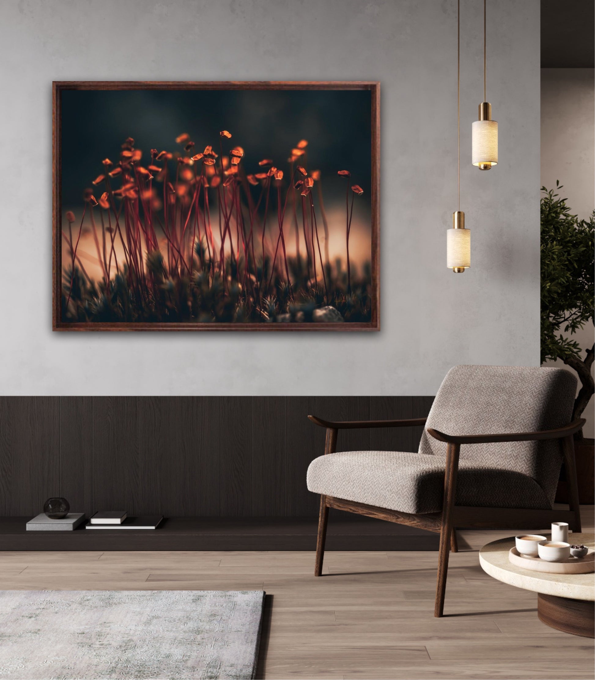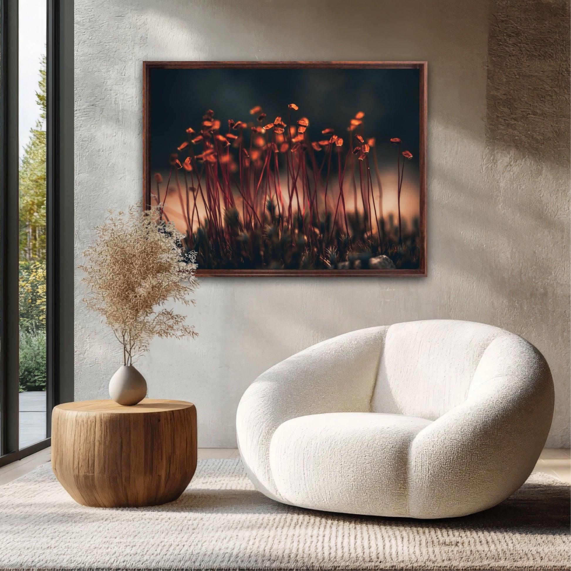 Beautiful photographic wall art of a tiny moss straw in golden, amazing warm light. This artwork will make you feel grounded and at peace.