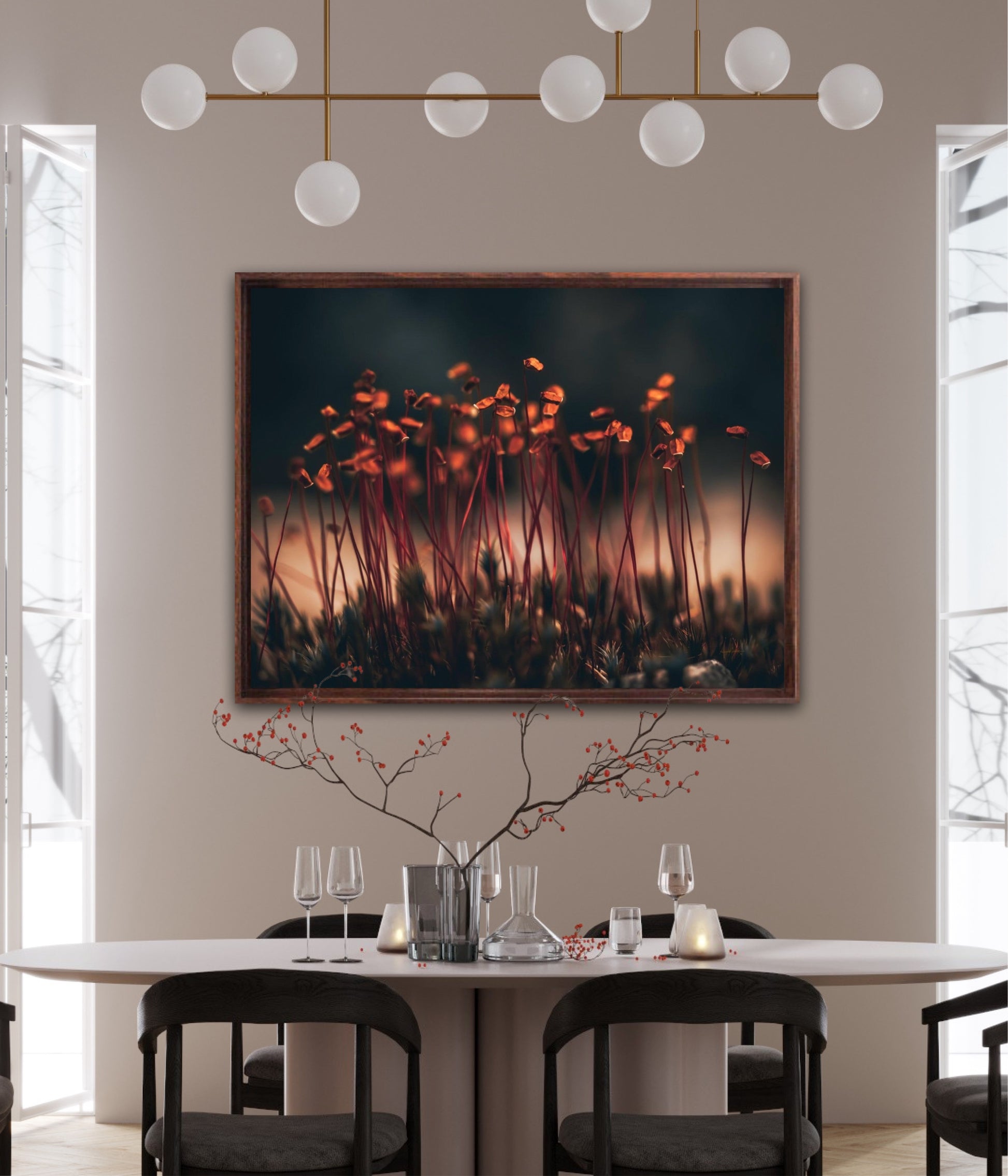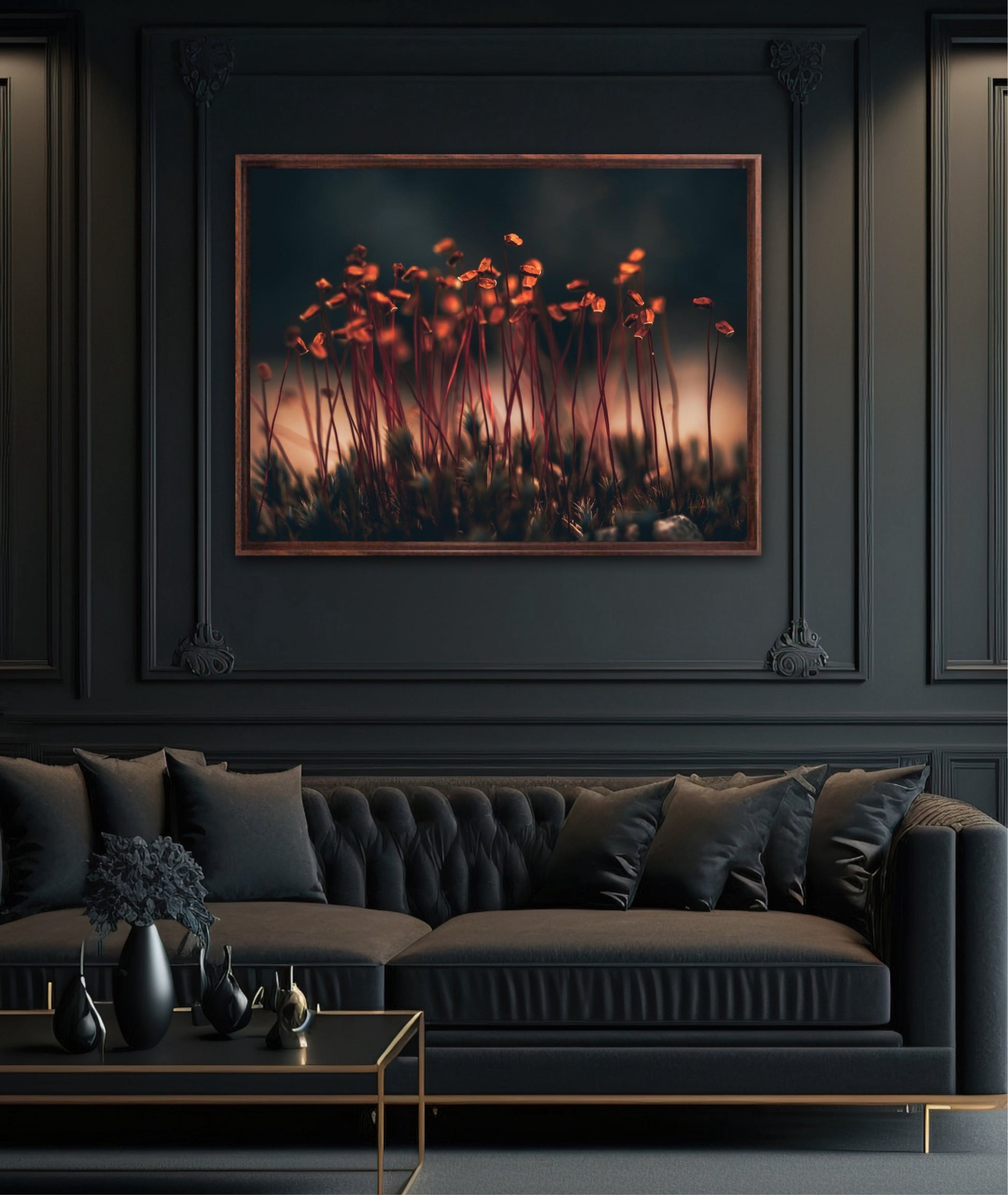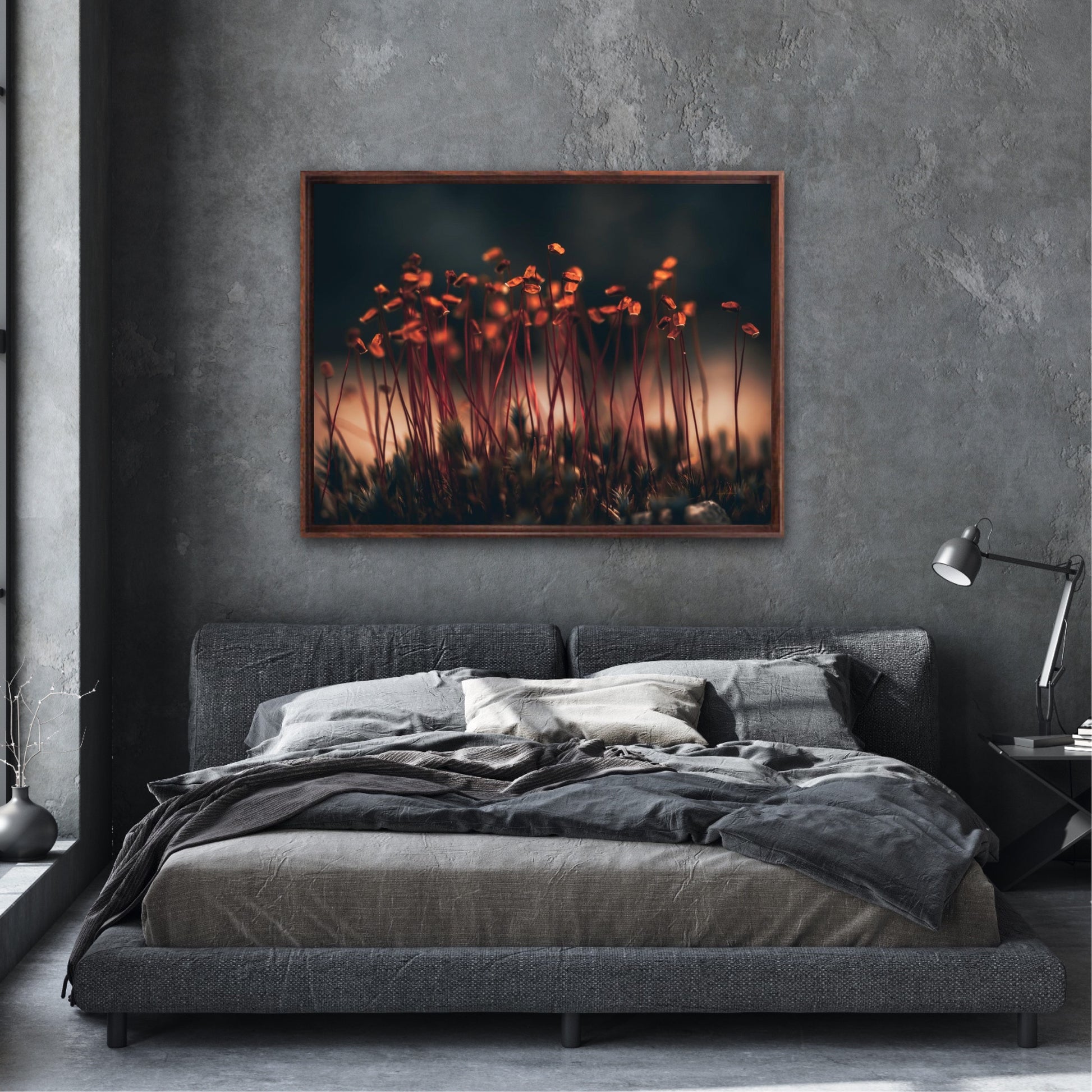 Beautiful photographic wall art of a tiny moss straw in golden, amazing warm light. This artwork will make you feel grounded and at peace.