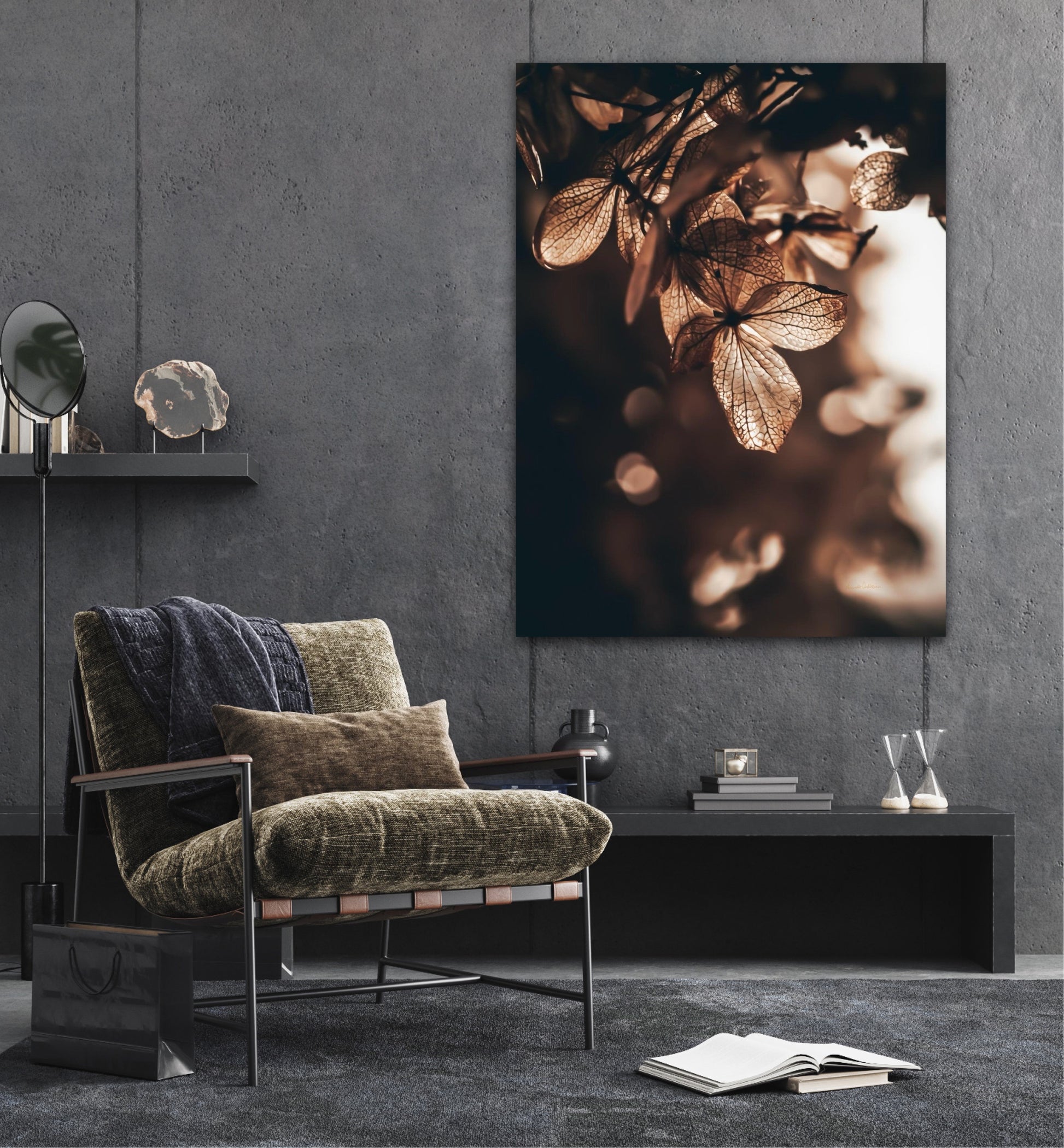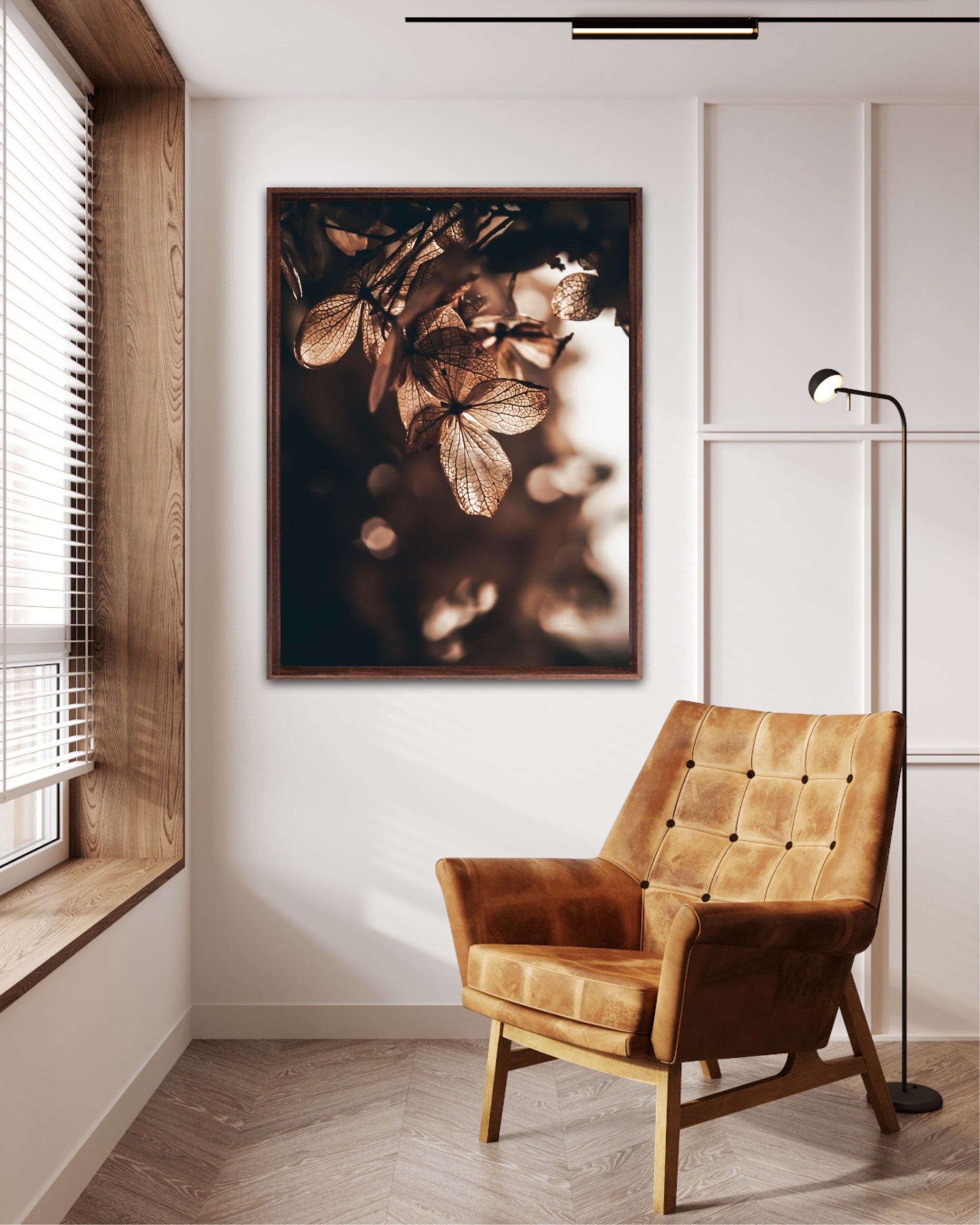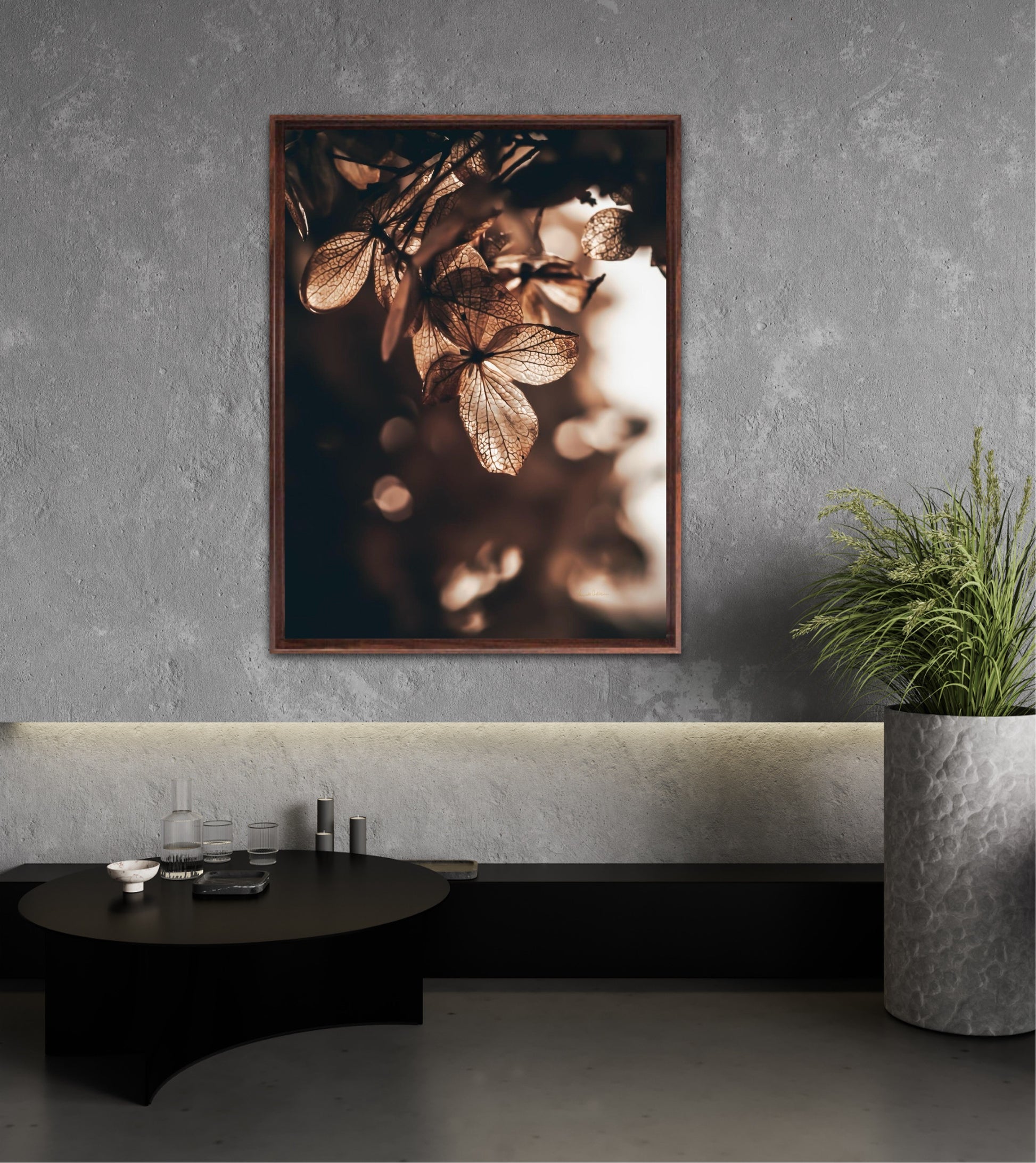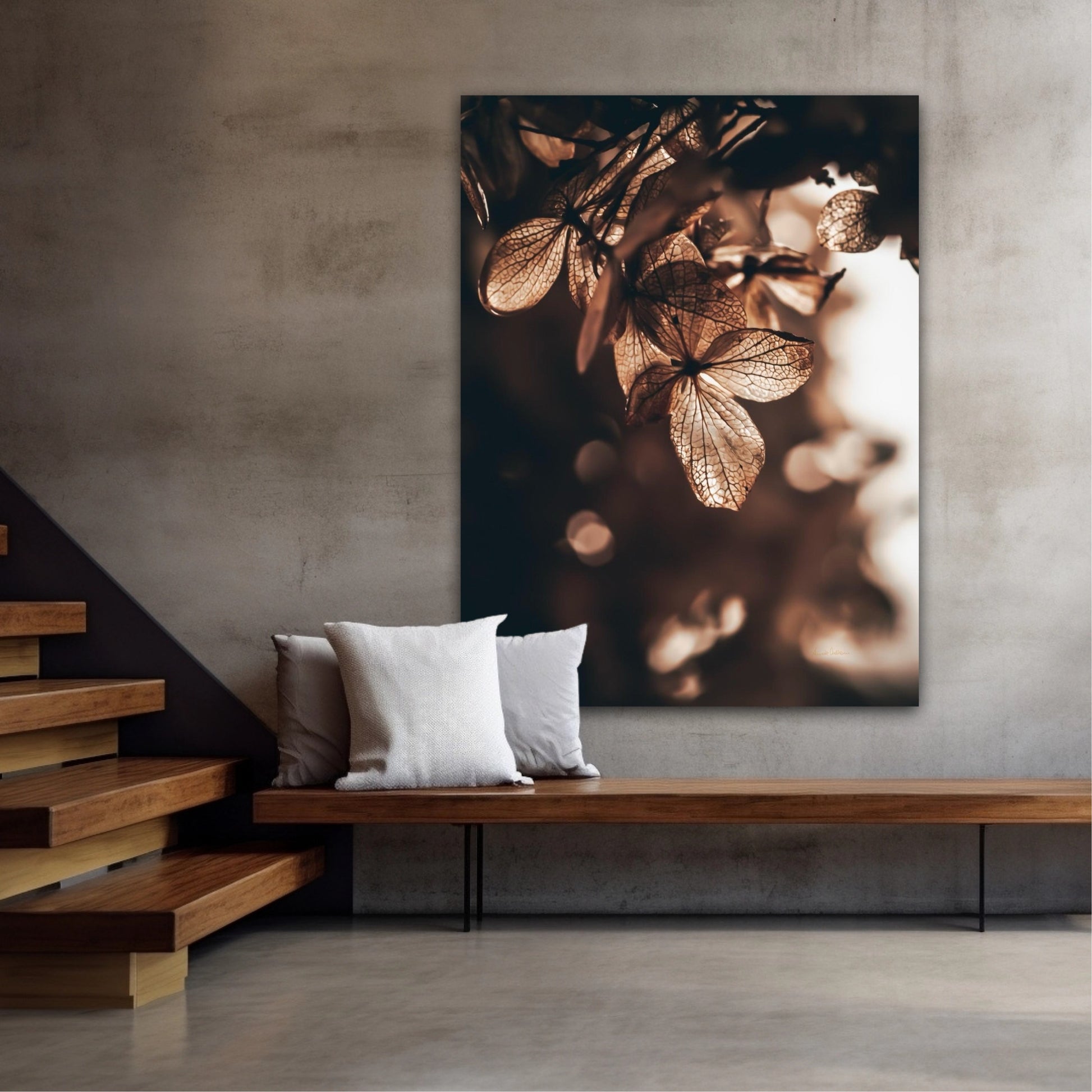 Striking photographic wall art of a withered hydrangea close up in stunning brown tones, with beautiful details and dramatic light. This artwork will be a stand-out piece in your home and bring you peace and tranquility.