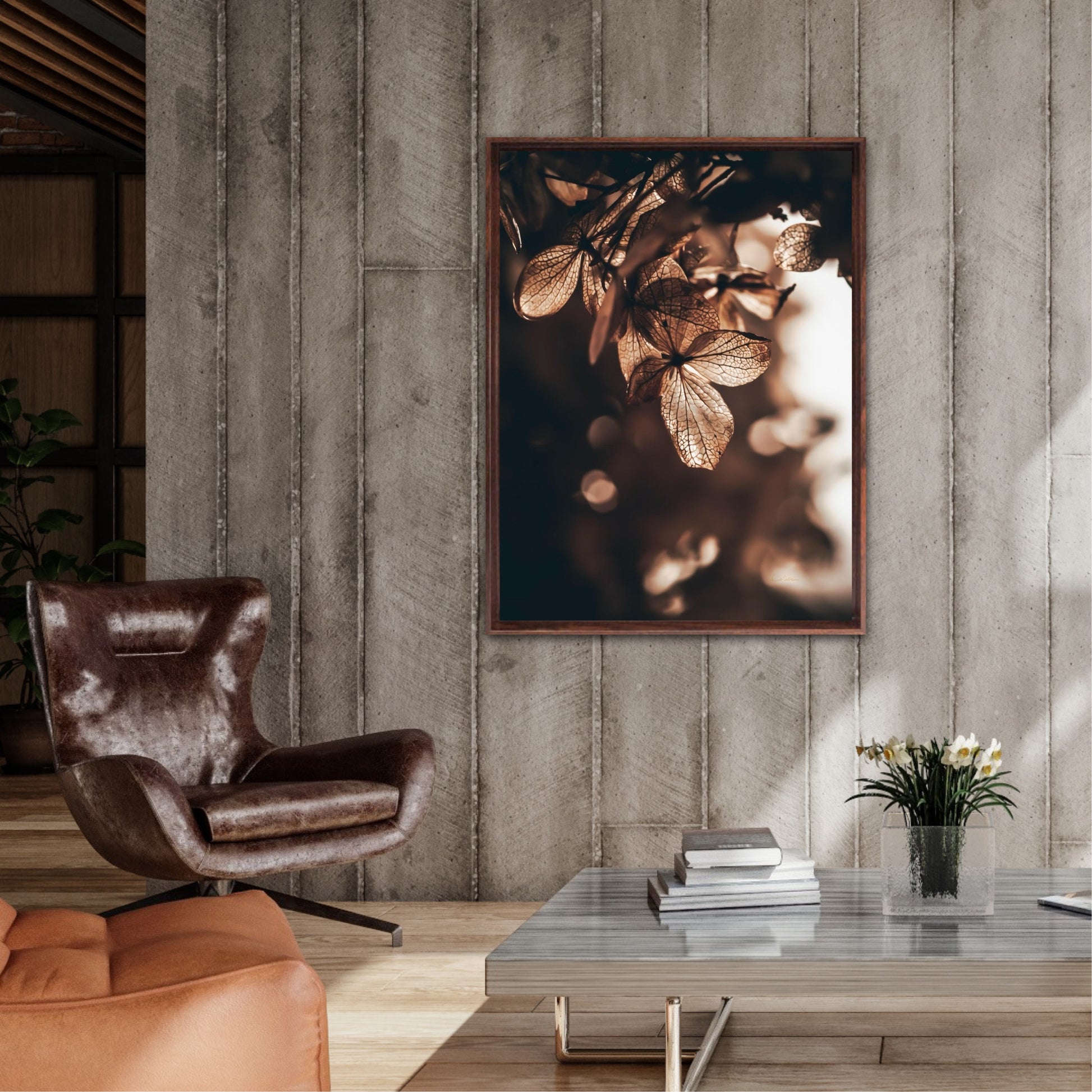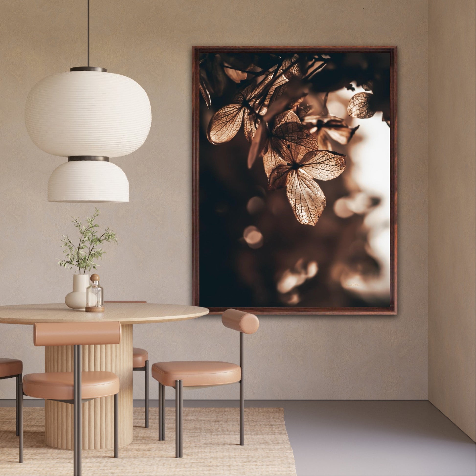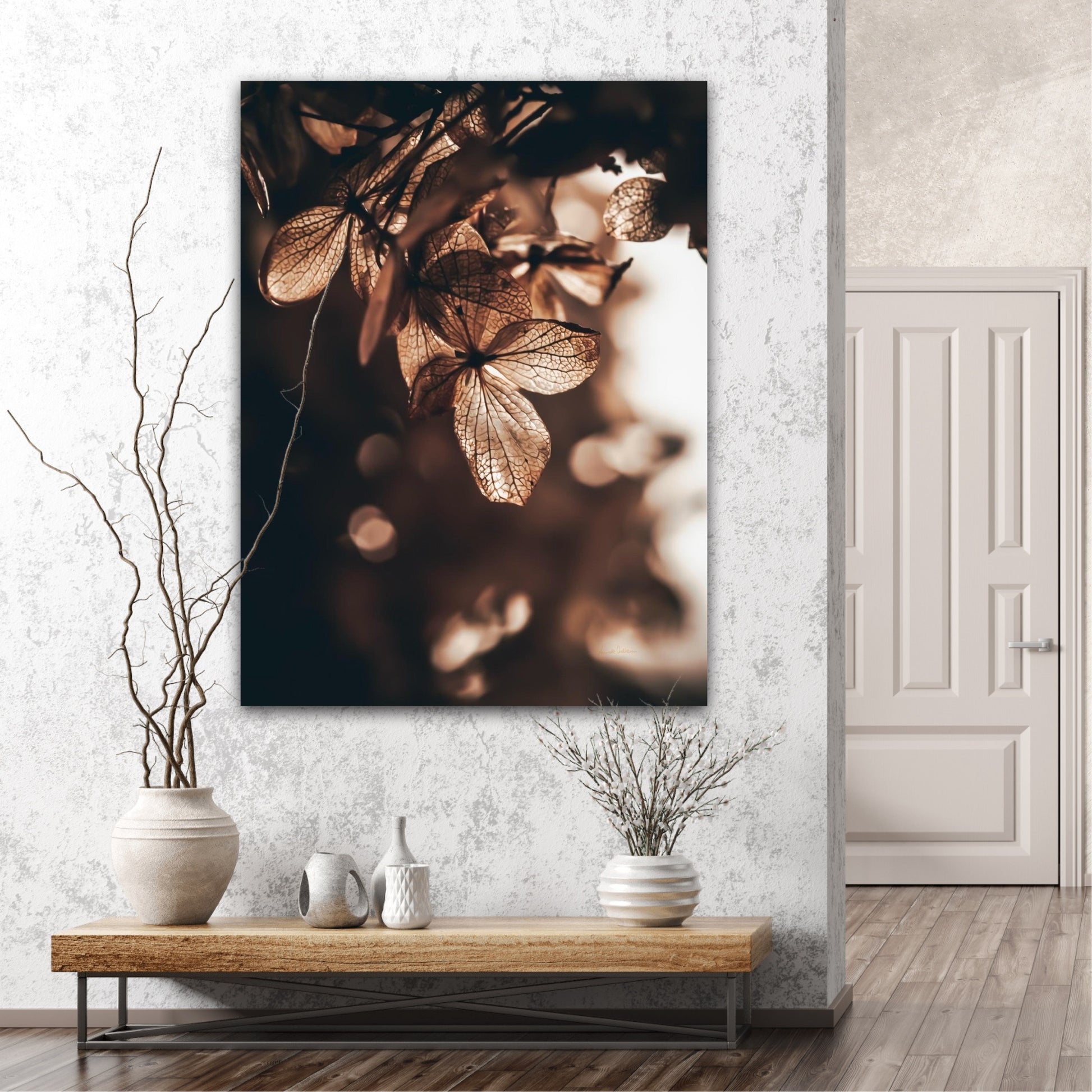 Striking photographic wall art of a withered hydrangea close up in stunning brown tones, with beautiful details and dramatic light. This artwork will be a stand-out piece in your home and bring you peace and tranquility.