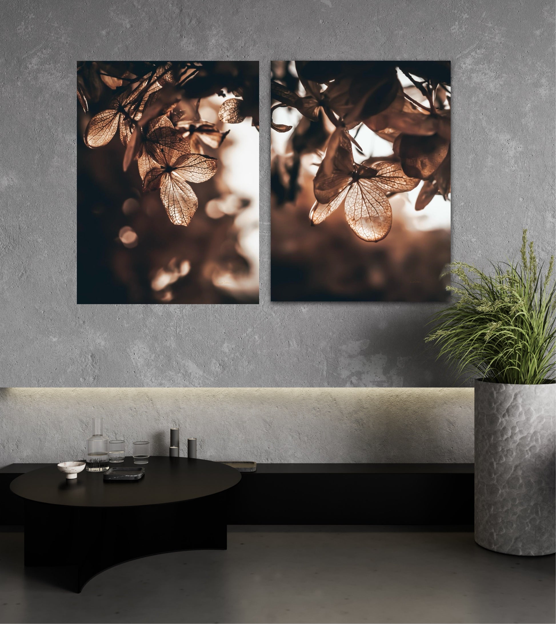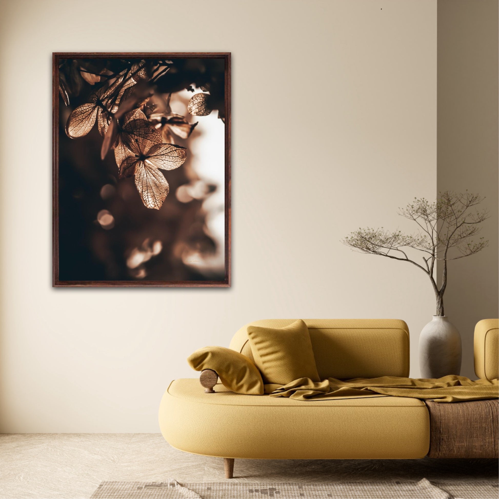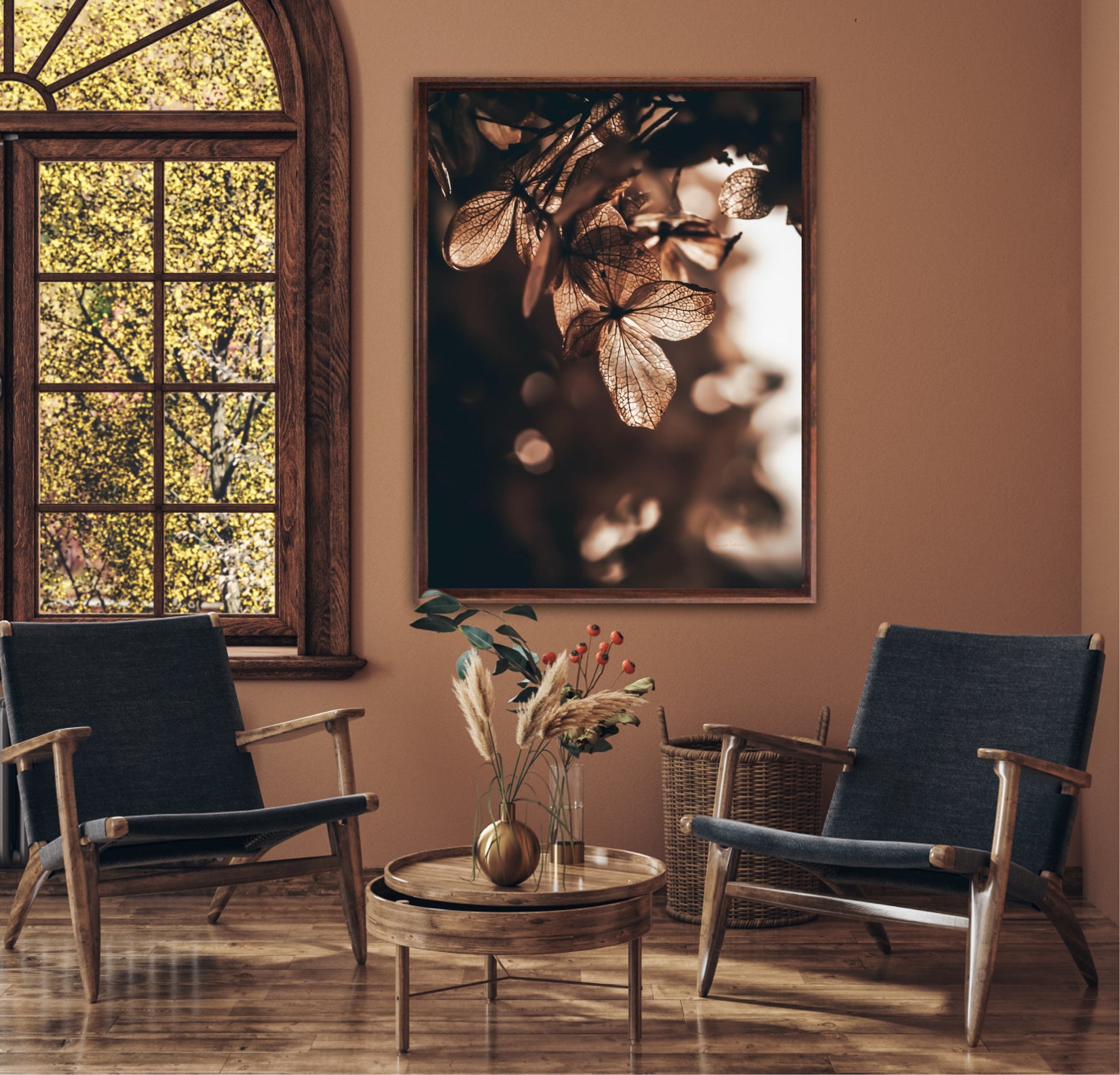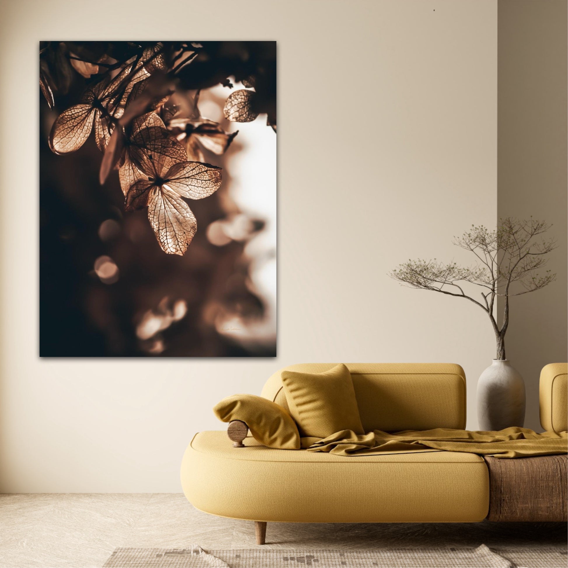 Striking photographic wall art of a withered hydrangea close up in stunning brown tones, with beautiful details and dramatic light. This artwork will be a stand-out piece in your home and bring you peace and tranquility.