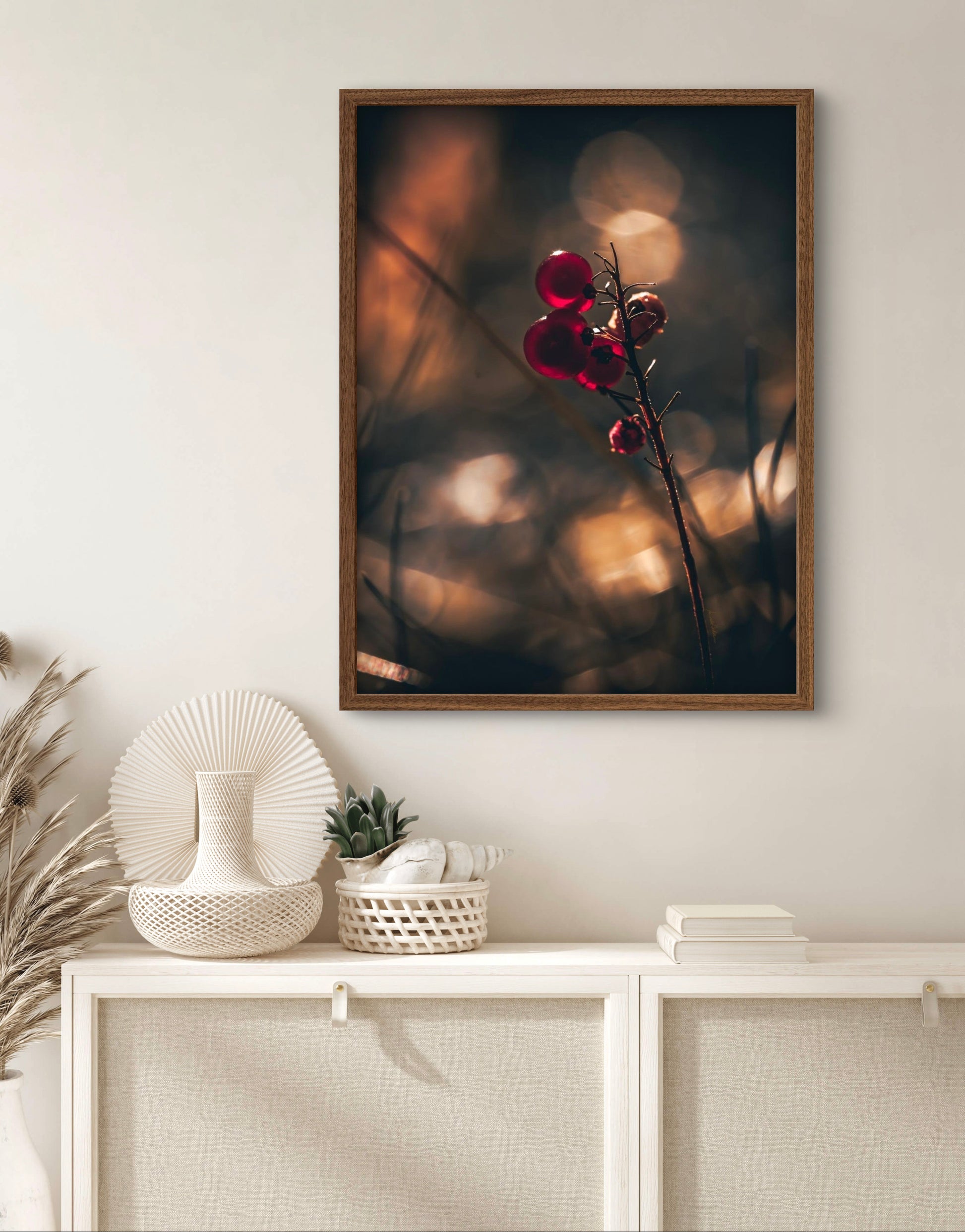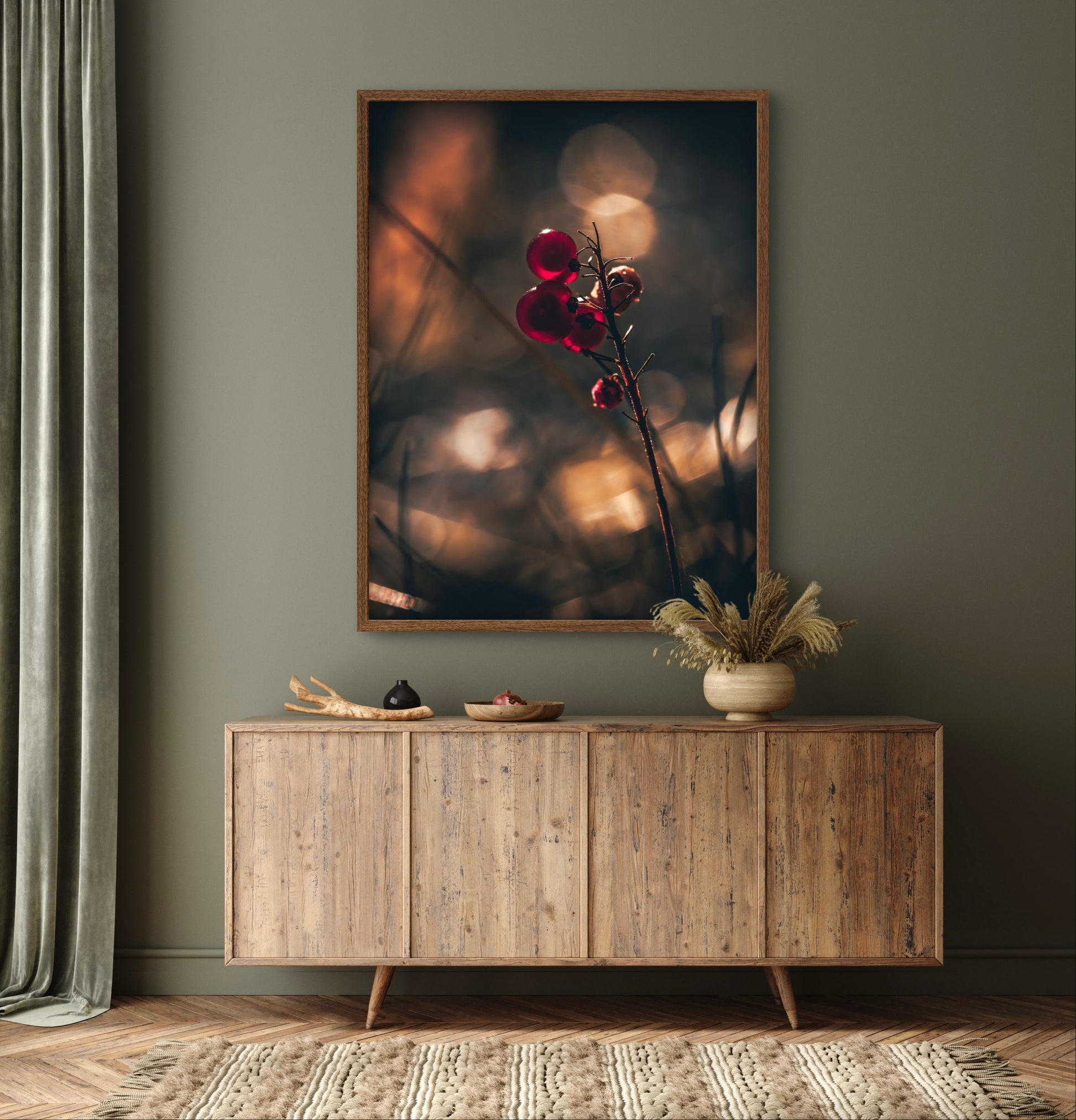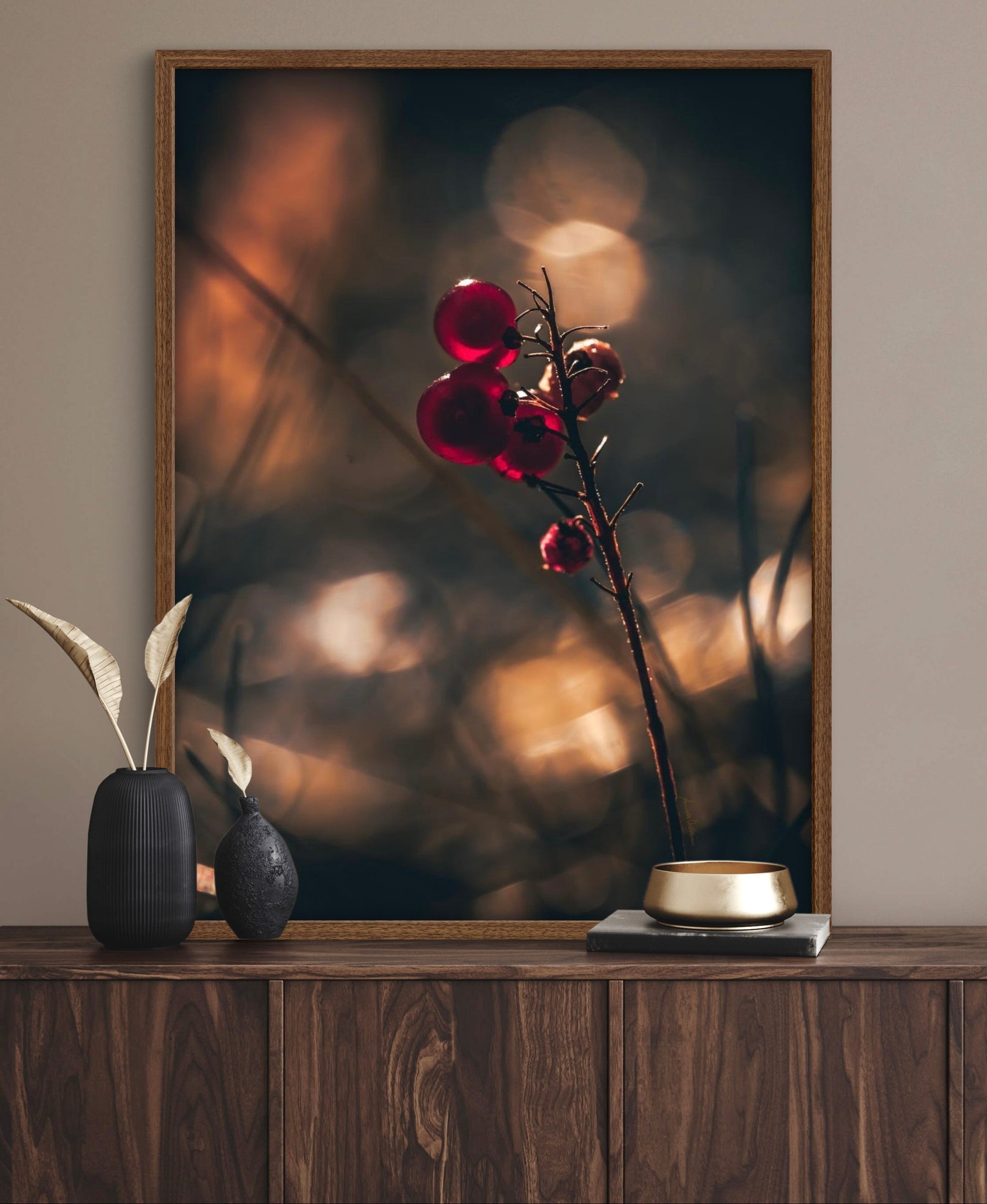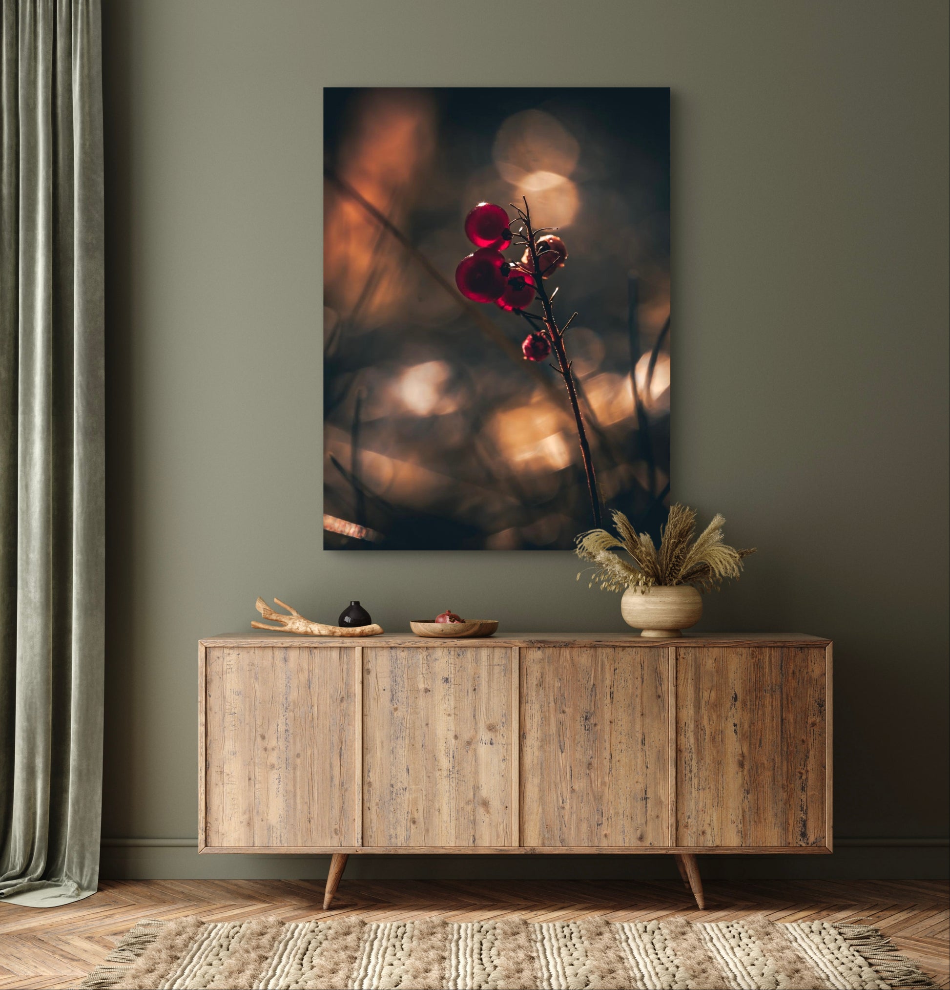 Beautiful photographic wall art of red berries on a stem in dark red tones with the light shining through. The background is atmospheric with beautiful golden light in different shades of gold and brown.