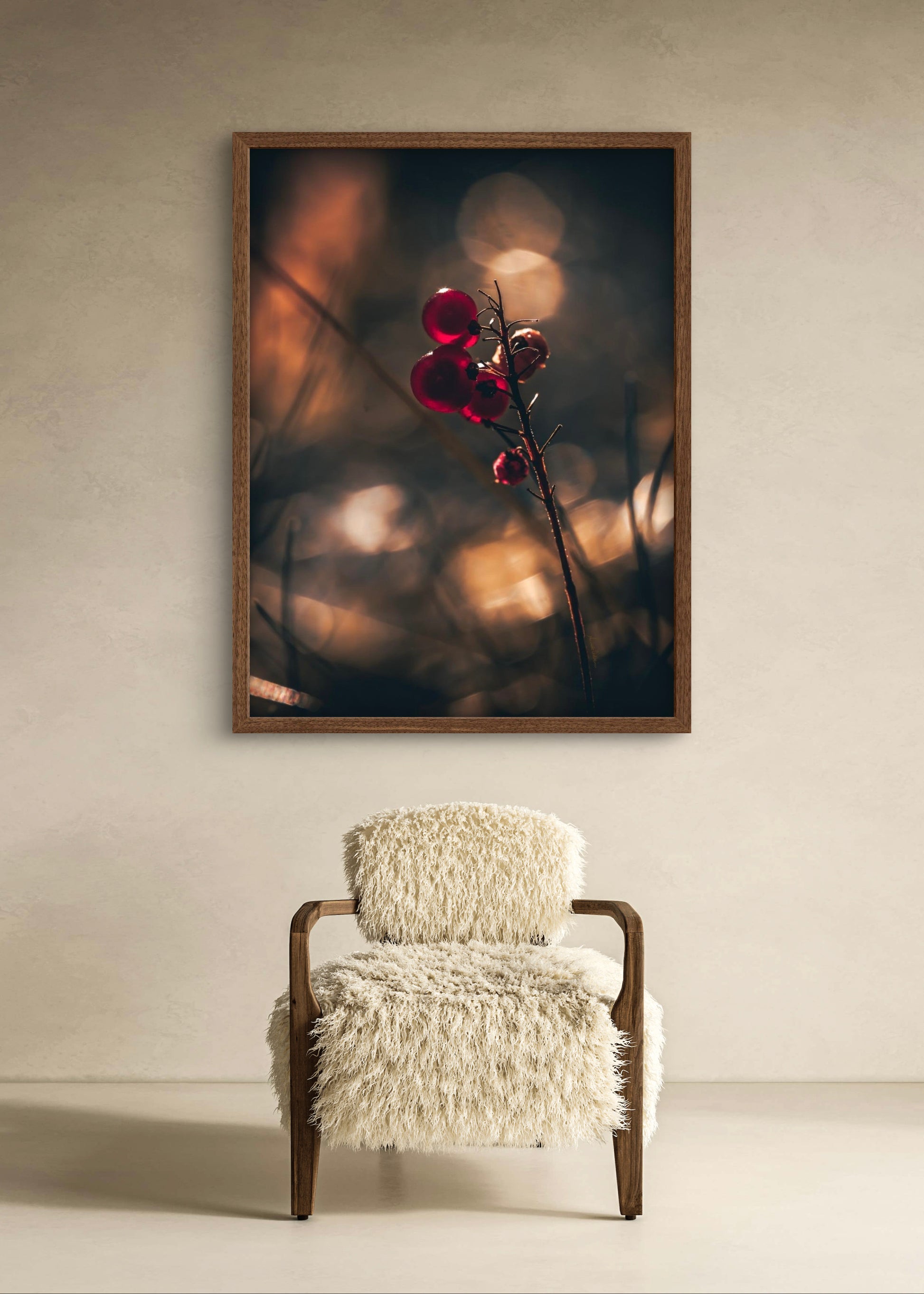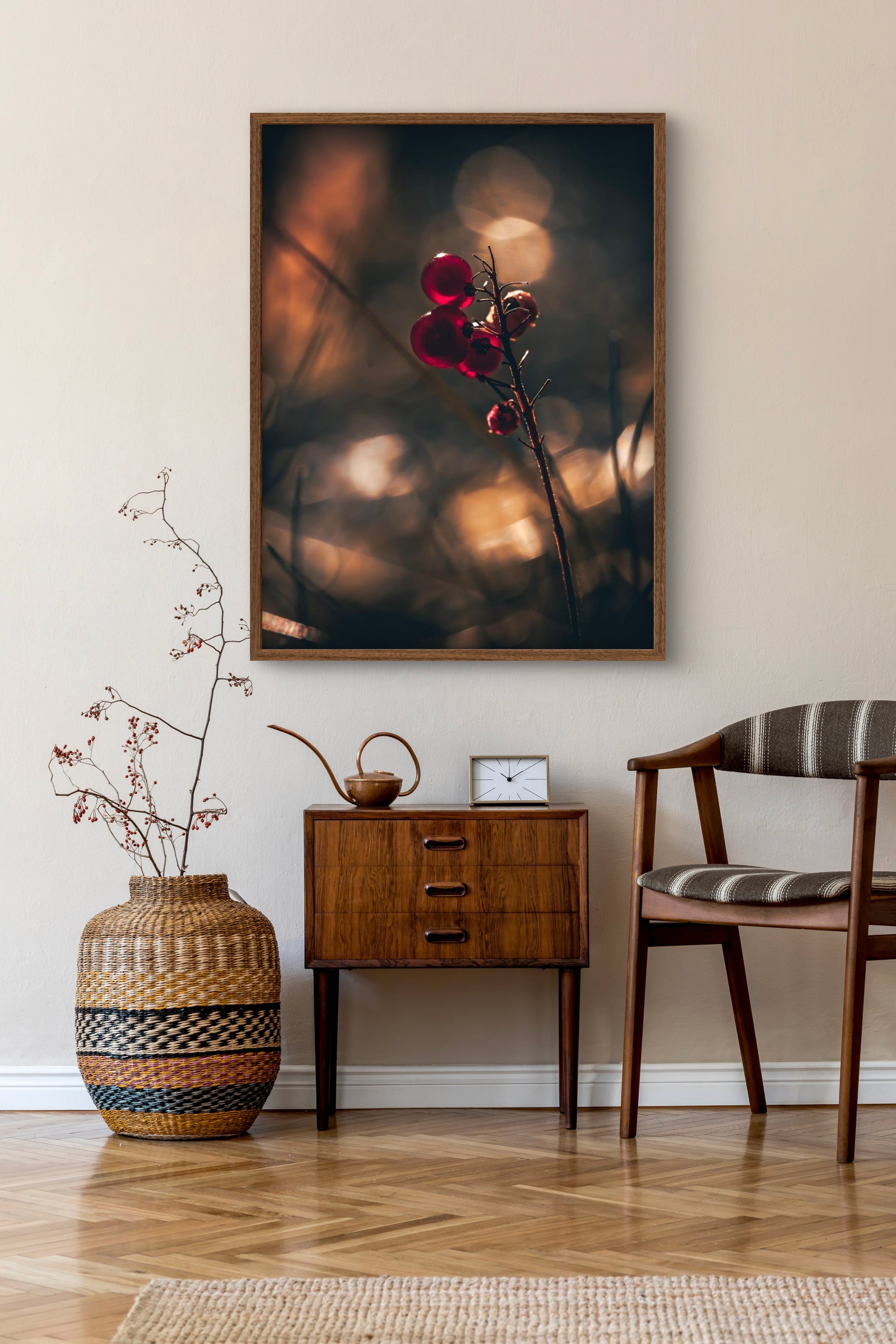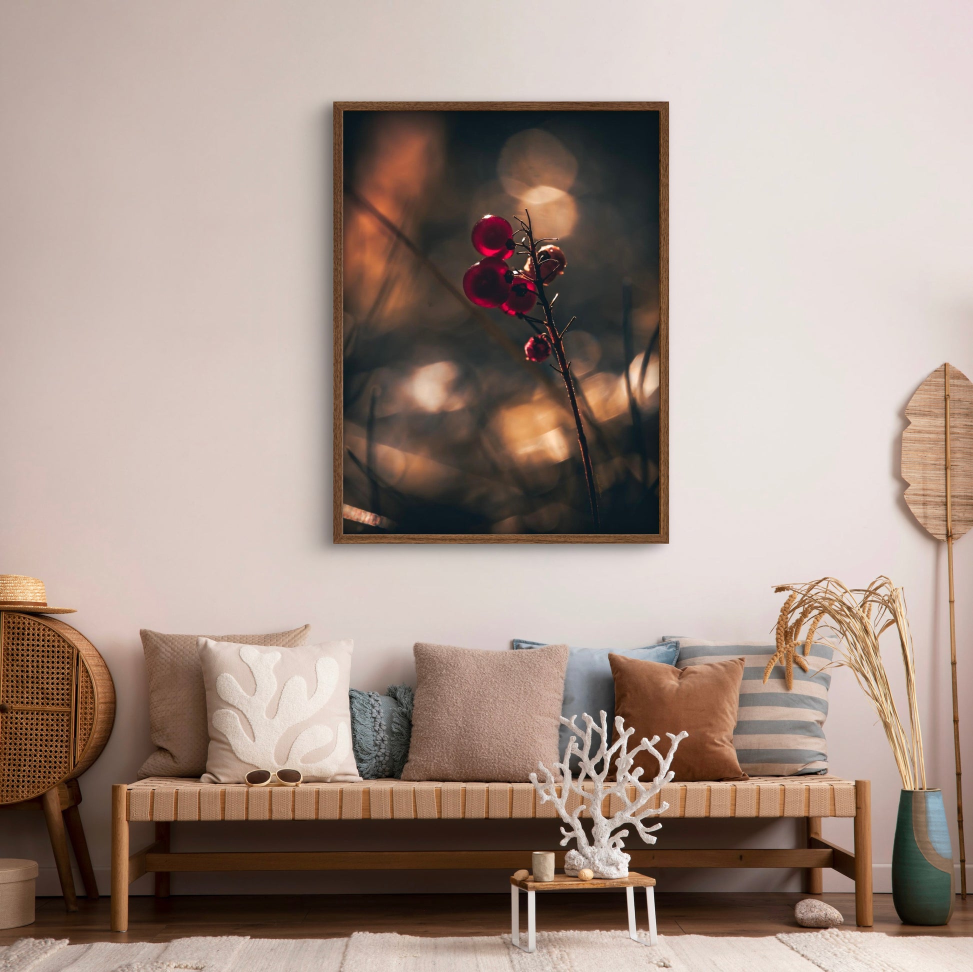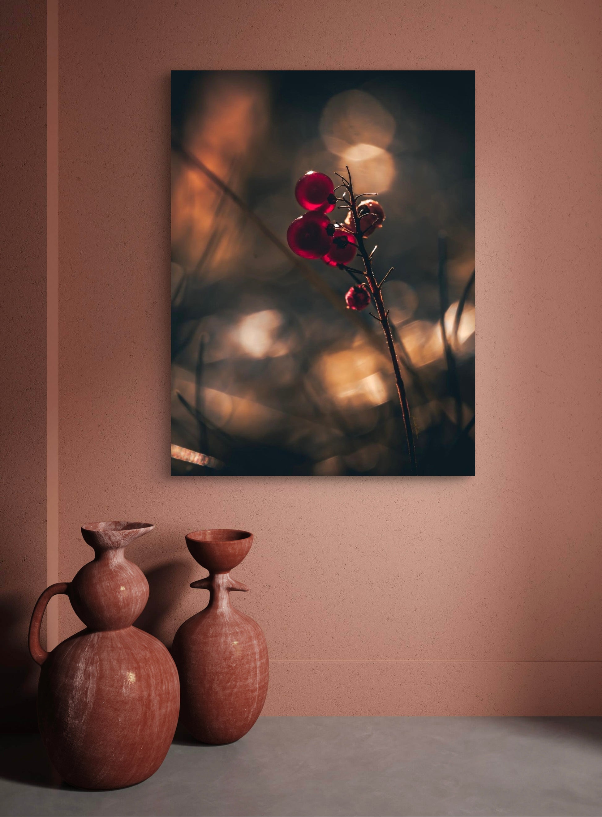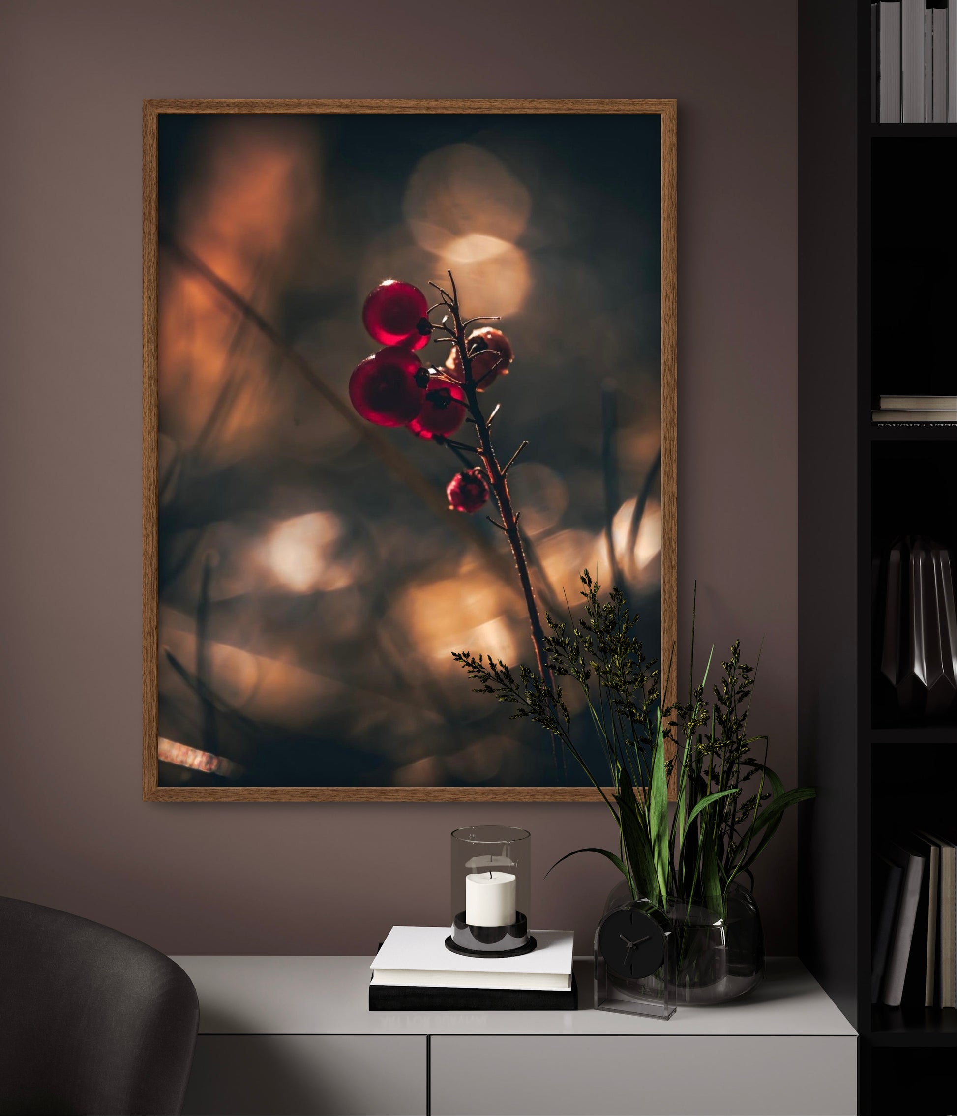 Beautiful photographic wall art of red berries on a stem in dark red tones with the light shining through. The background is atmospheric with beautiful golden light in different shades of gold and brown.