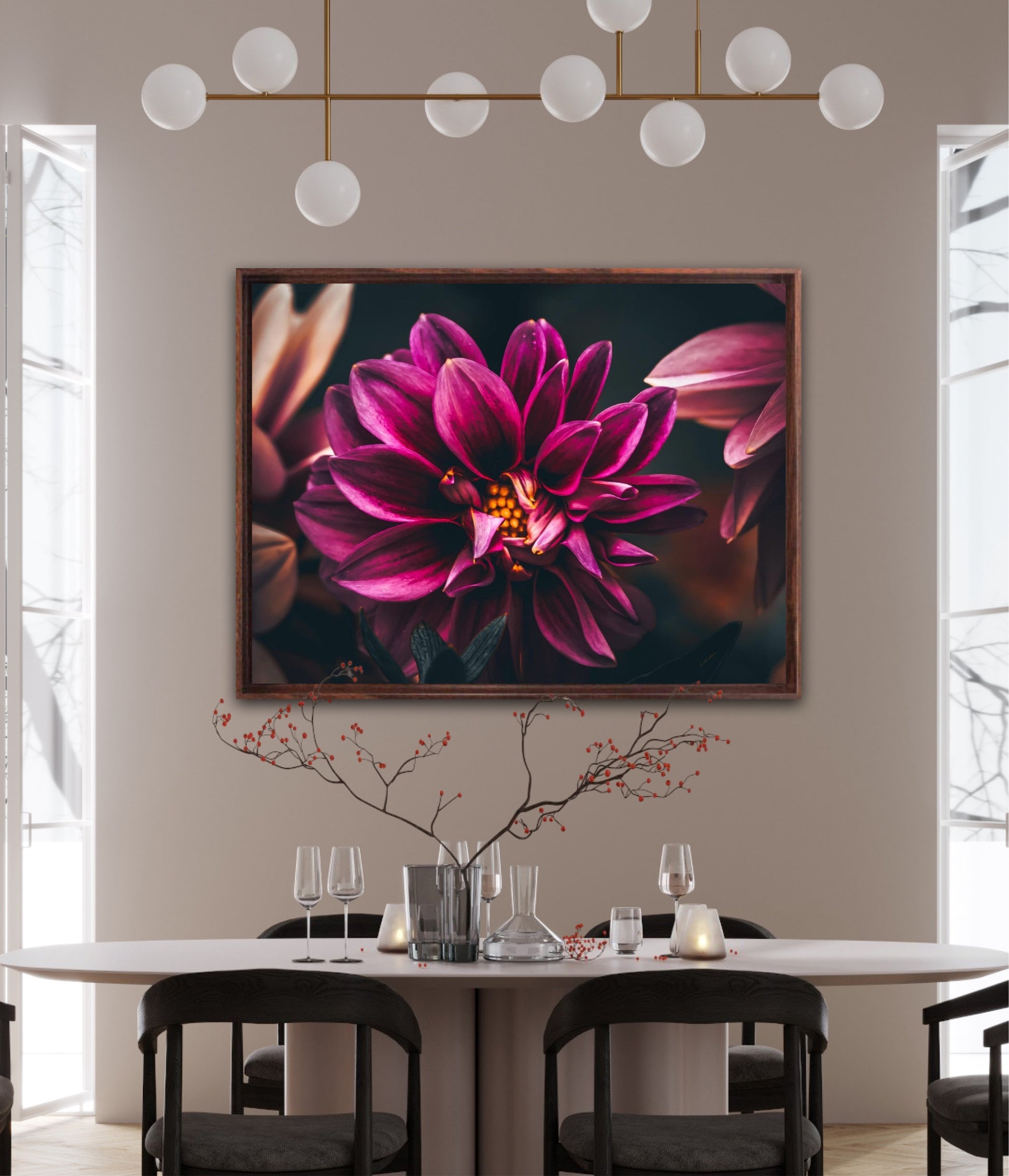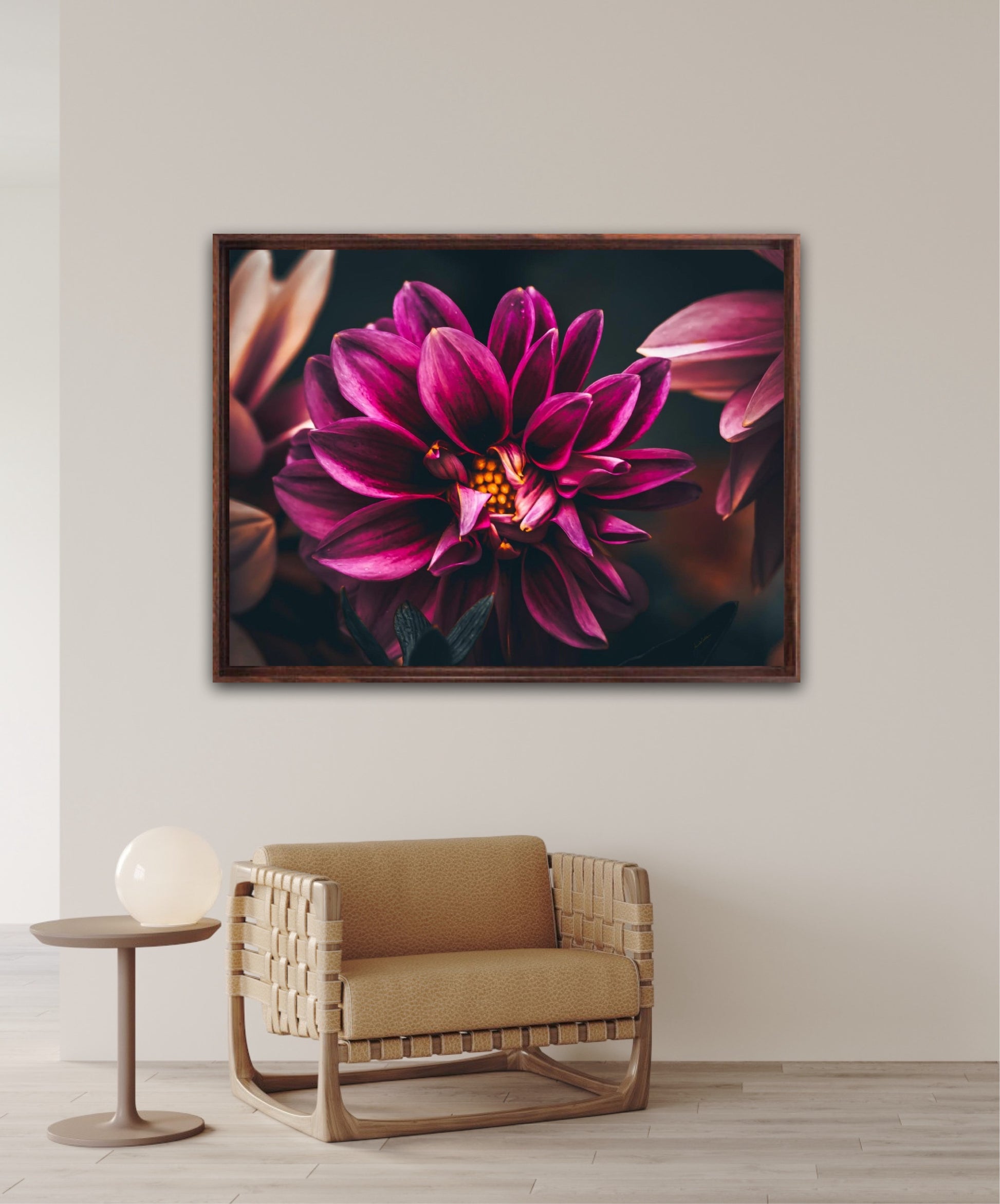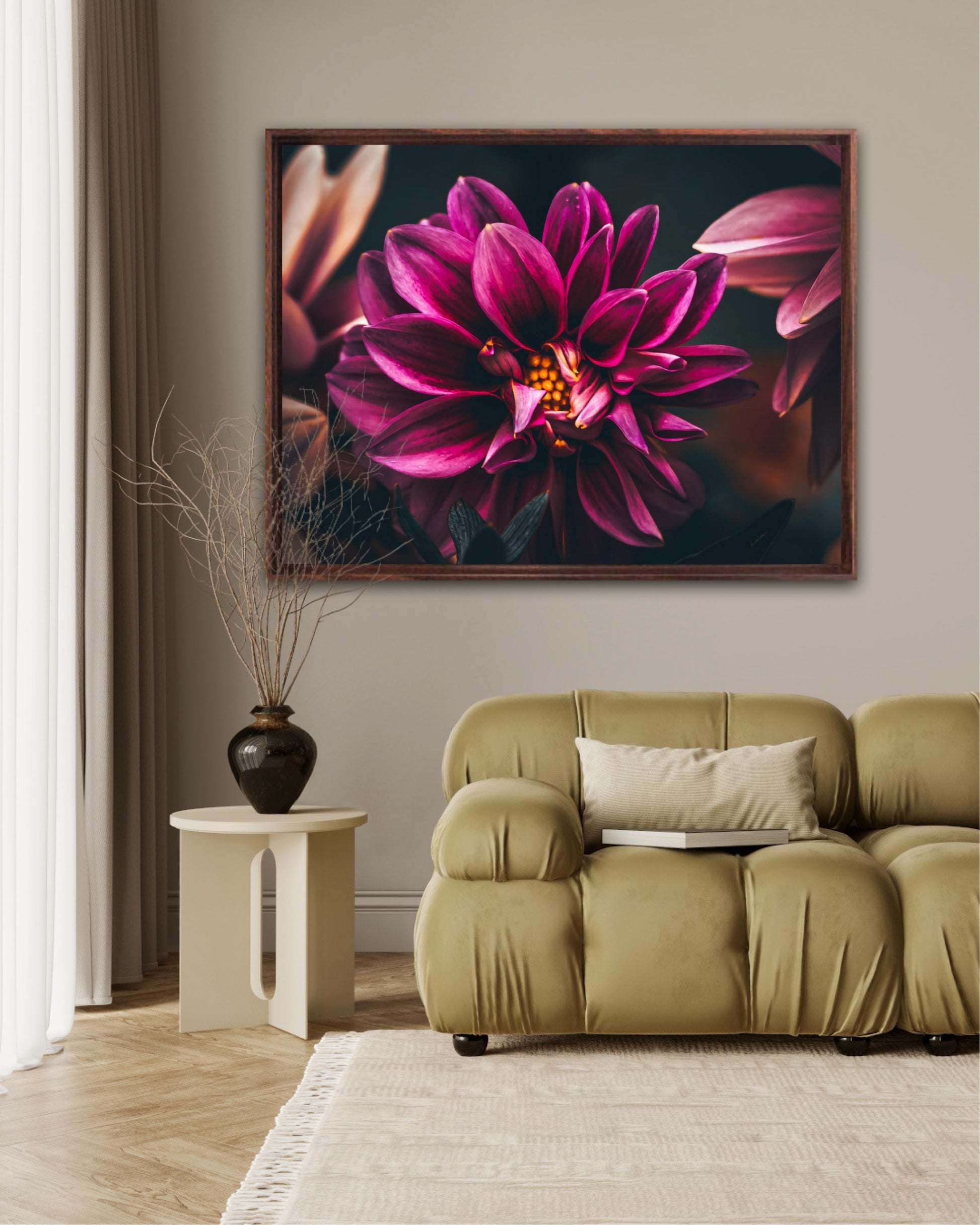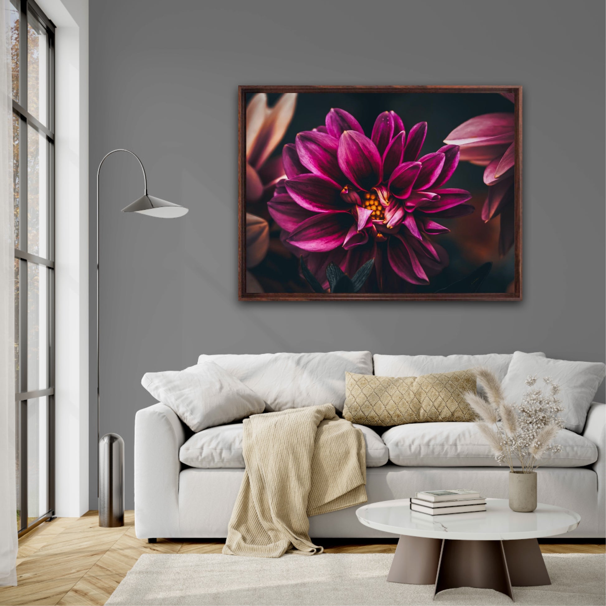Beautiful photographic wall art of a beautiful Dahlia in gorgeous purple pink colours. This flower is simply perfection and you can't help but just enjoy it. This wall art becomes an eye-catcher in your home and gives energy and calm at the same time.