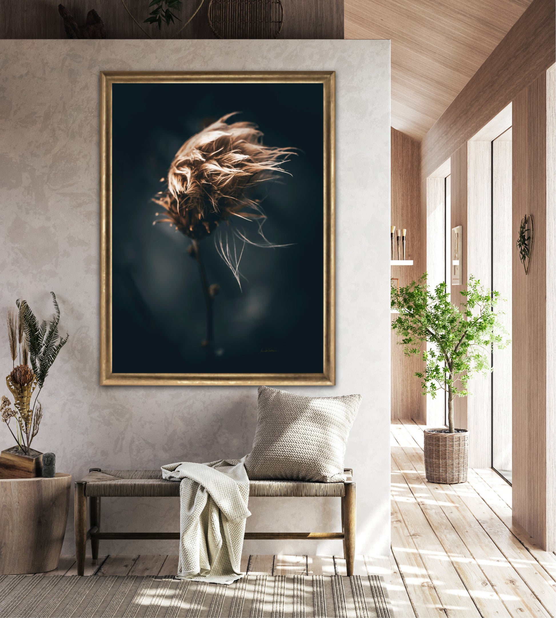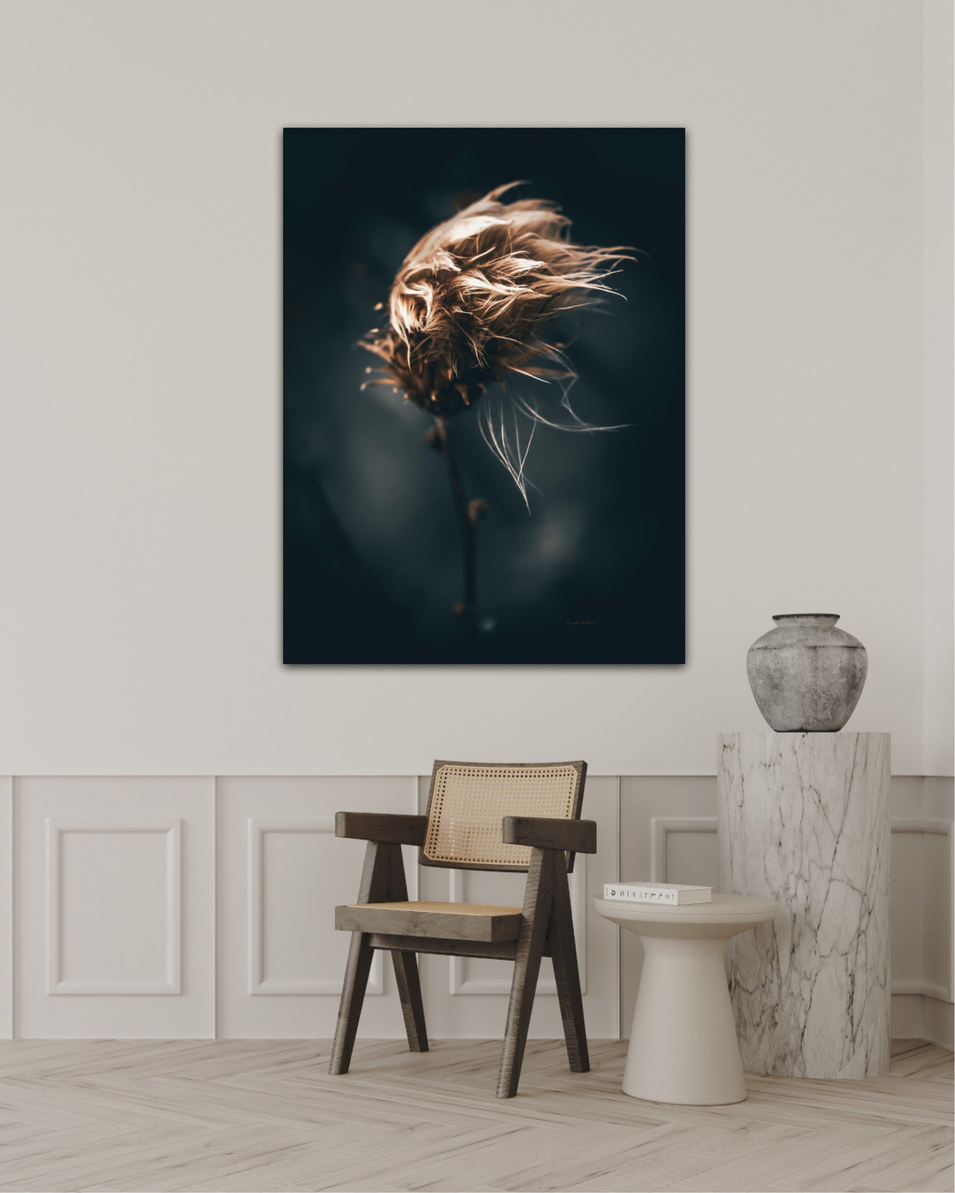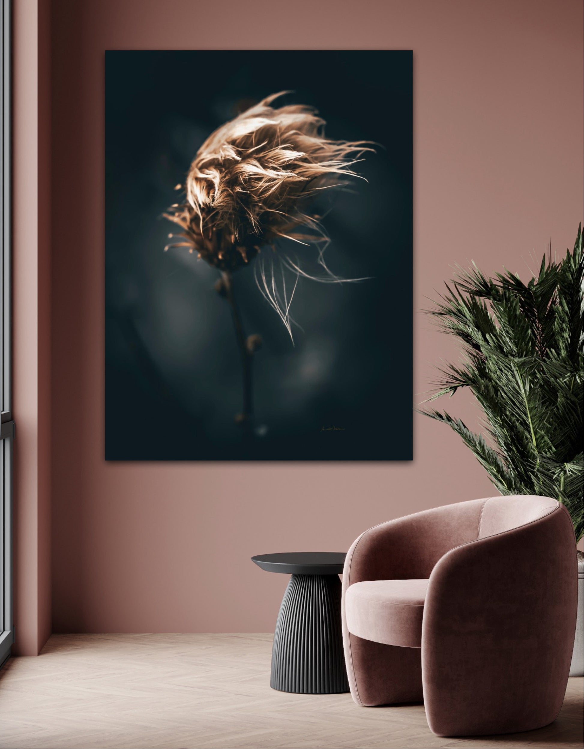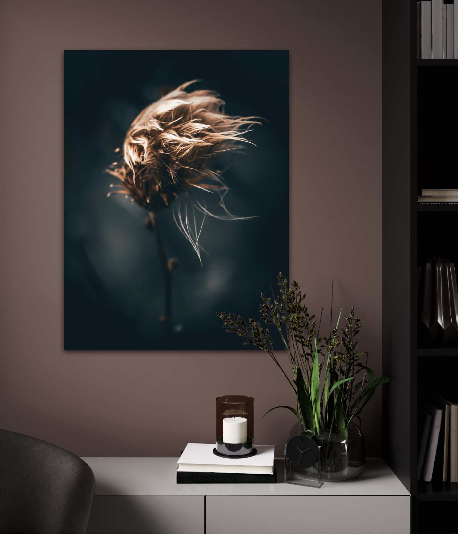 Beautiful photographic wall art of a dried thistle plant. Do you feel the wind ruffling your hair? This is a lovely wall rt of a dried thistle plant shaped by rain and wind. Get a special and emotional piece of art on your wall that will give you the good feeling from nature every time you look at it. Impress friends and family with this gorgeous wall art.