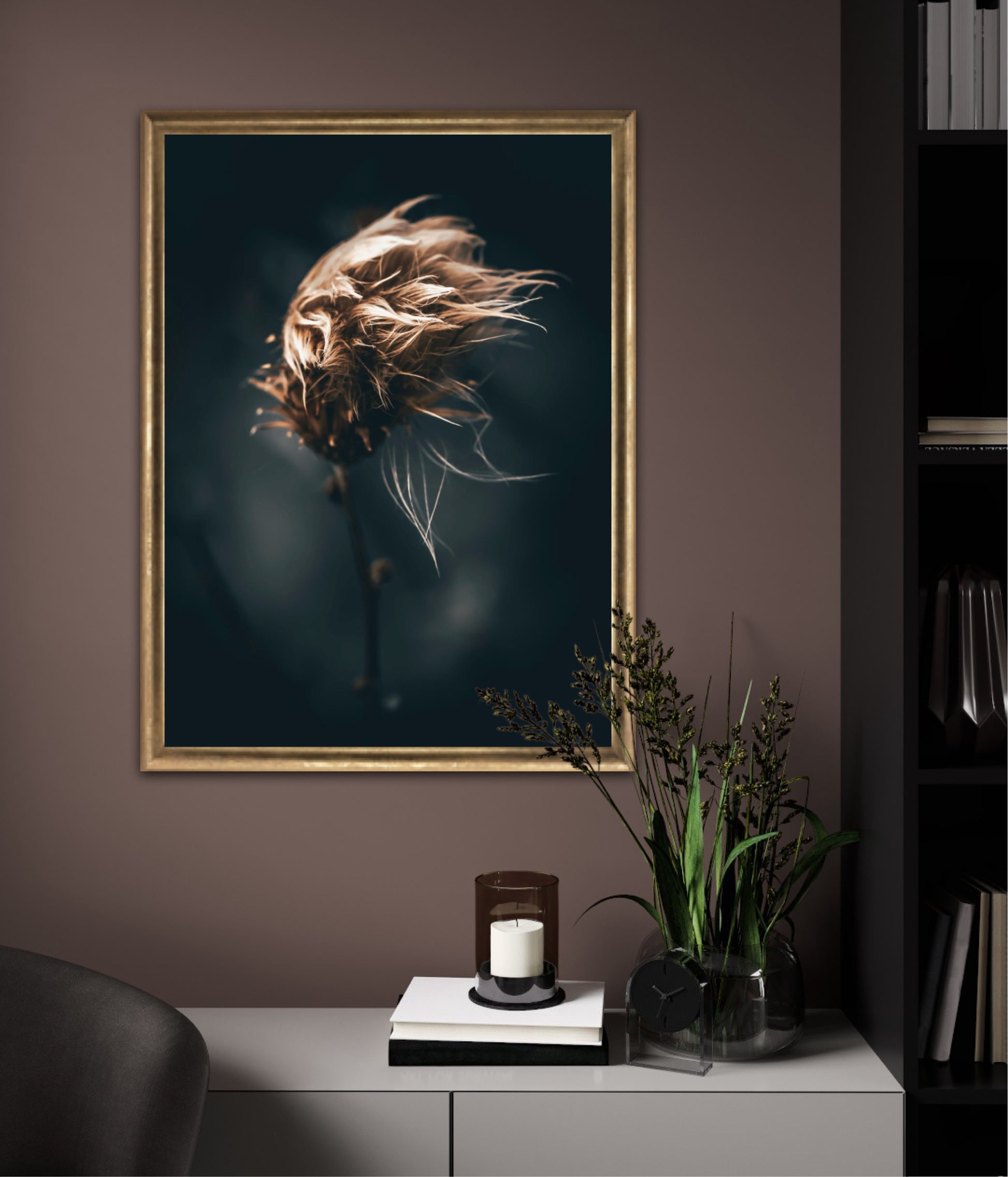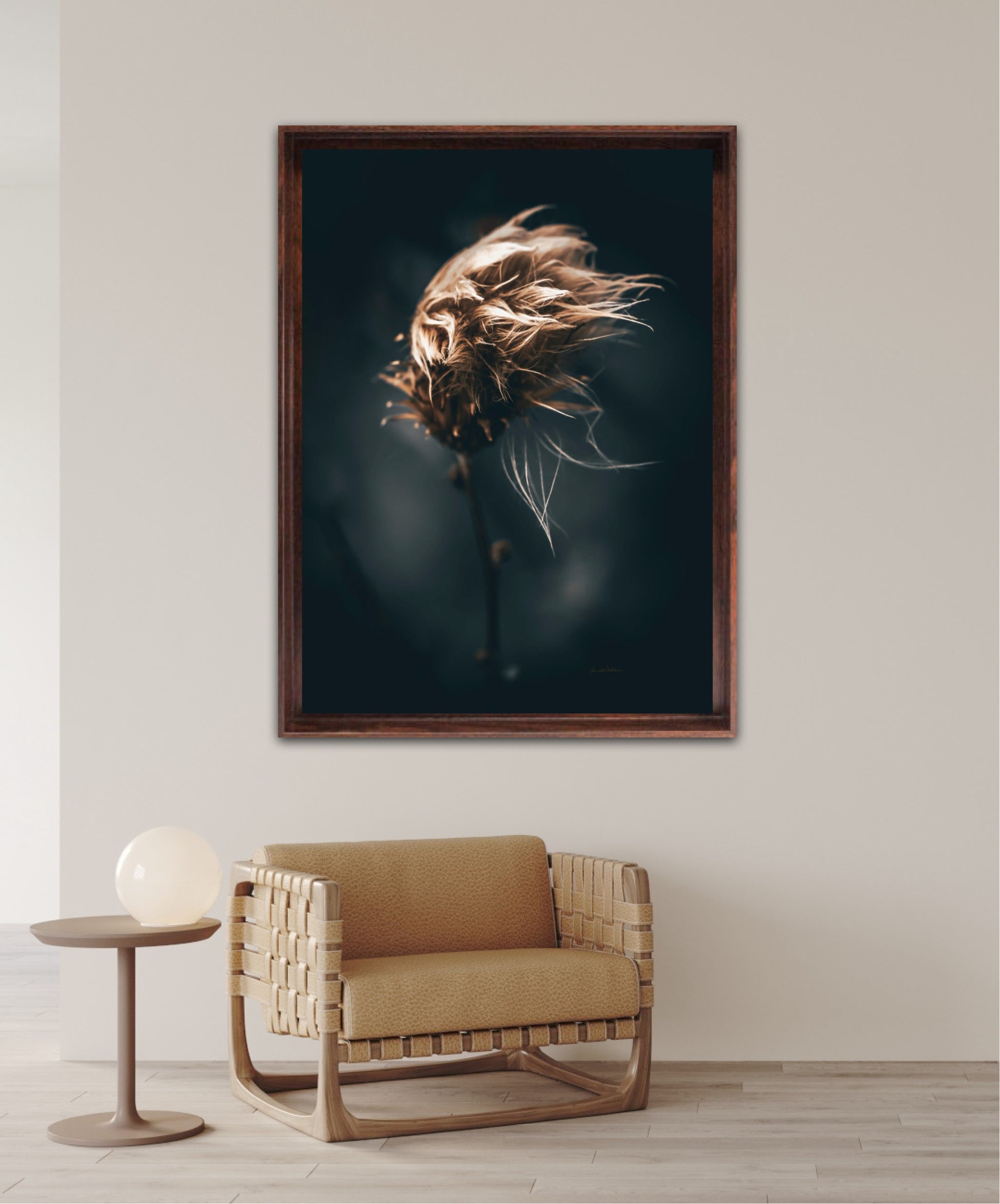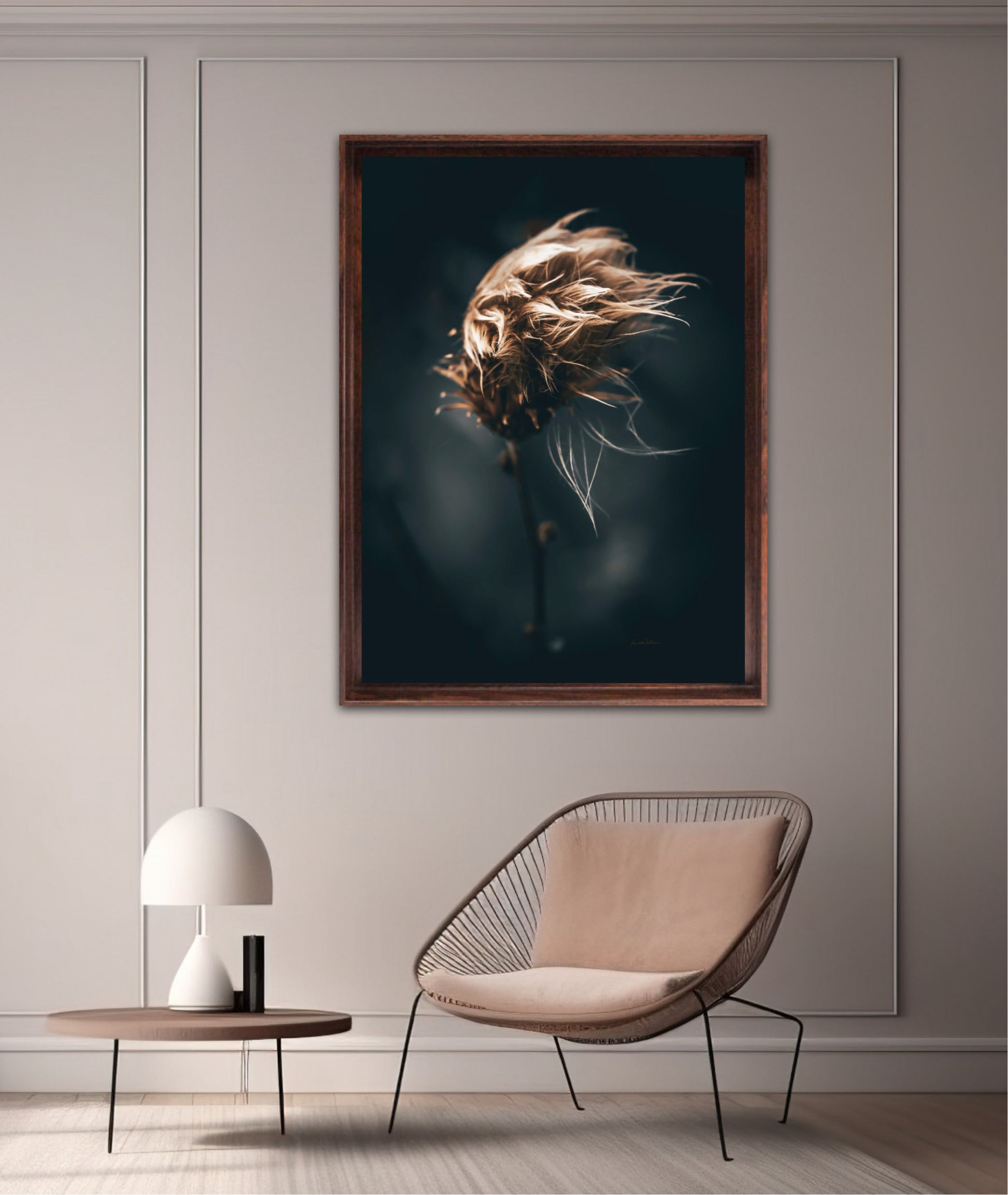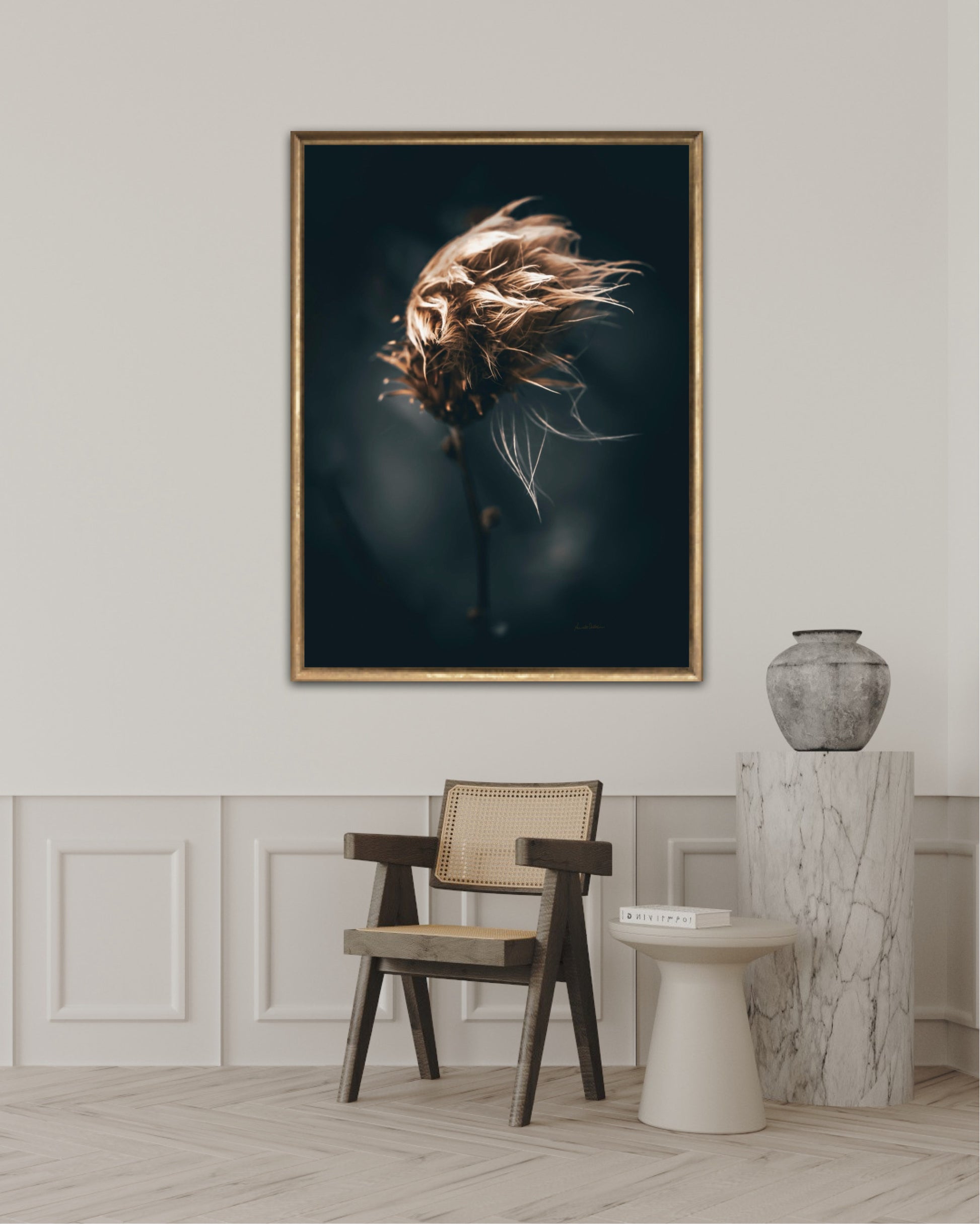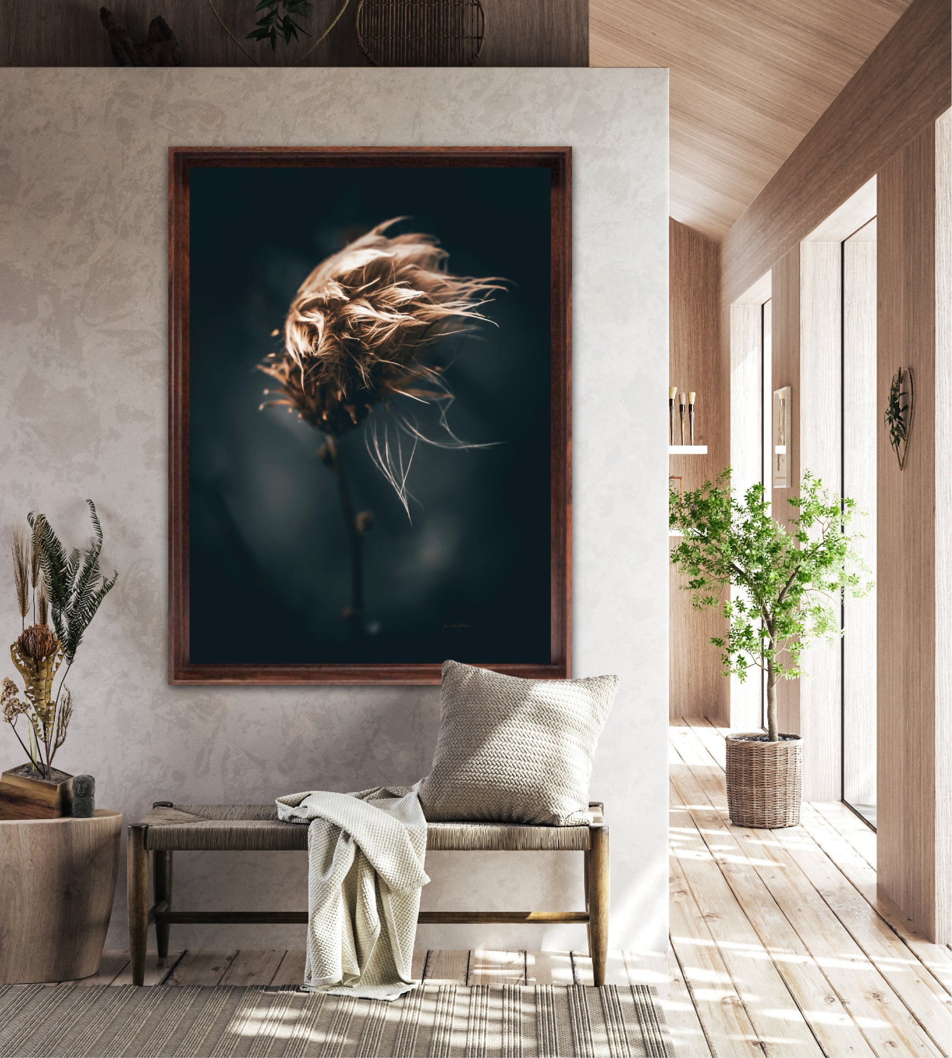 Beautiful photographic wall art of a dried thistle plant. Do you feel the wind ruffling your hair? This is a lovely wall rt of a dried thistle plant shaped by rain and wind. Get a special and emotional piece of art on your wall that will give you the good feeling from nature every time you look at it. Impress friends and family with this gorgeous wall art.