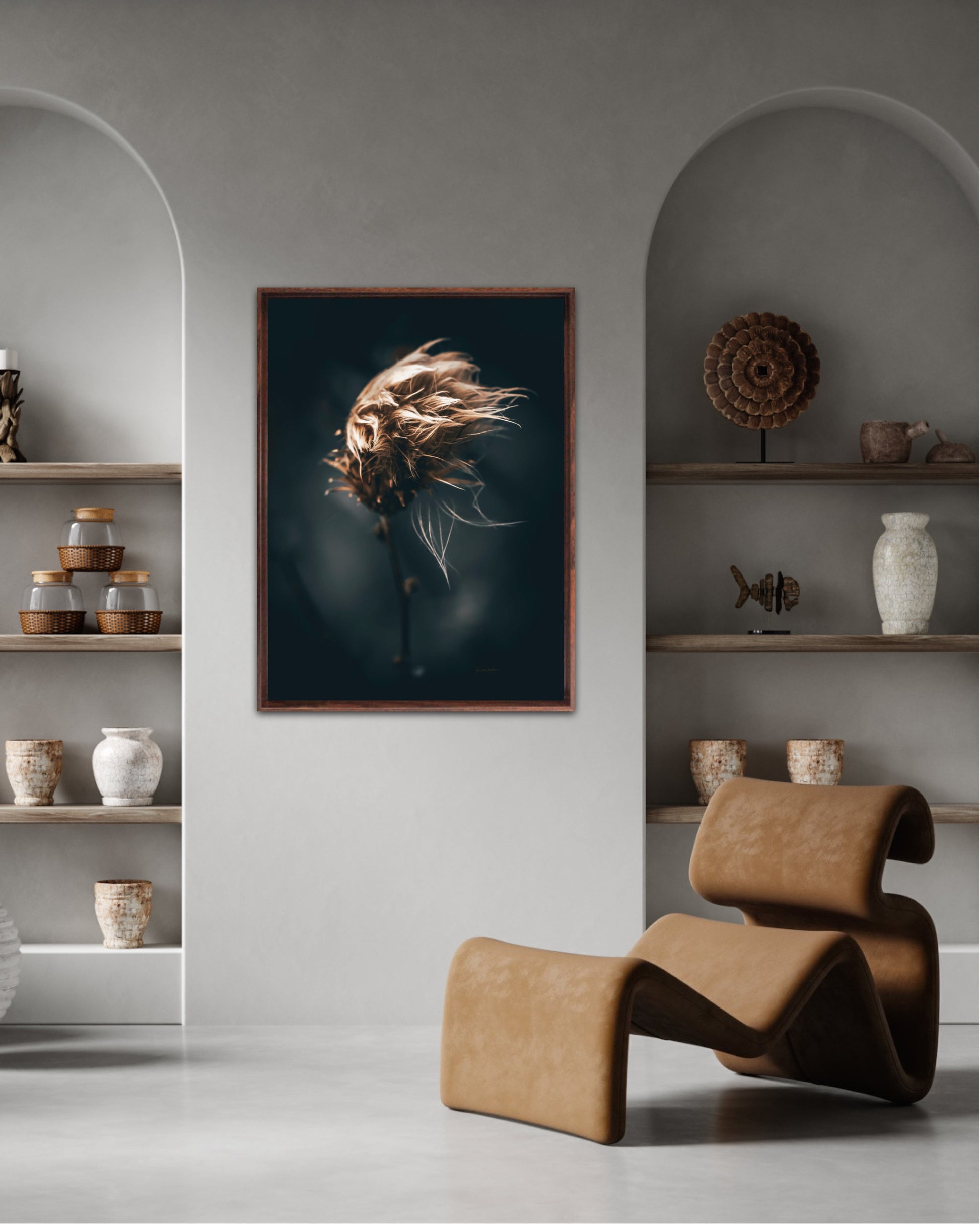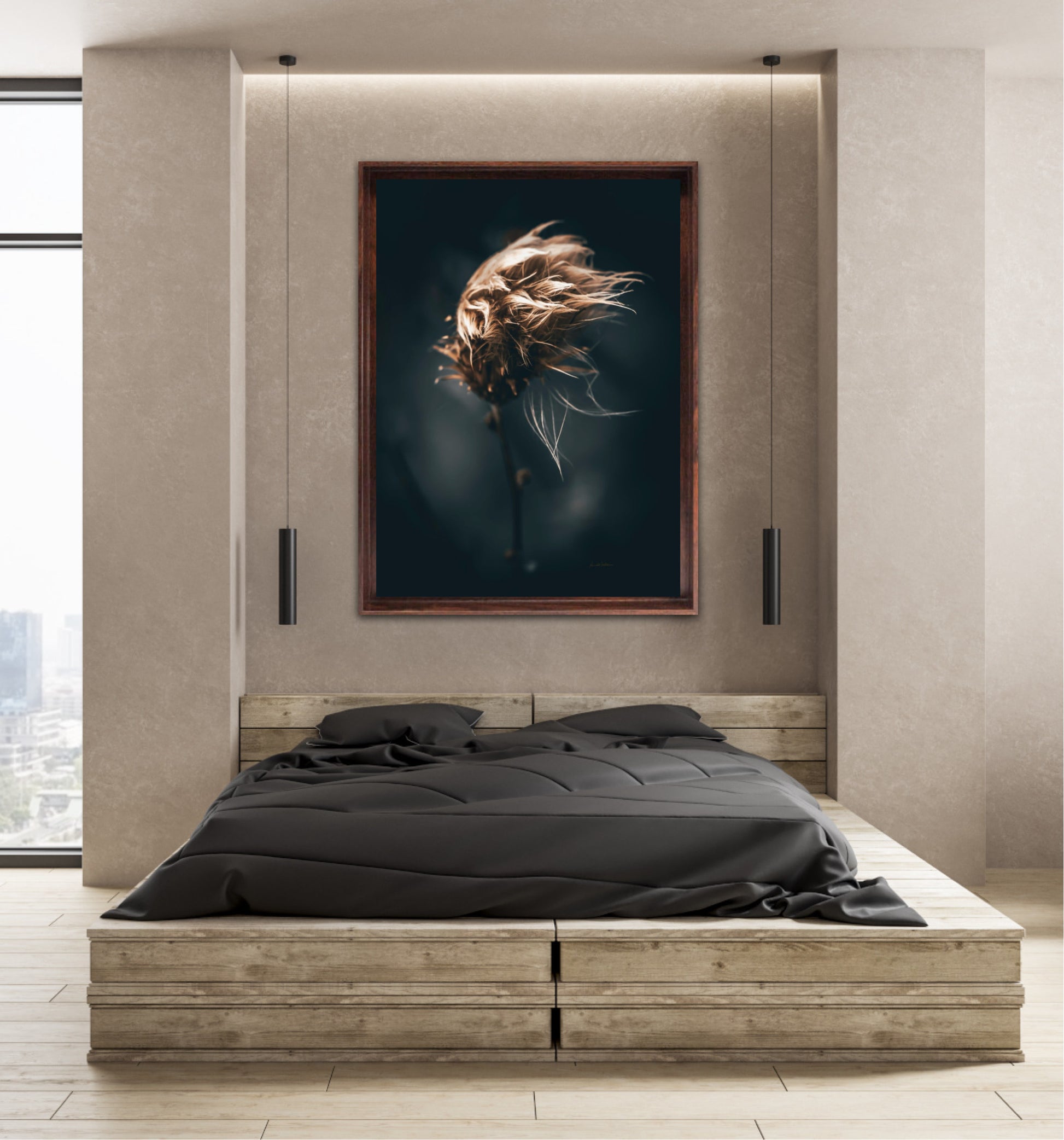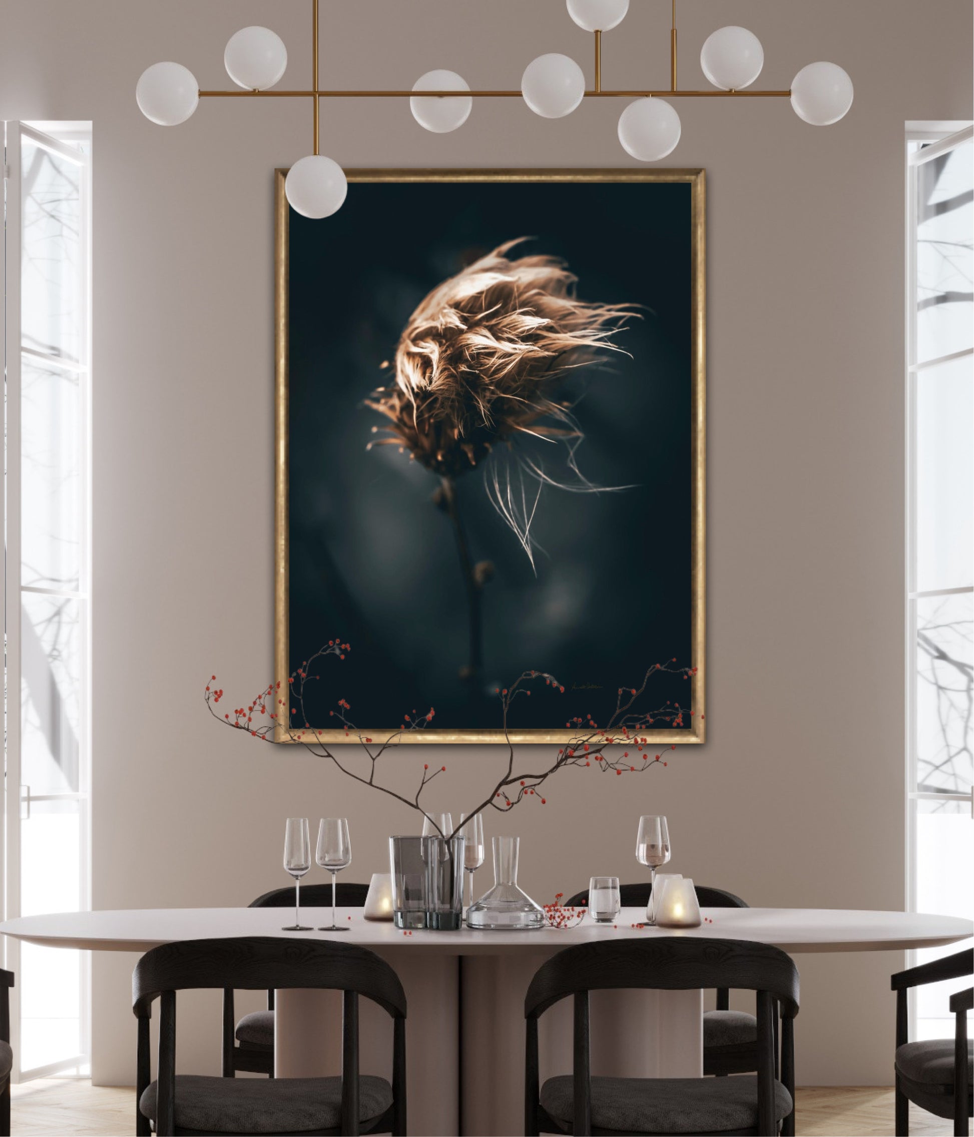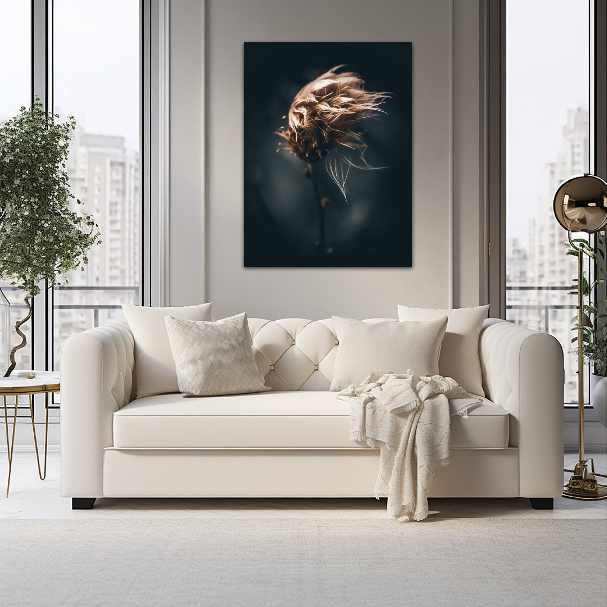 Beautiful photographic wall art of a dried thistle plant. Do you feel the wind ruffling your hair? This is a lovely wall rt of a dried thistle plant shaped by rain and wind. Get a special and emotional piece of art on your wall that will give you the good feeling from nature every time you look at it. Impress friends and family with this gorgeous wall art.
