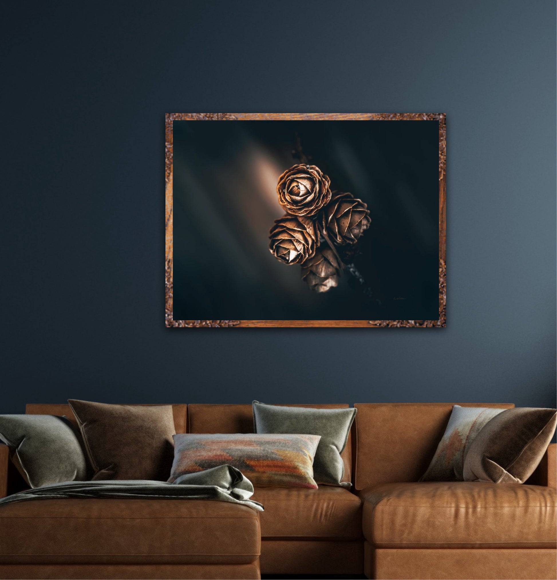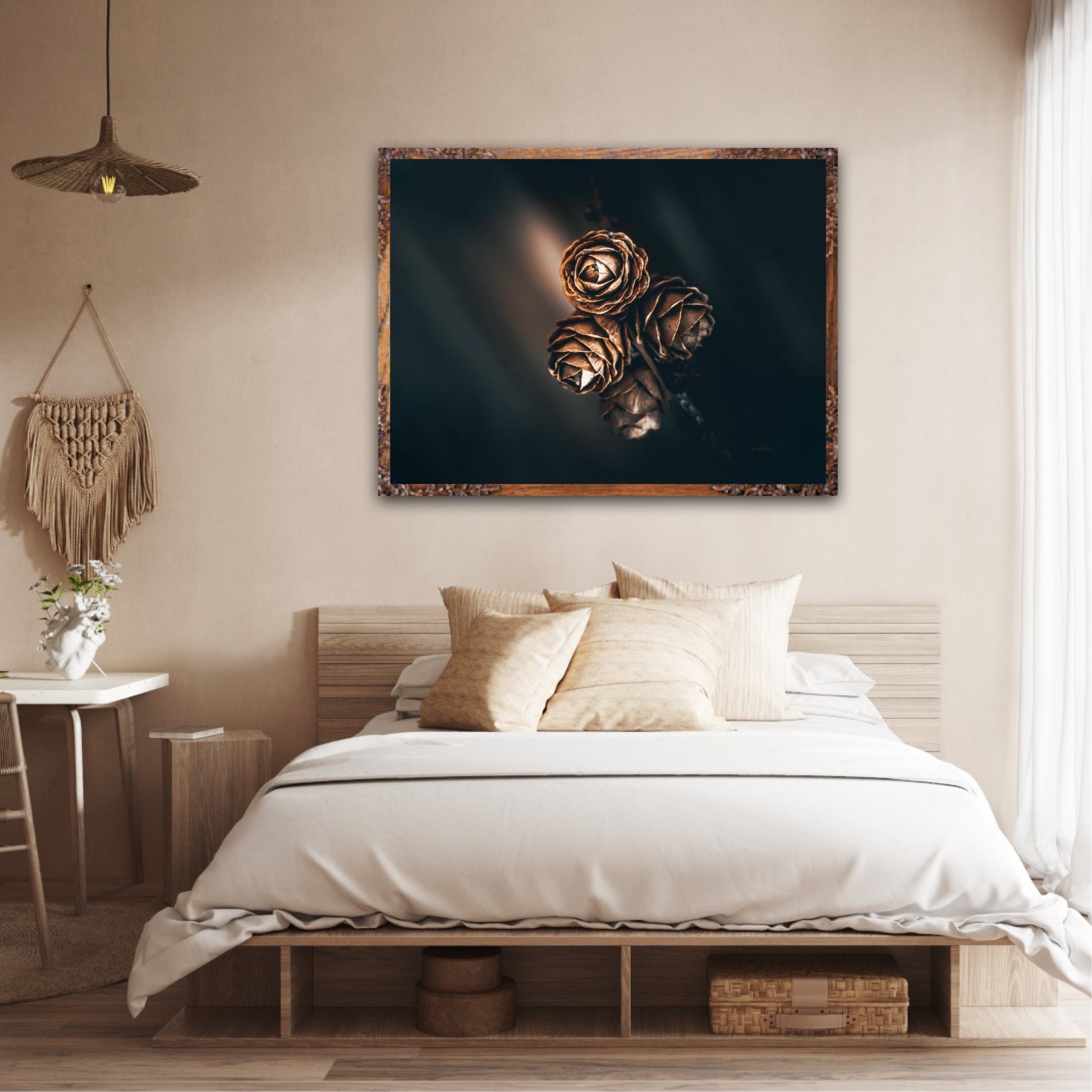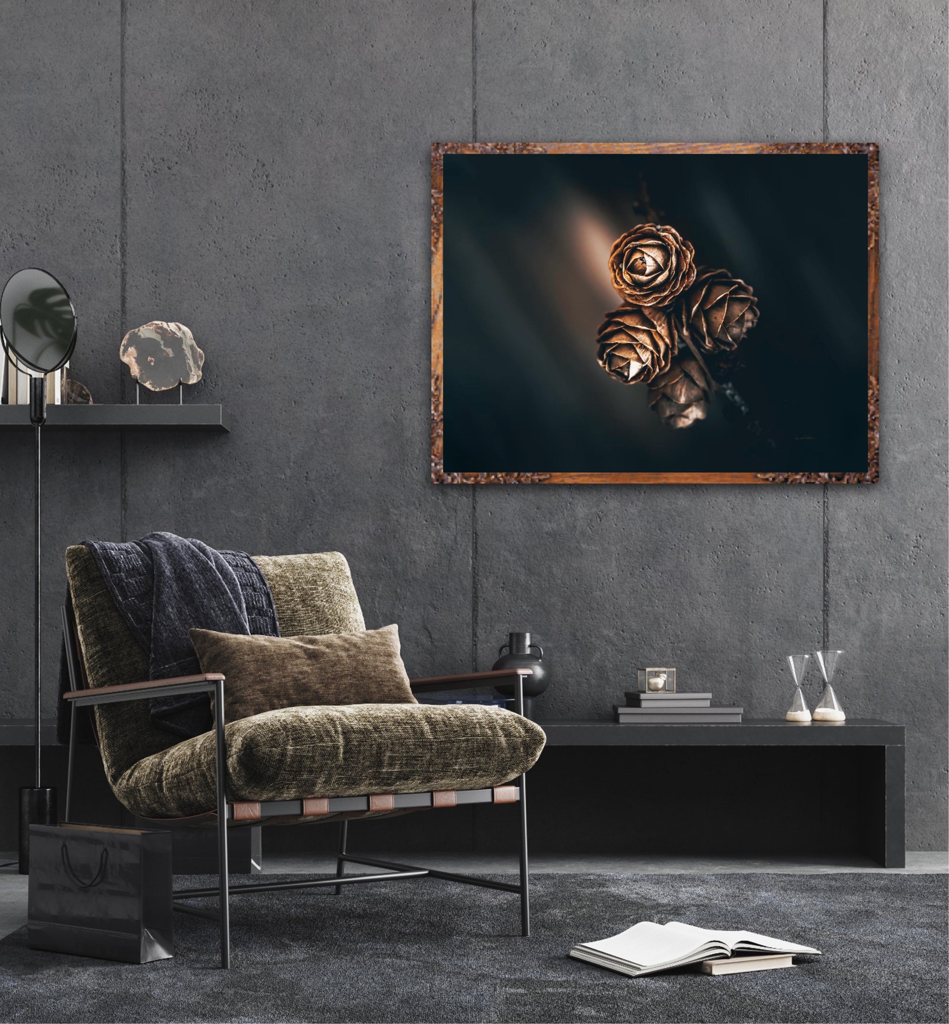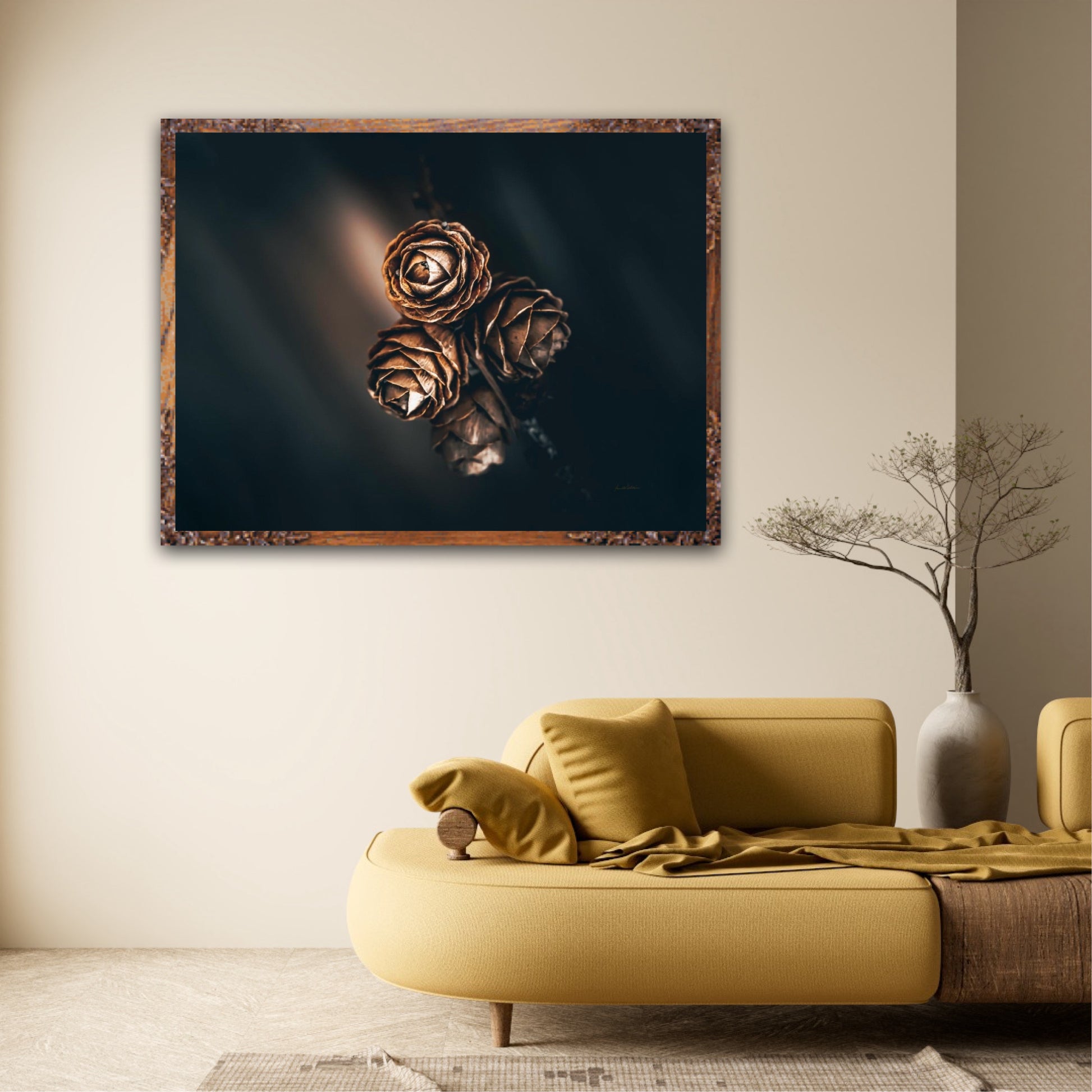Beautiful photographic wall art of four larch cones in beautiful tones of brown and light brown on a dark background. This photo really has amazing atmosphere! Bring peace to your home with this beautiful artwork, and order today!