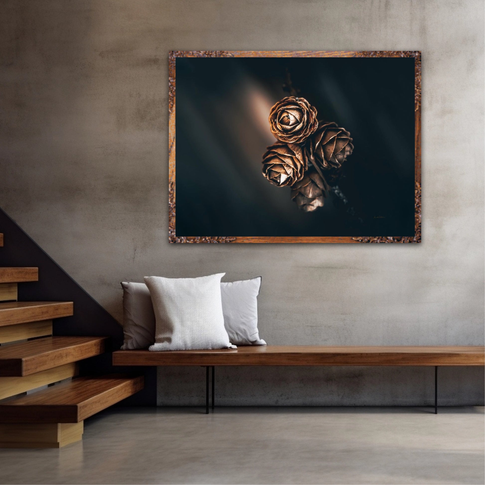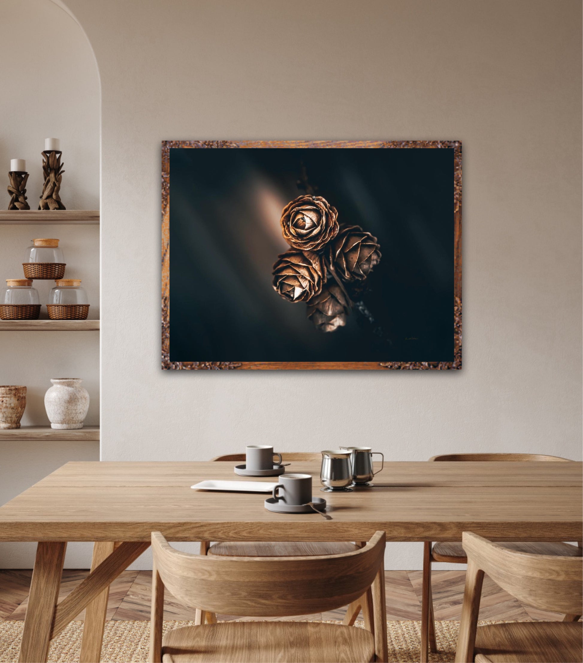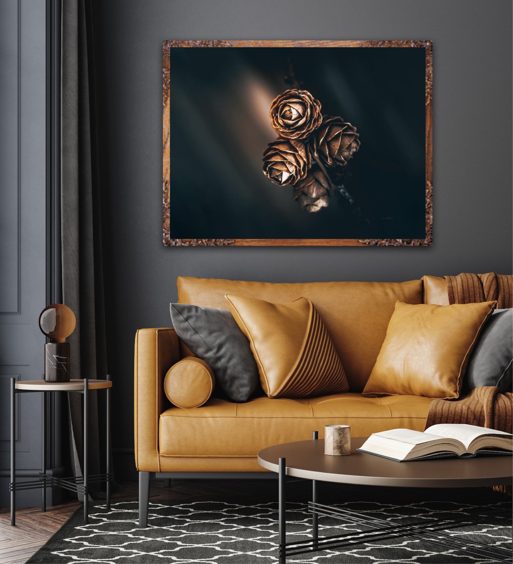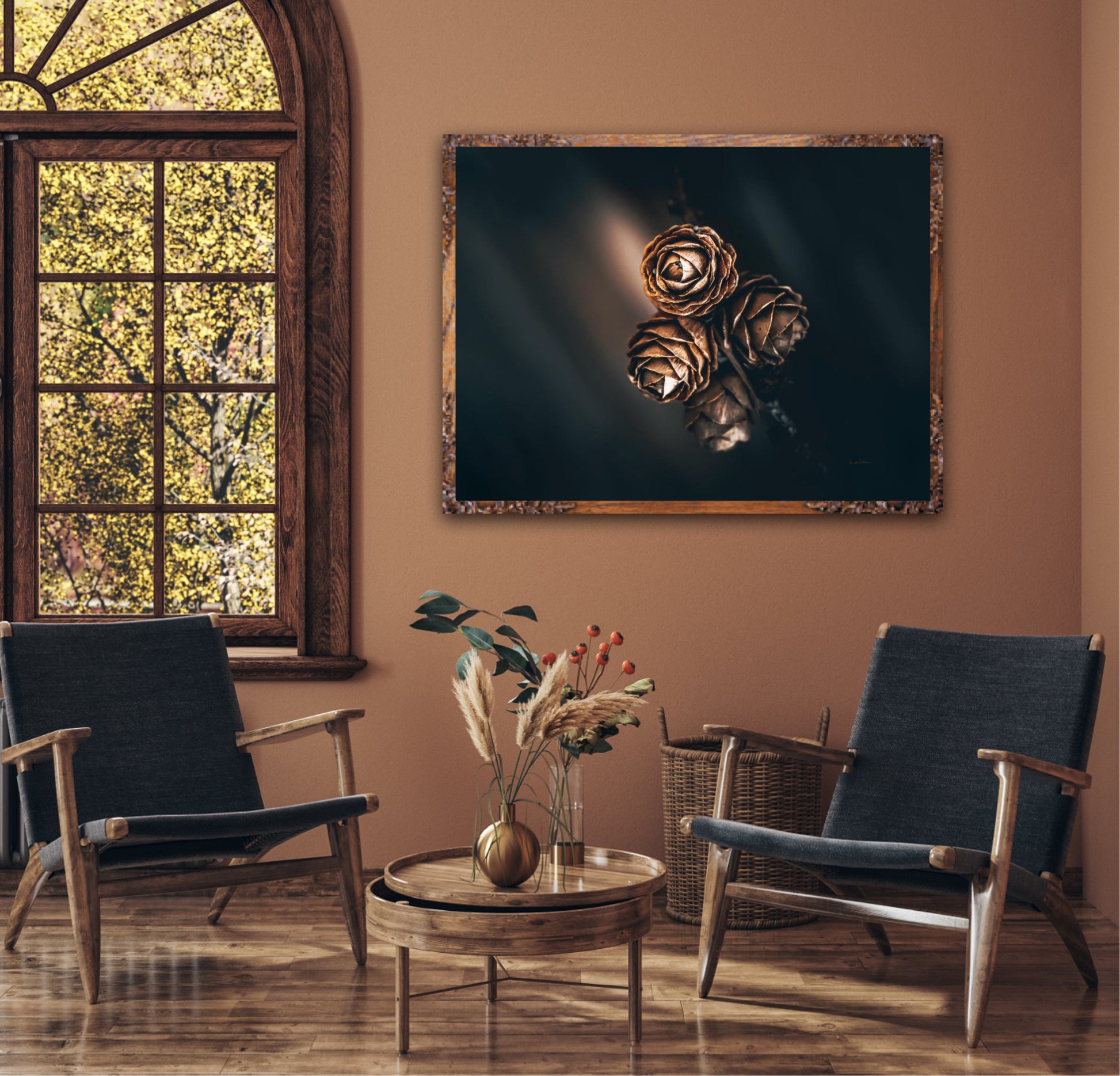 Beautiful photographic wall art of four larch cones in beautiful tones of brown and light brown on a dark background. This photo really has amazing atmosphere! Bring peace to your home with this beautiful artwork, and order today!