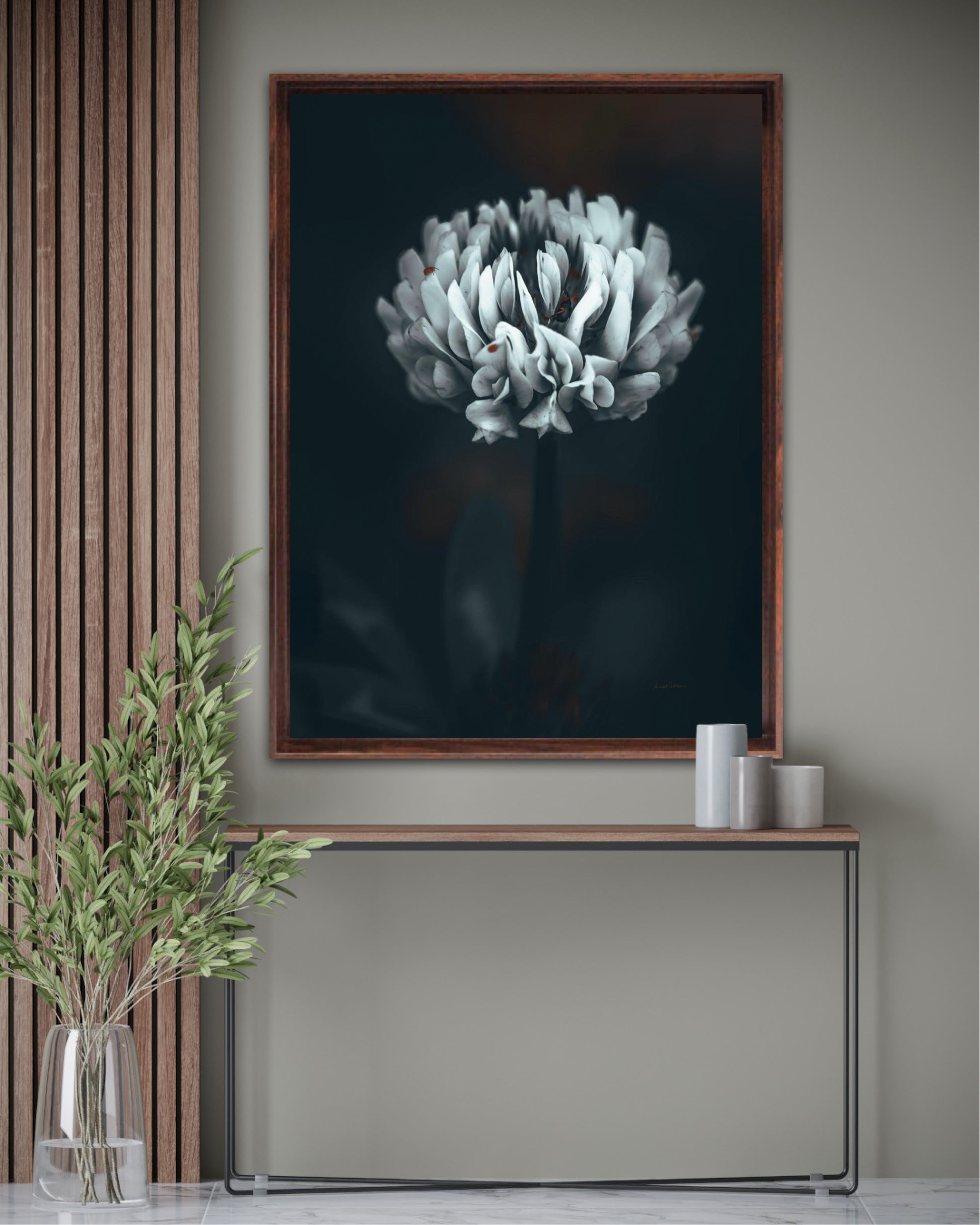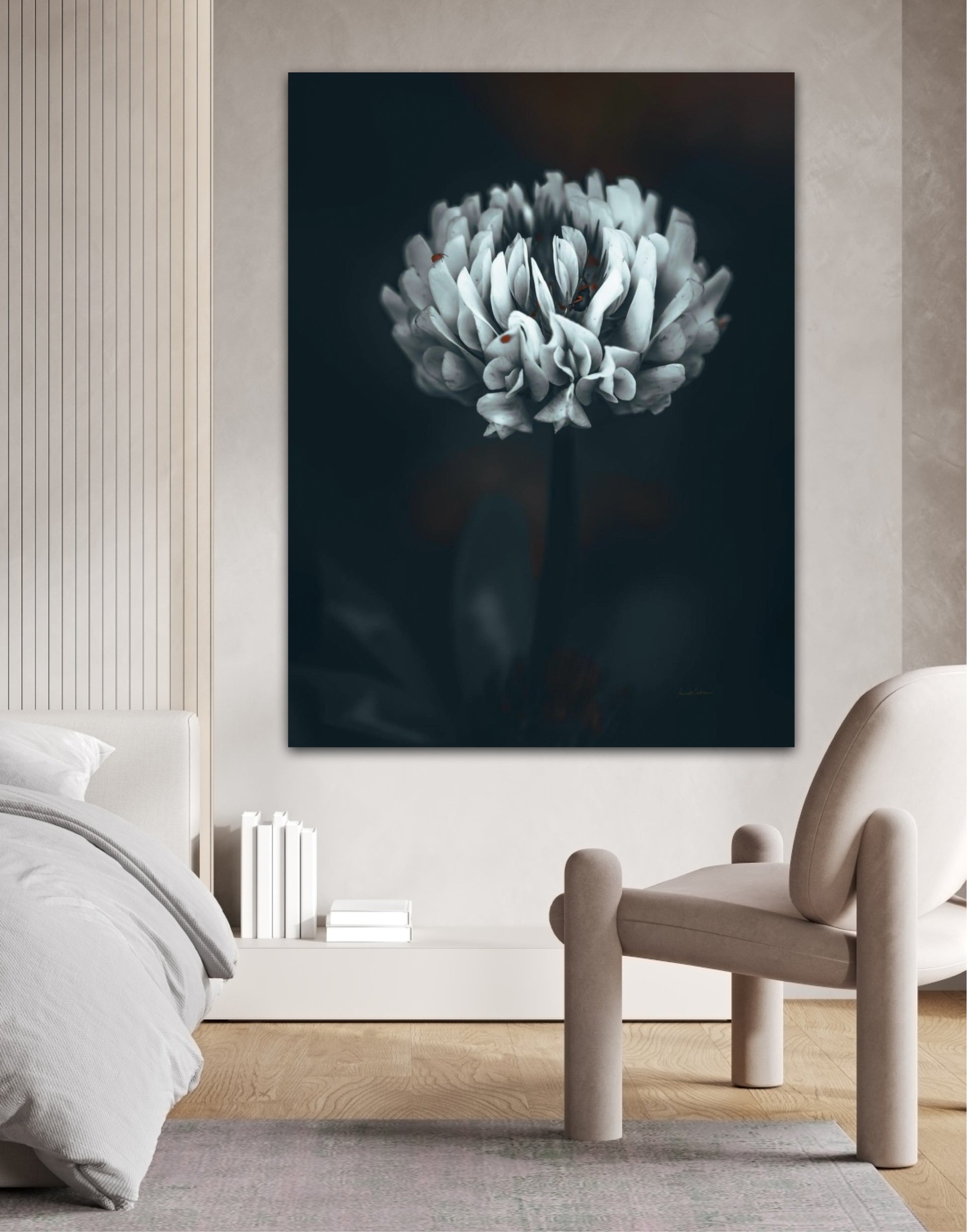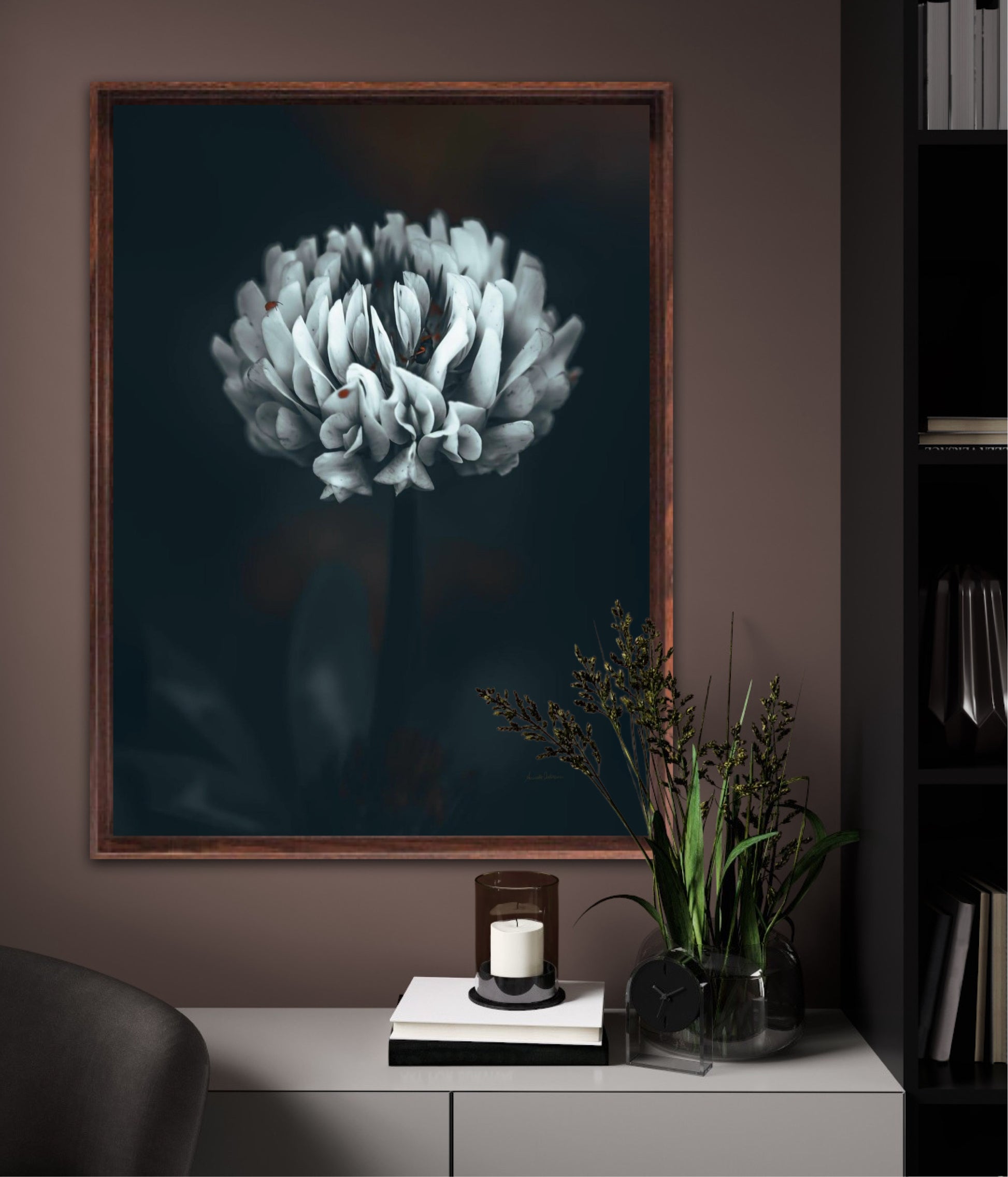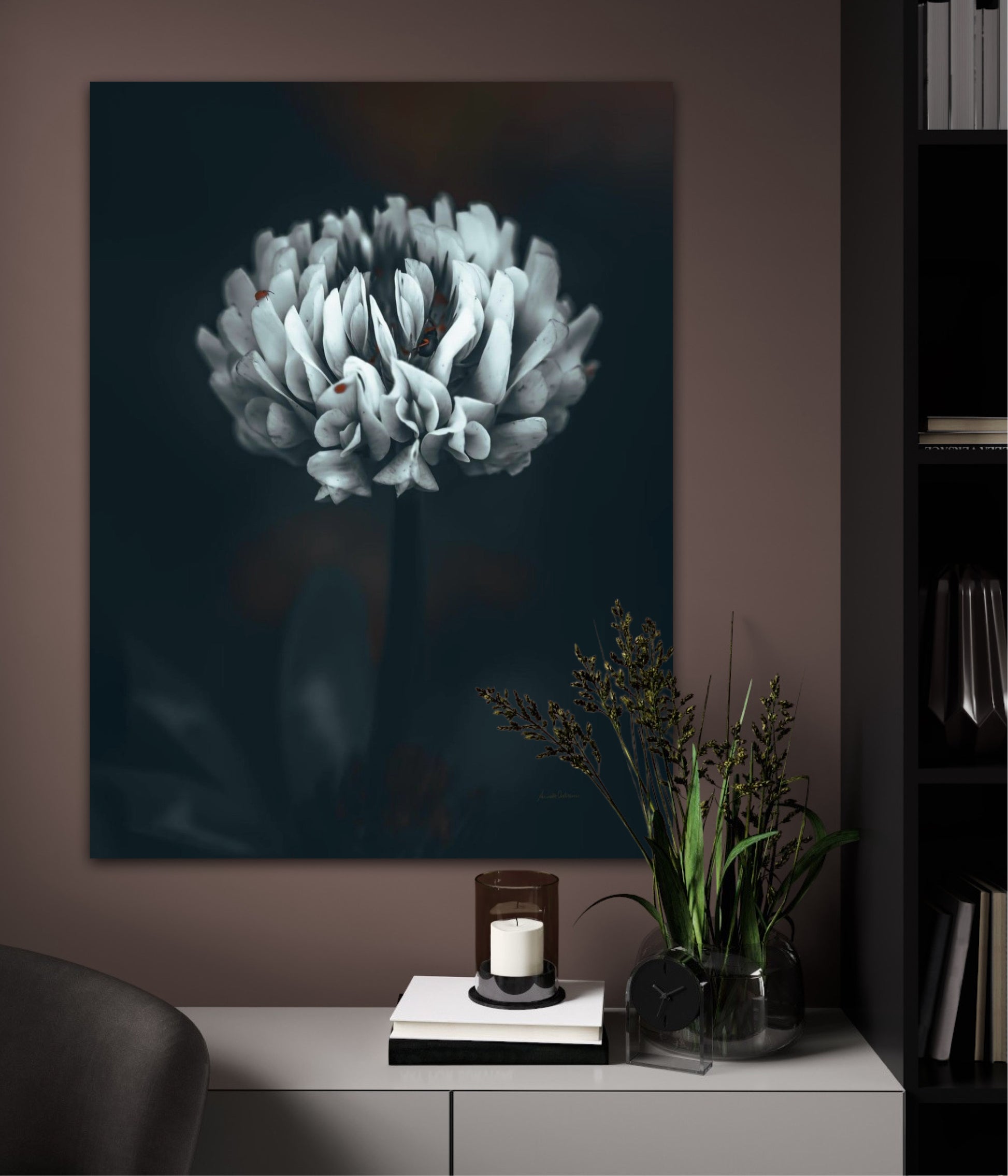 Beautiful photographic wall art of a white clover flower in moody tones, with beautiful details and dramatic light. Can you spot the little friends? This artwork will make you feel grounded and at piece.