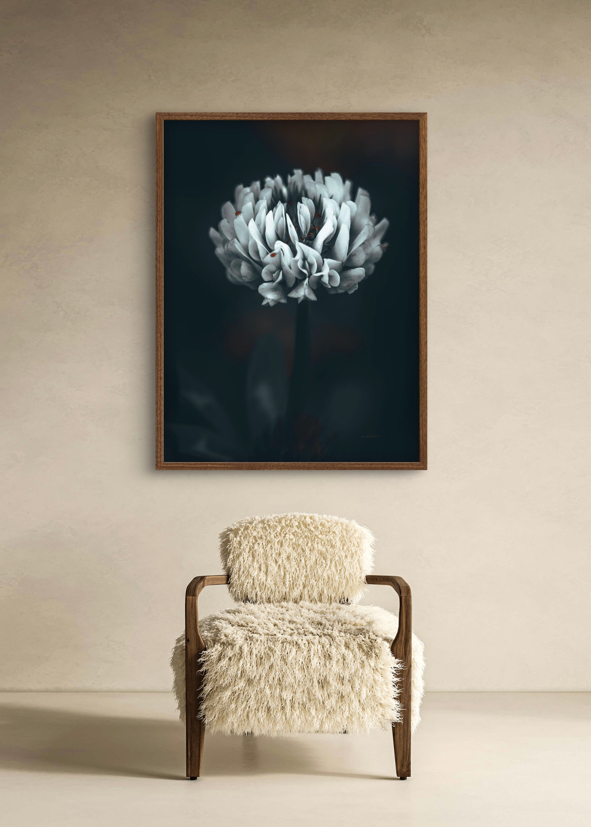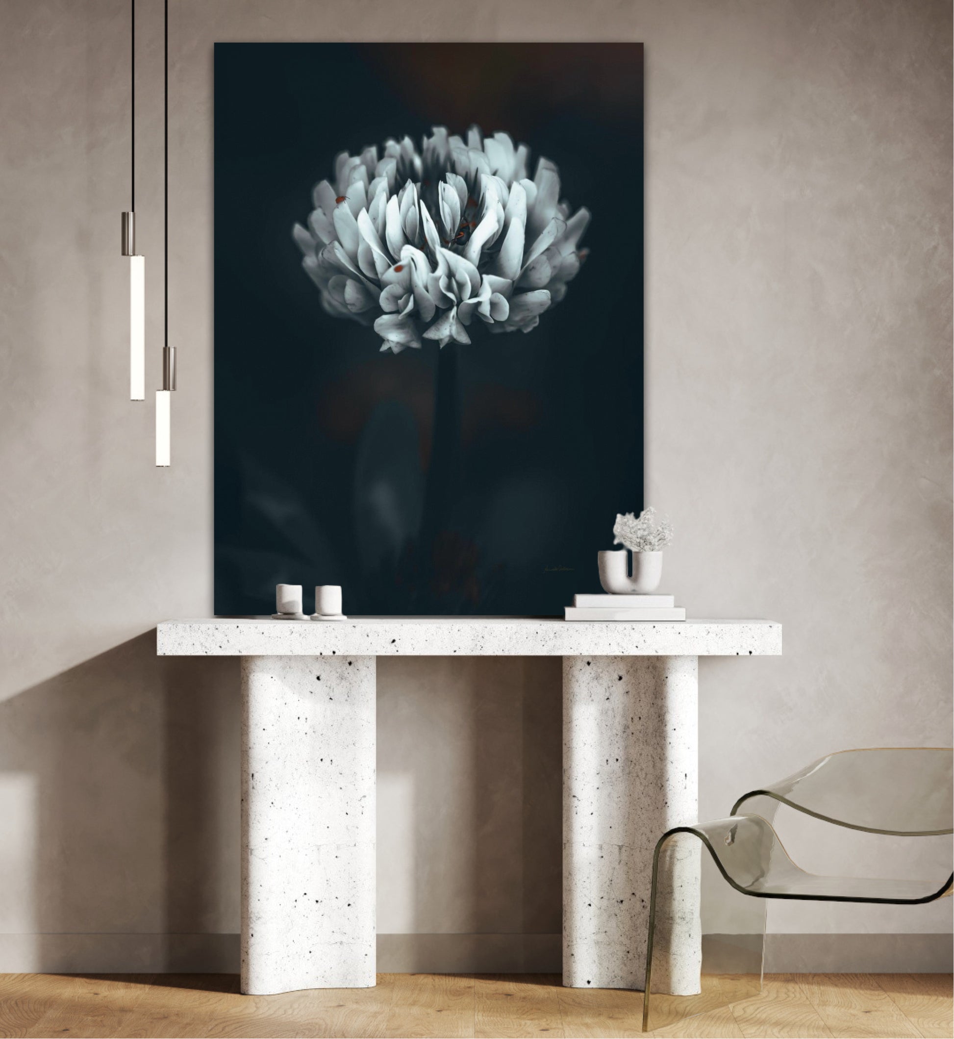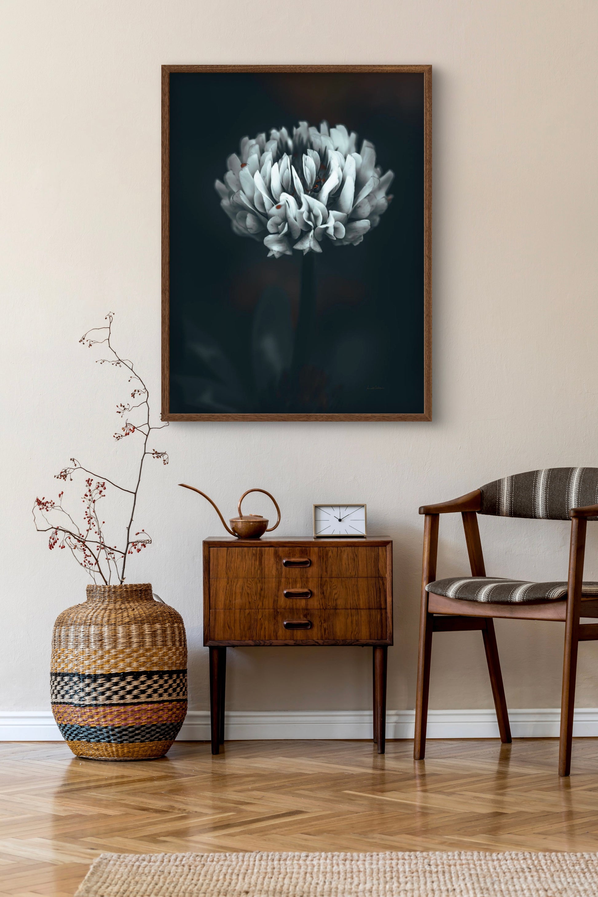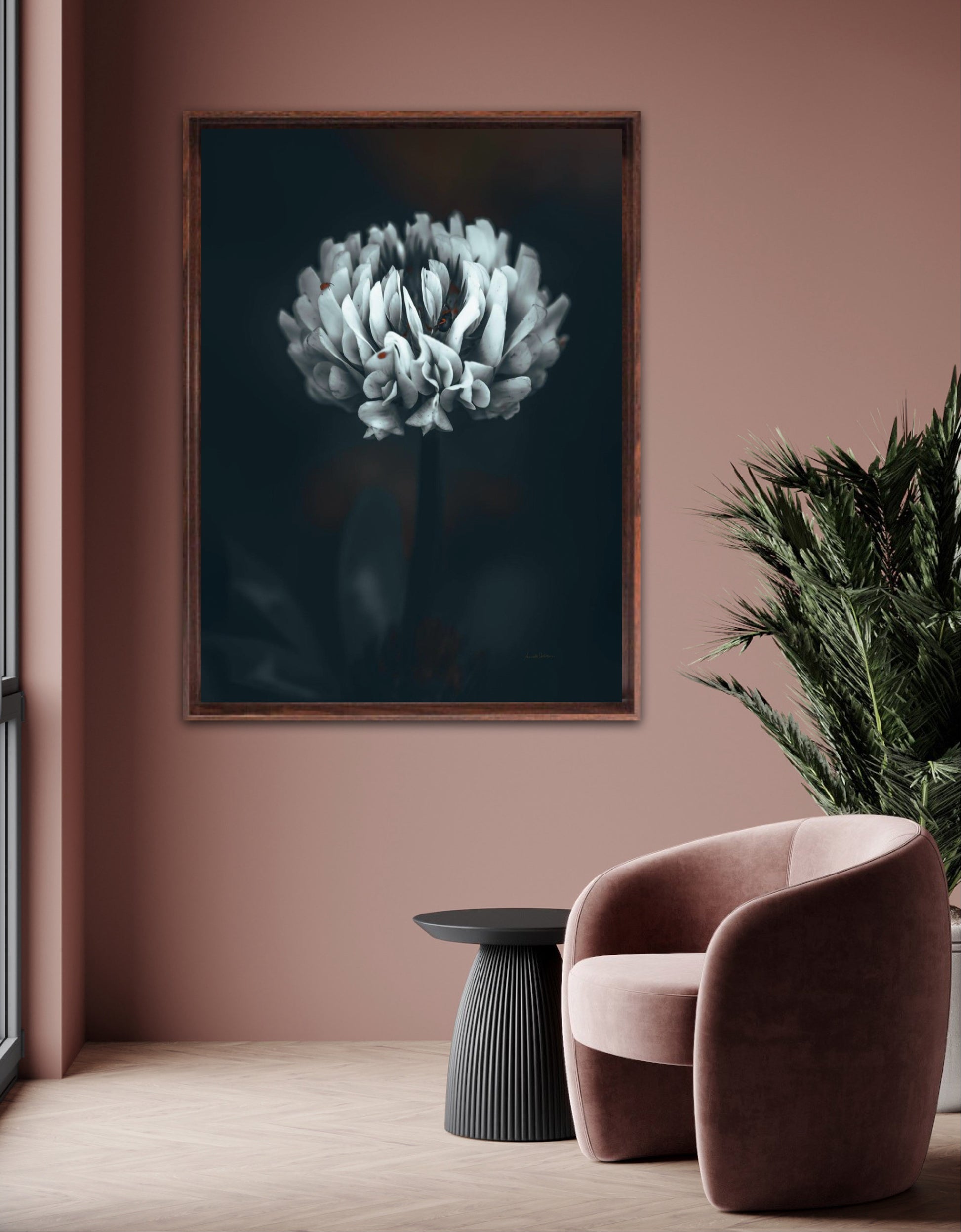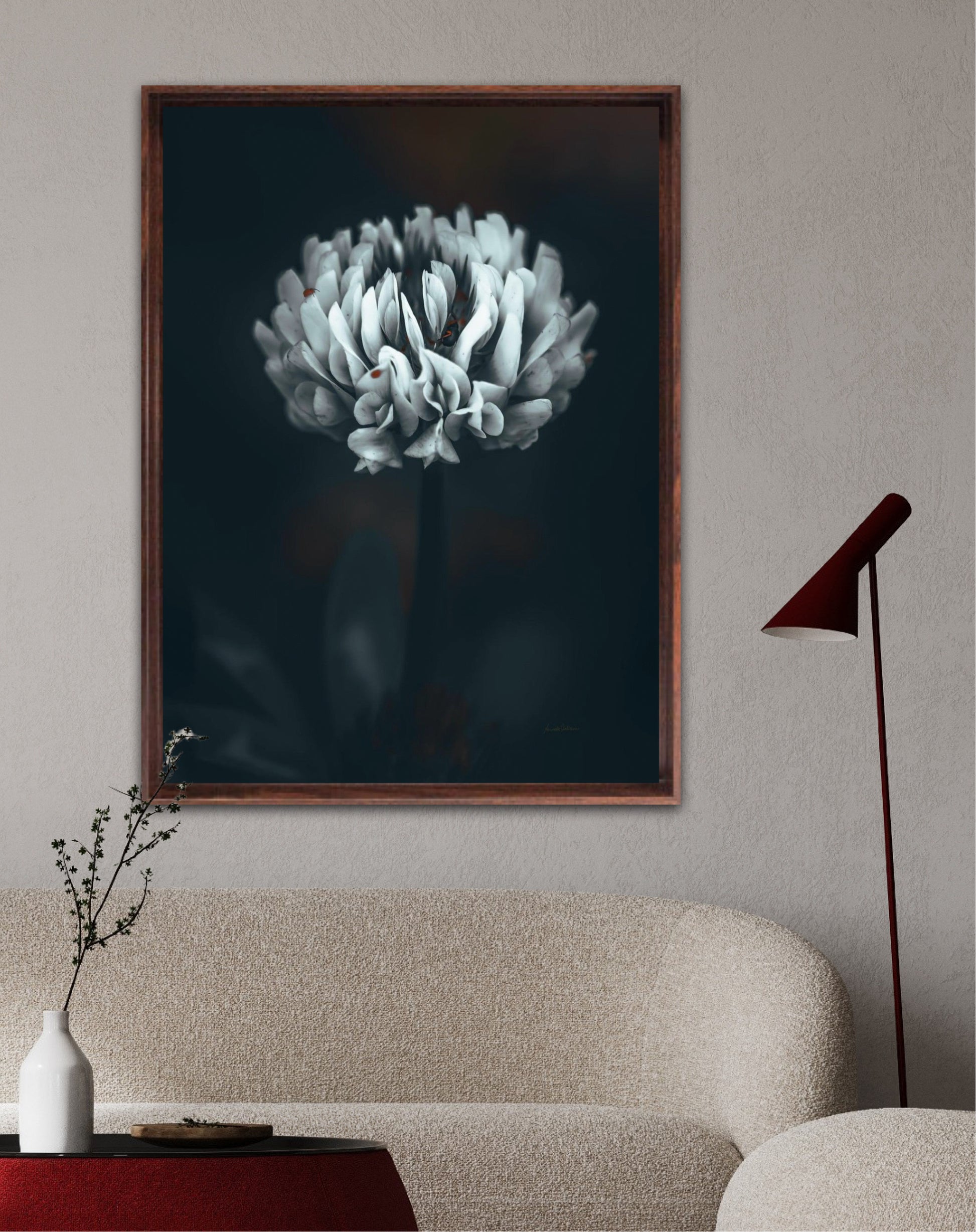 Beautiful photographic wall art of a white clover flower in moody tones, with beautiful details and dramatic light. Can you spot the little friends? This artwork will make you feel grounded and at piece.