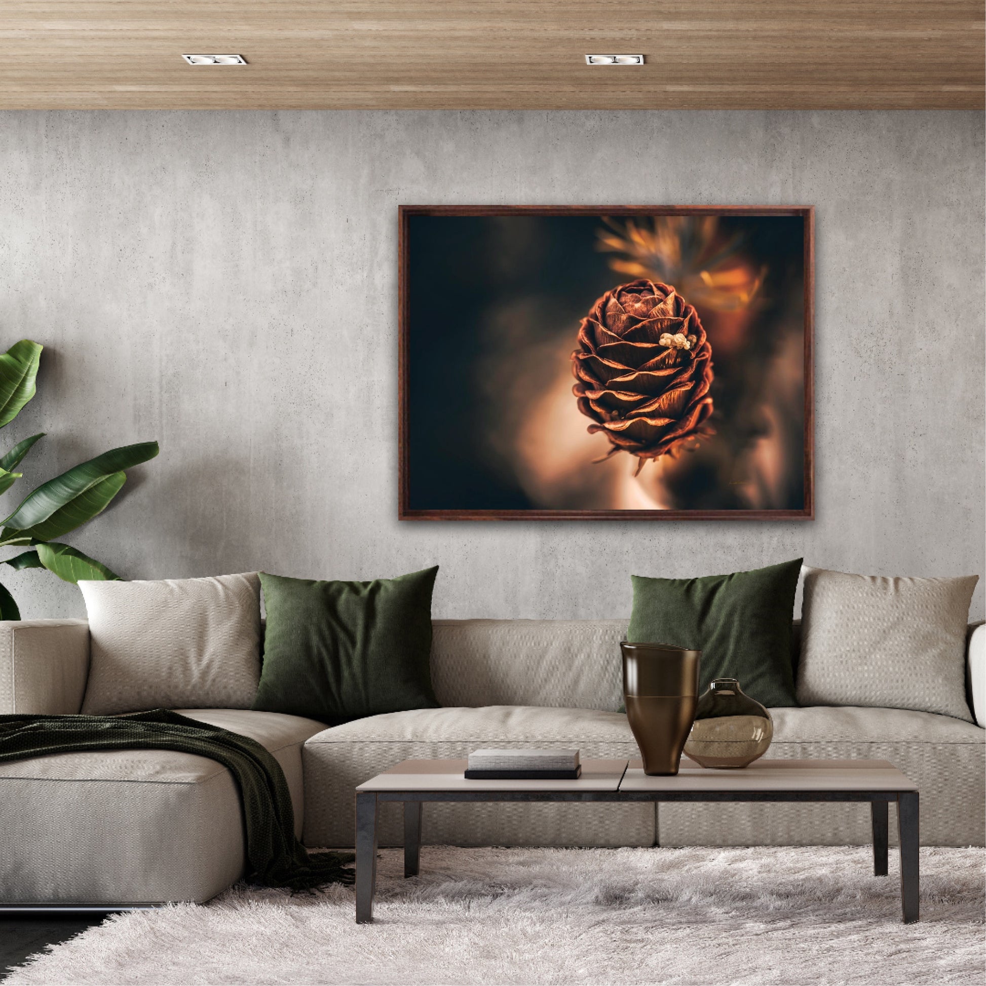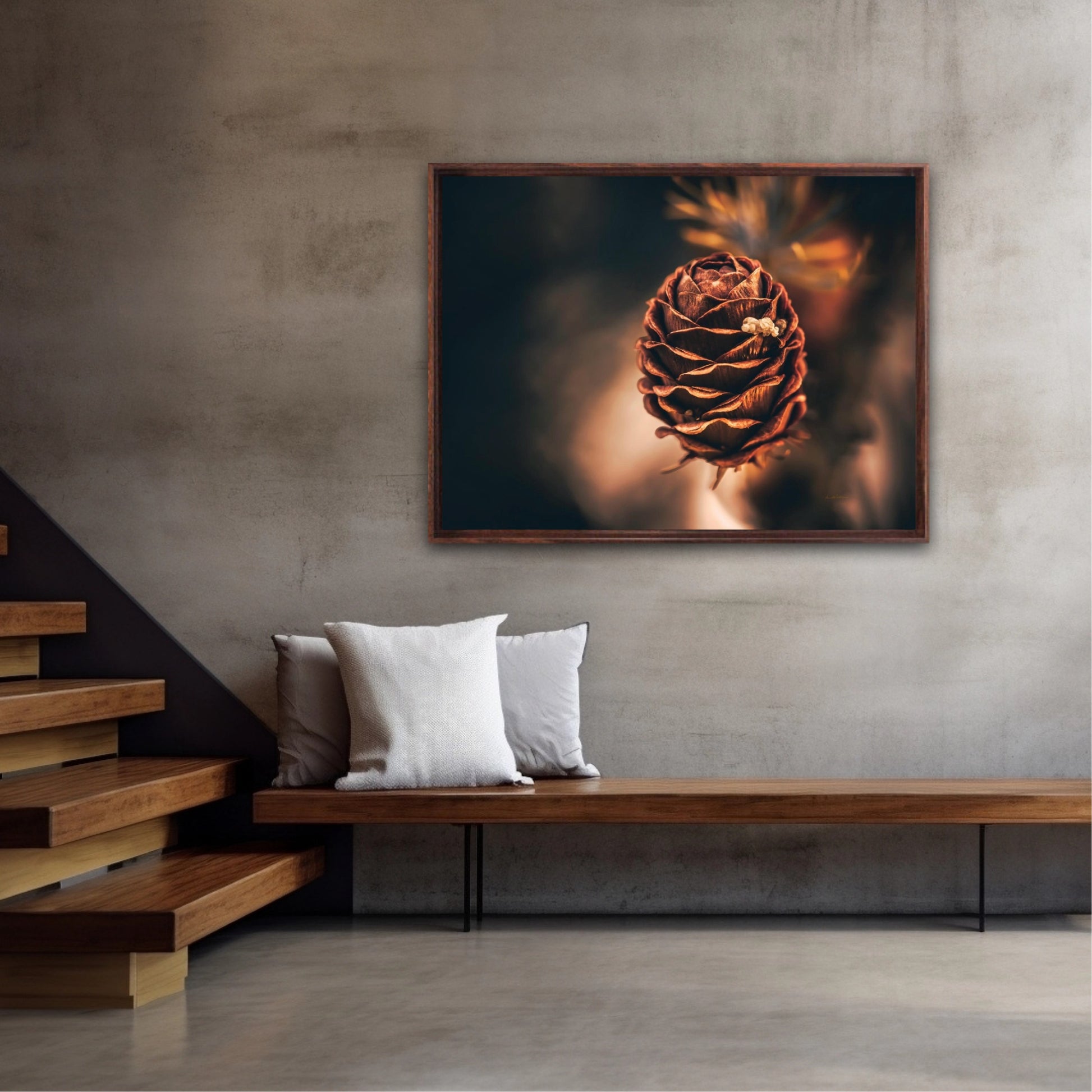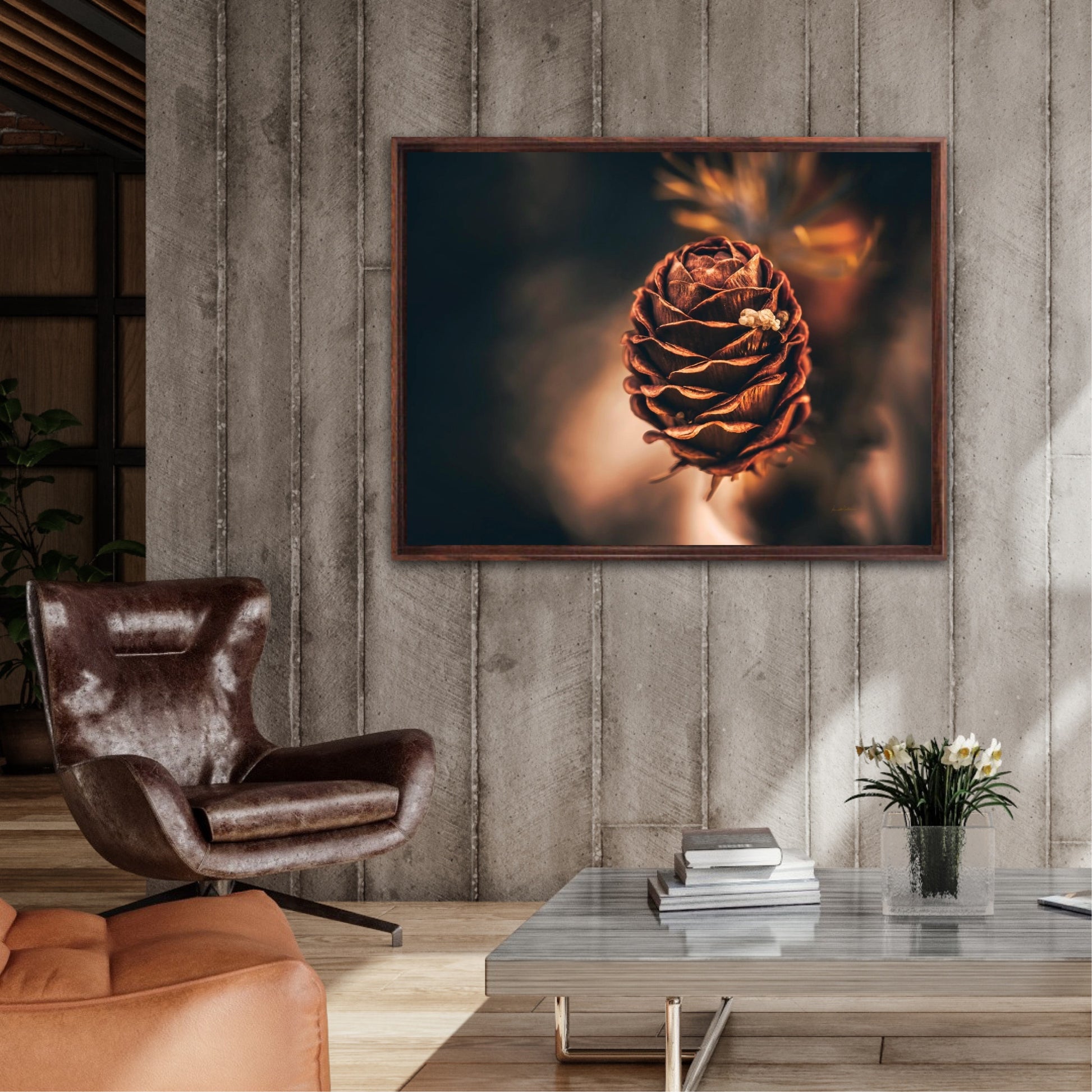 Beautiful photographic wall art of a larch cone in wonderful golden brown tones on a dynamic background of golden brown and black. This artwork will be a stand-out piece in your home and bring you peace and tranquility.
