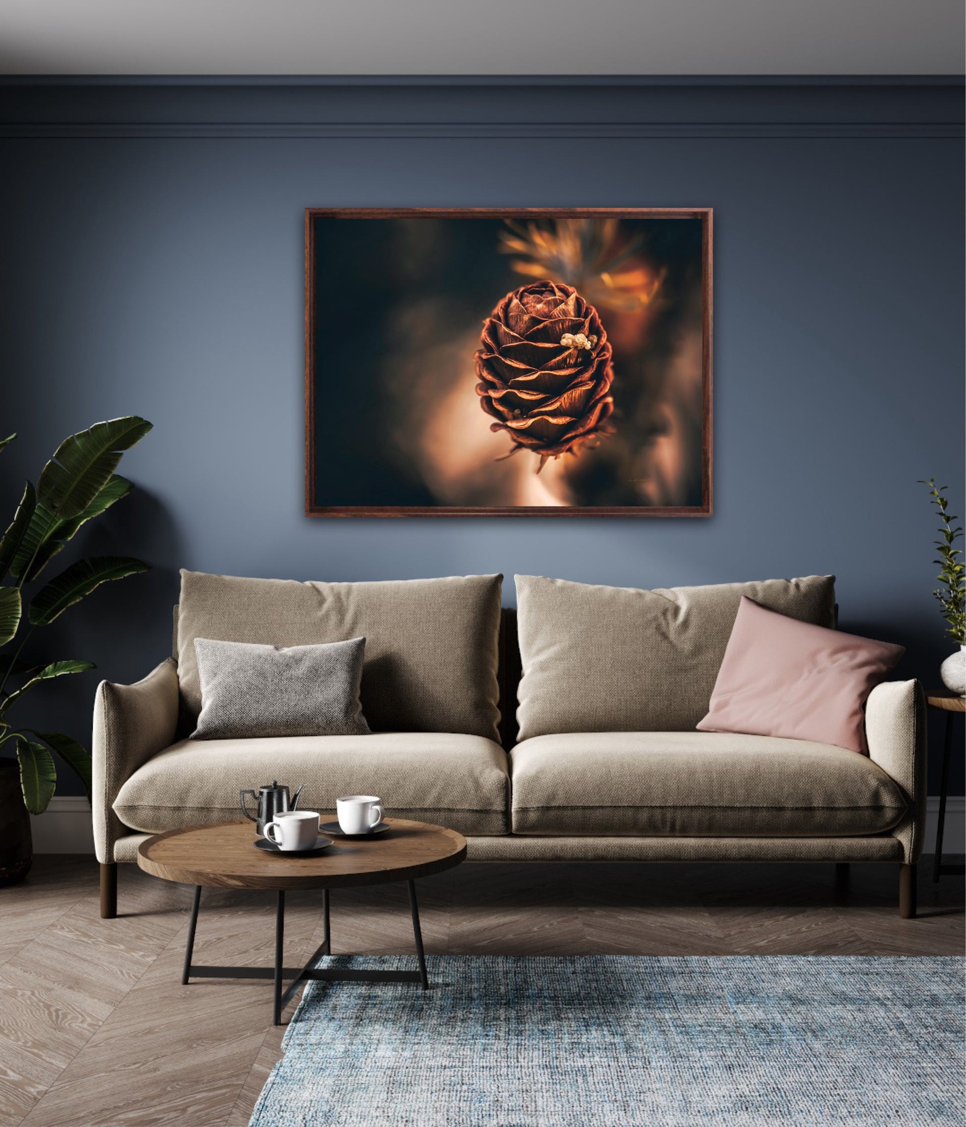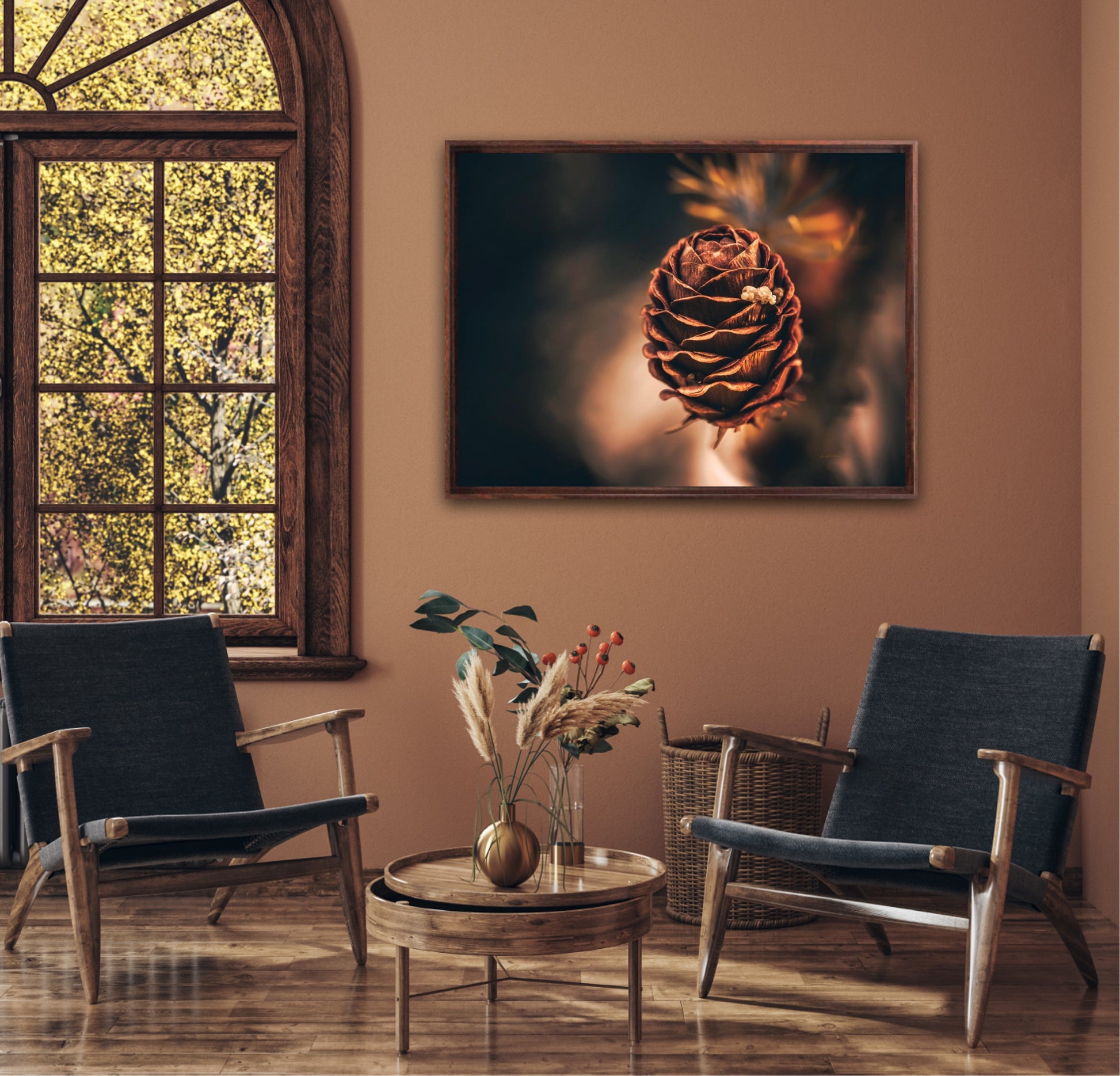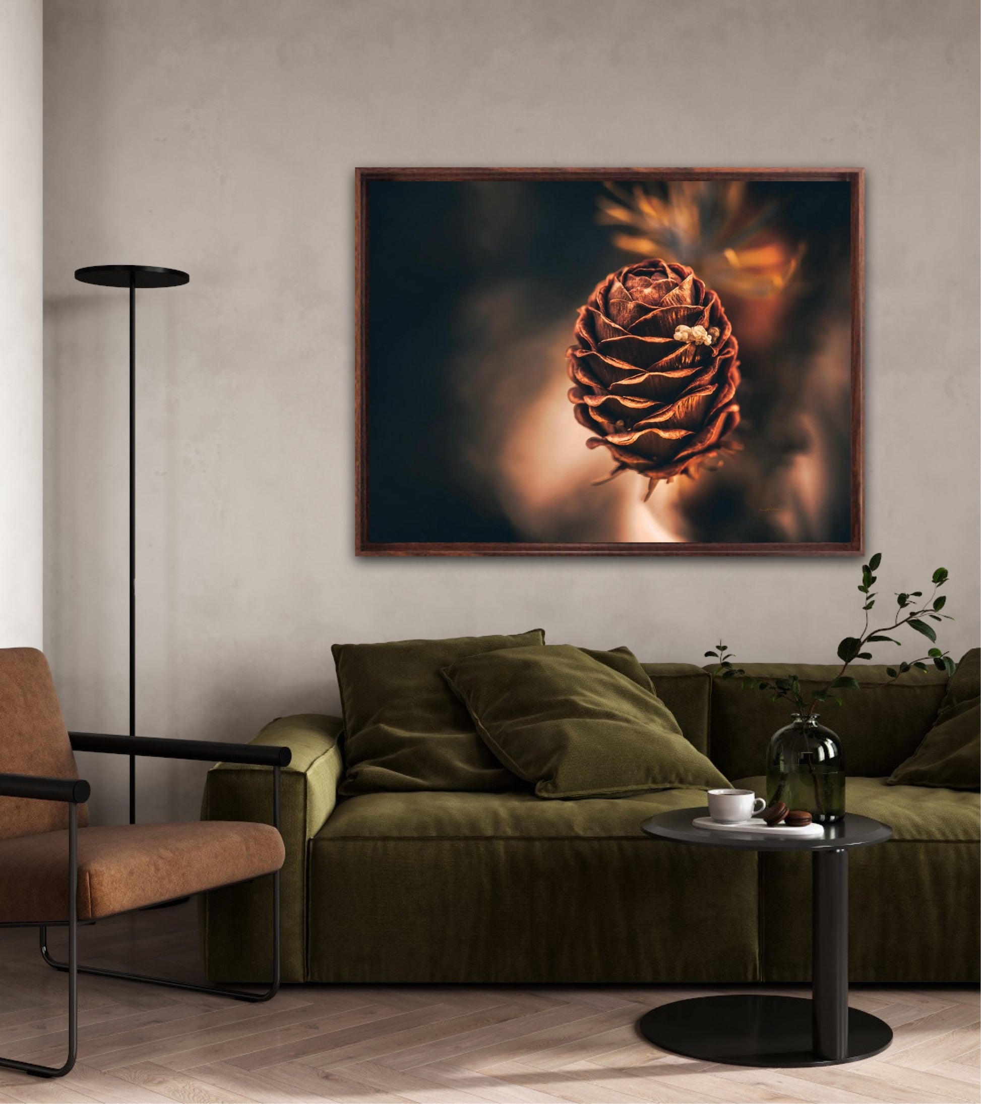 Beautiful photographic wall art of a larch cone in wonderful golden brown tones on a dynamic background of golden brown and black. This artwork will be a stand-out piece in your home and bring you peace and tranquility.