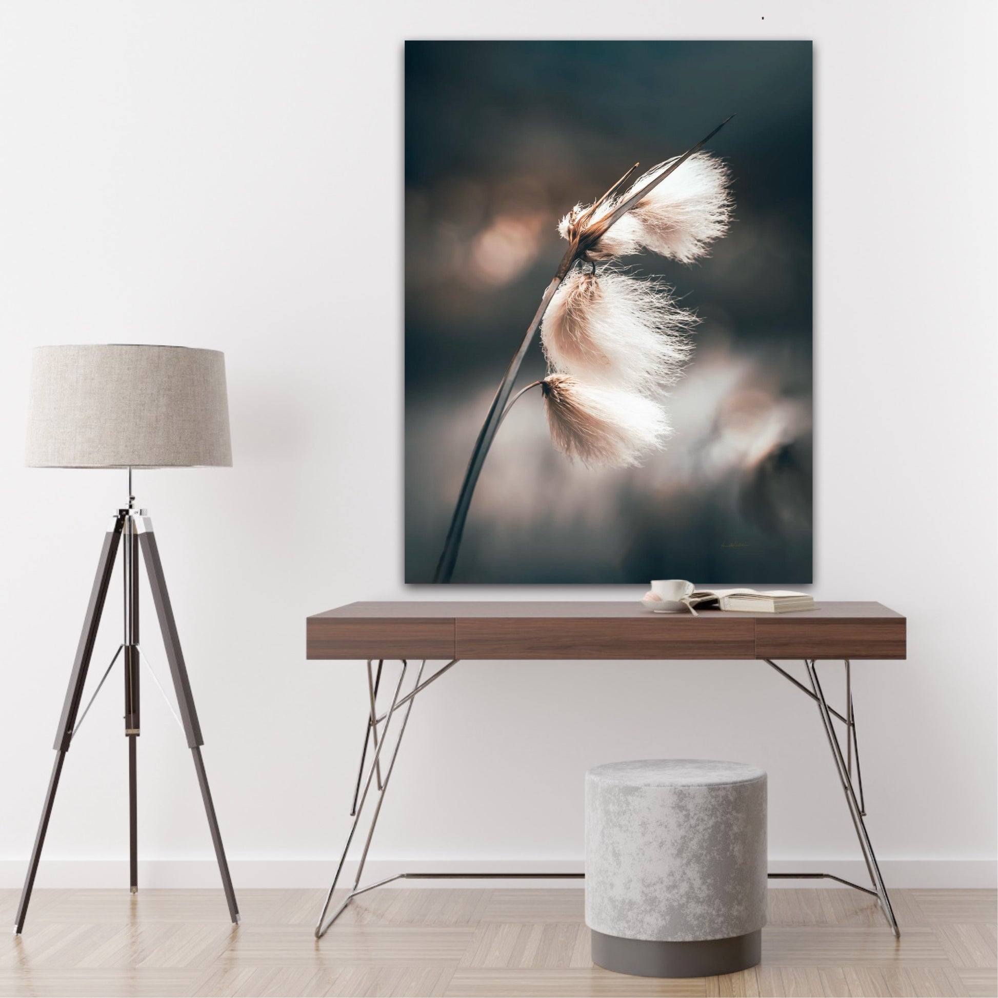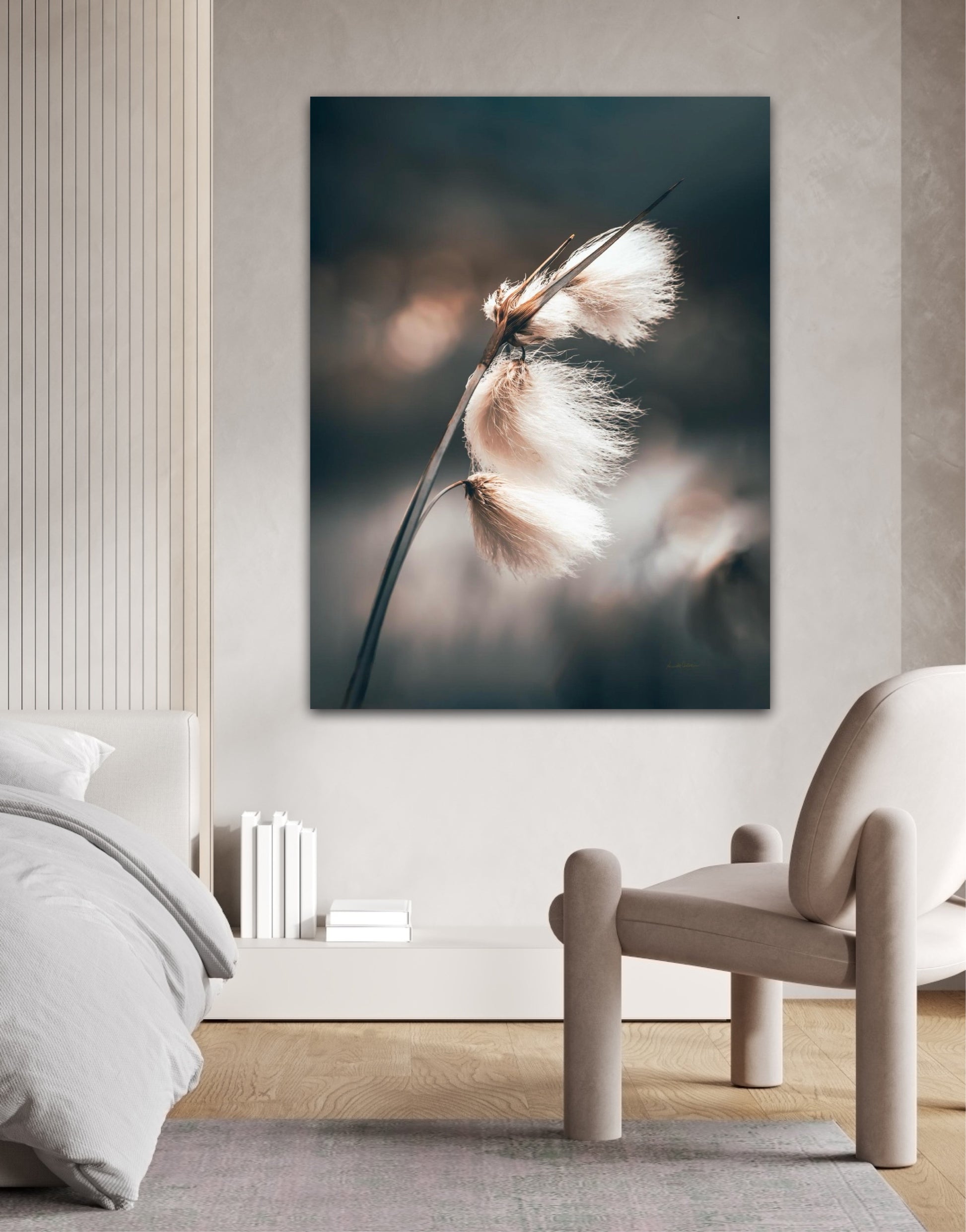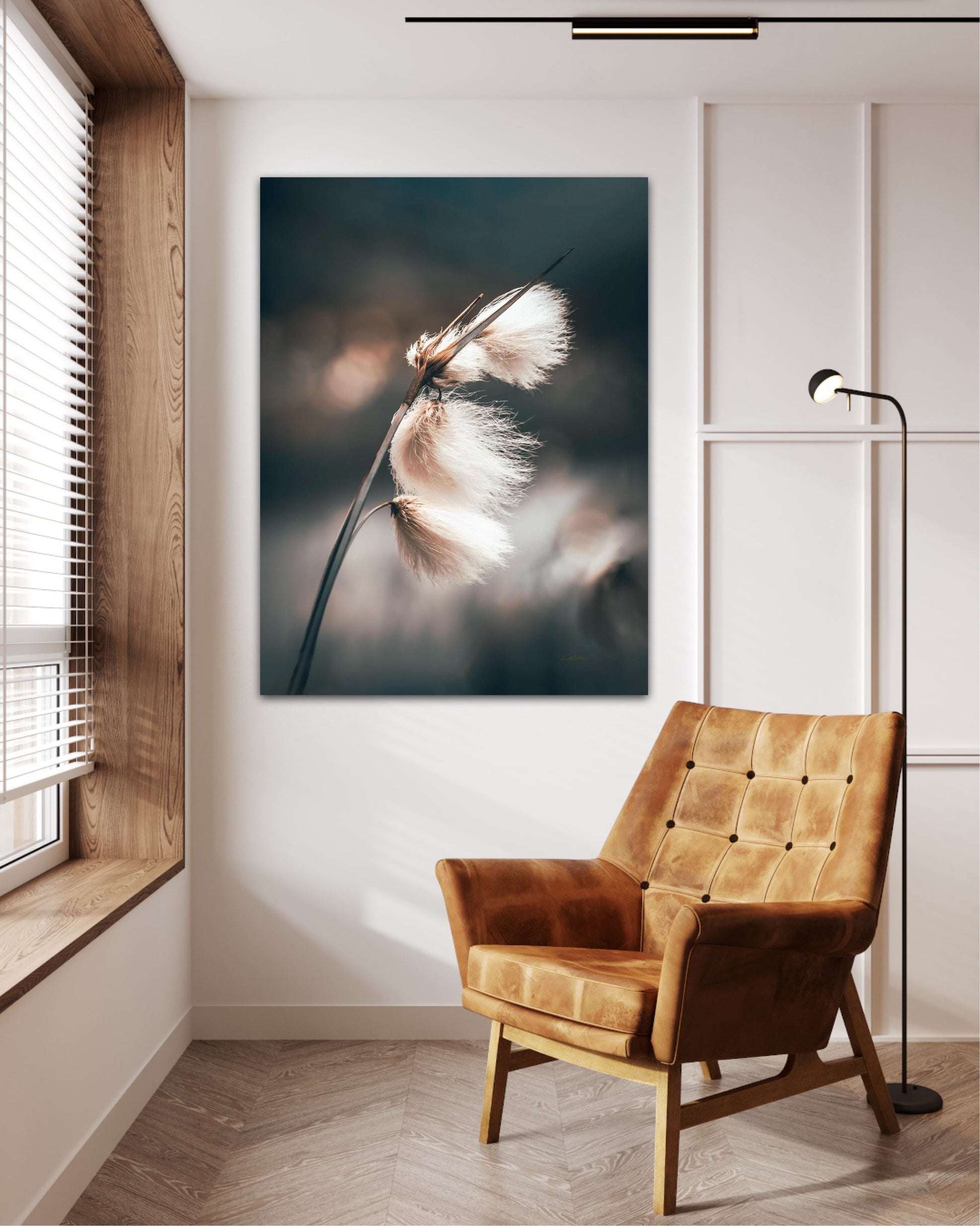 Beautiful and warm photographic art image of cottongrass in the mountain in wonderful earth tones on a dark and light background. Beautiful and peaceful, get the good feeling with this beautiful artwork.