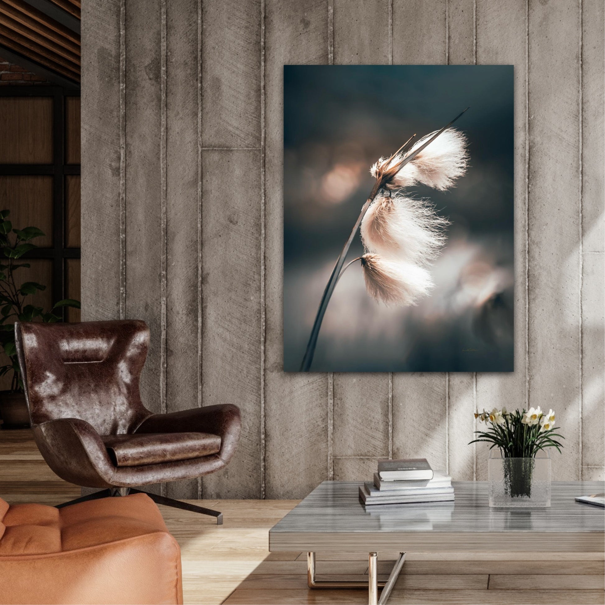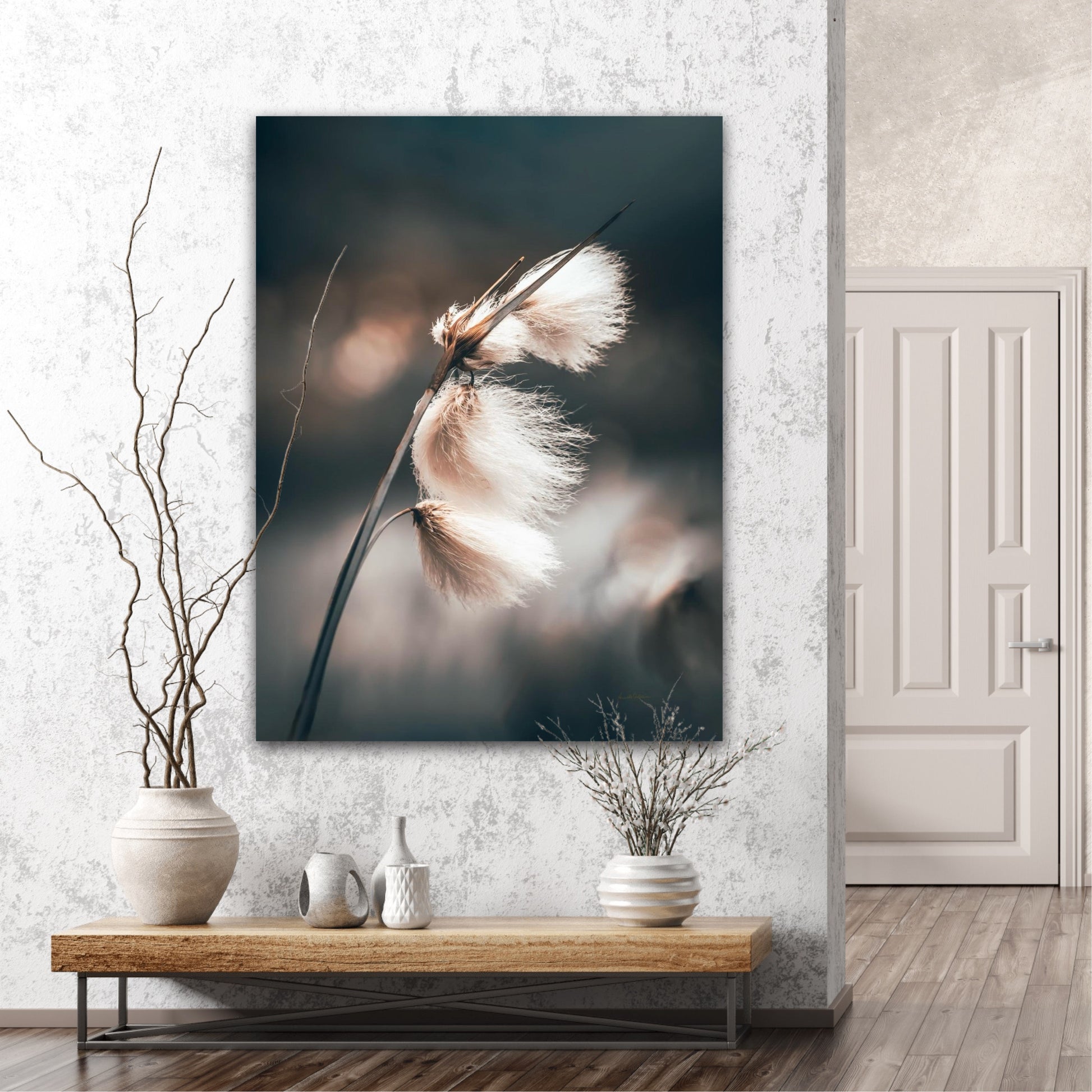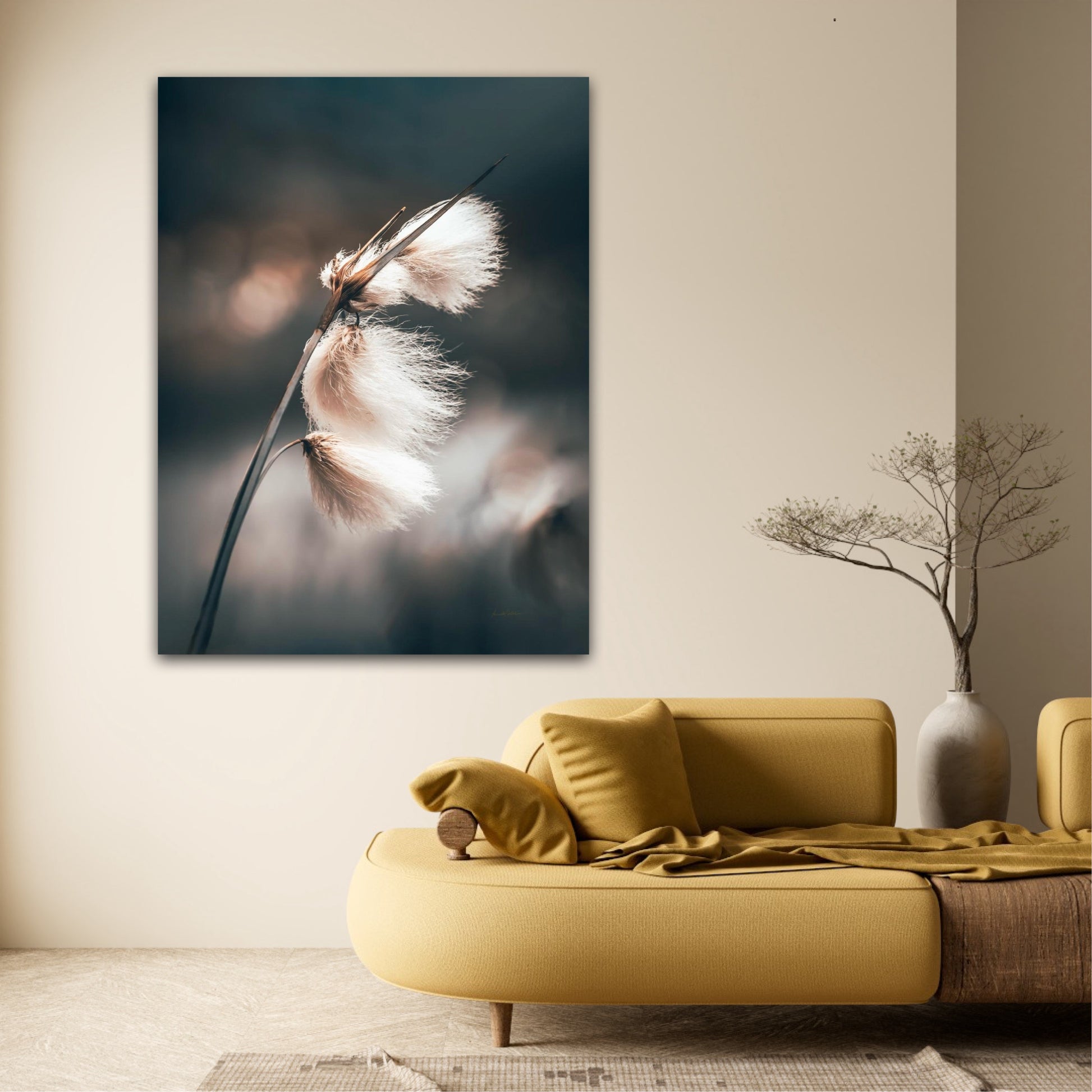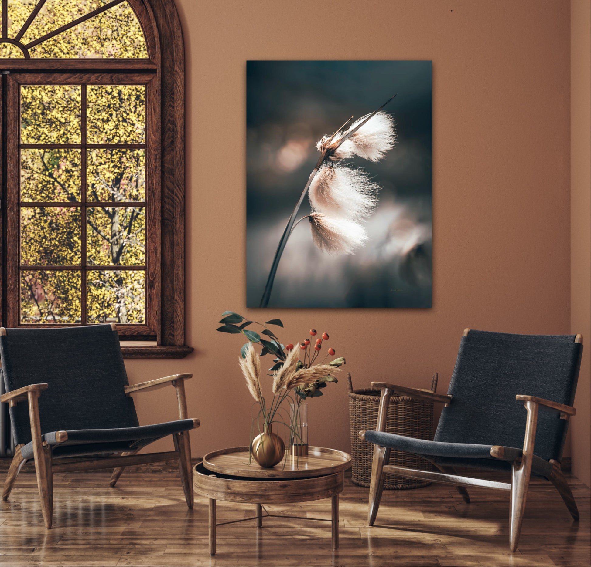 Beautiful and warm photographic art image of cottongrass in the mountain in wonderful earth tones on a dark and light background. Beautiful and peaceful, get the good feeling with this beautiful artwork.