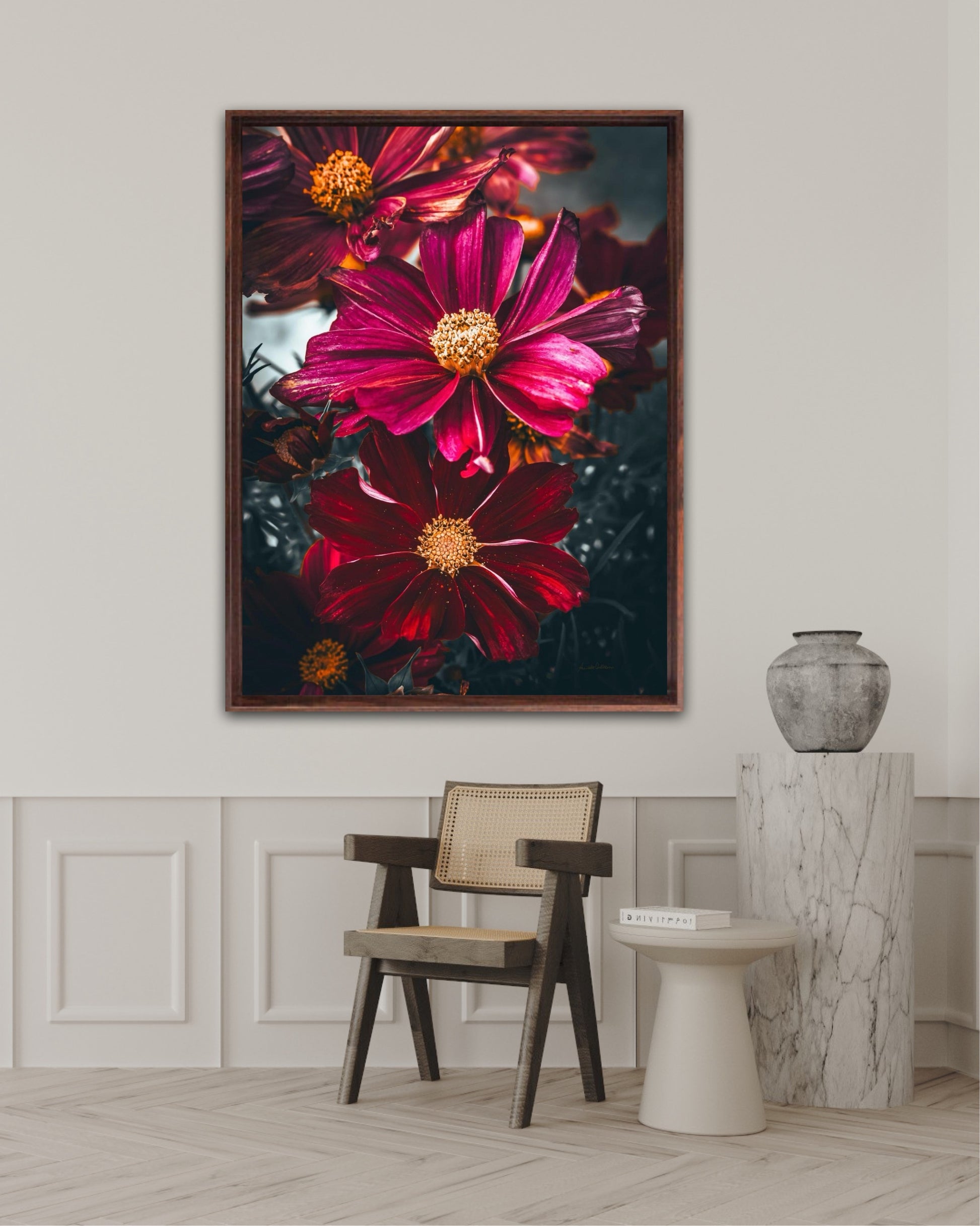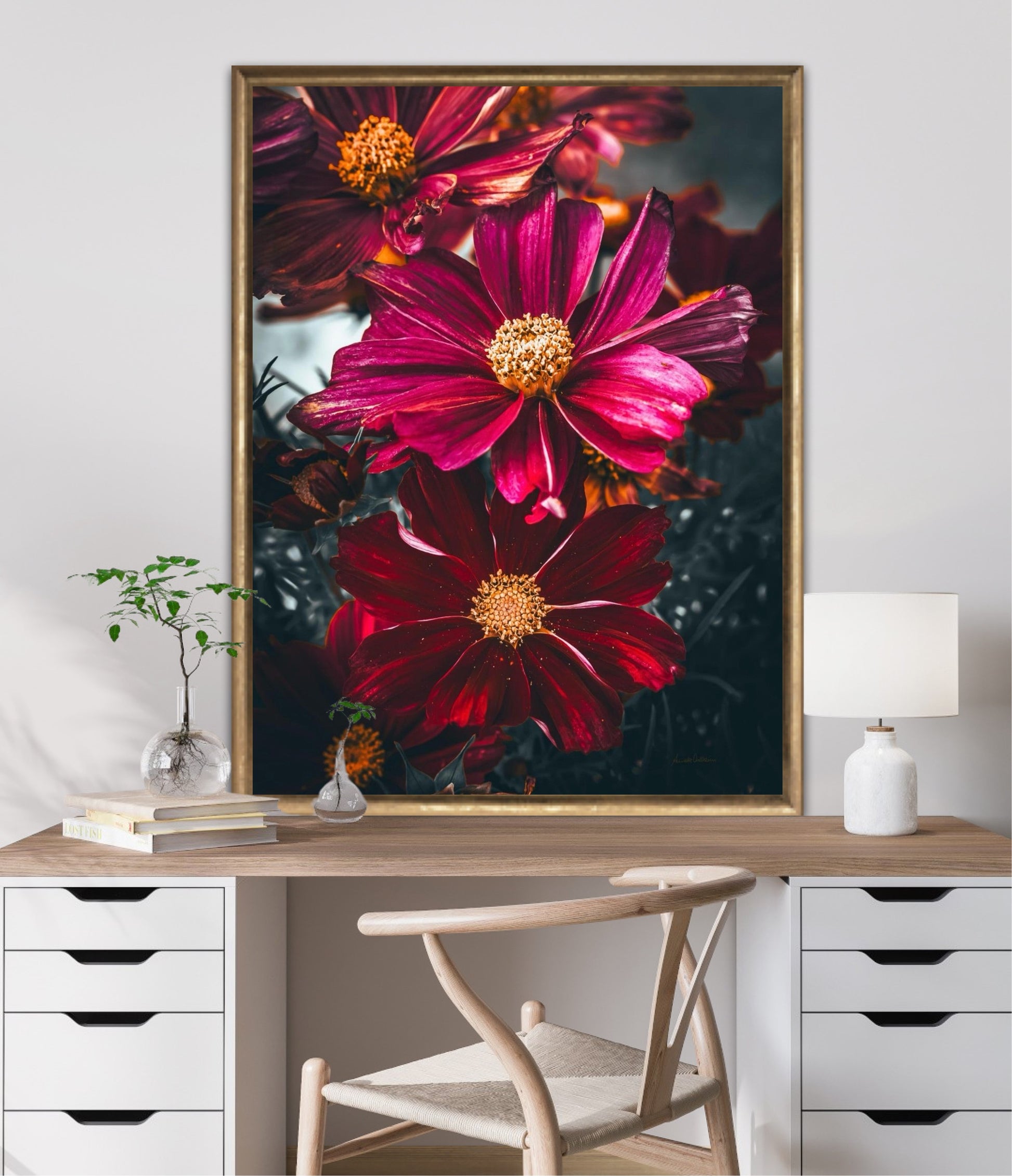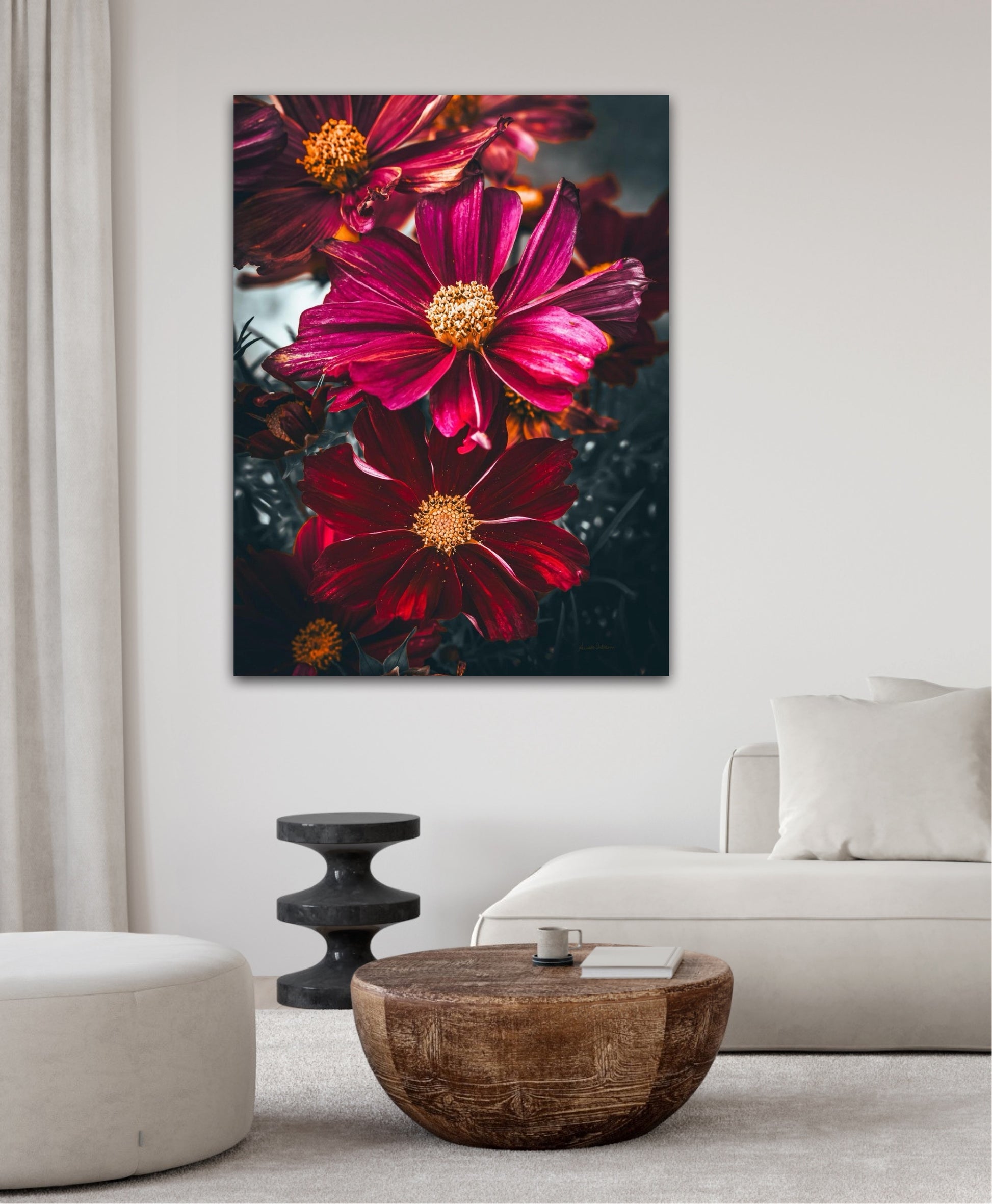 Striking photographic wall art of a Cosmos flower close up in stunning pink and red tones, on a dark background. This artwork will be a stand-out piece in your home and bring you peace and tranquility.