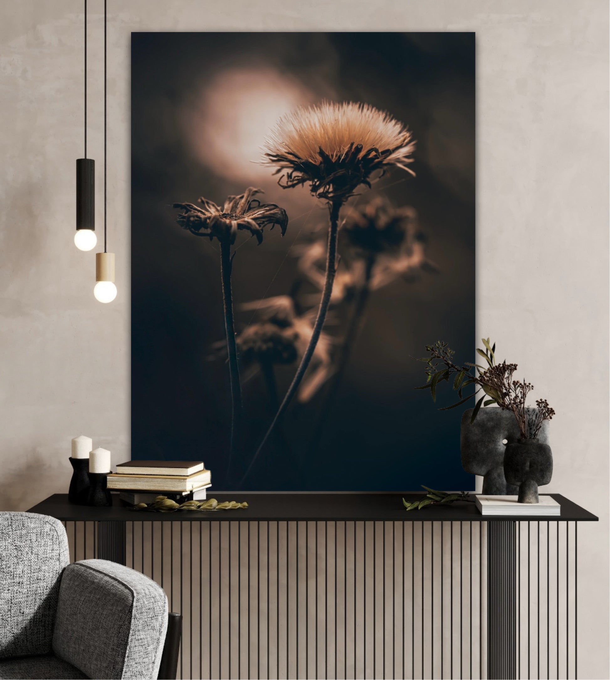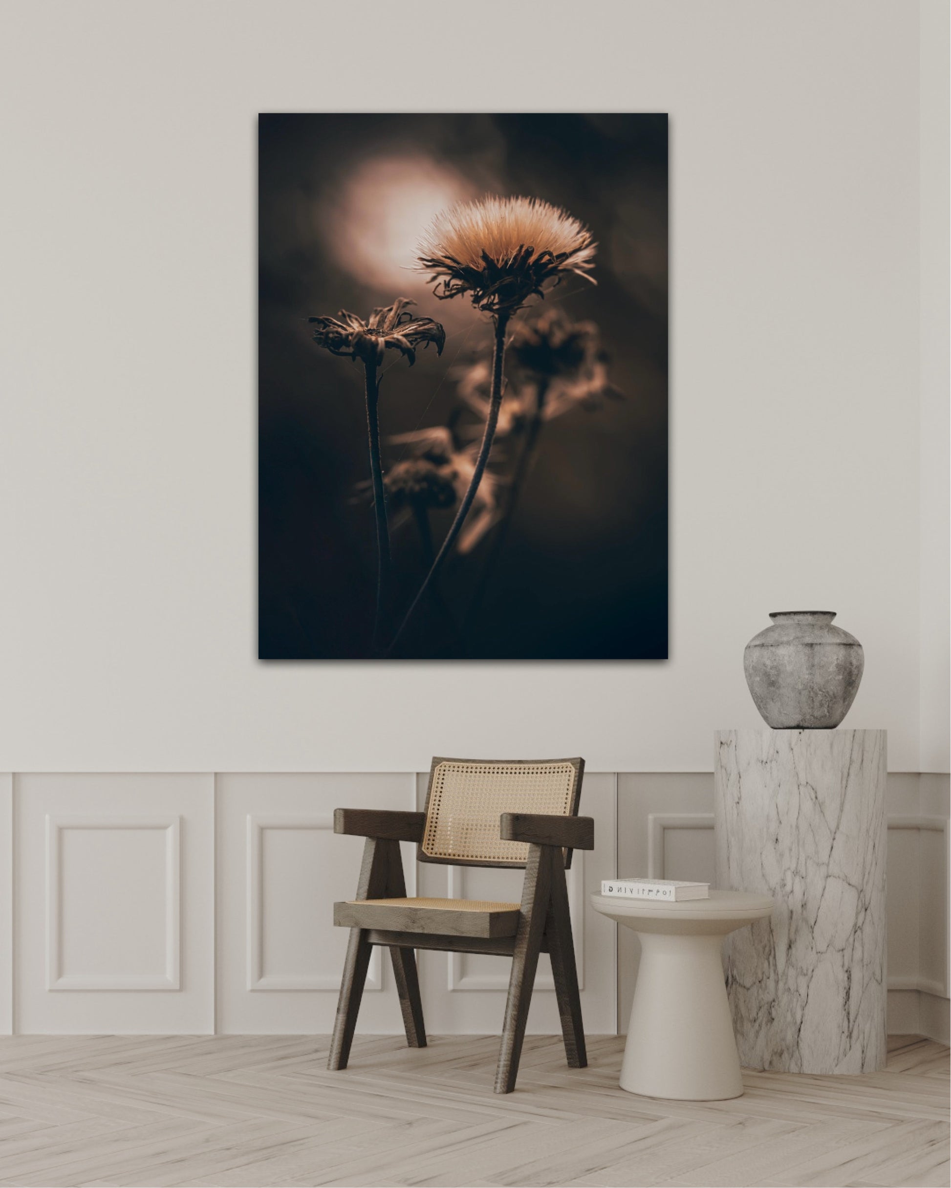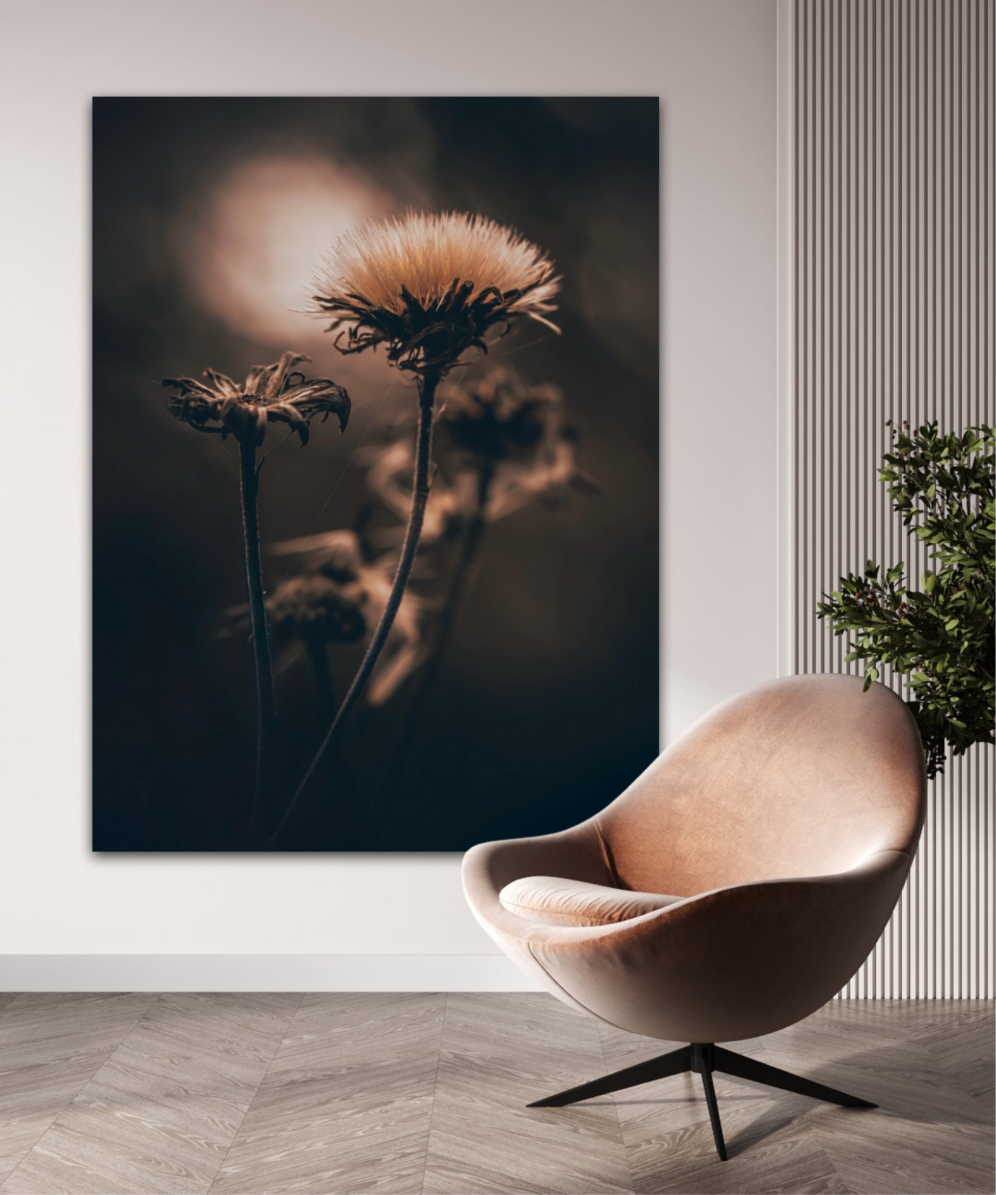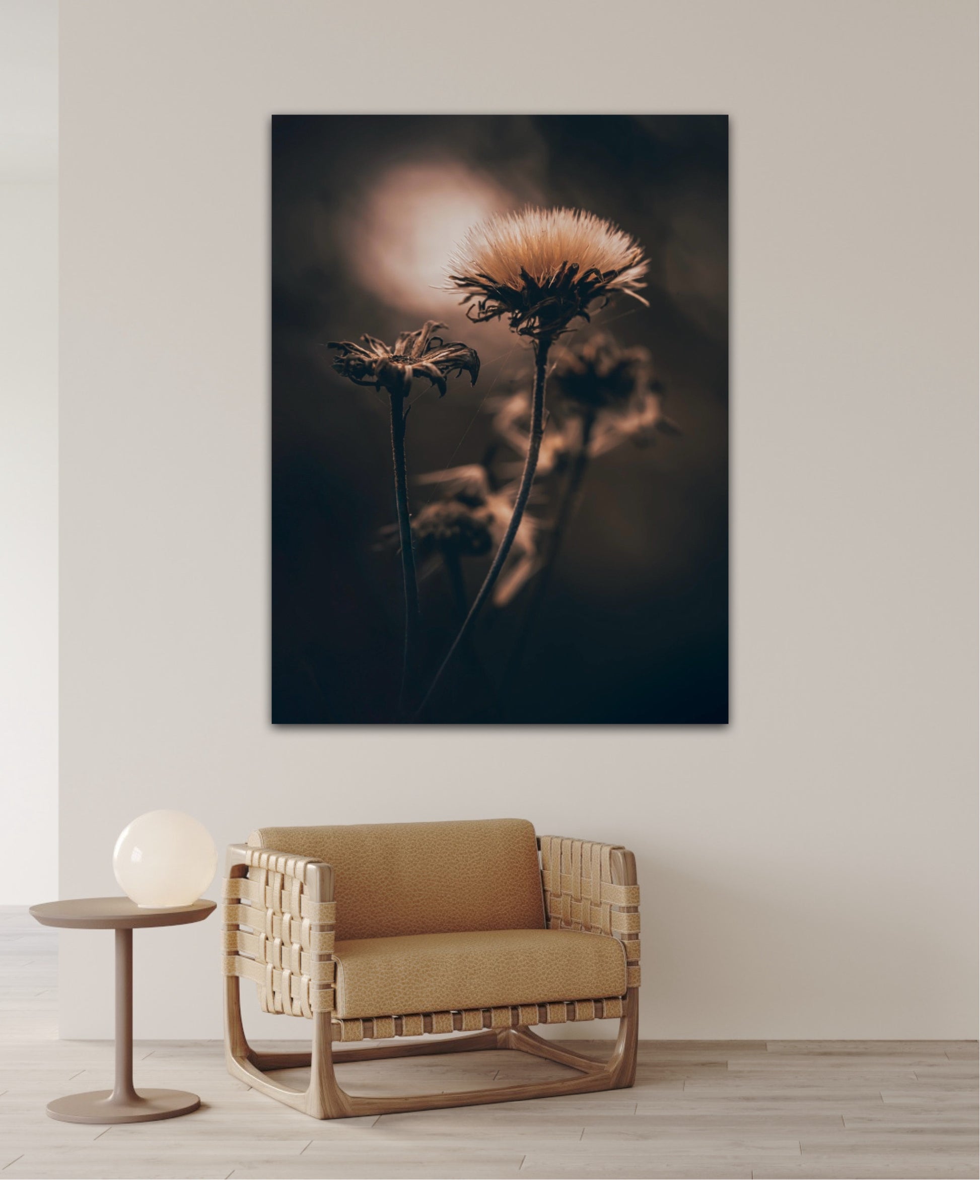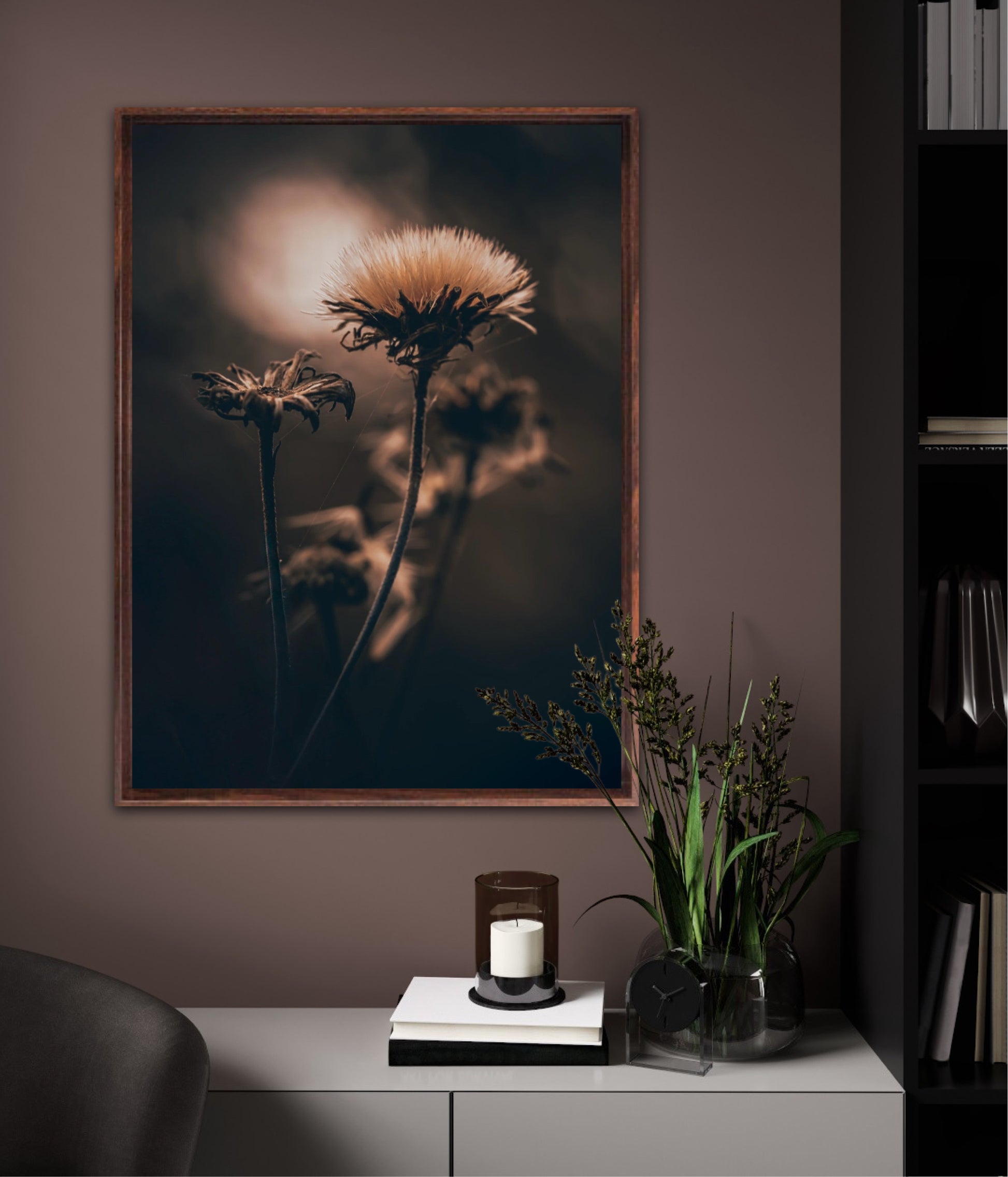 Beautiful photographic wall art of a fluffy, withered plant. The wallart has dramatic light ang comes in a beige, brown and black color.