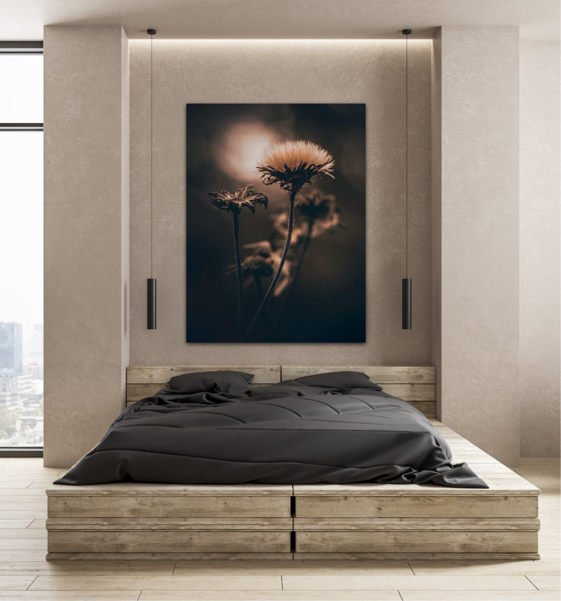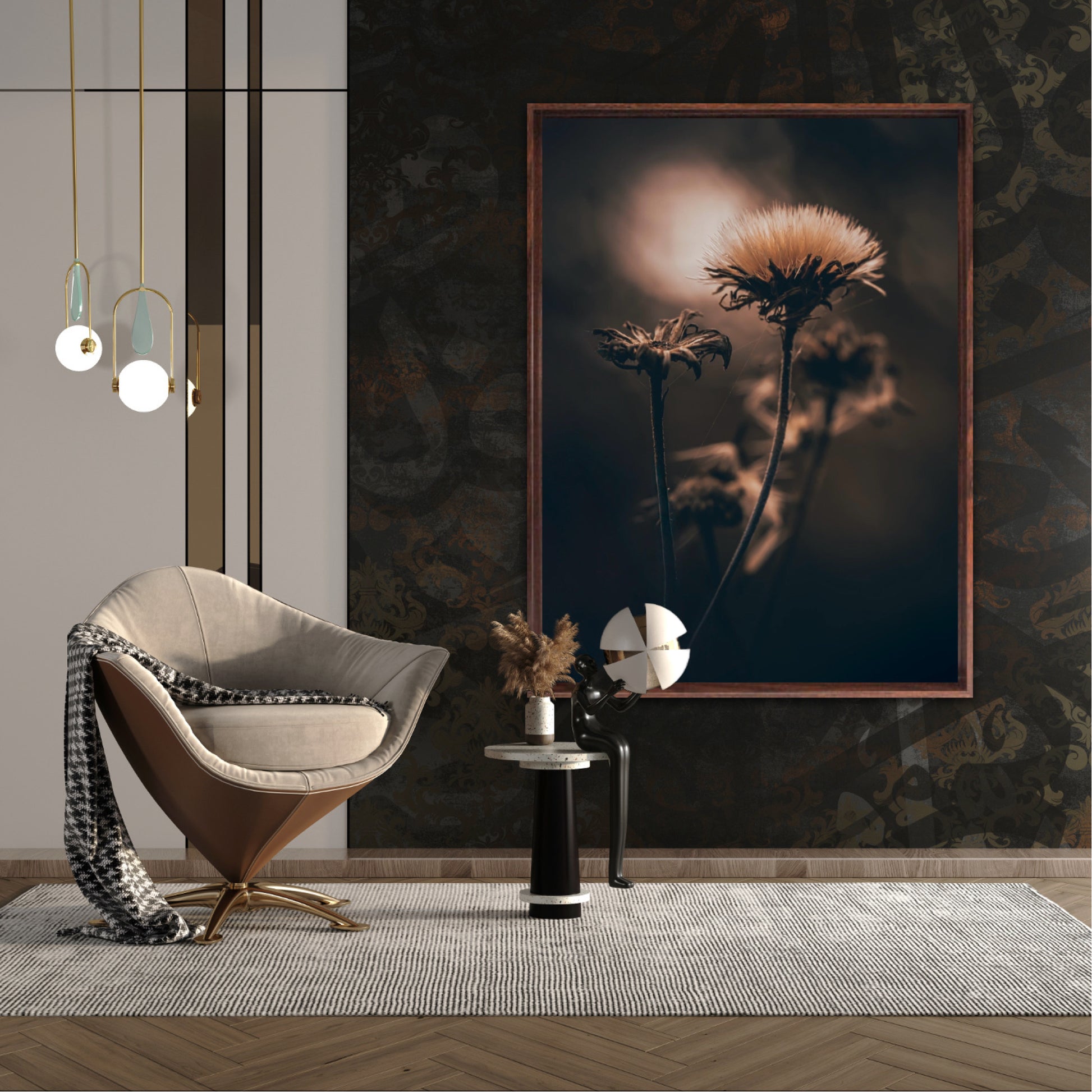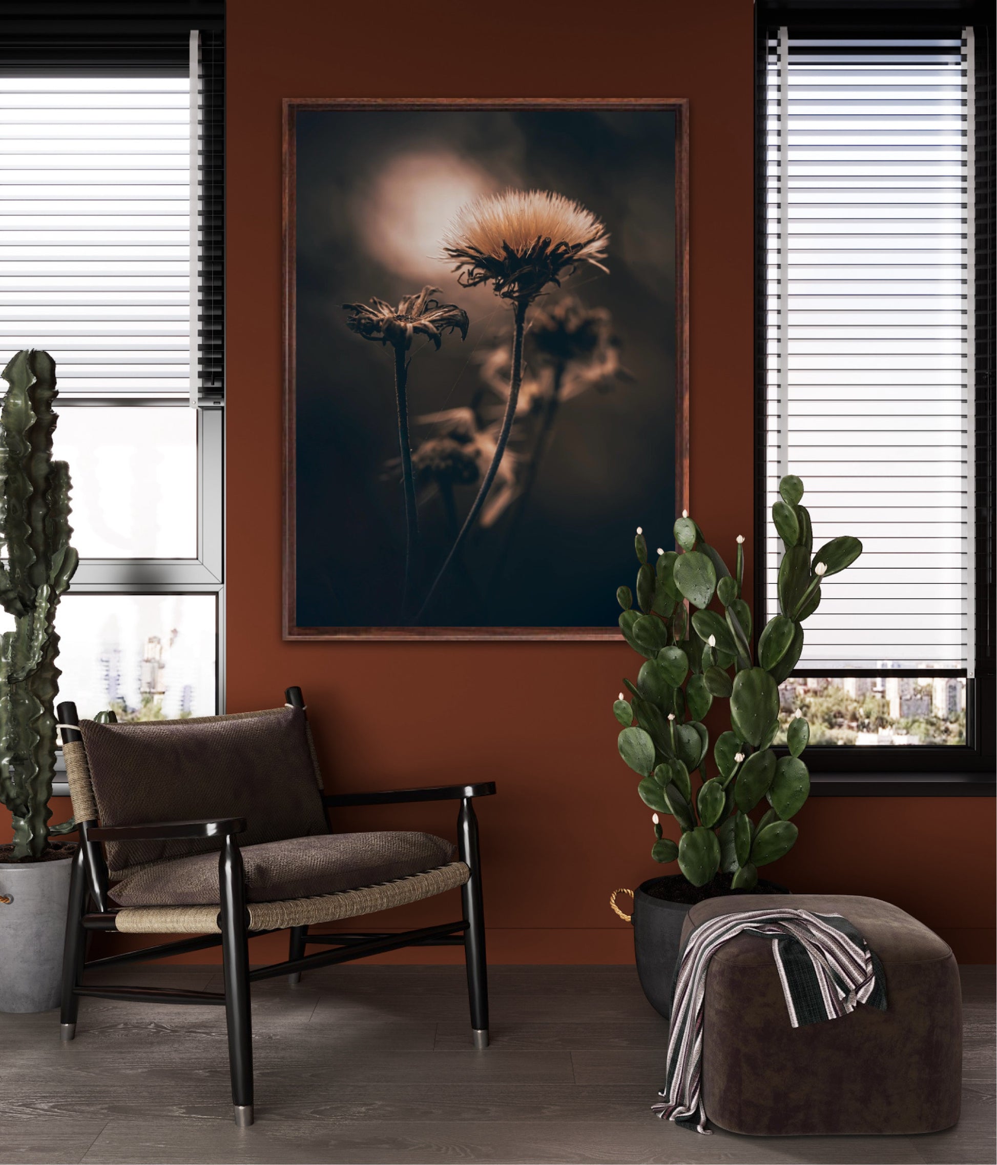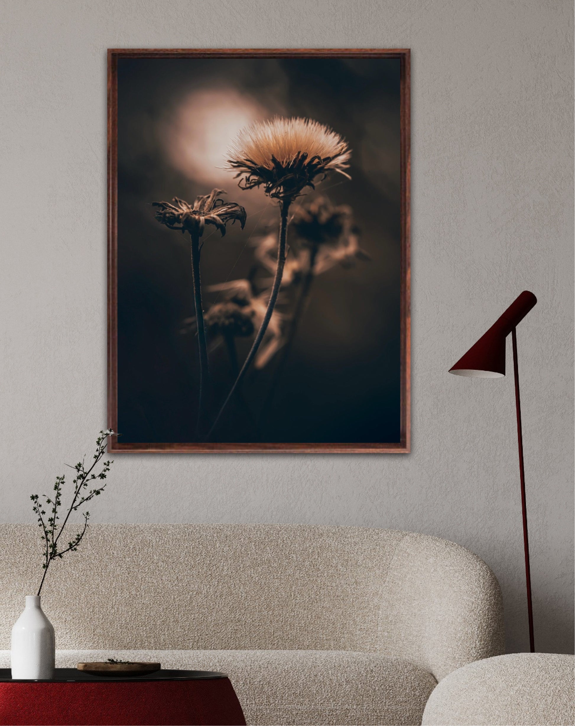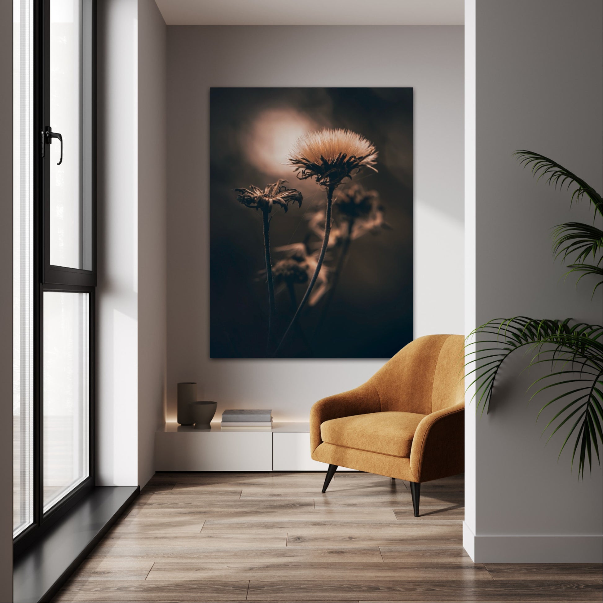 Beautiful photographic wall art of a fluffy, withered plant. The wallart has dramatic light ang comes in a beige, brown and black color.