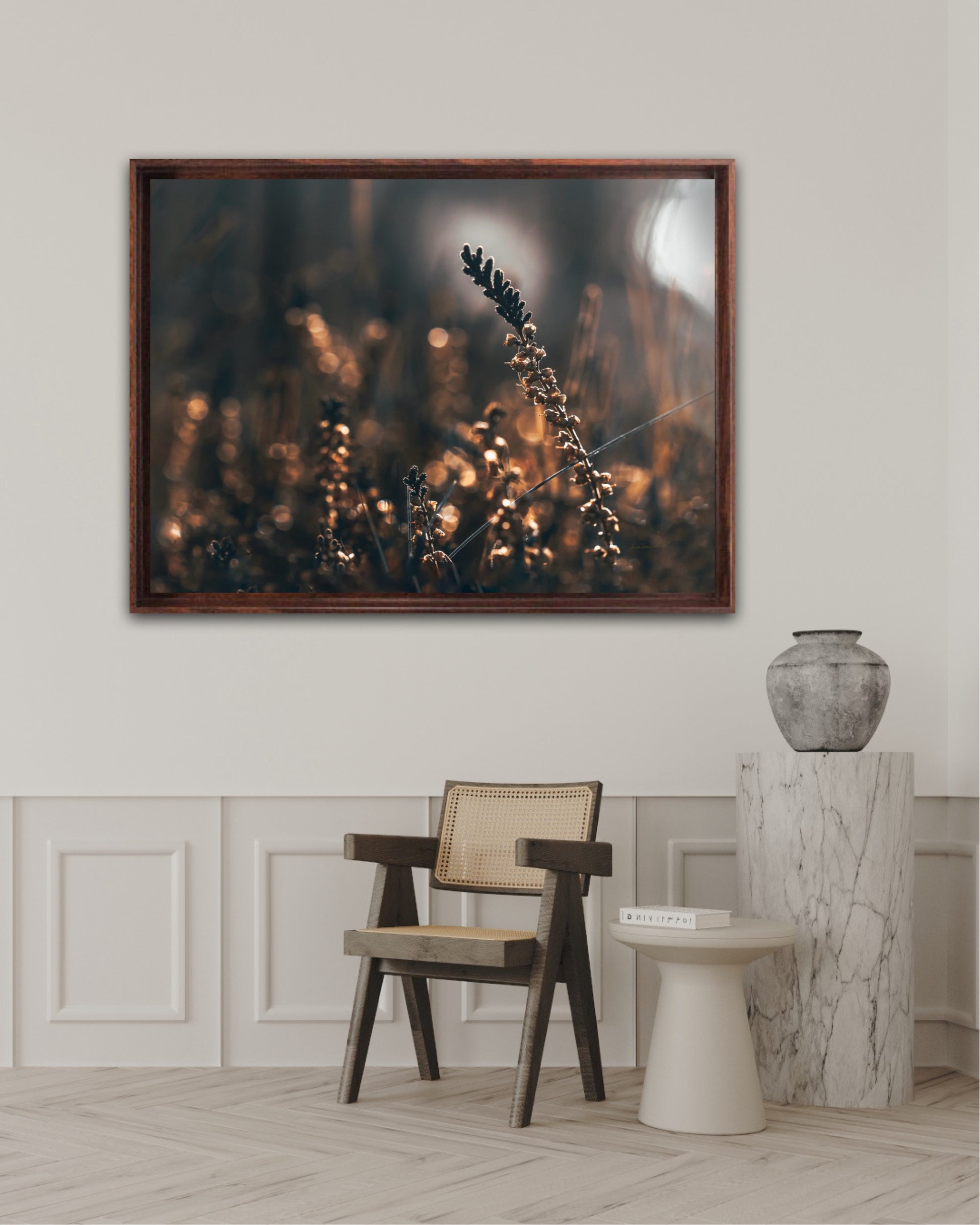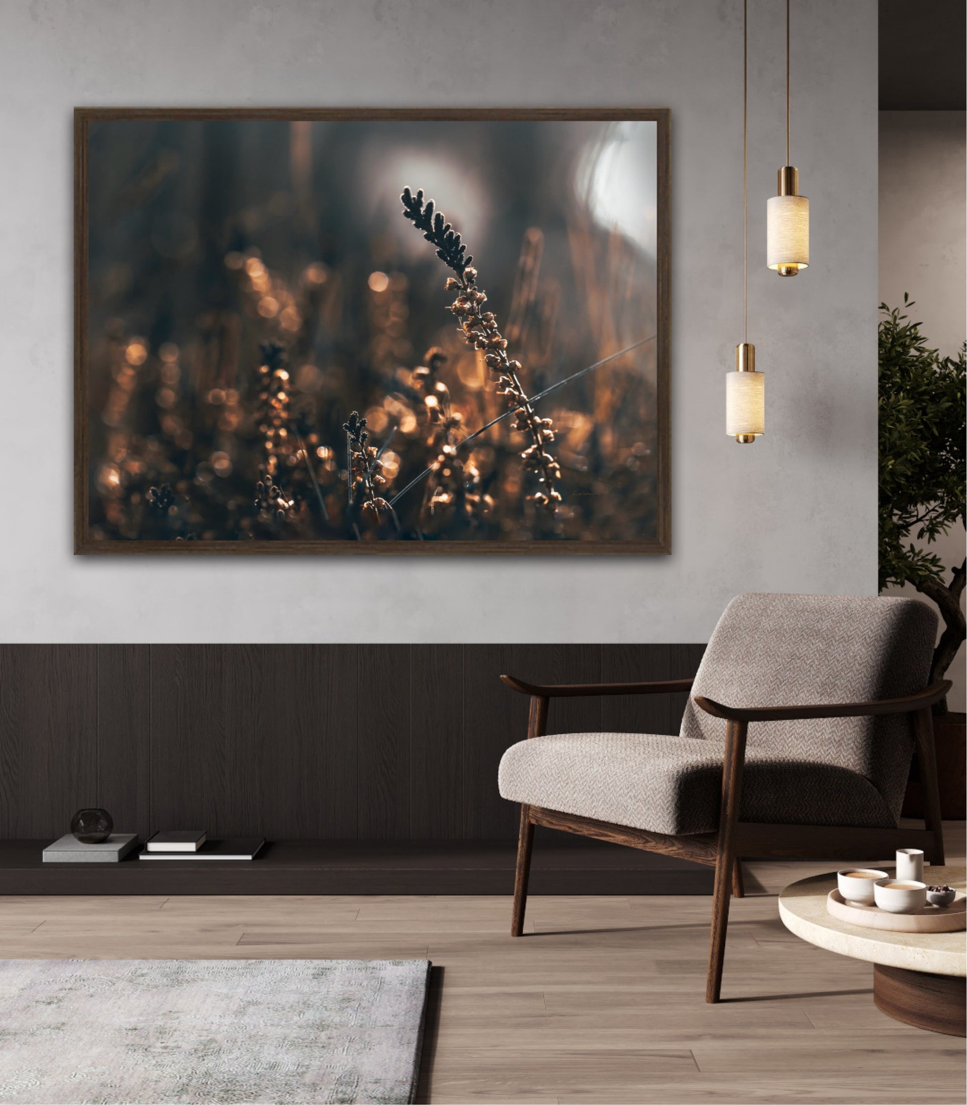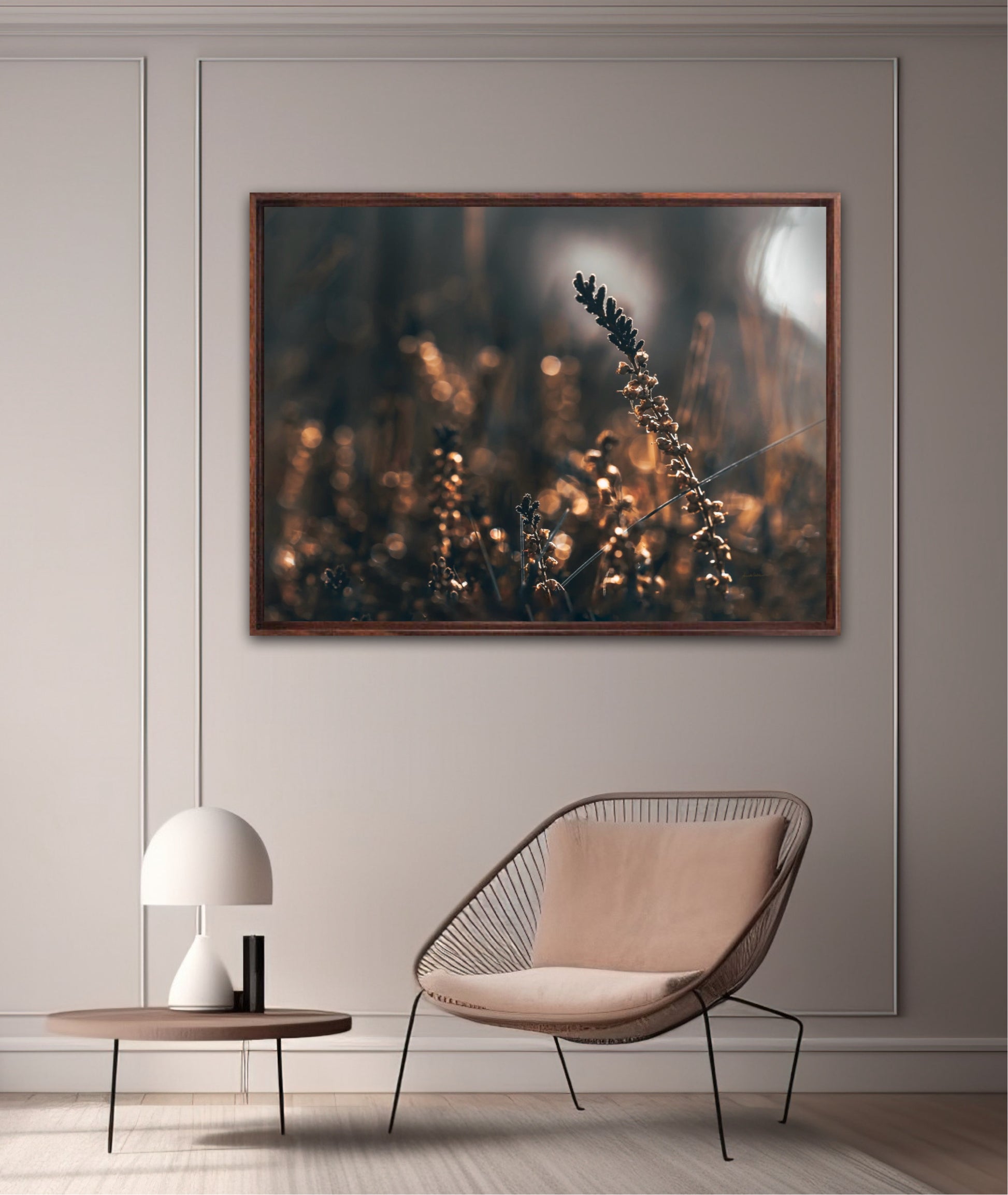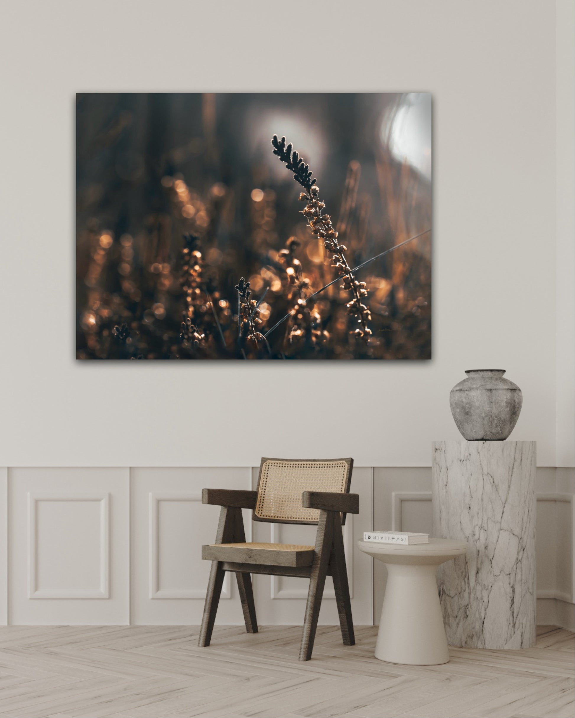 Beautiful photographic wall art of heather in warm, golden tones. This wall art gives your home a really cosy vibe.