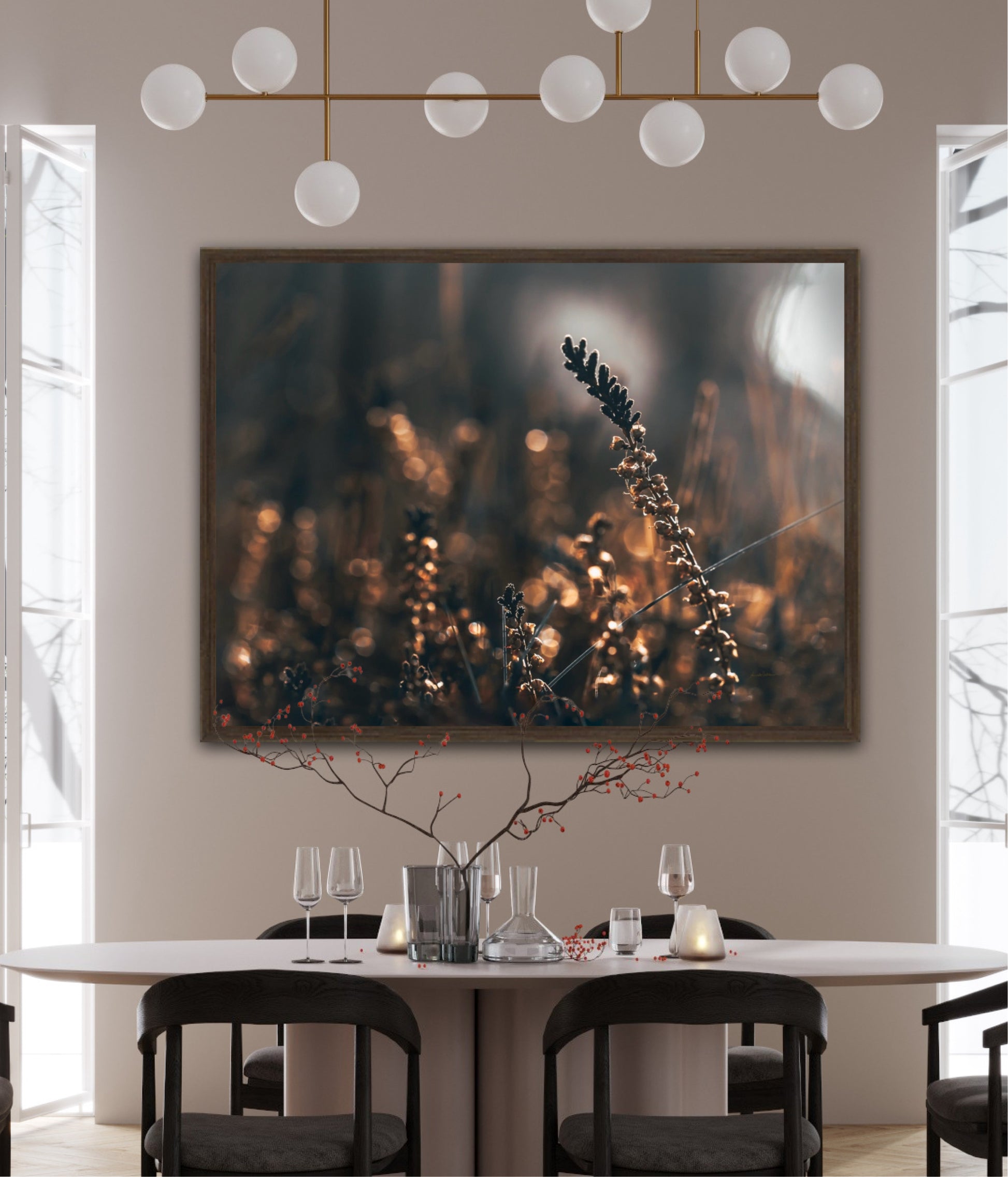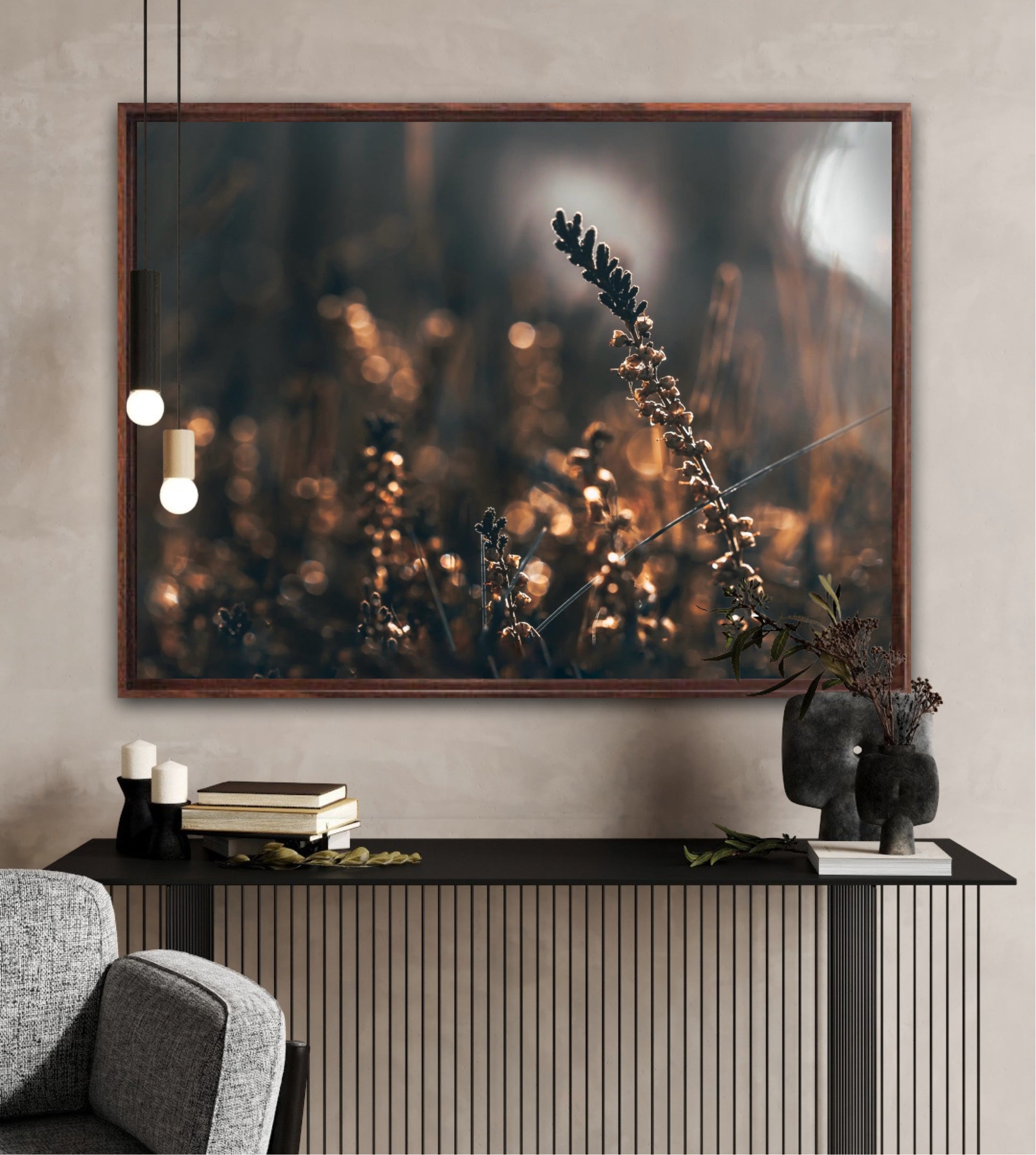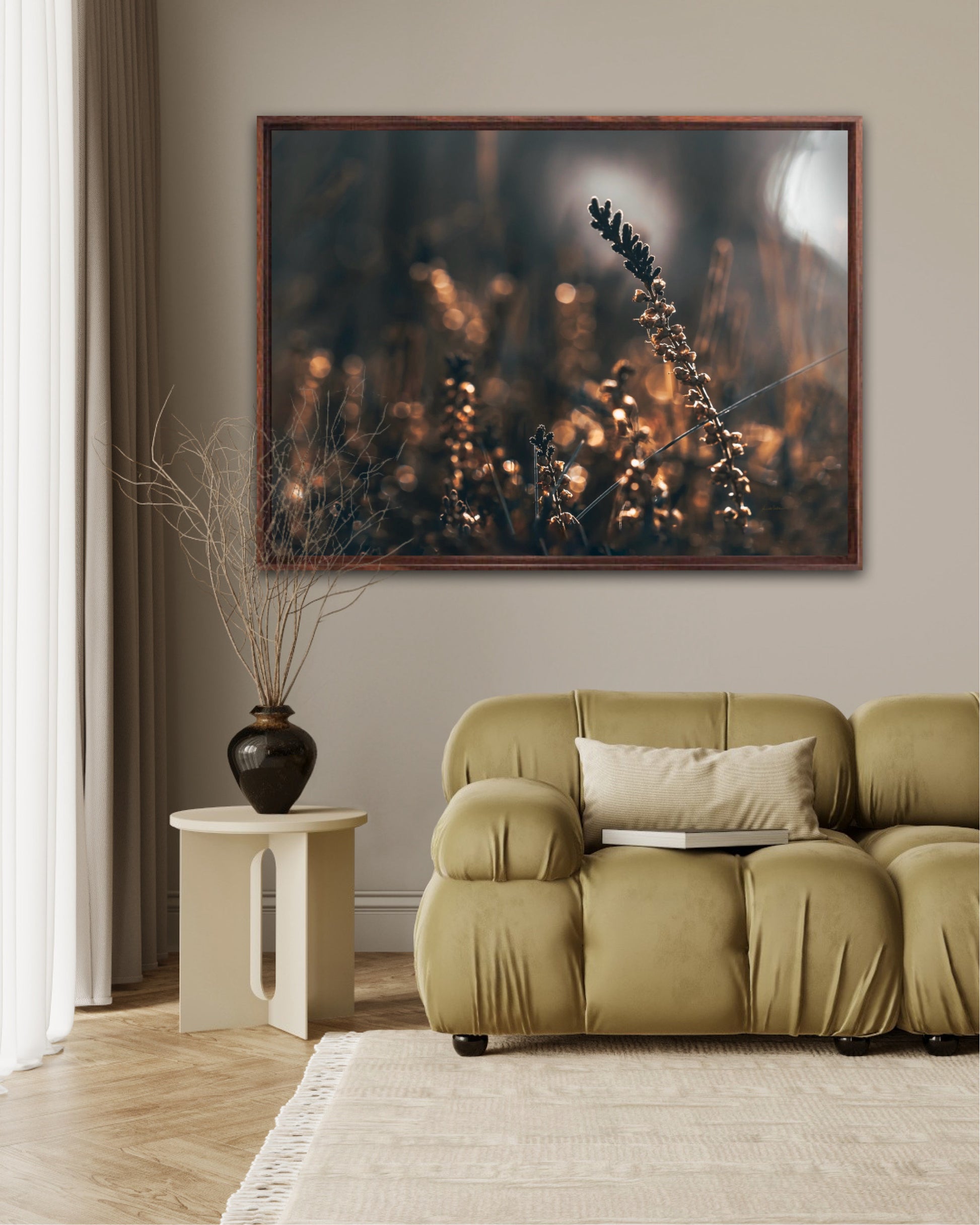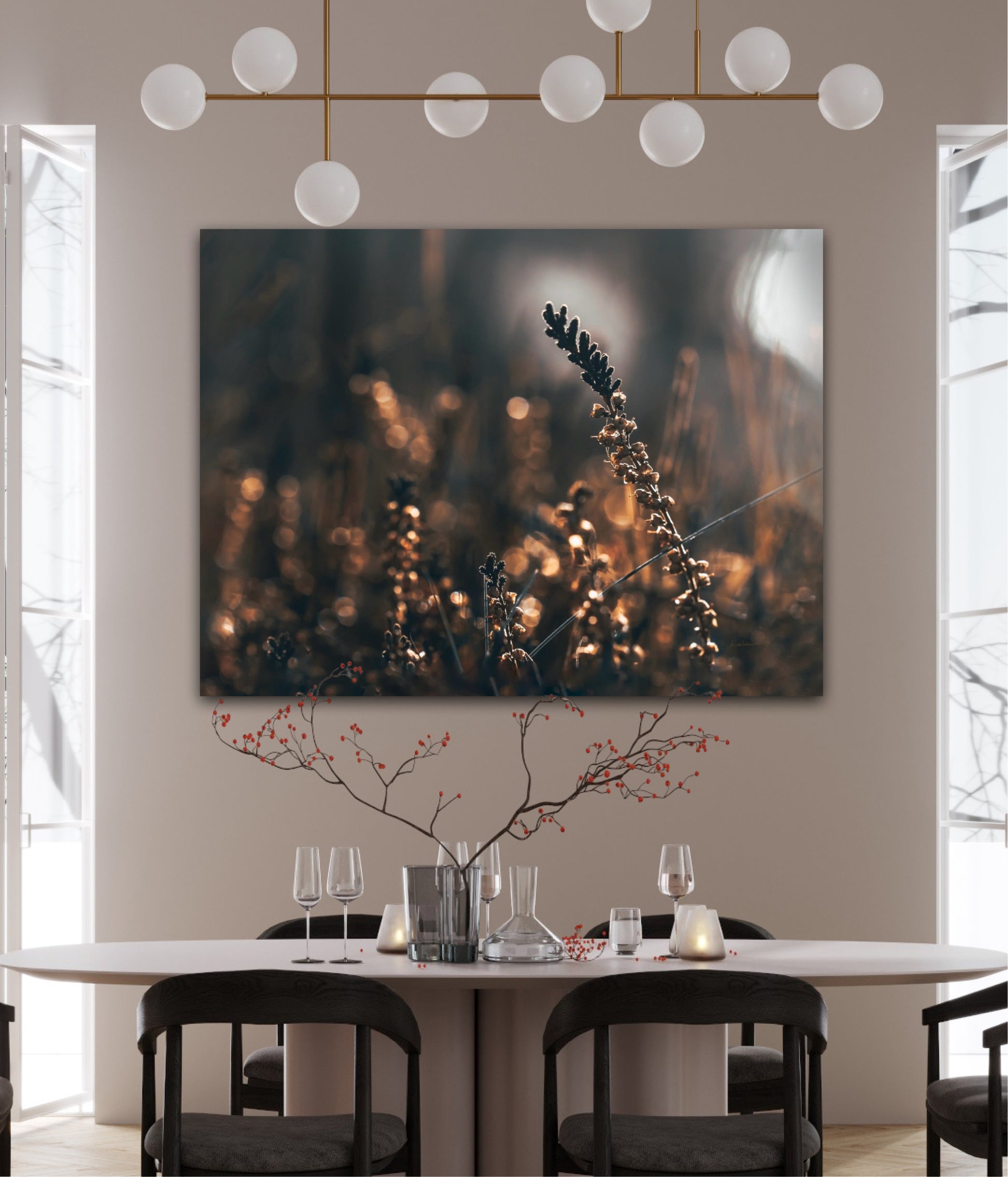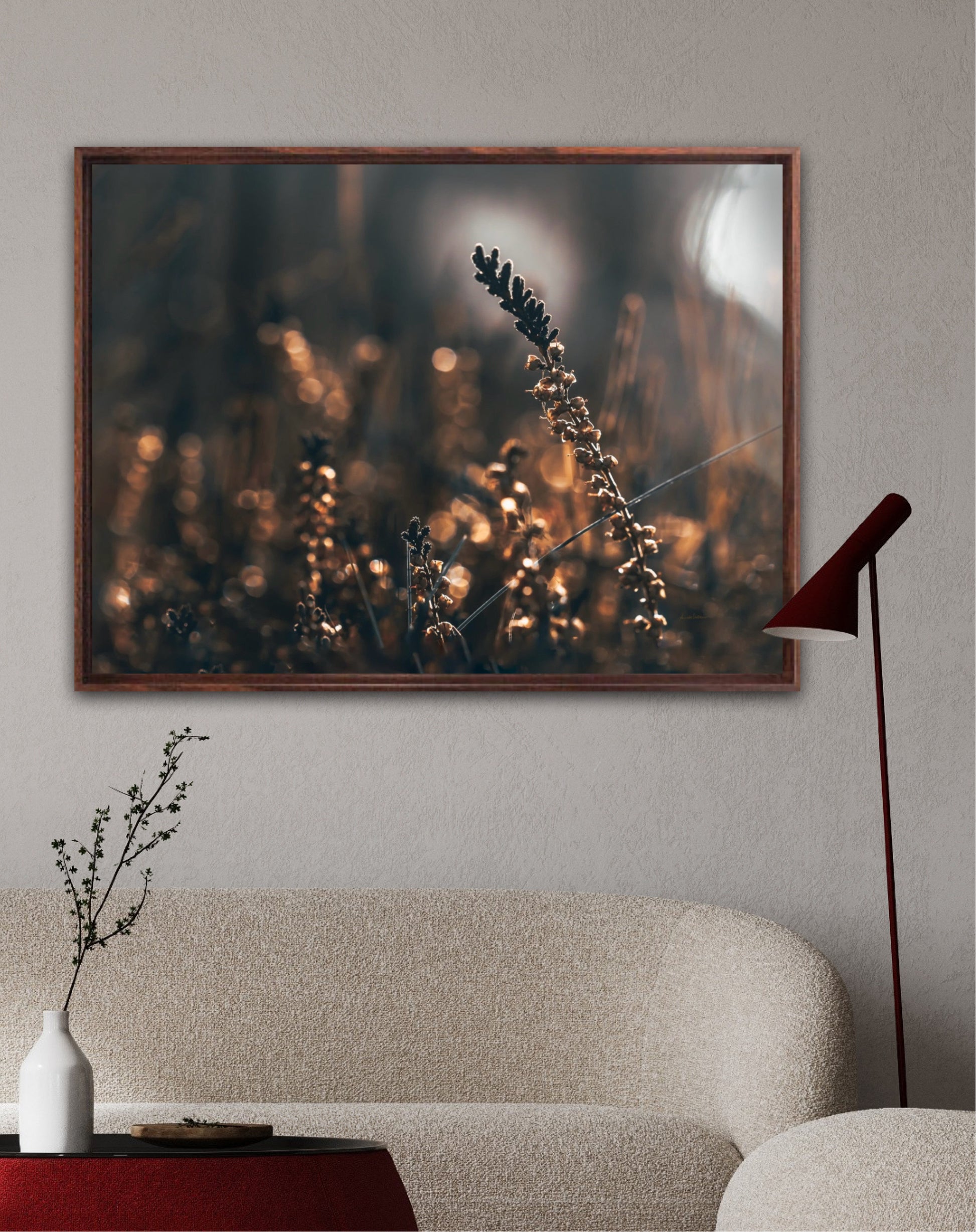 Beautiful photographic wall art of heather in warm, golden tones. This wall art gives your home a really cosy vibe.