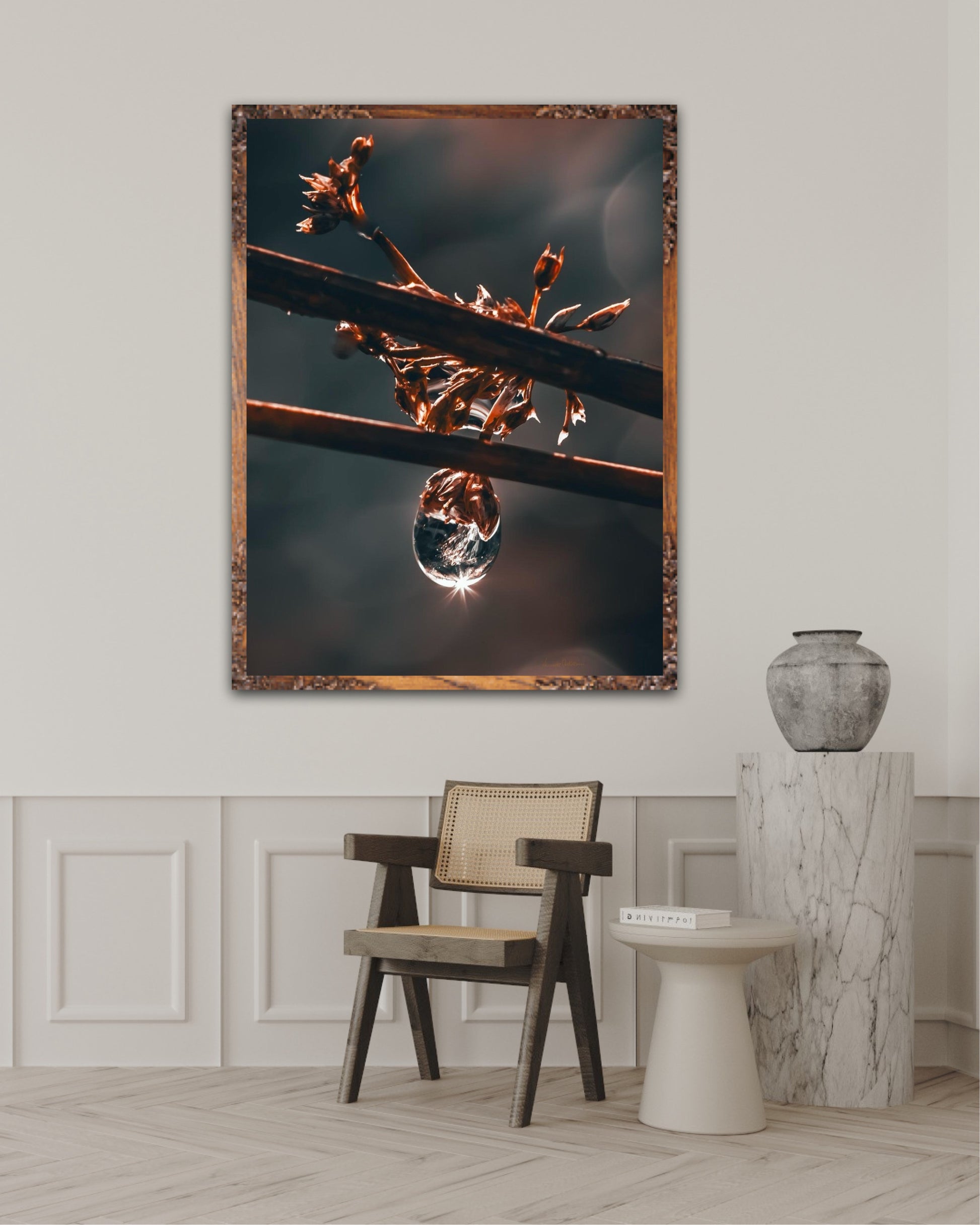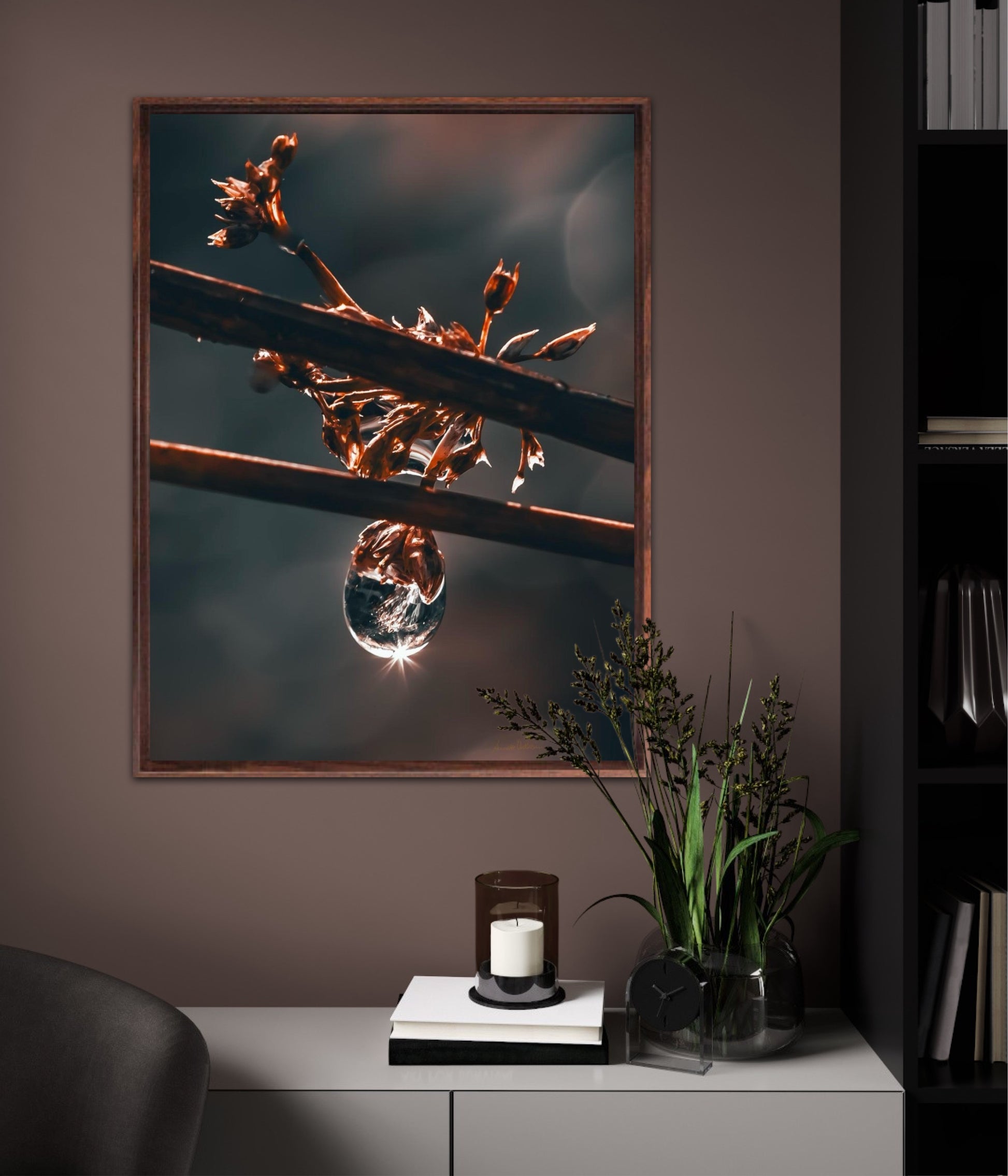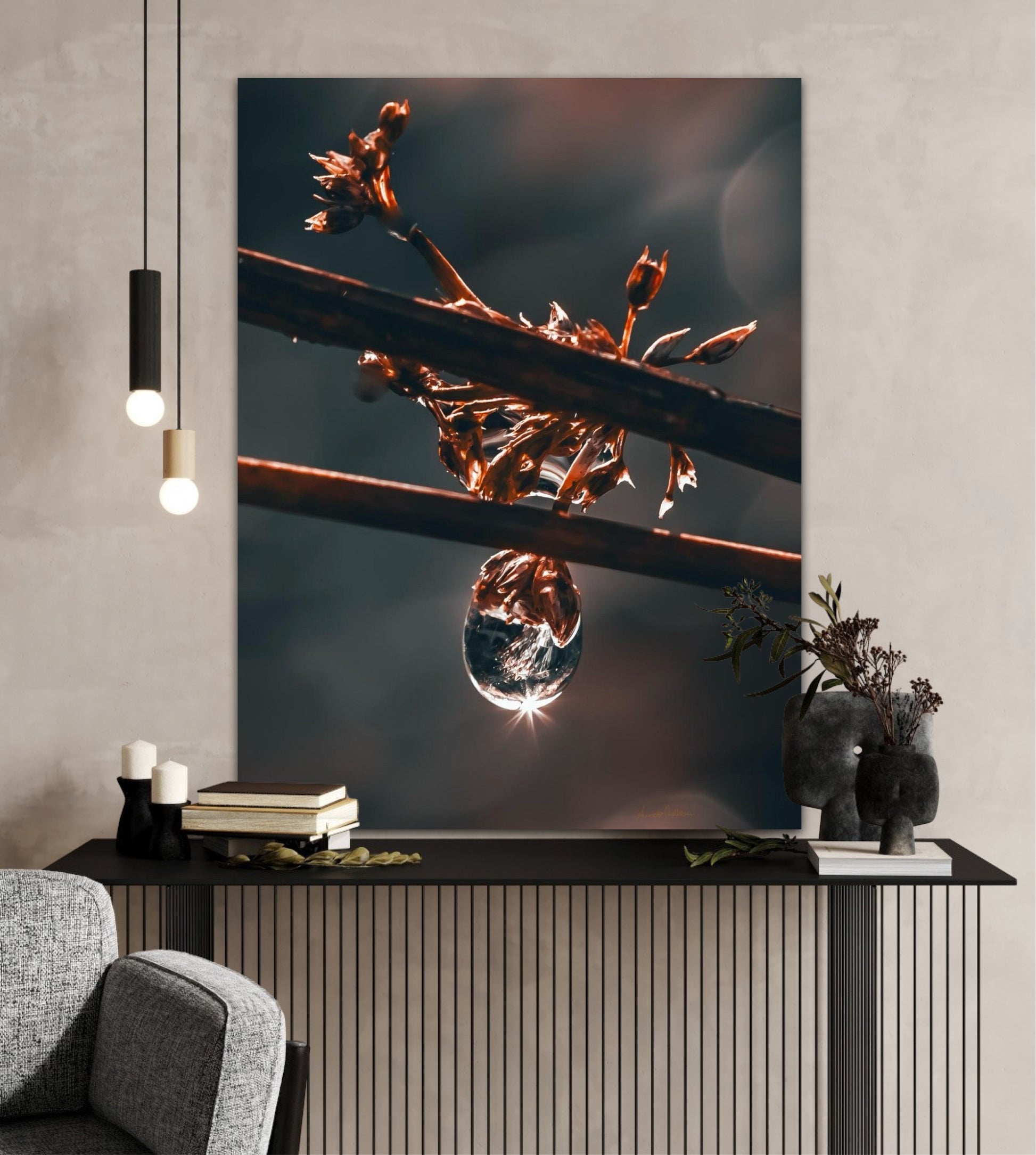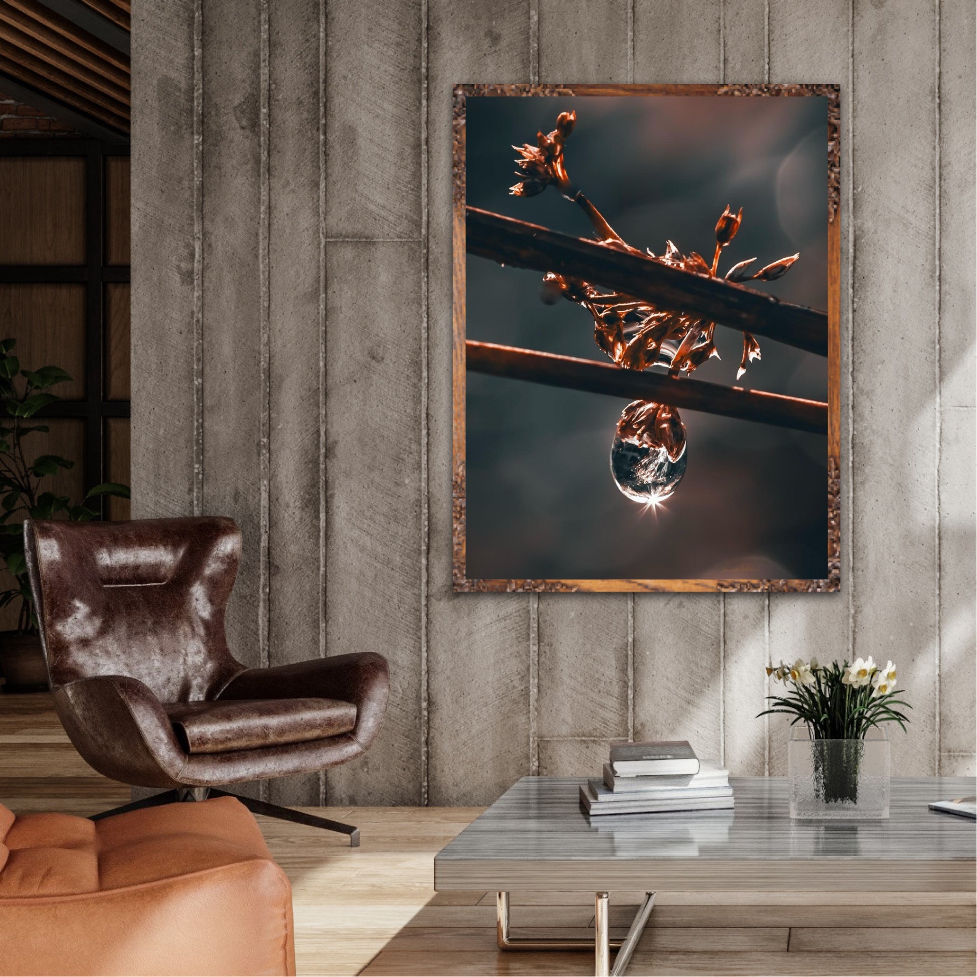 Striking photographic wall art of a raindrop hanging from a straw, and the sunlight is shining through creating a stunning effect. This artwork will be a stand-out piece in your home and bring you peace and tranquility.