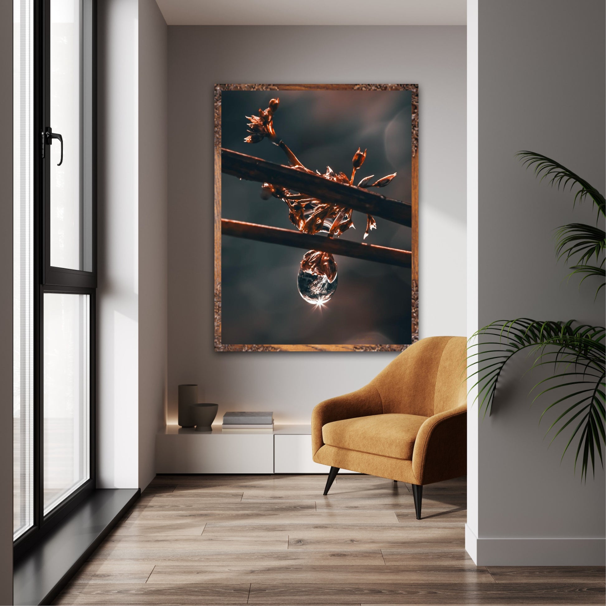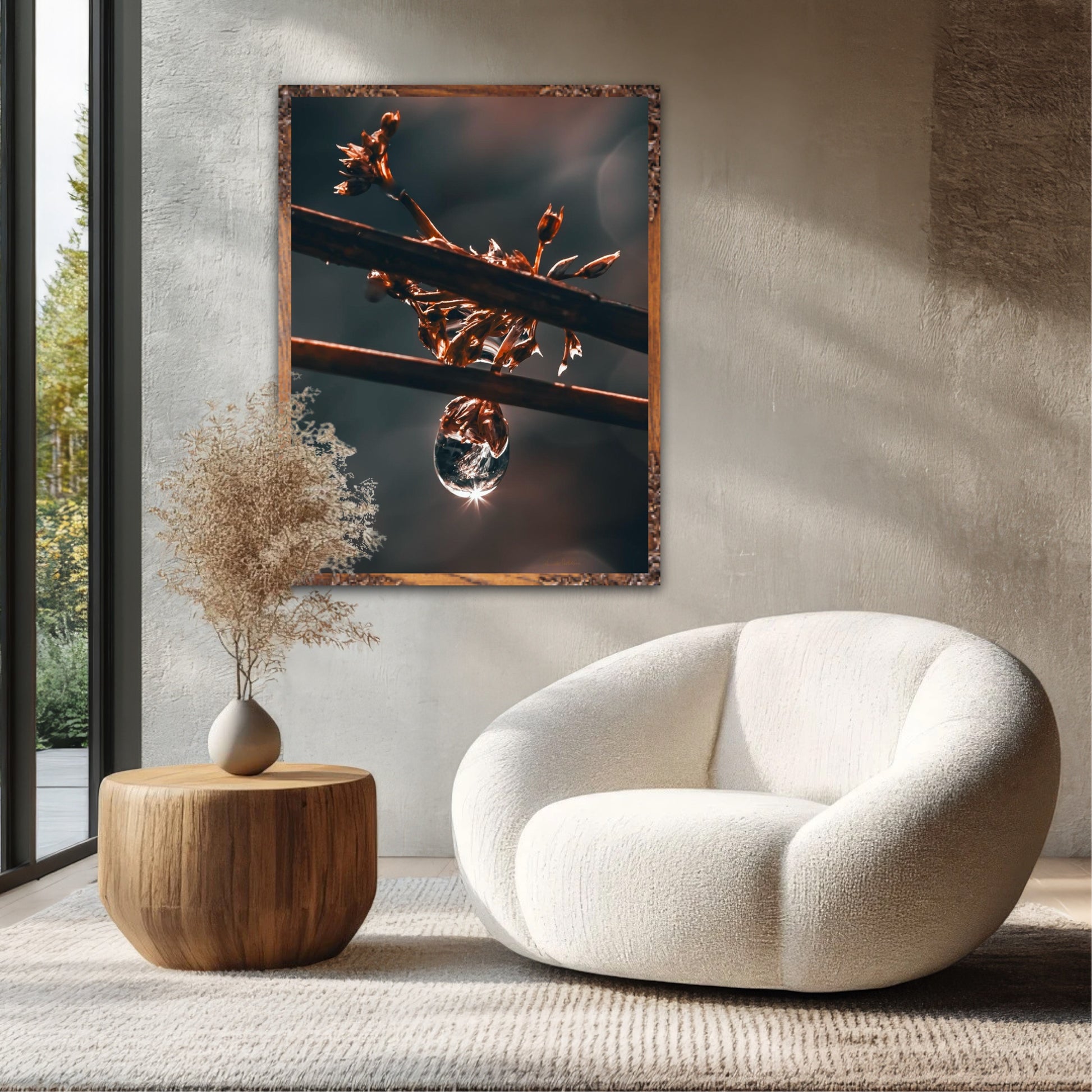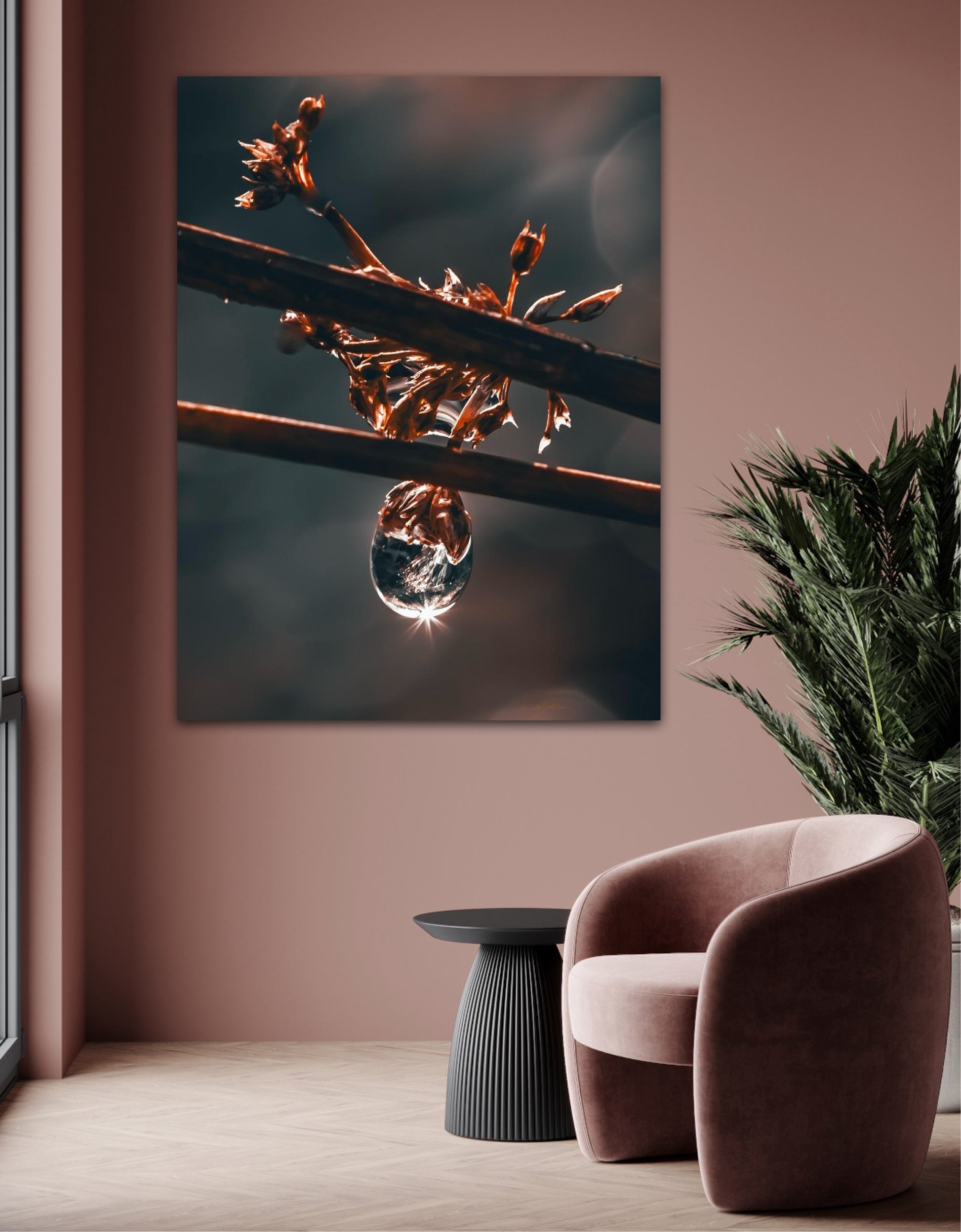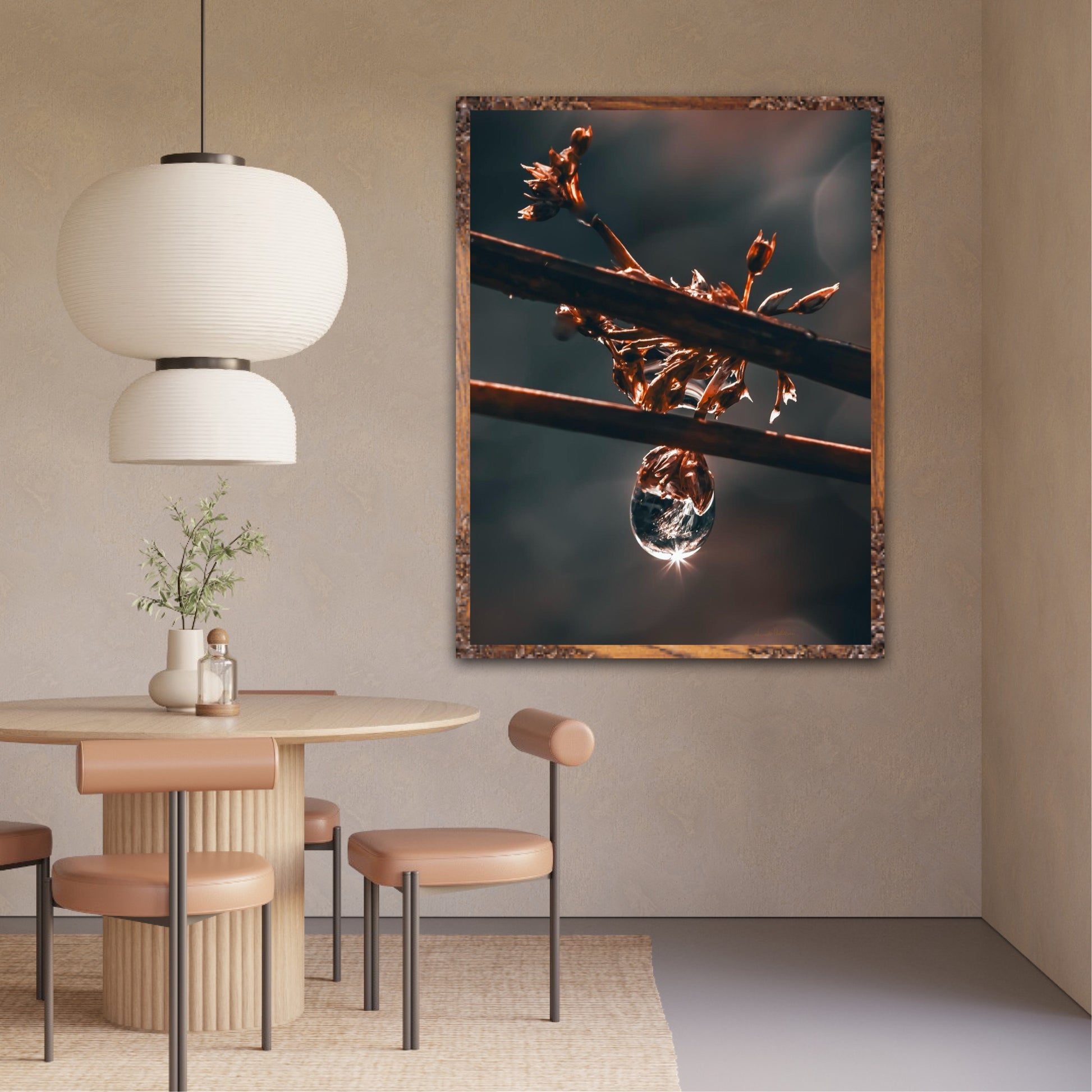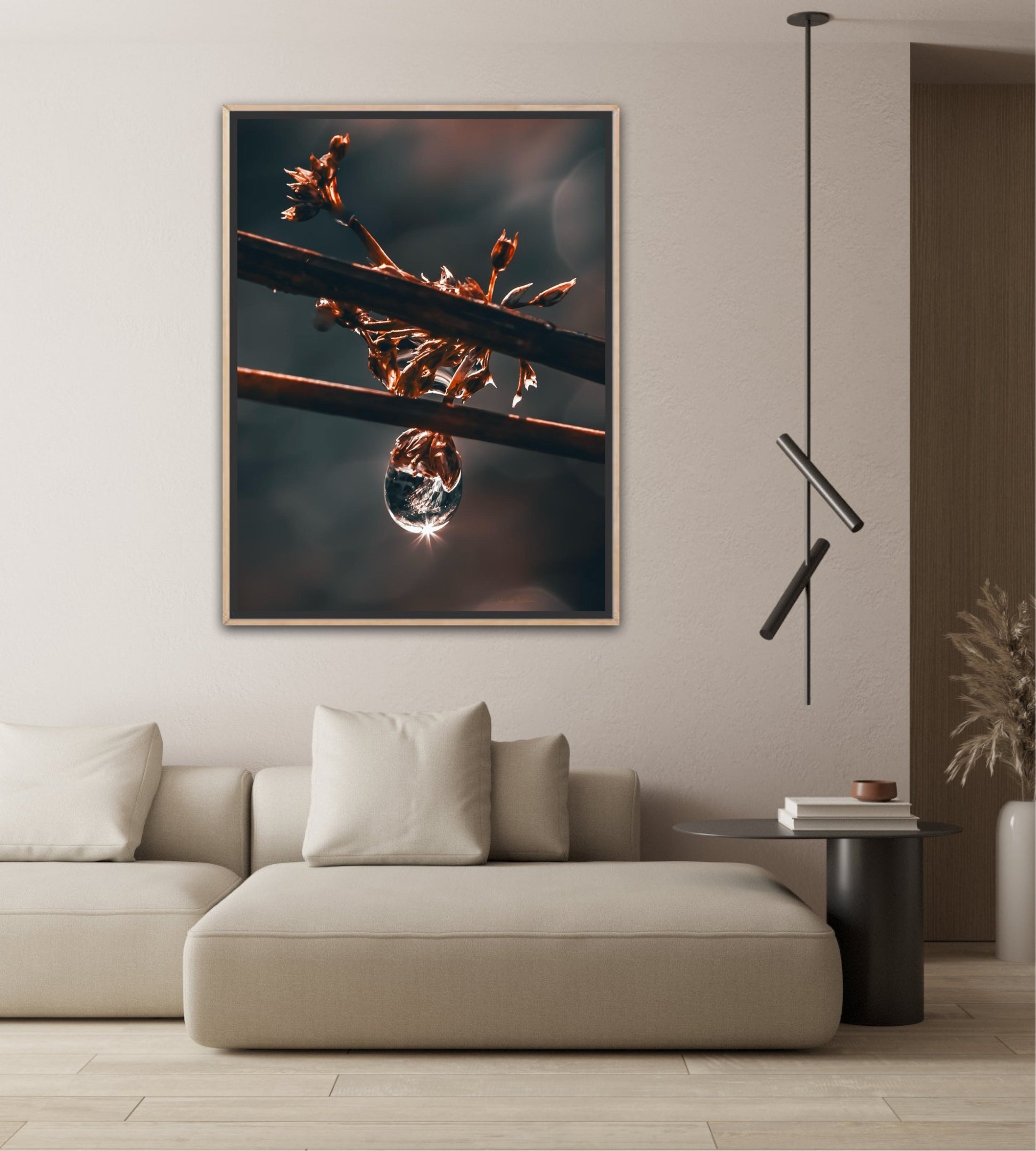Striking photographic wall art of a raindrop hanging from a straw, and the sunlight is shining through creating a stunning effect. This artwork will be a stand-out piece in your home and bring you peace and tranquility.