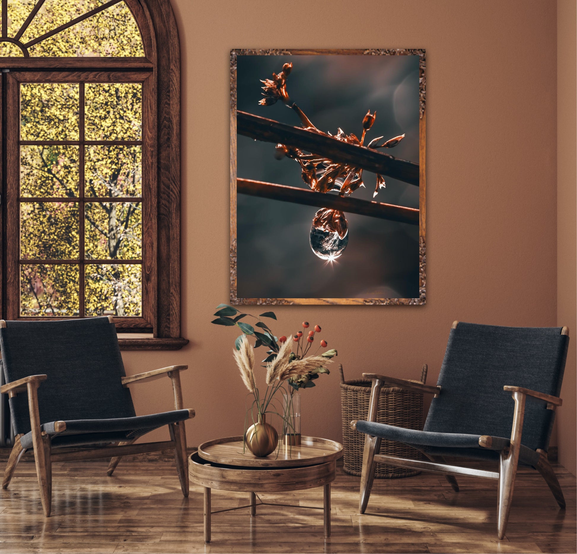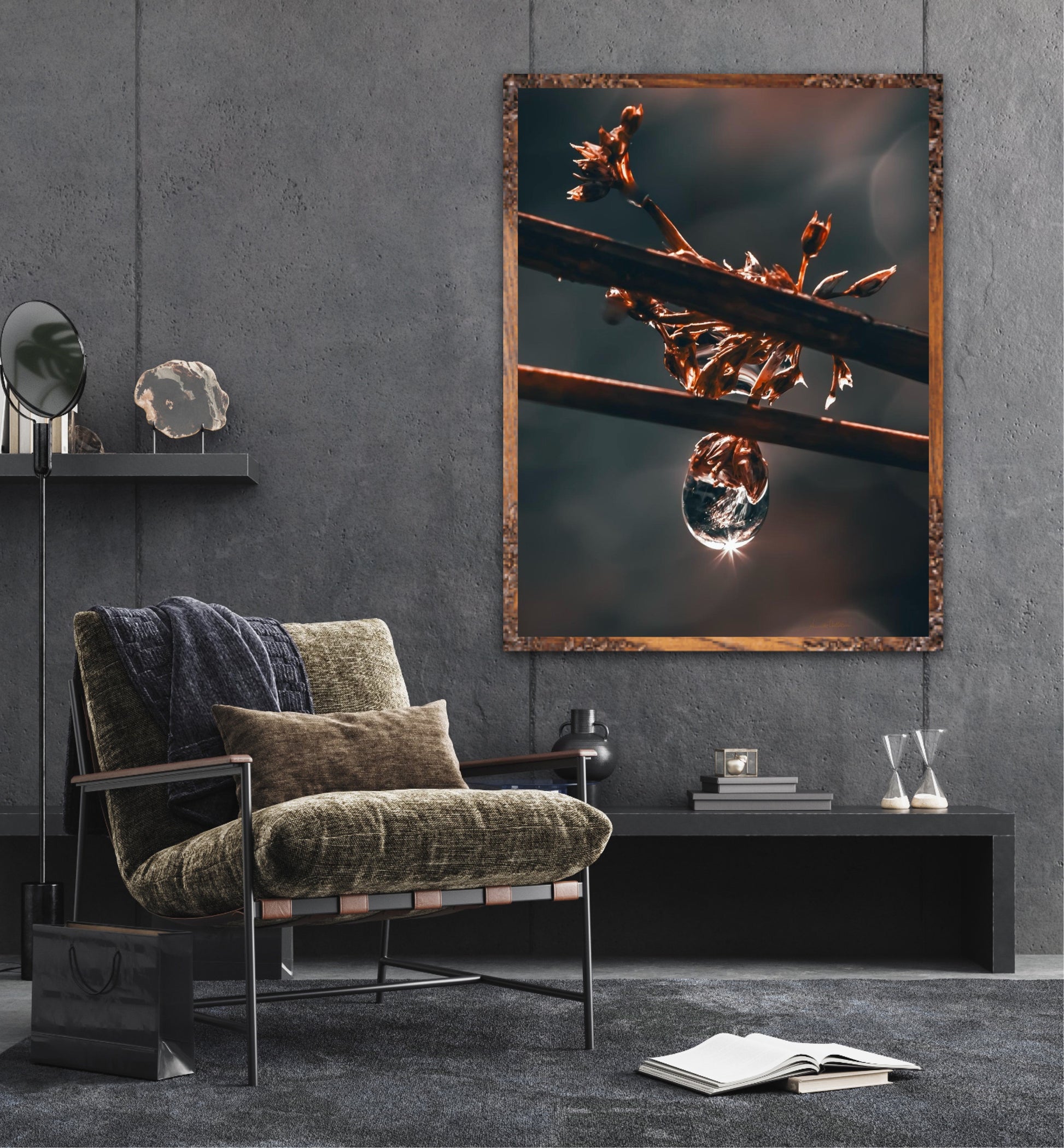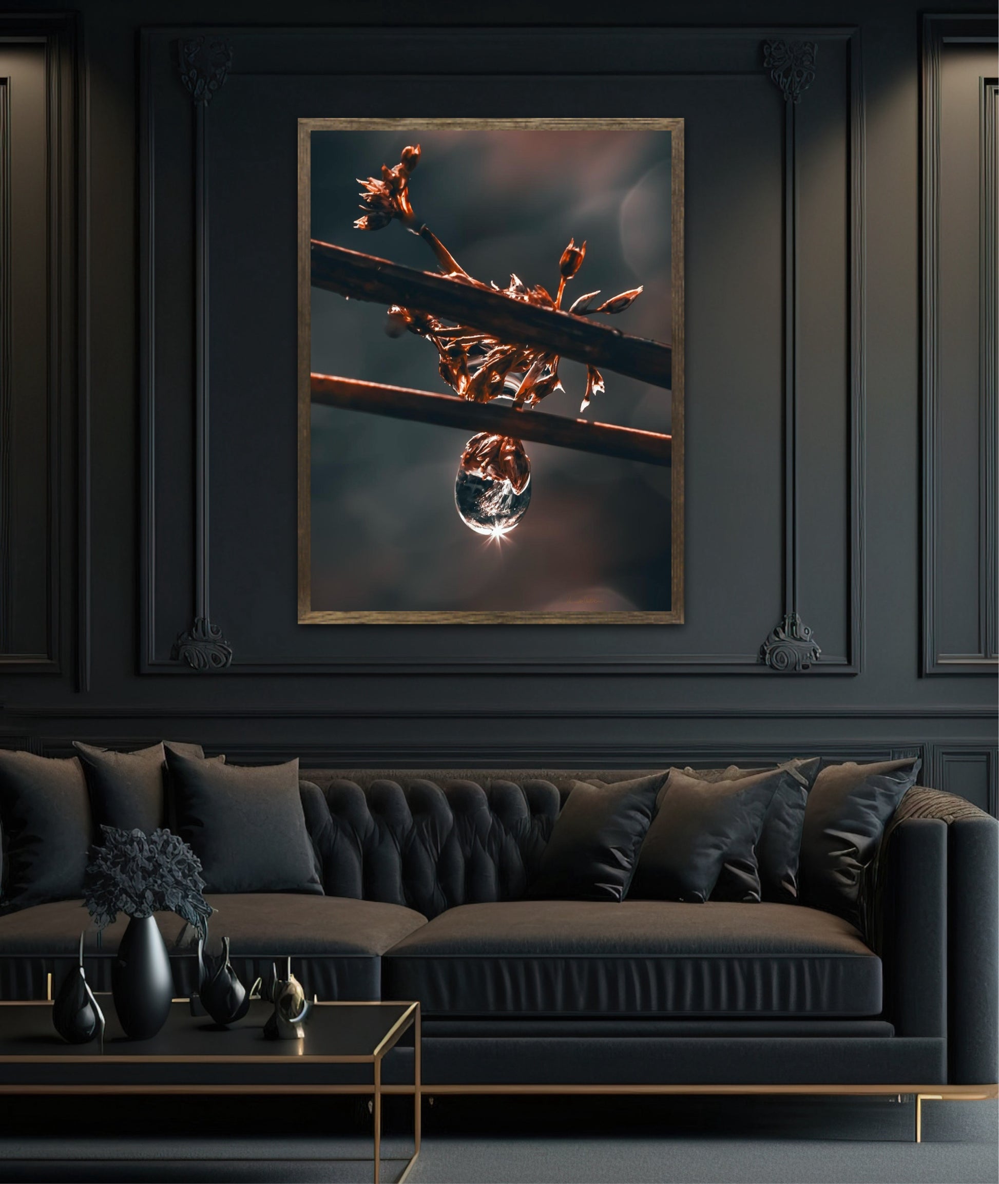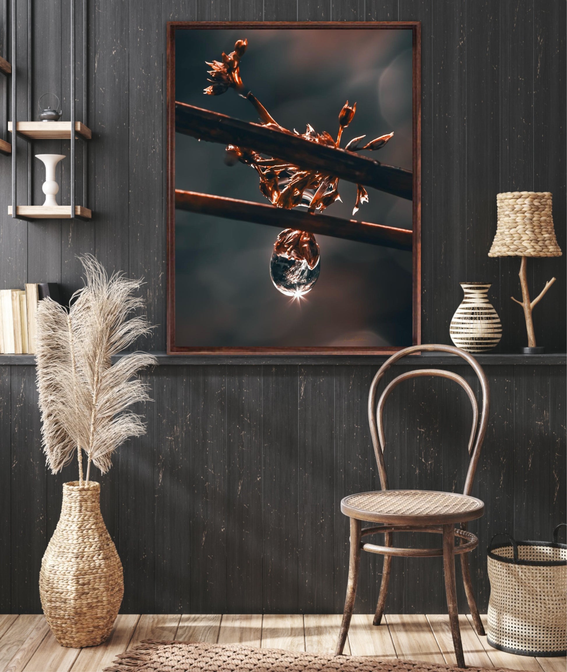 Striking photographic wall art of a raindrop hanging from a straw, and the sunlight is shining through creating a stunning effect. This artwork will be a stand-out piece in your home and bring you peace and tranquility.