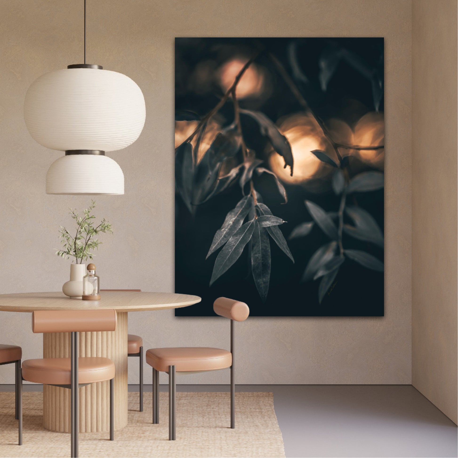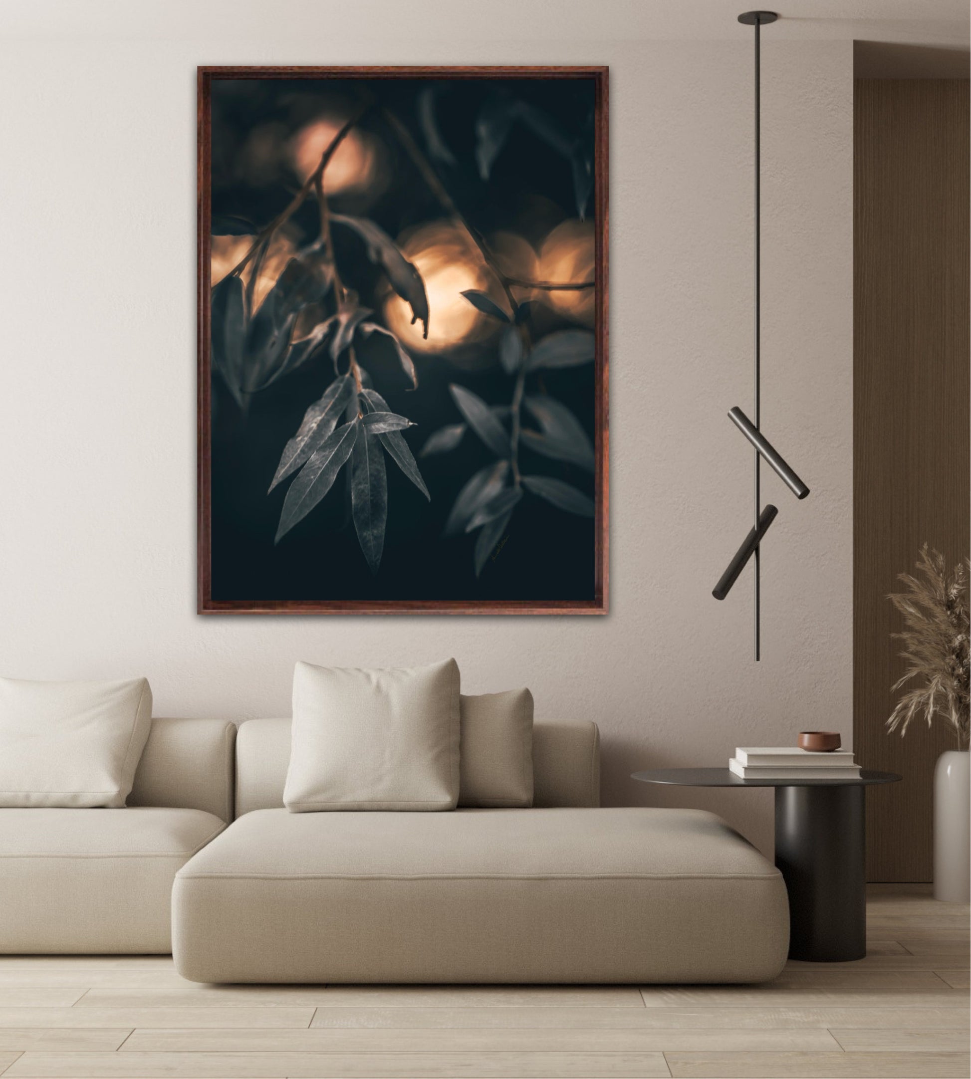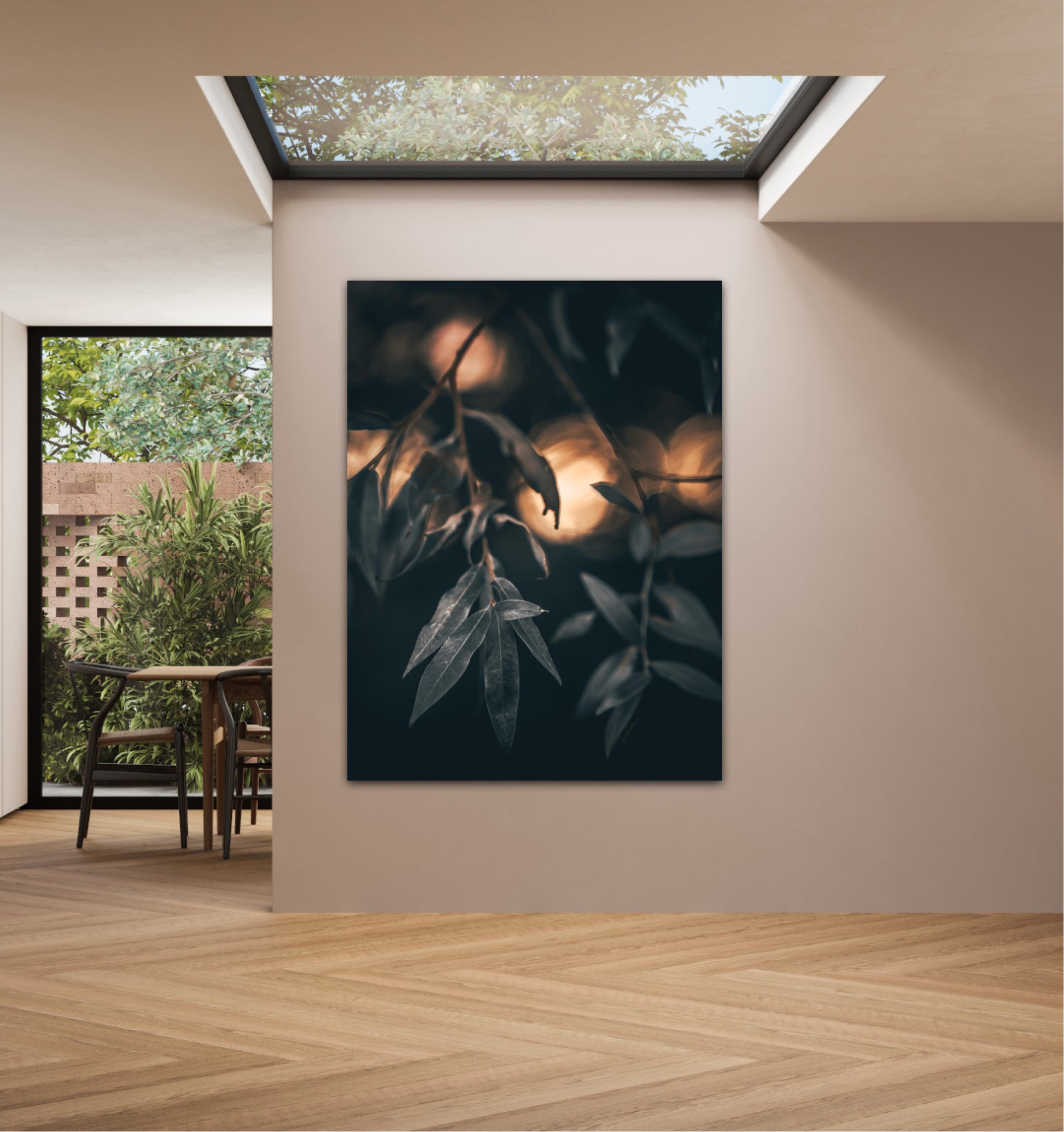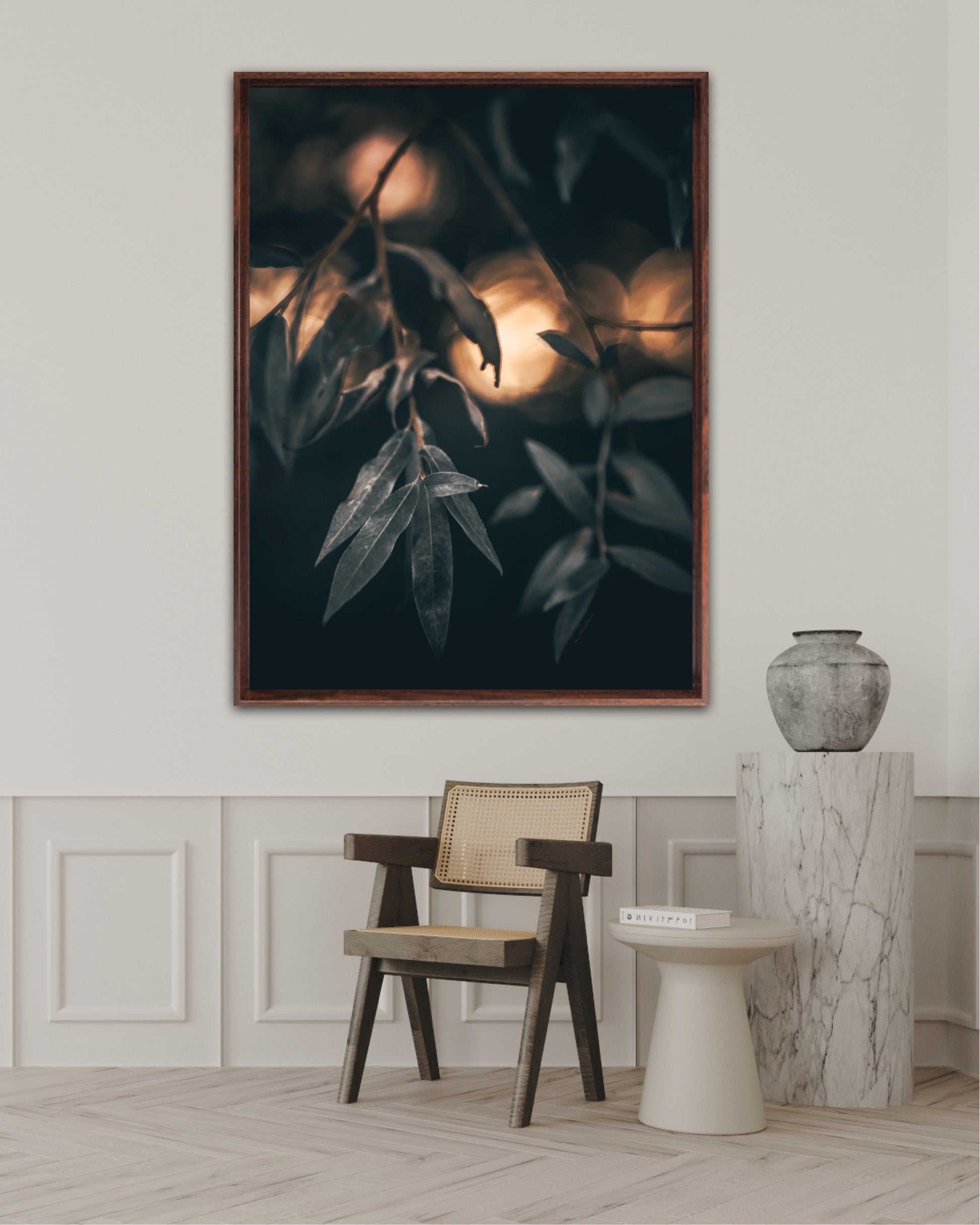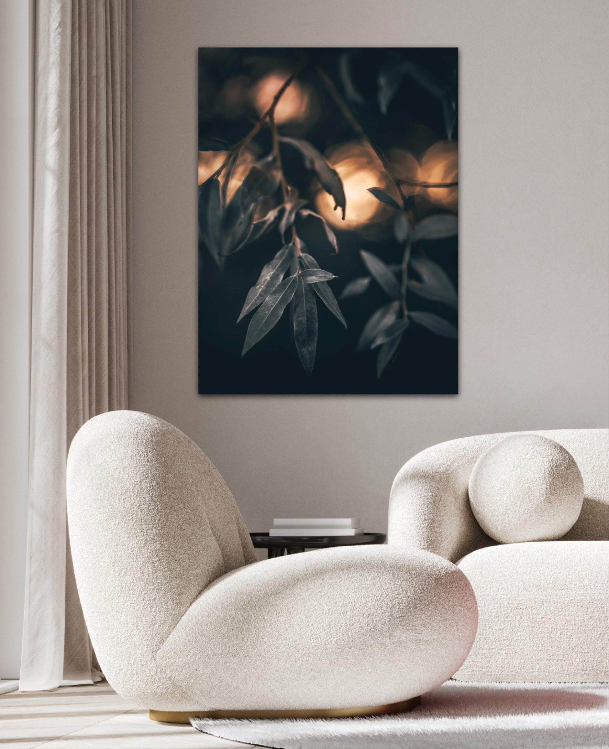 Beautiful photographic wall art of Salix alba 'Sericea' leaves hanging on the tree in a beautiful golden light in the background.