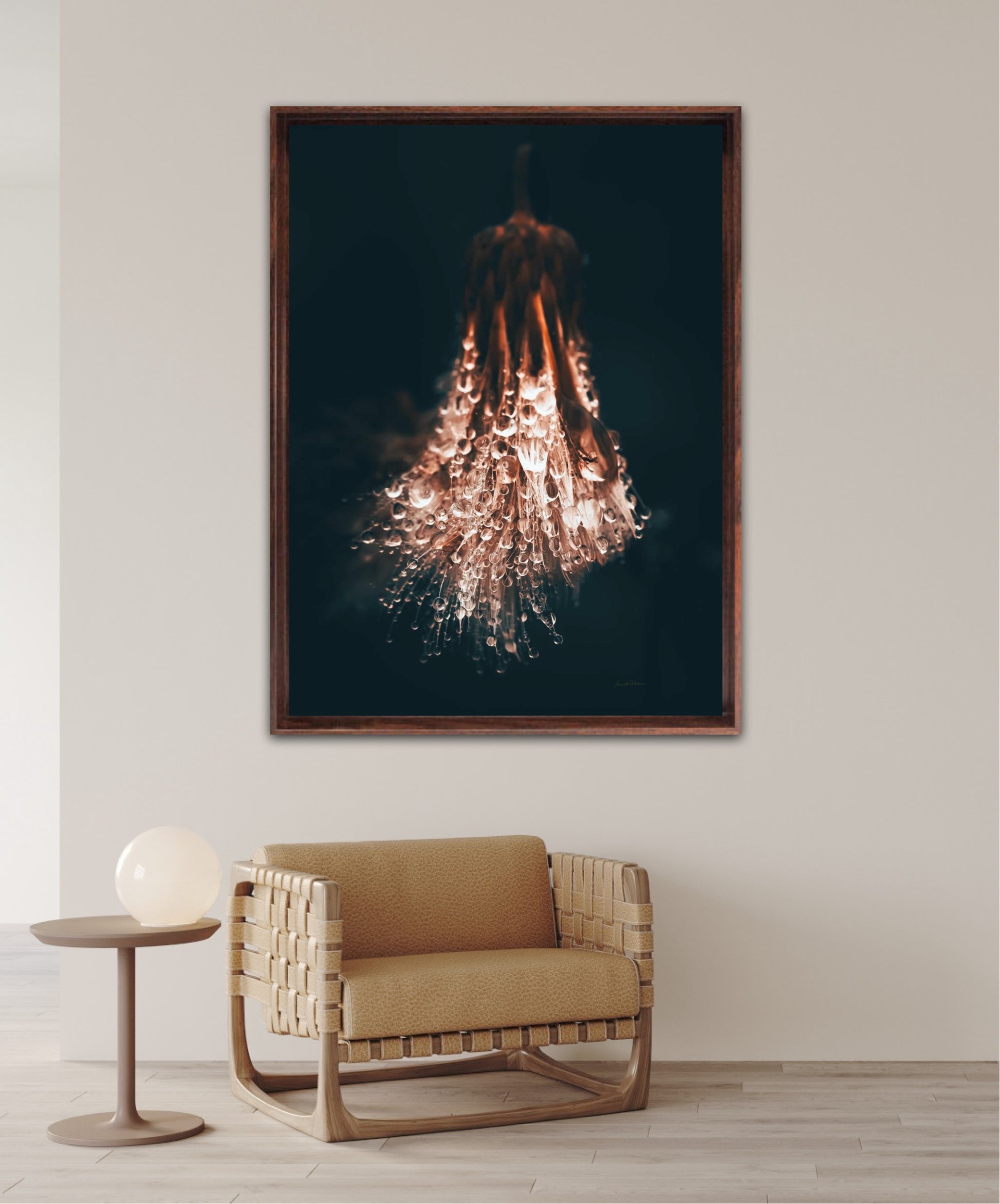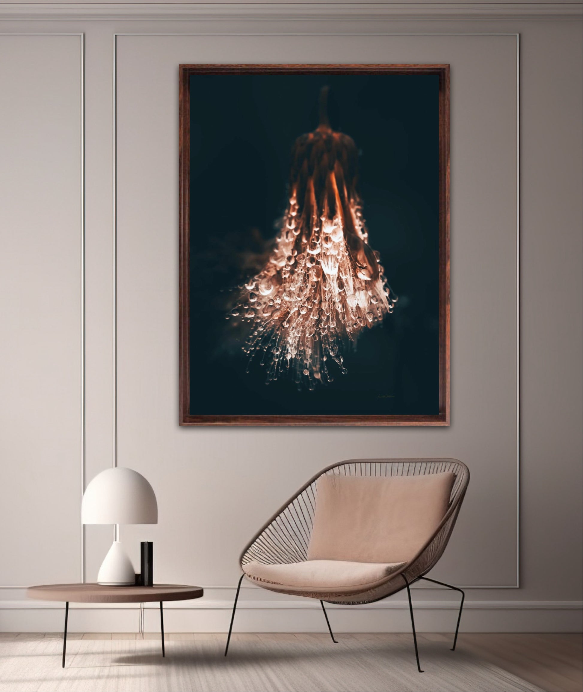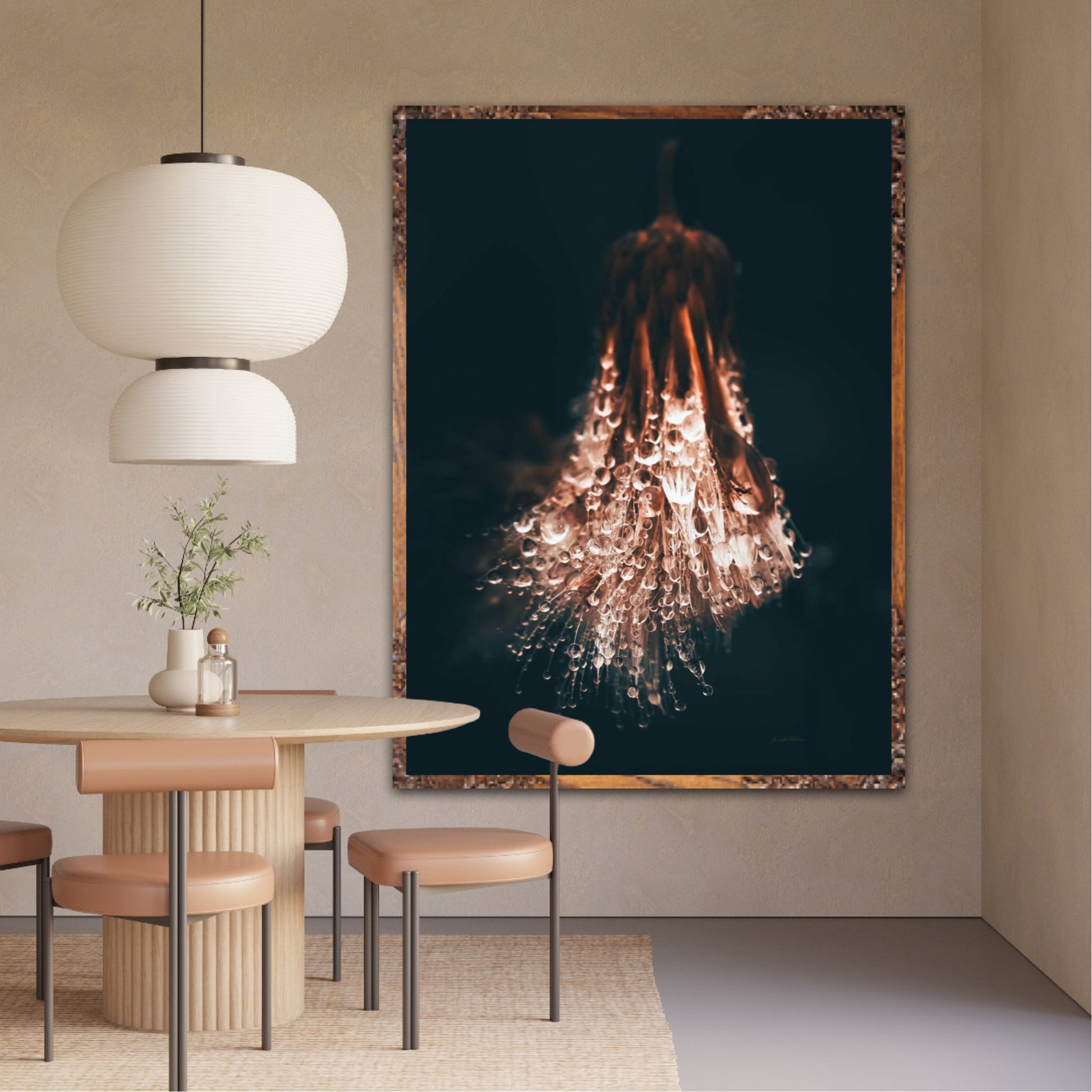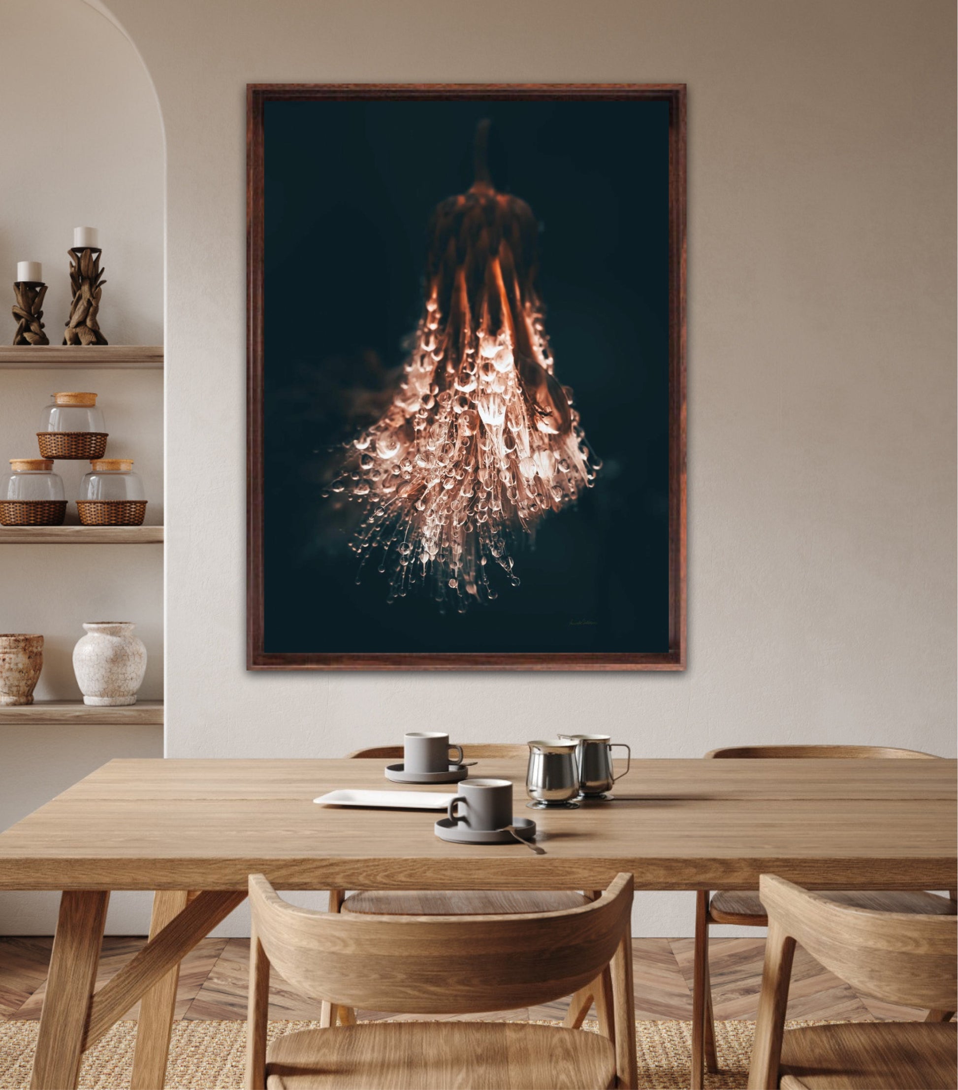 Beautiful photographic wall art of raindrops on a withered thistle plant in beautiful earthy colors. This wall art suits many wall colors and looks great with both light and dark frames. Look at the inspiration sources and find a favorite. The wall art will look beautiful on the wall and give your home that little something extra. Impress your friends with this unique art piece.