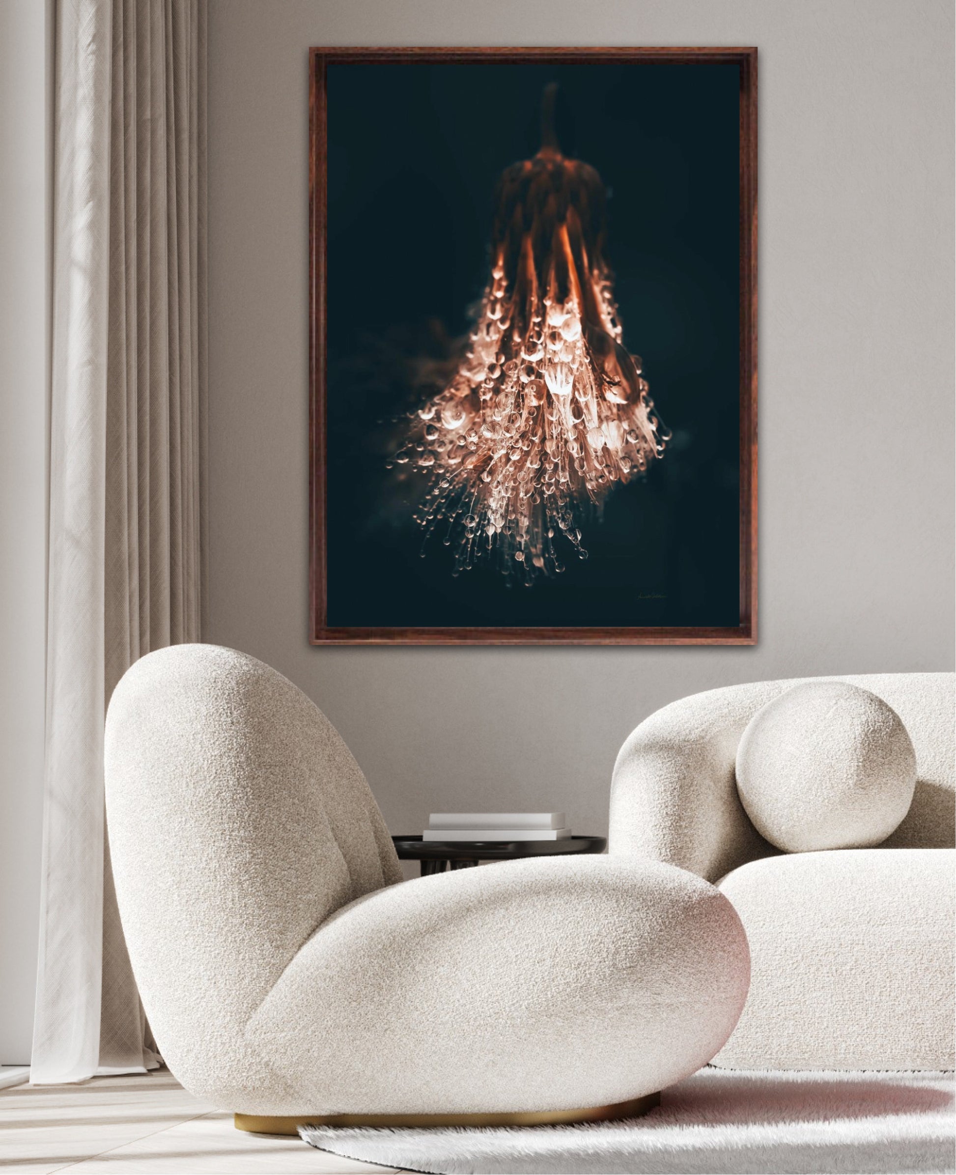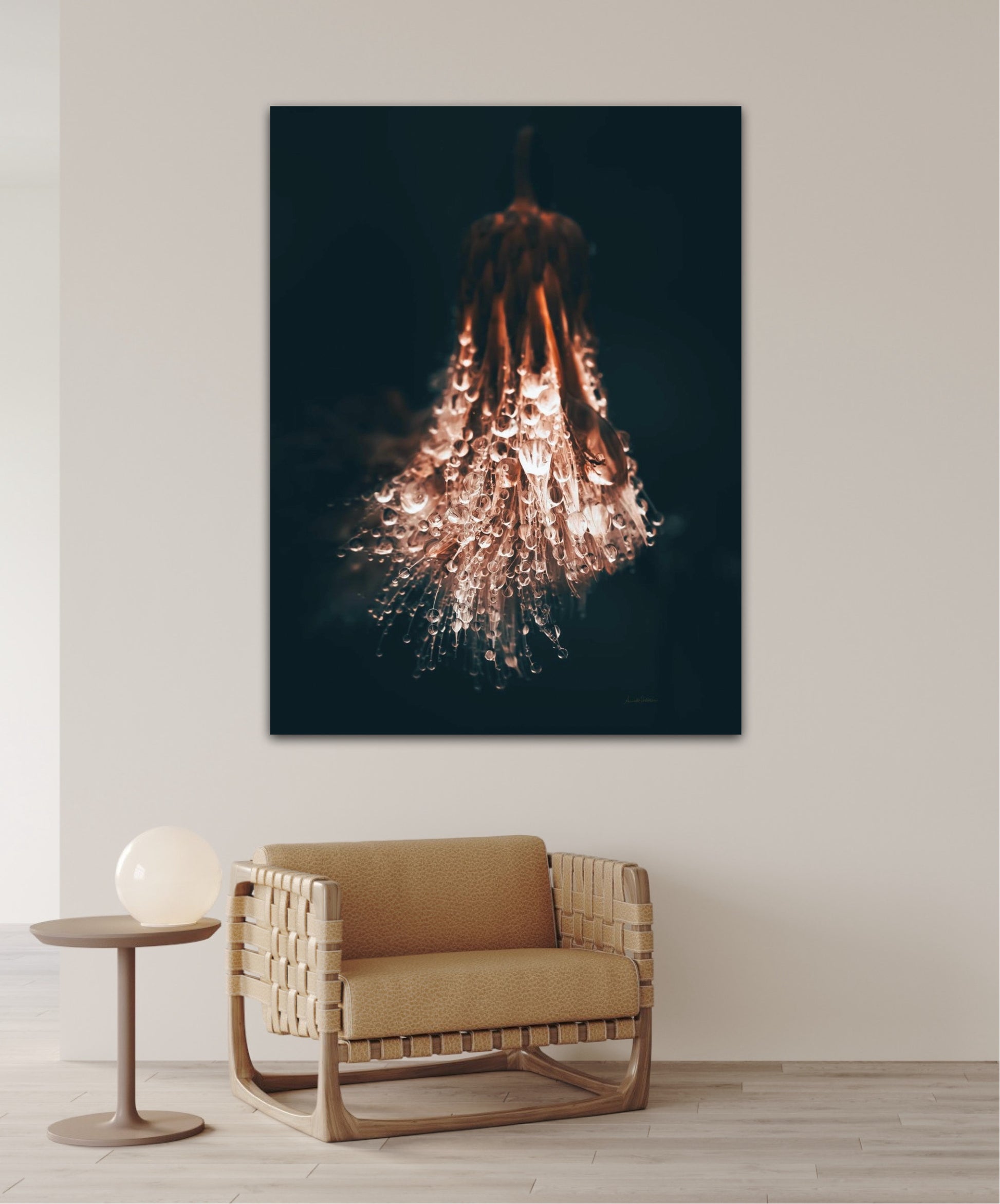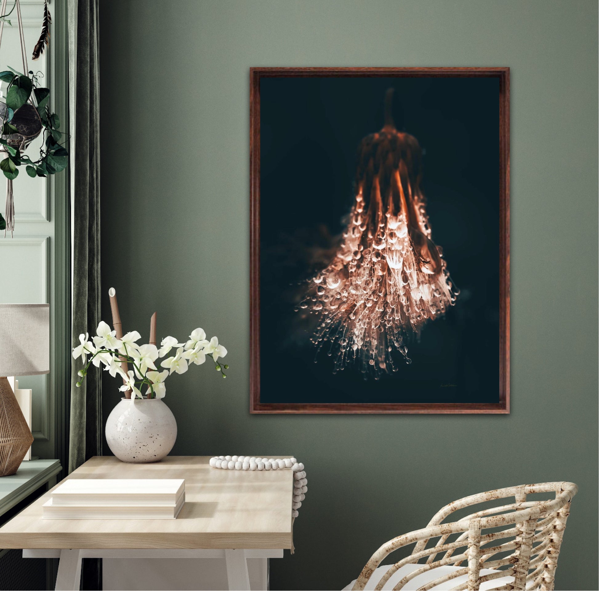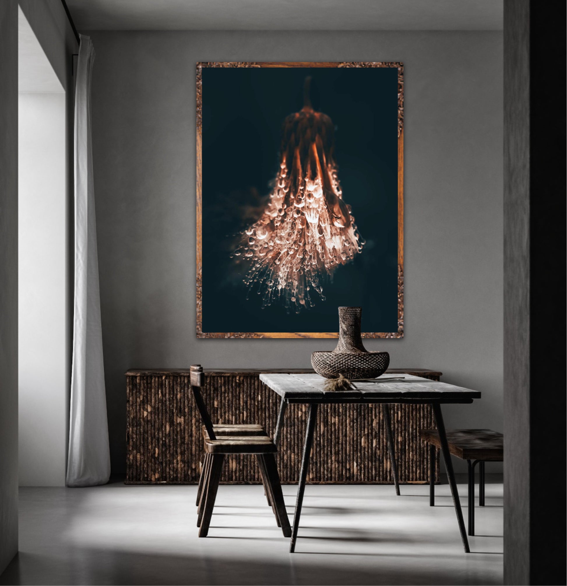 Beautiful photographic wall art of raindrops on a withered thistle plant in beautiful earthy colors. This wall art suits many wall colors and looks great with both light and dark frames. Look at the inspiration sources and find a favorite. The wall art will look beautiful on the wall and give your home that little something extra. Impress your friends with this unique art piece.