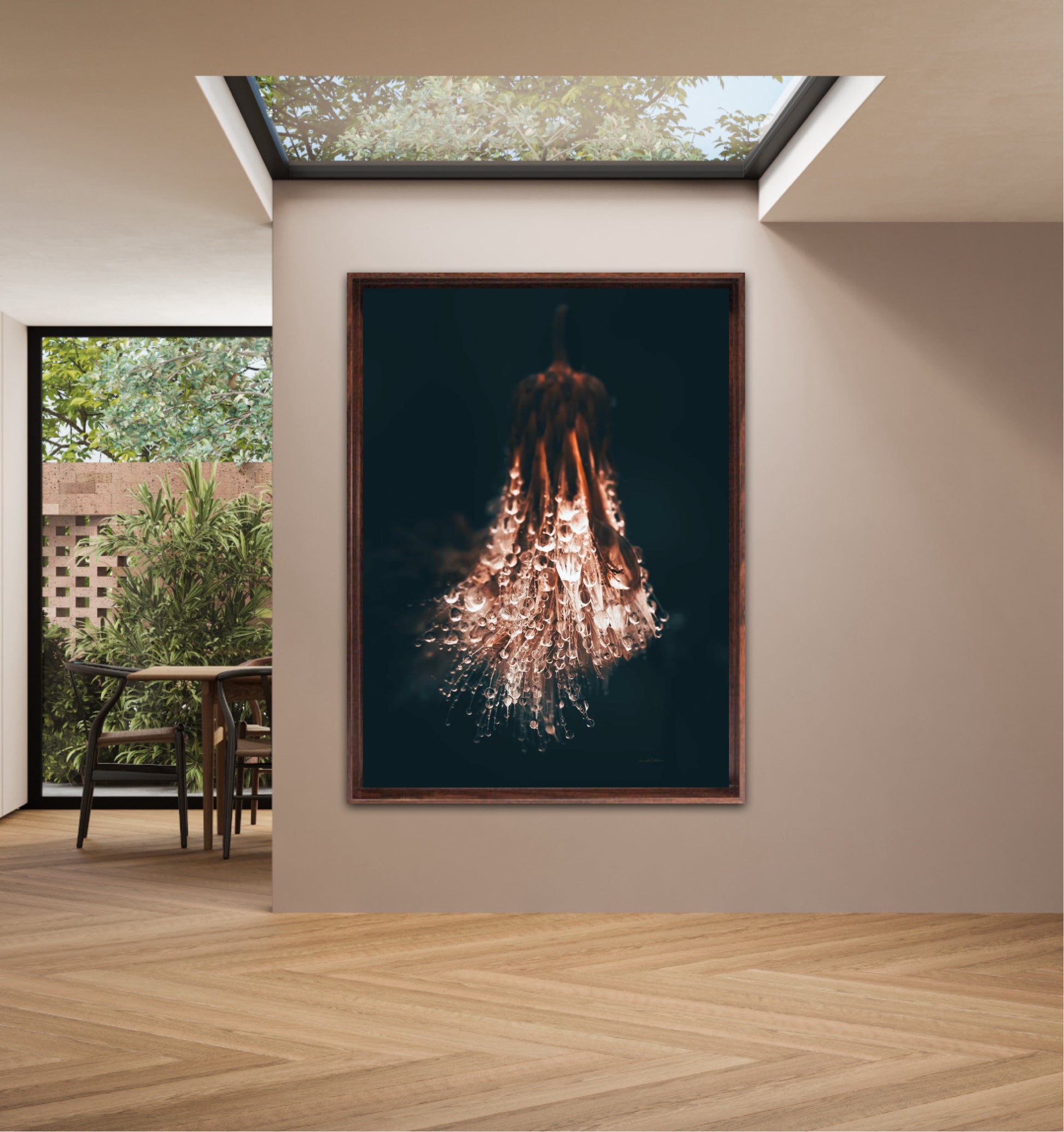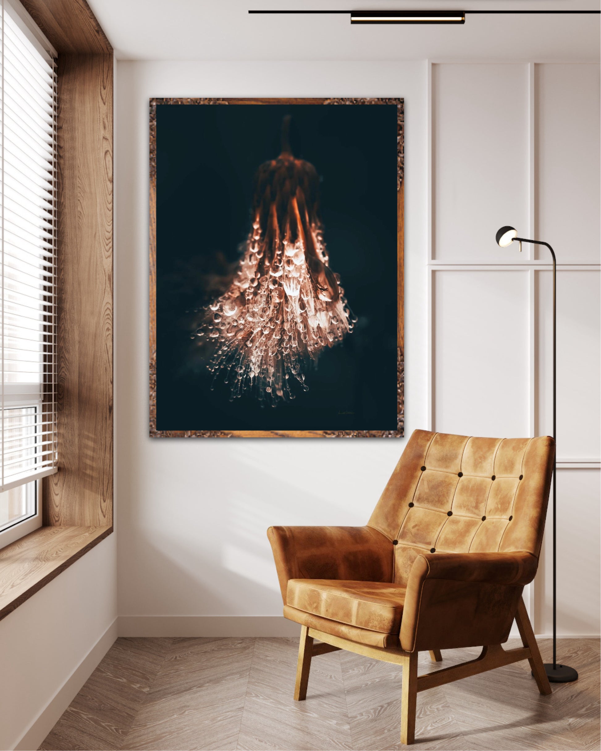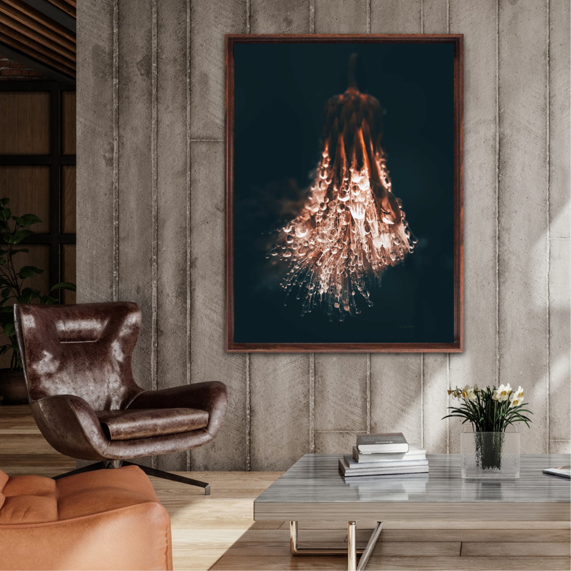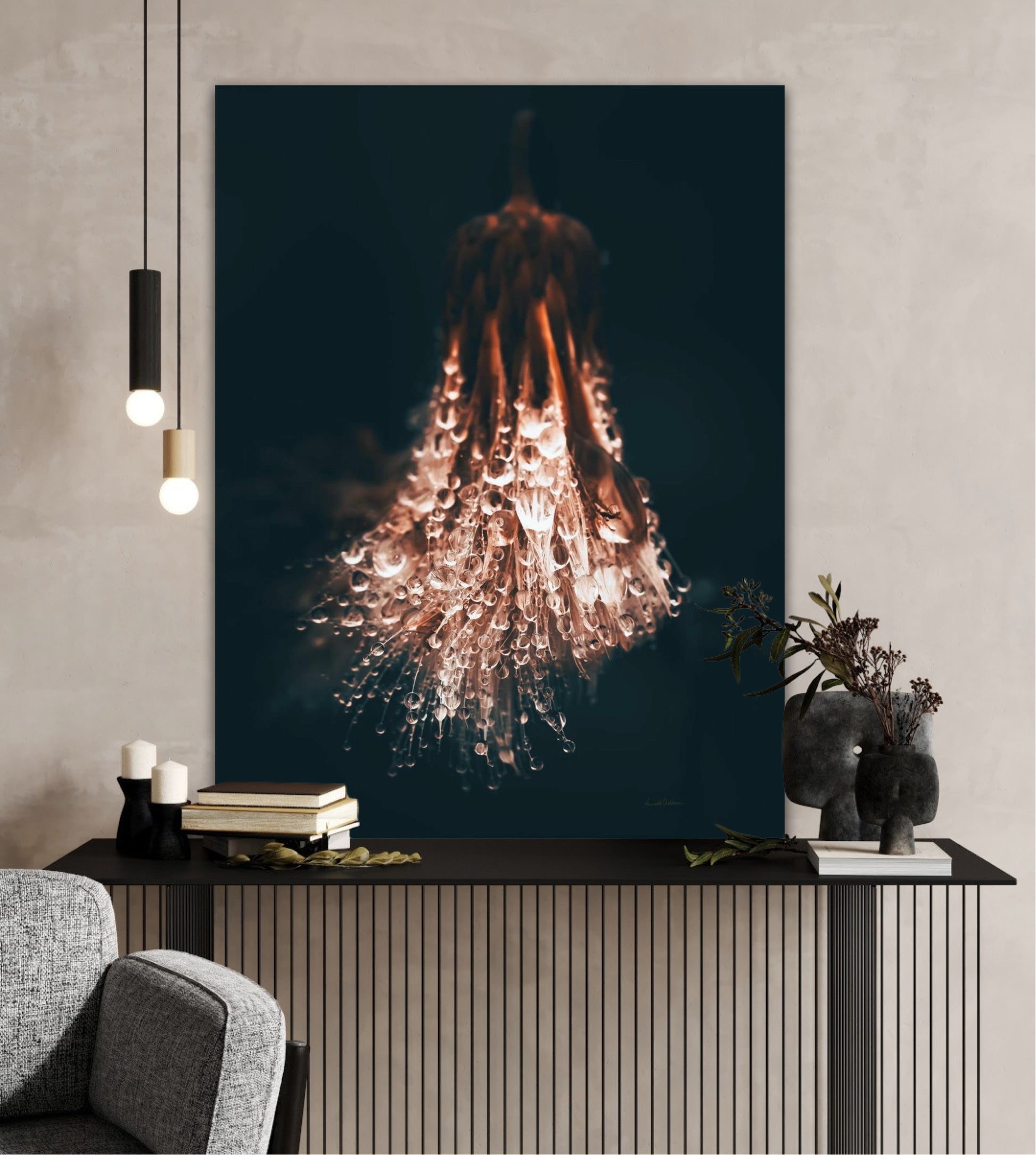 Beautiful photographic wall art of raindrops on a withered thistle plant in beautiful earthy colors. This wall art suits many wall colors and looks great with both light and dark frames. Look at the inspiration sources and find a favorite. The wall art will look beautiful on the wall and give your home that little something extra. Impress your friends with this unique art piece.
