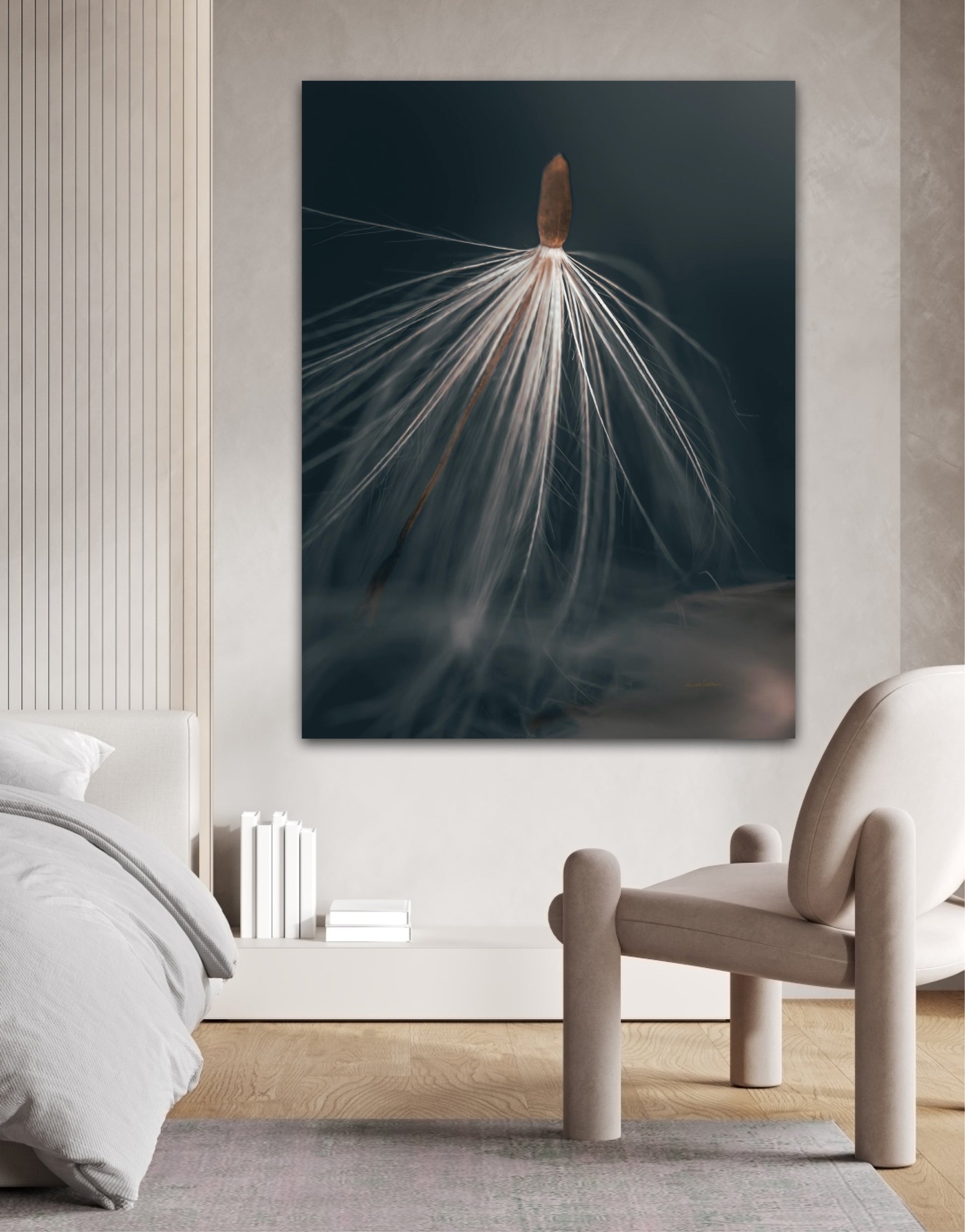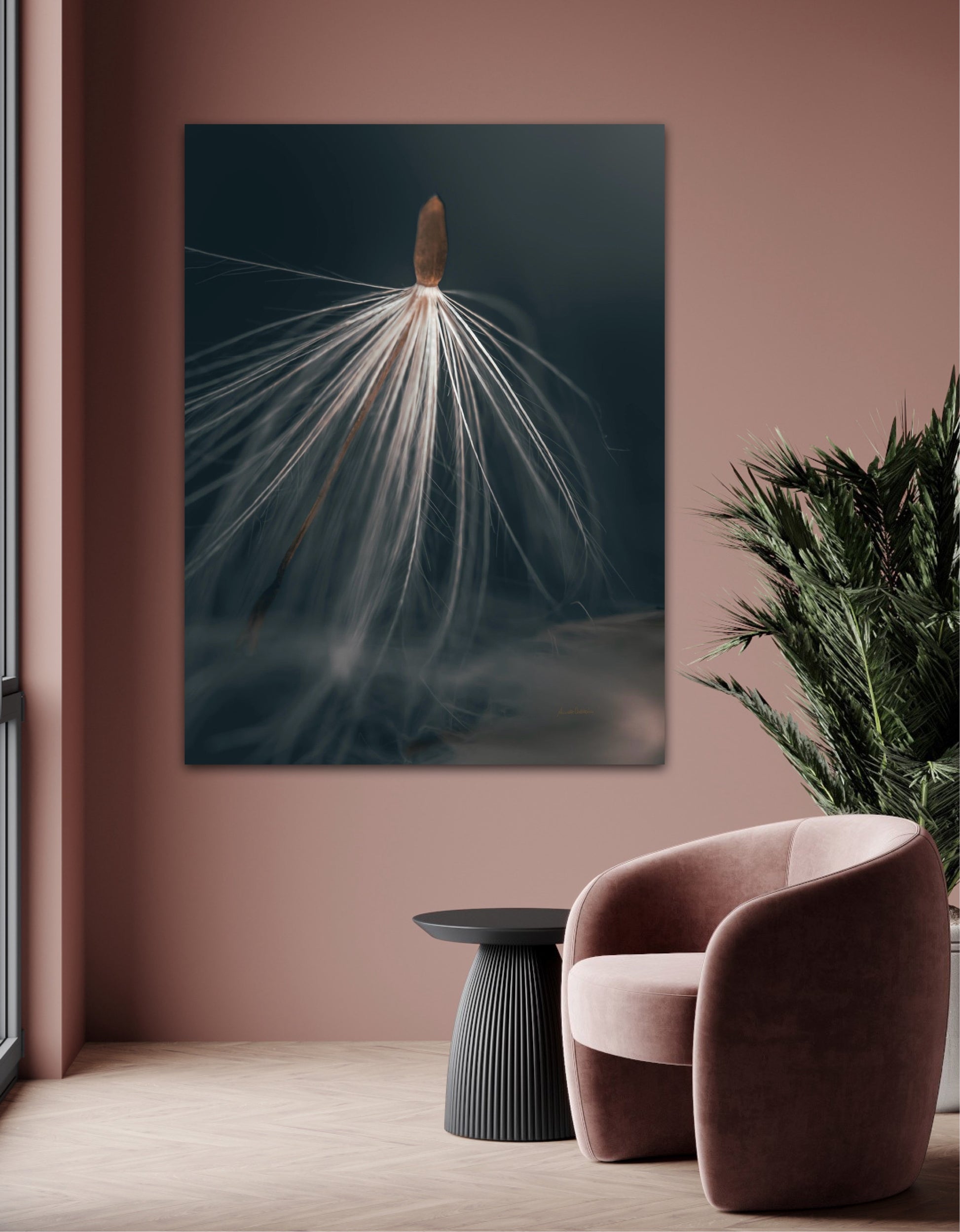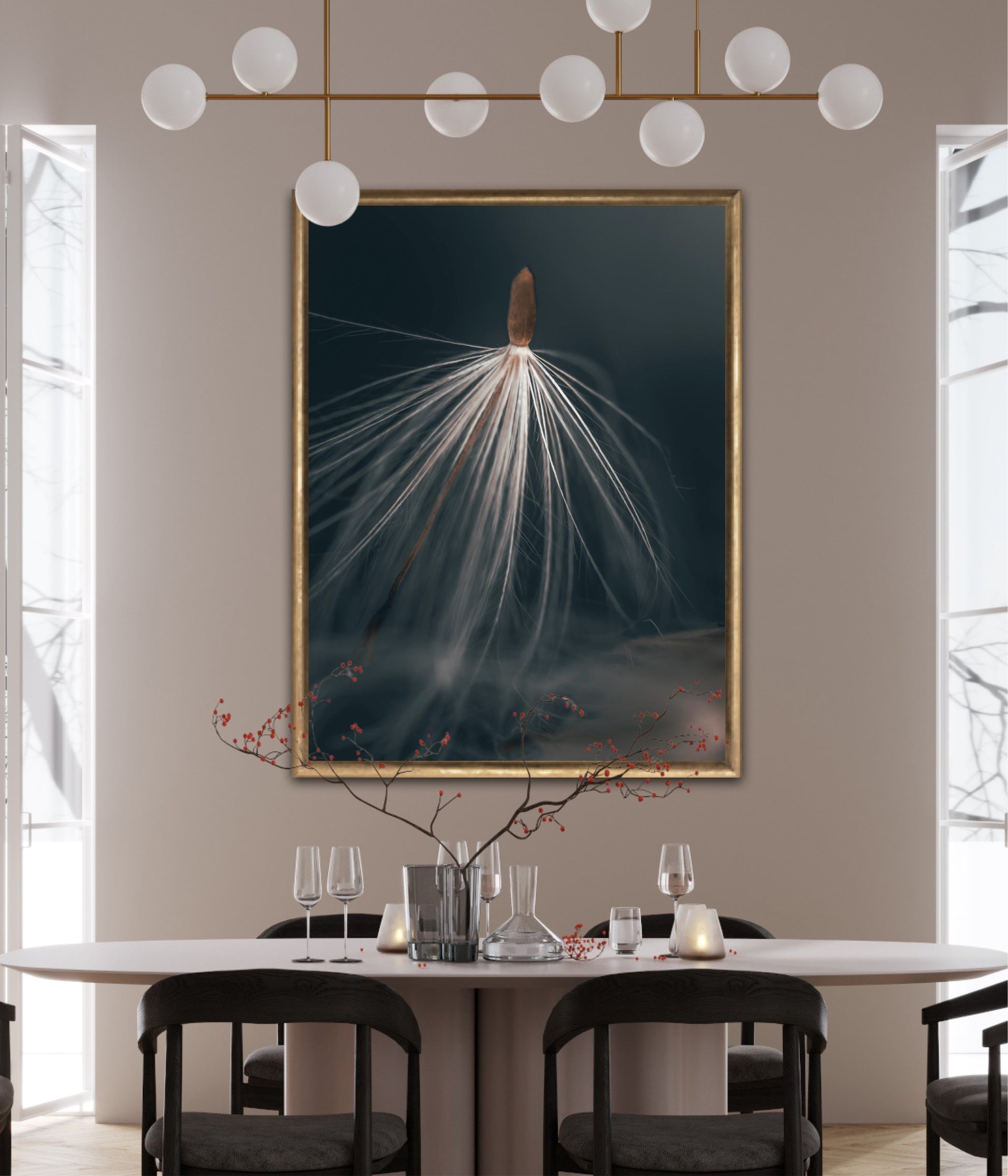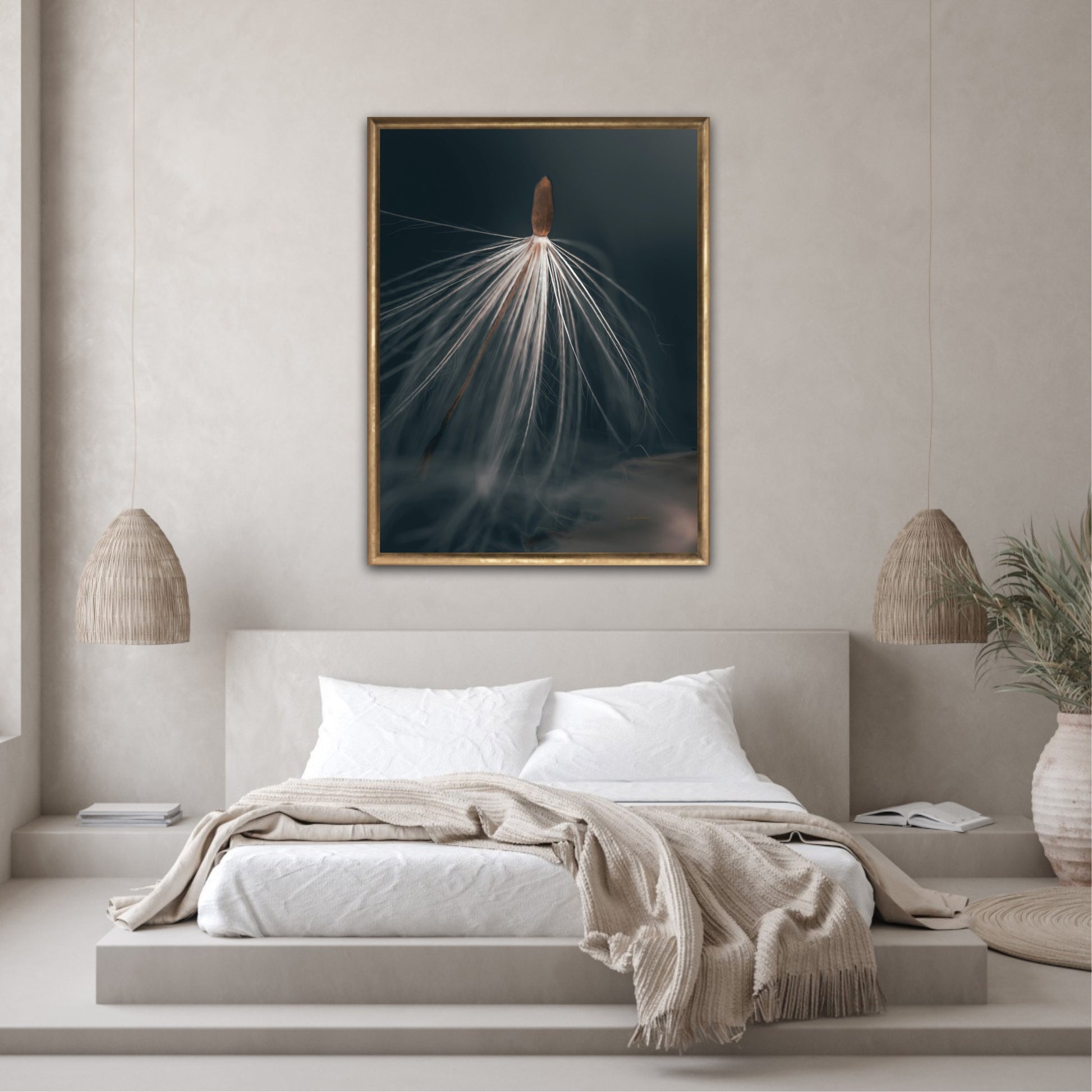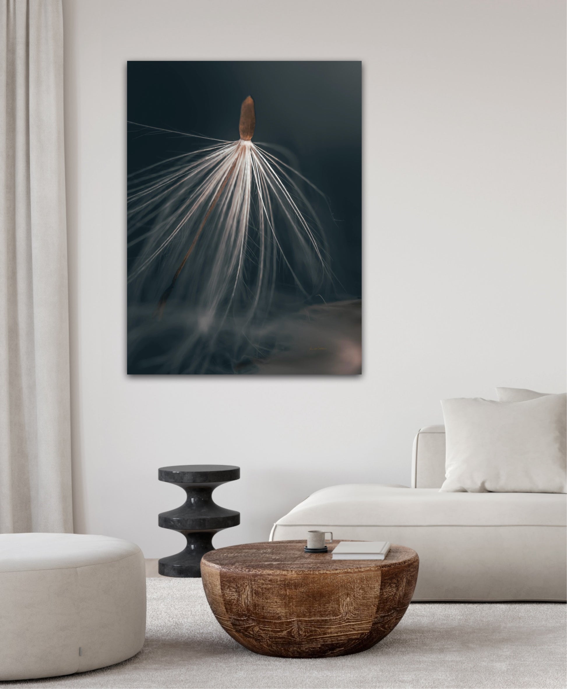 Beautiful photographic wall art of a dandelion seed up close. Feel the magic of nature with this picture. The picture becomes an eye-catcher on the wall and comes in pleasant tones that match several wall colours.