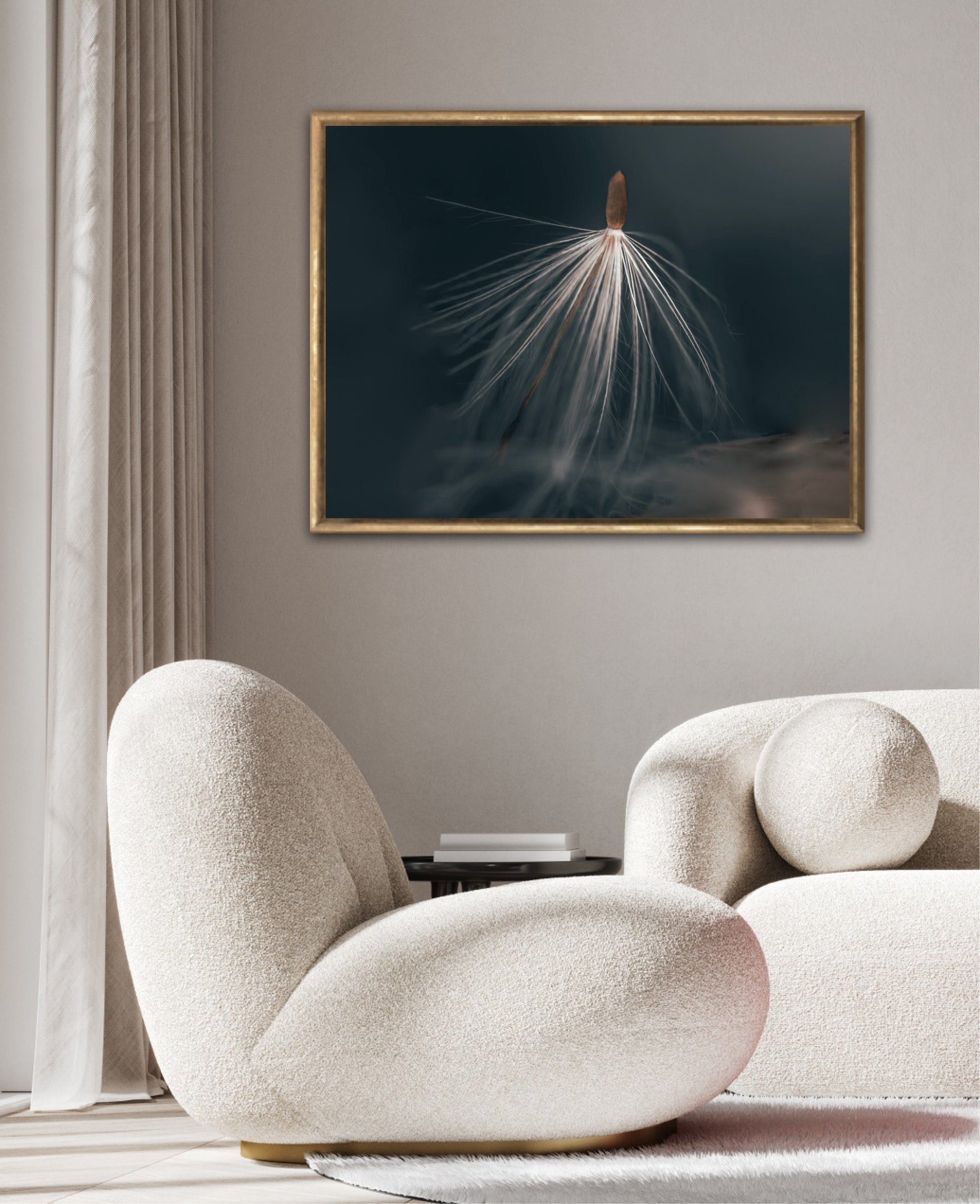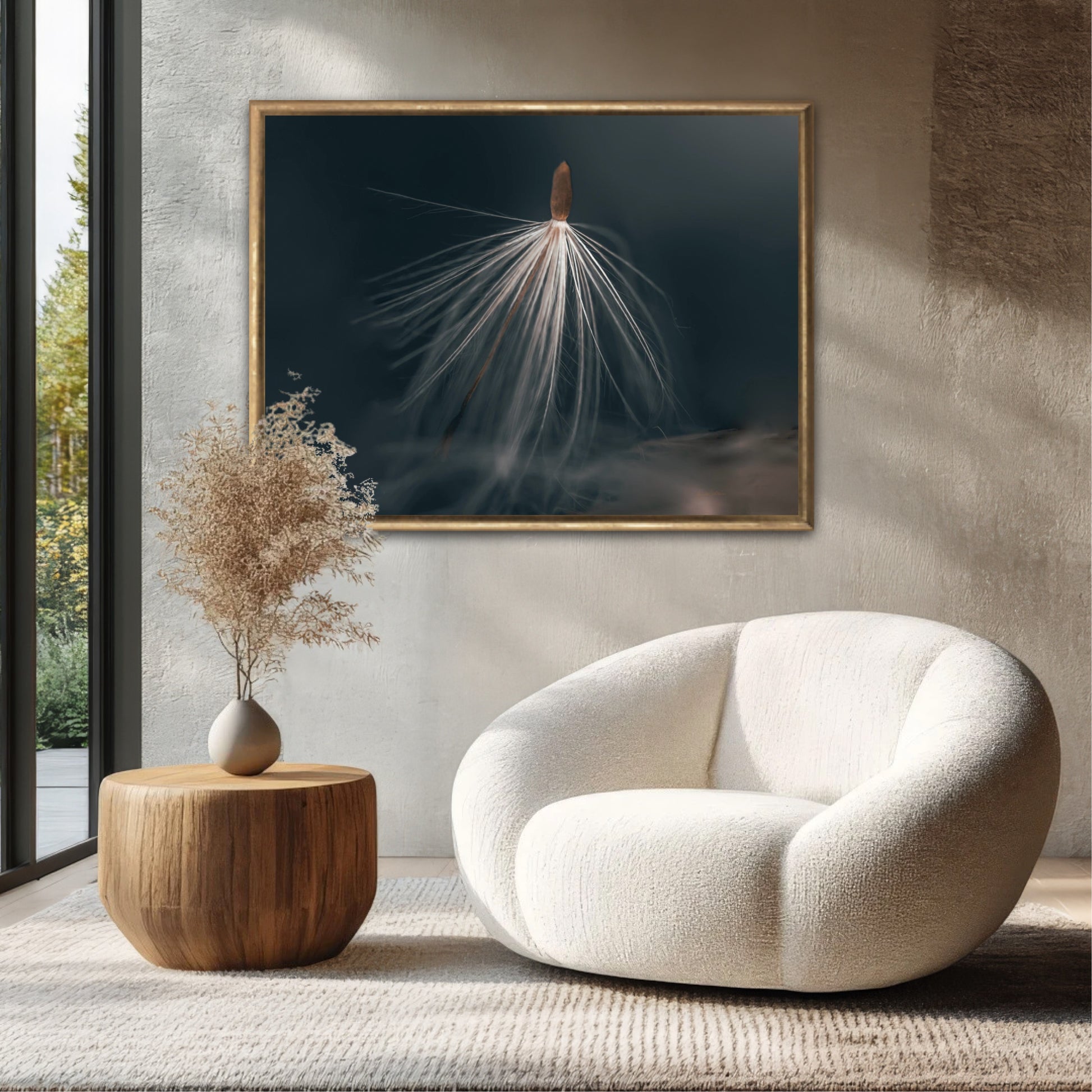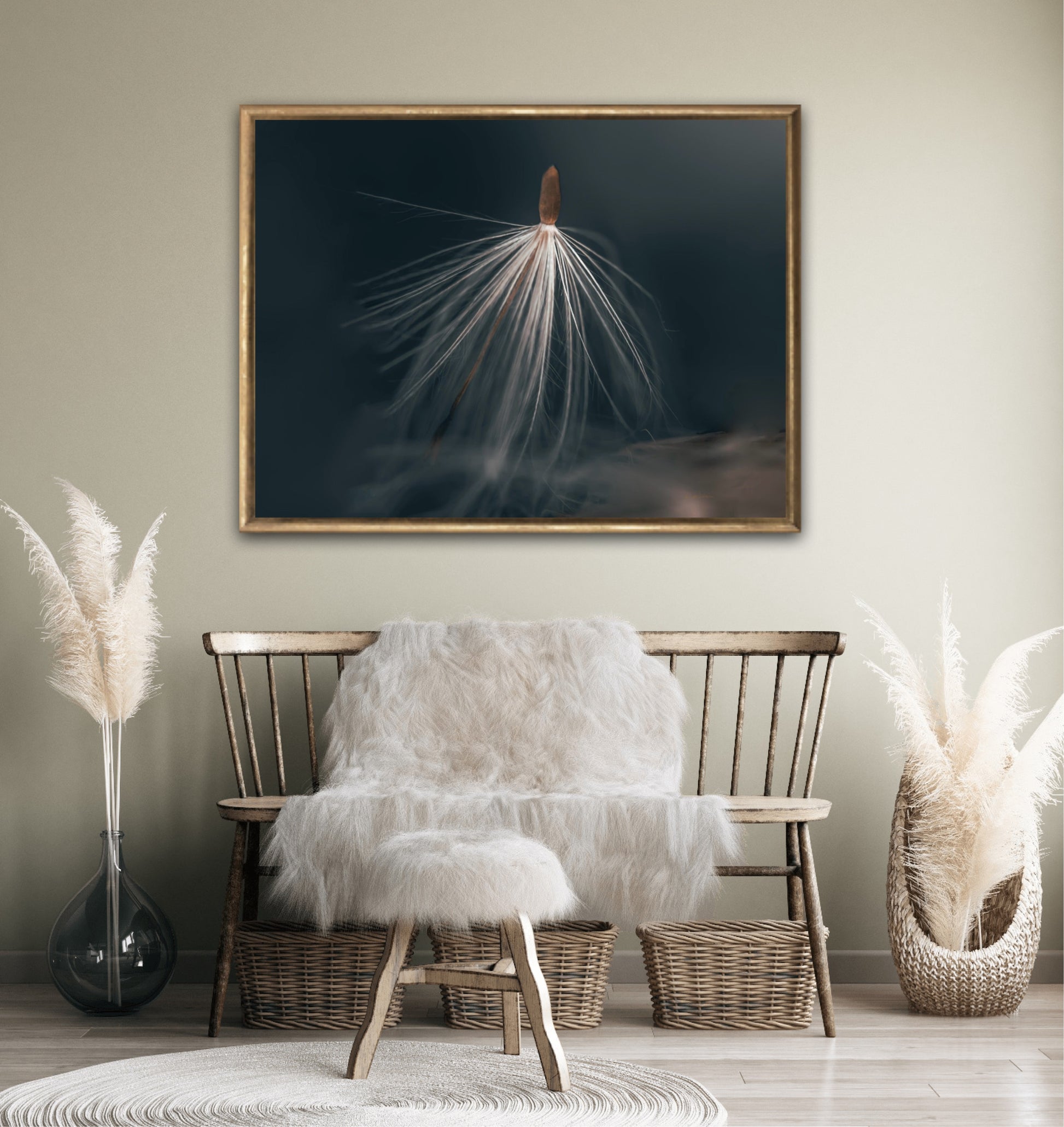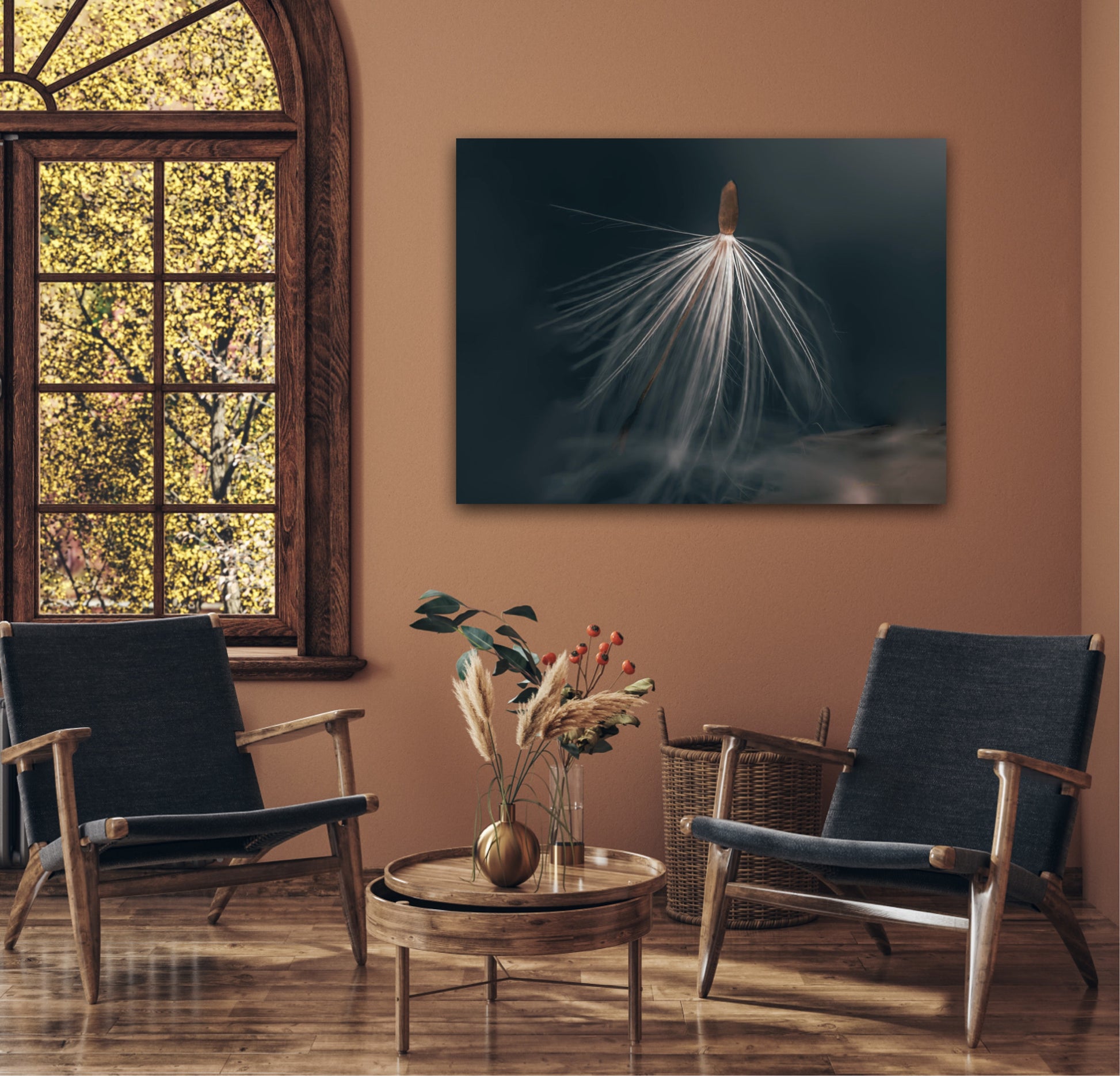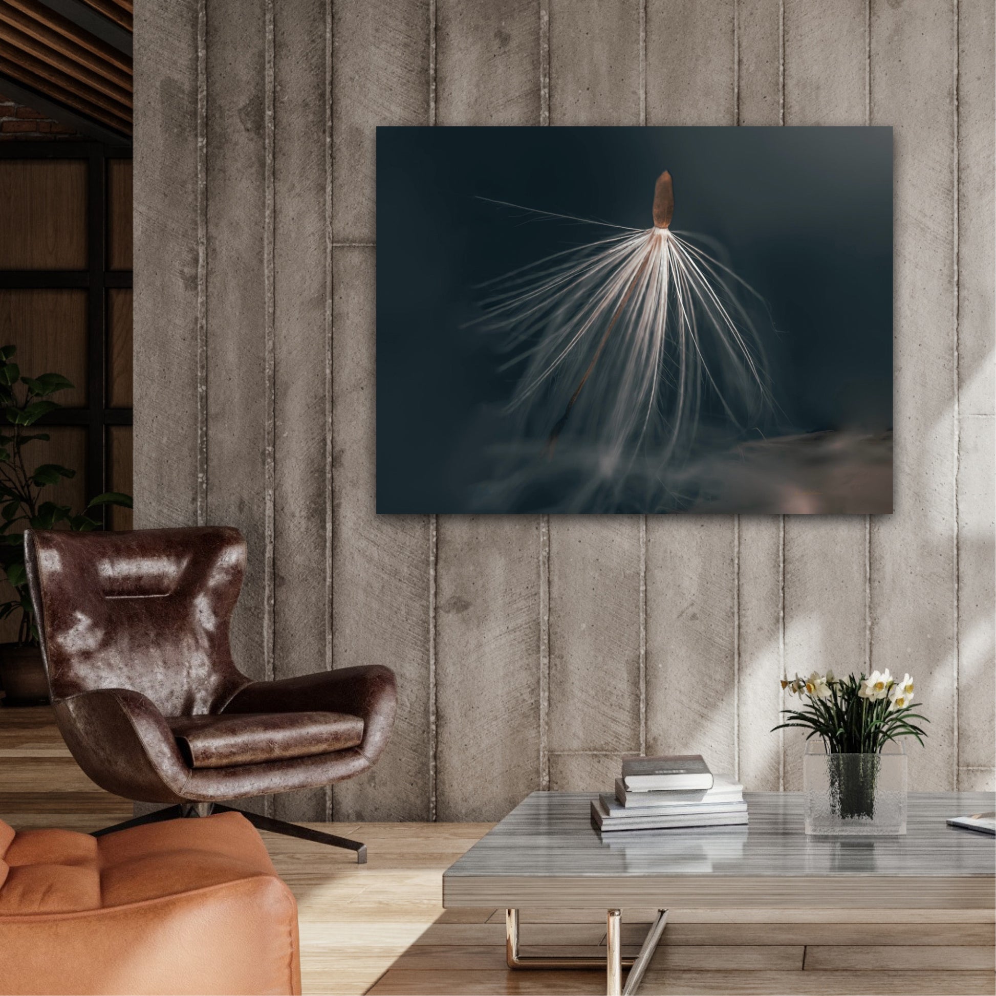 Beautiful photographic wall art of a dandelion seed up close. Feel the magic of nature with this picture. The picture becomes an eye-catcher on the wall and comes in pleasant tones that match several wall colours.