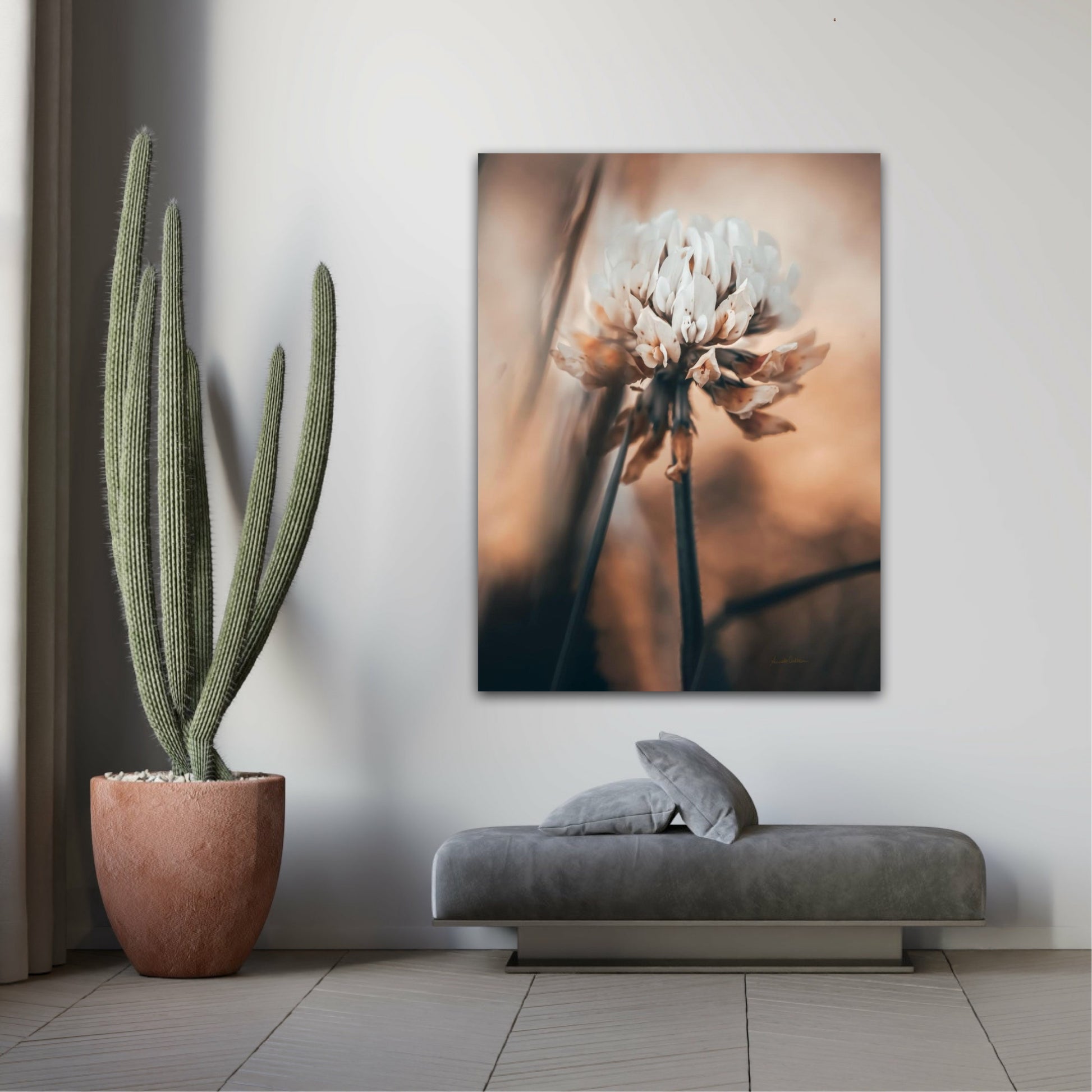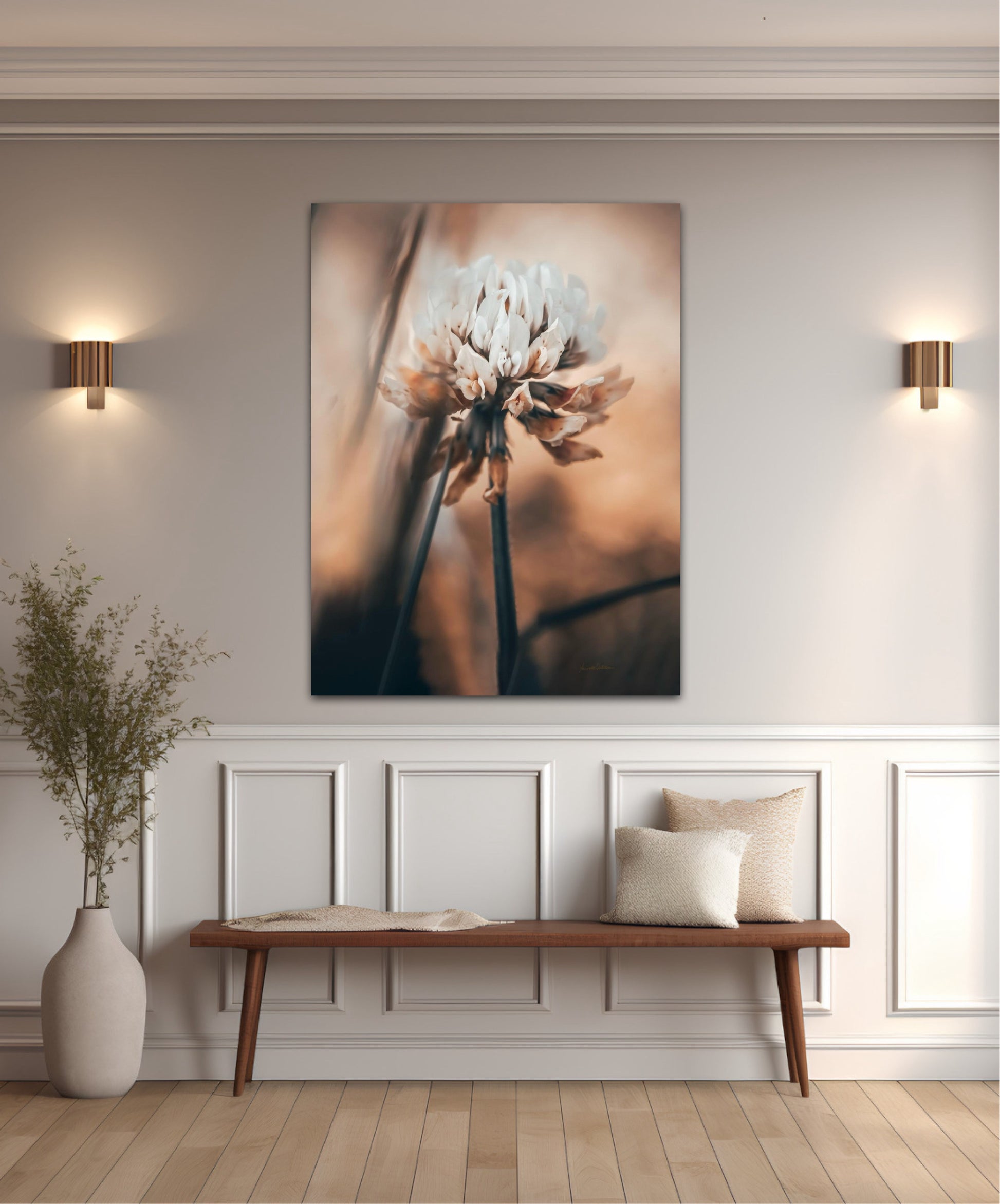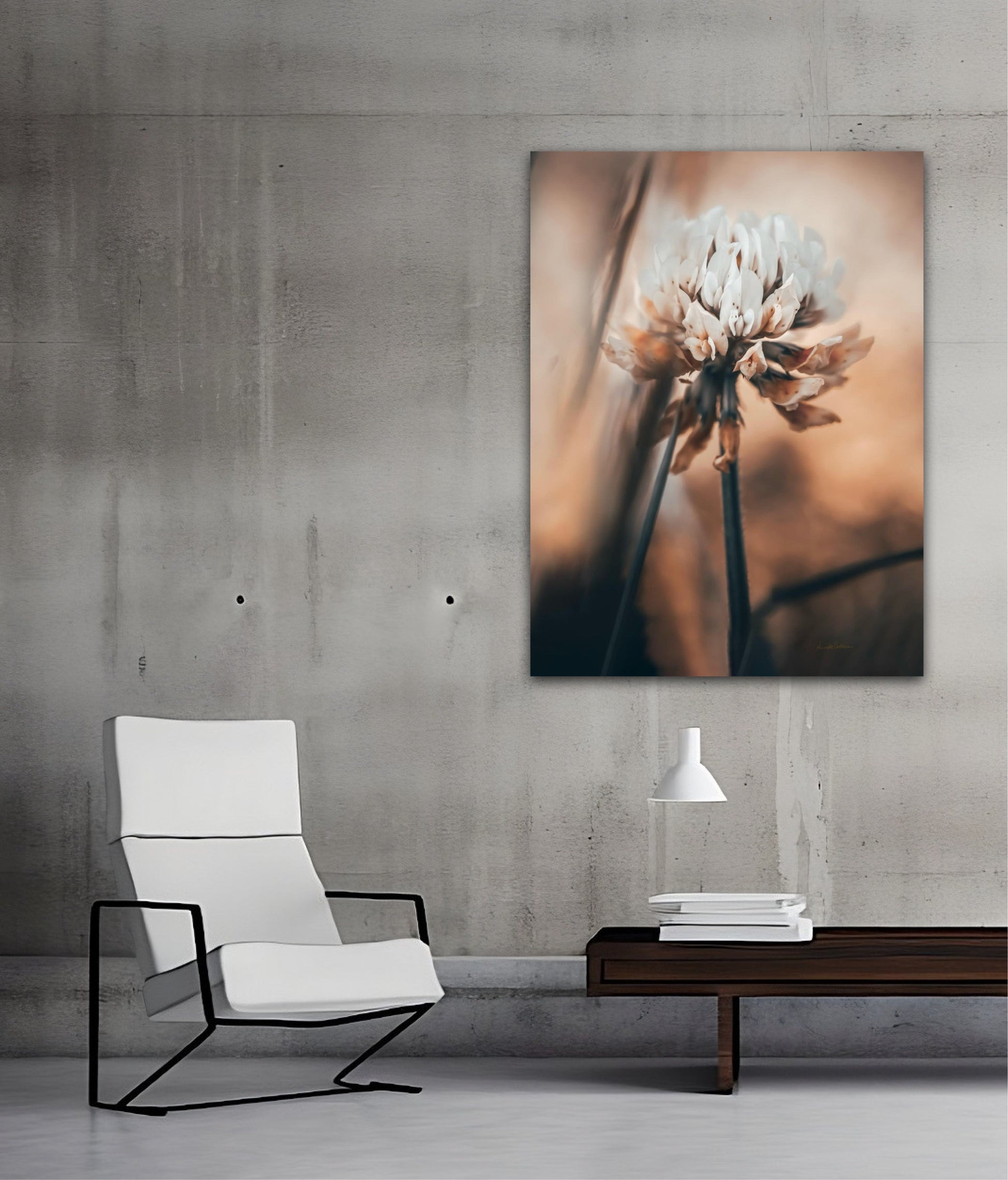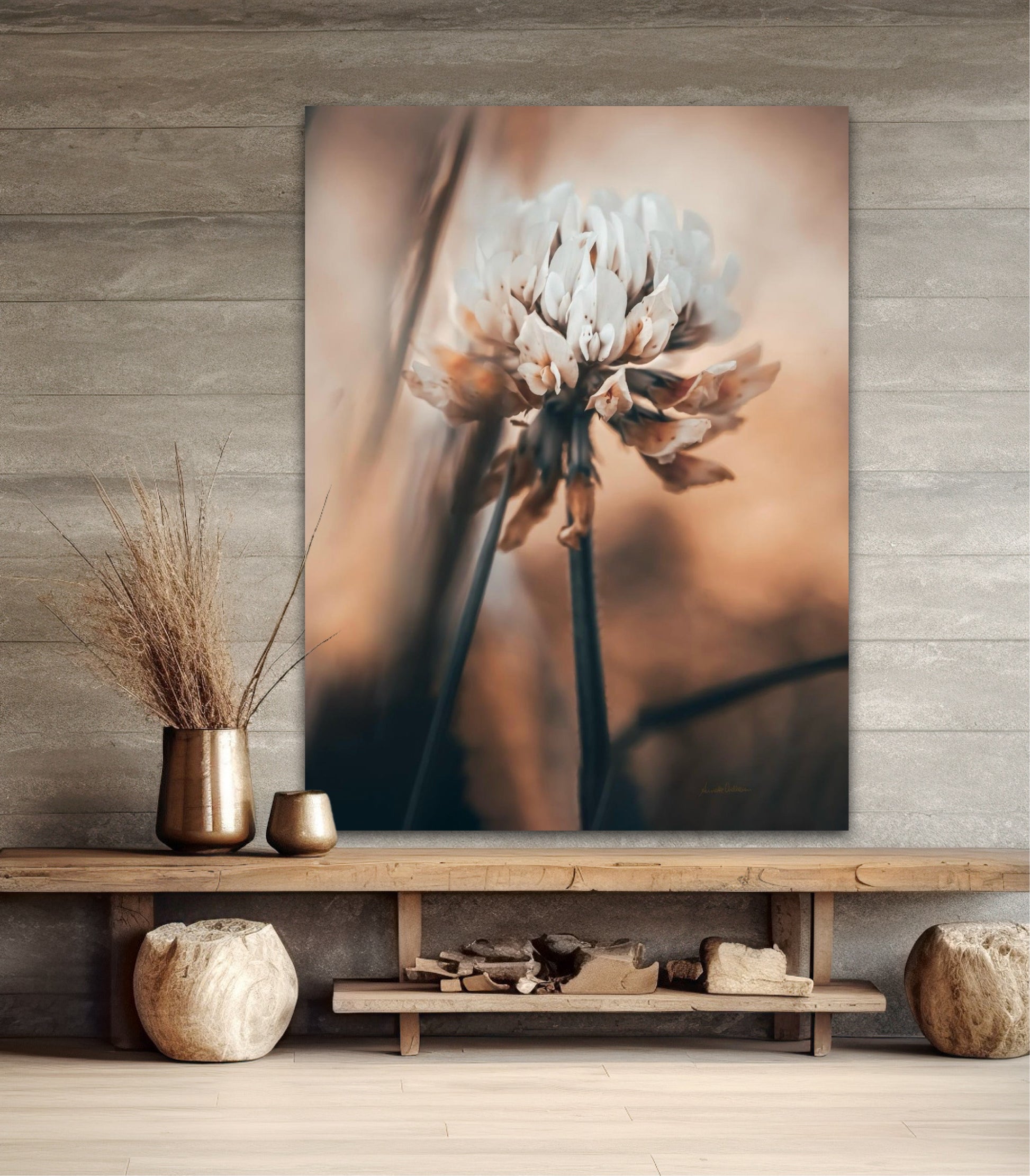 Beautiful photographic wall art of a clover flower weed in light golden tones, with beautiful details and dramatic light. This artwork will make you feel grounded and at piece.