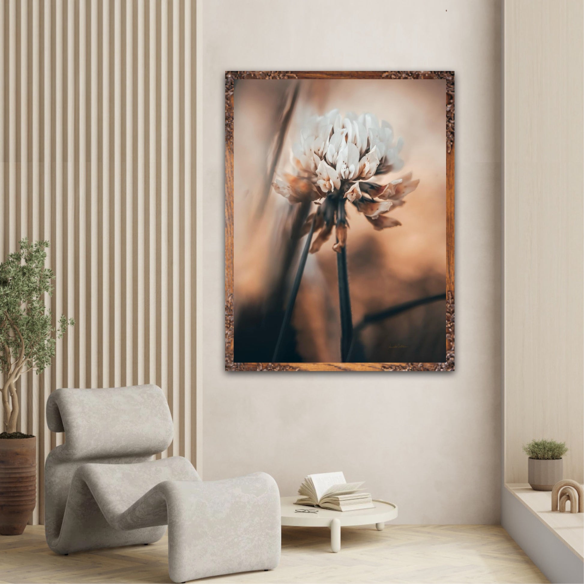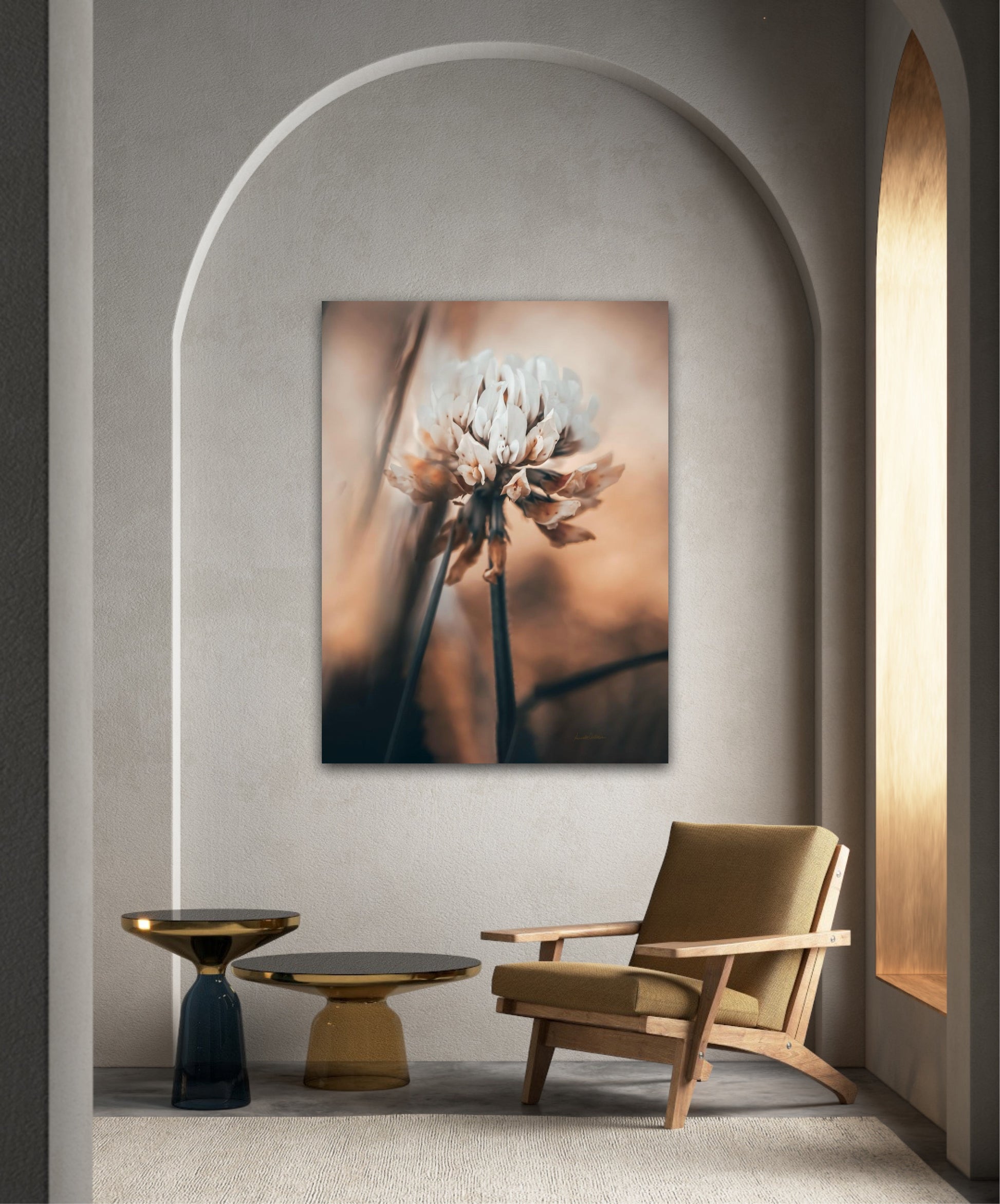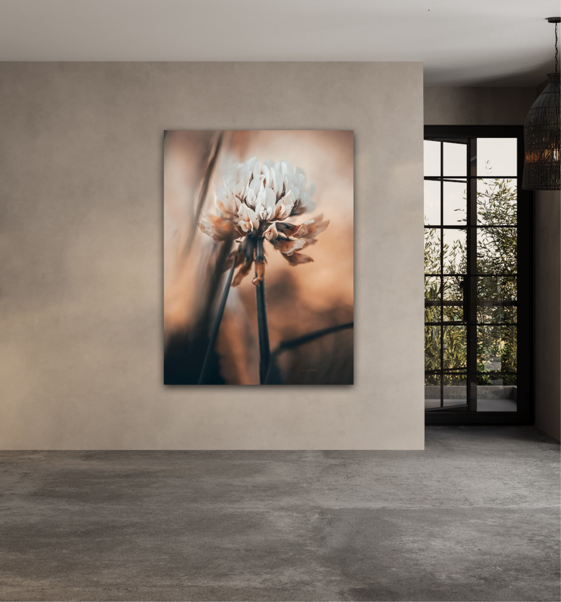 Beautiful photographic wall art of a clover flower weed in light golden tones, with beautiful details and dramatic light. This artwork will make you feel grounded and at piece.