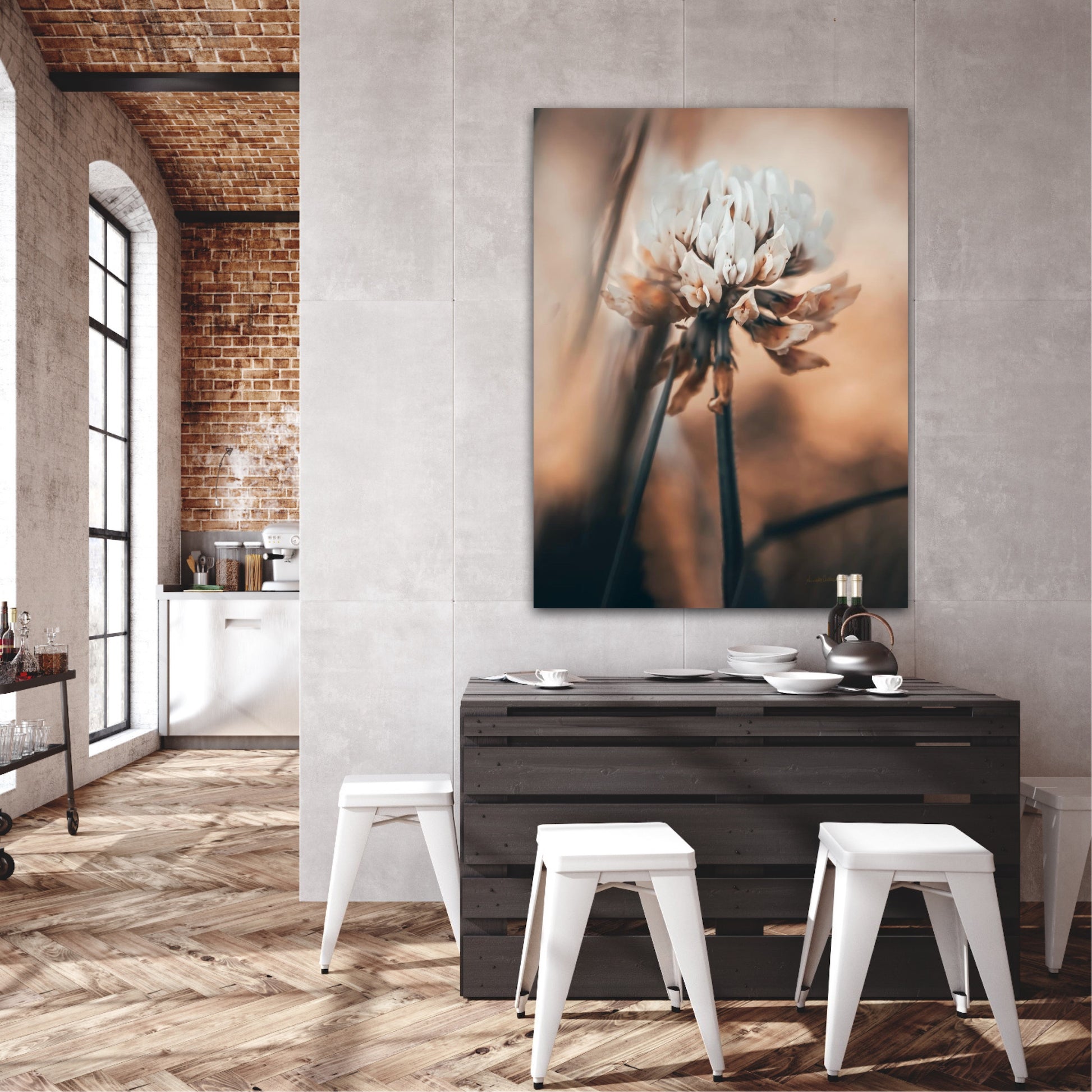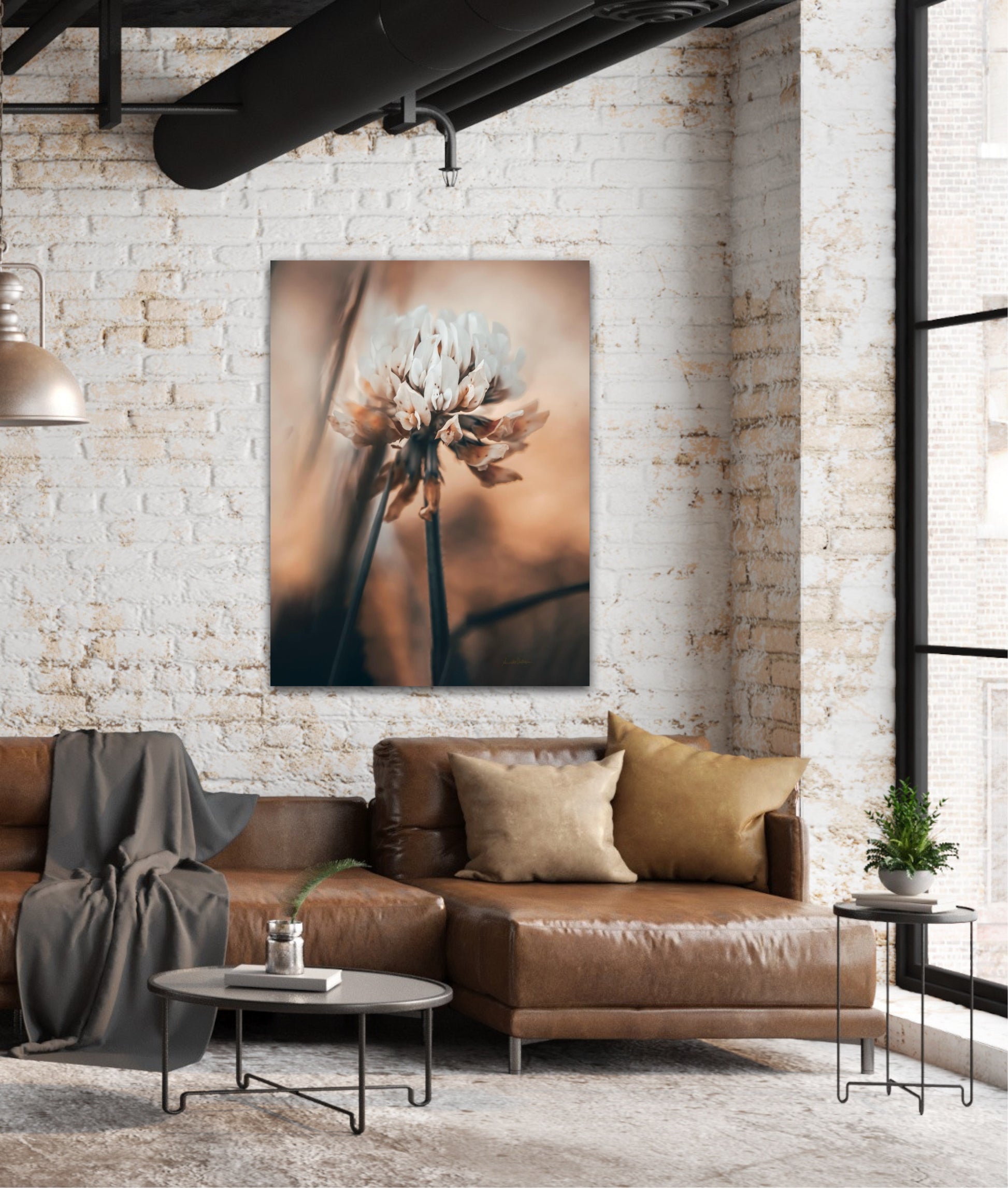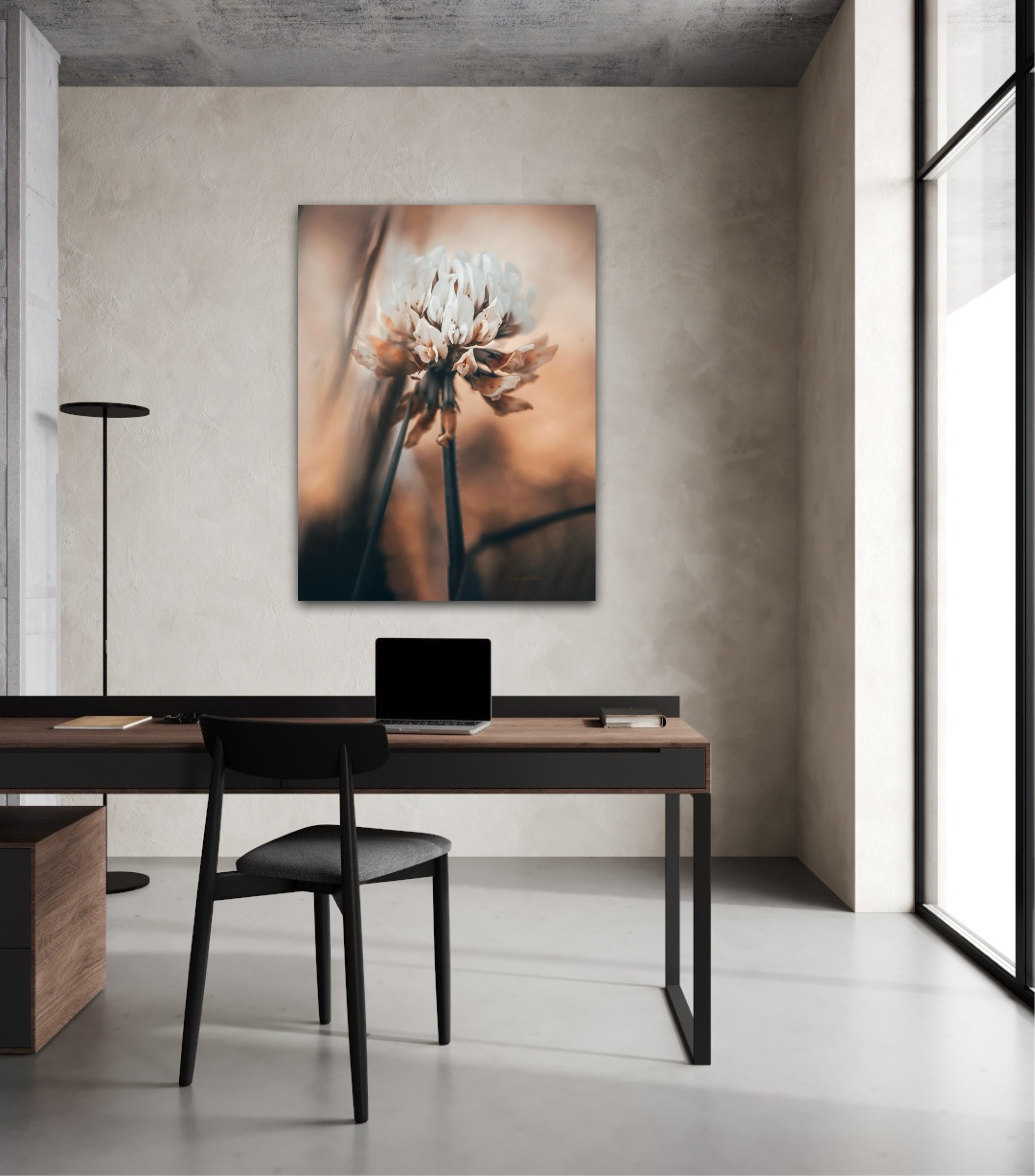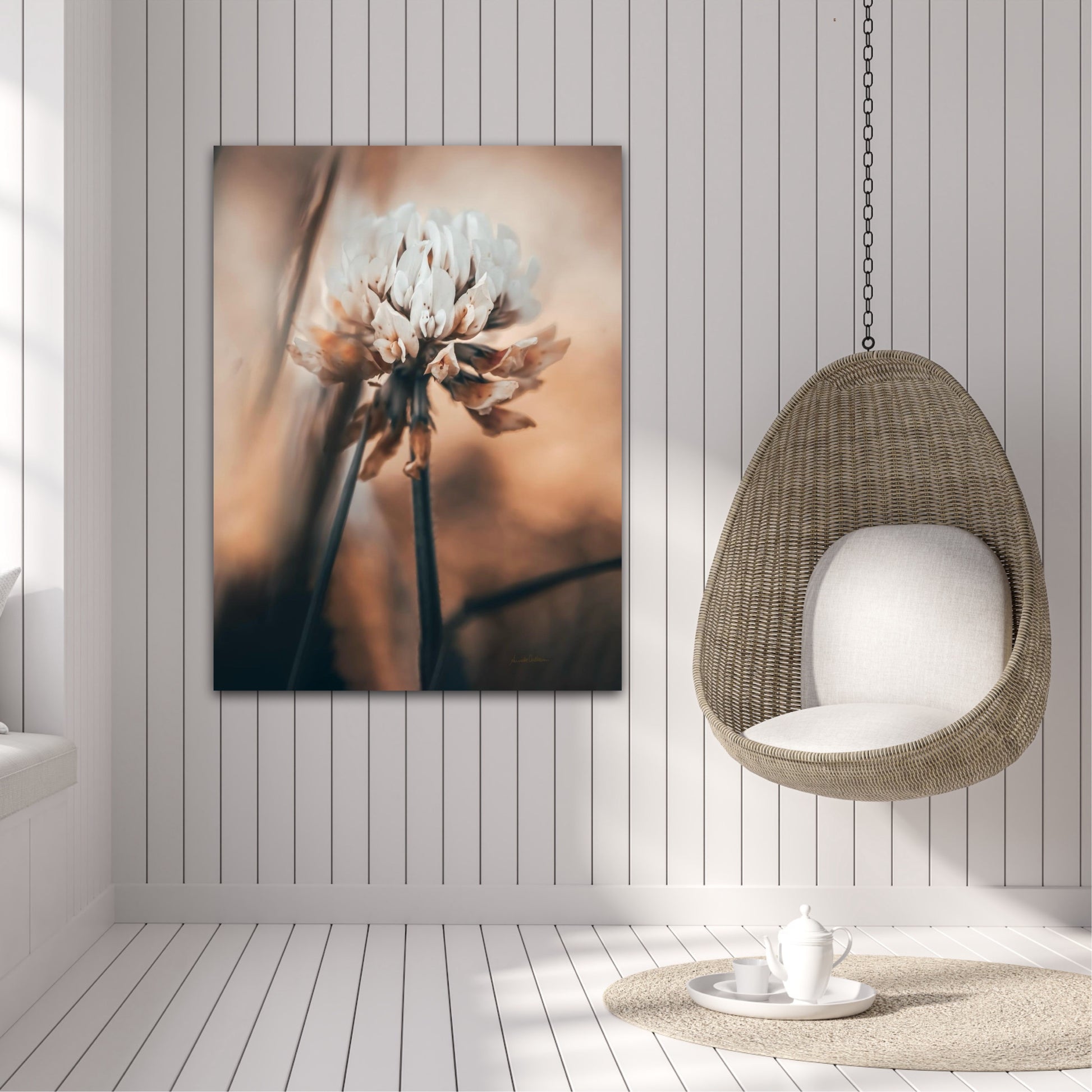 Beautiful photographic wall art of a clover flower weed in light golden tones, with beautiful details and dramatic light. This artwork will make you feel grounded and at piece.