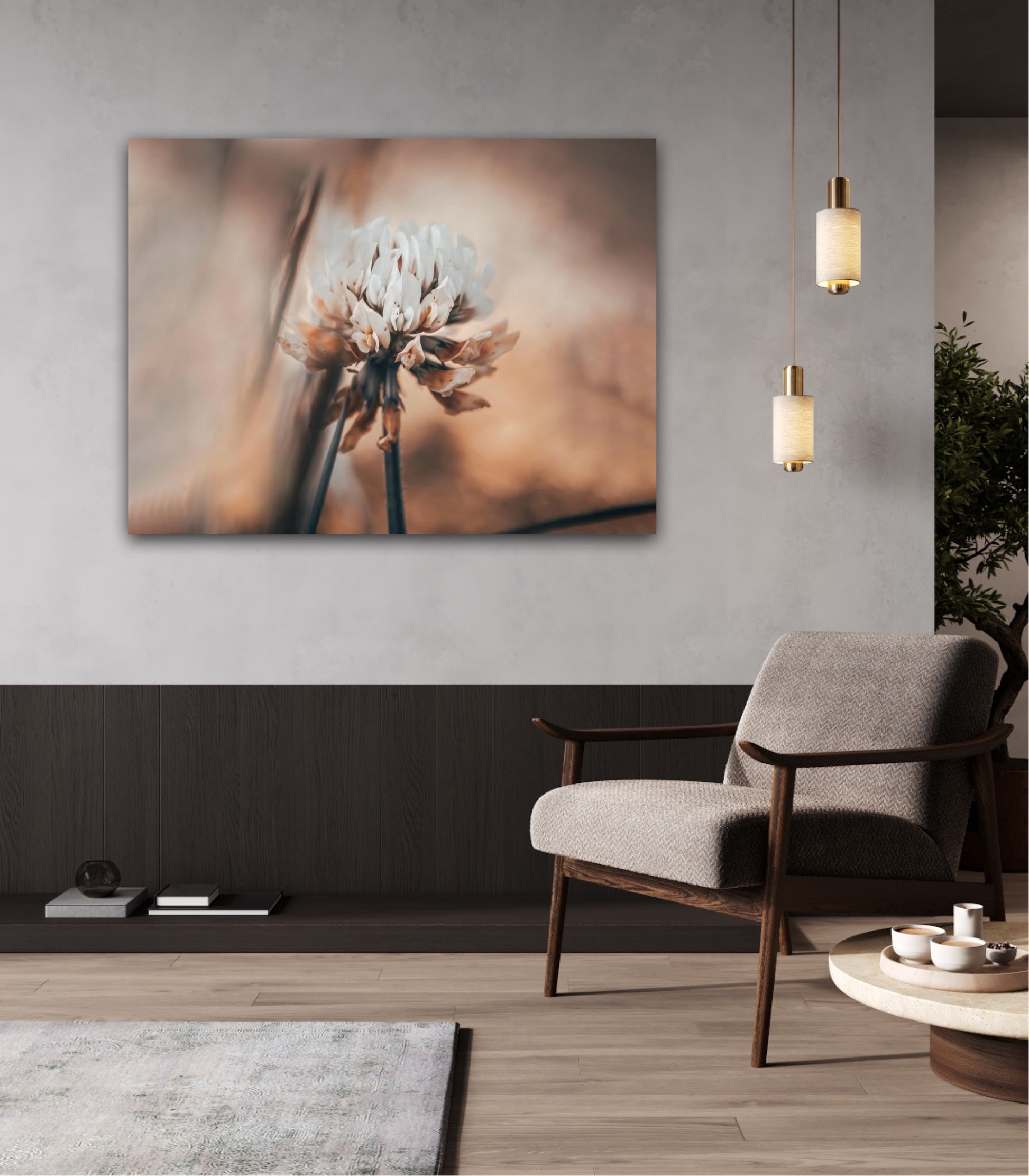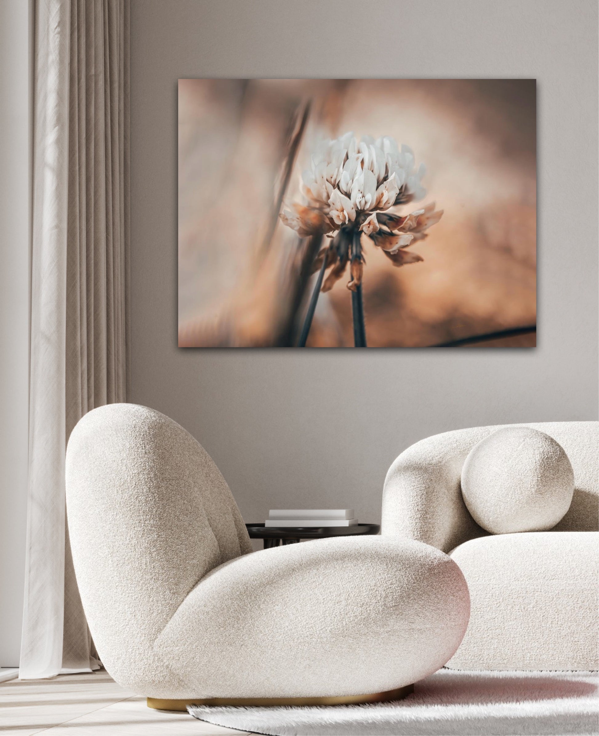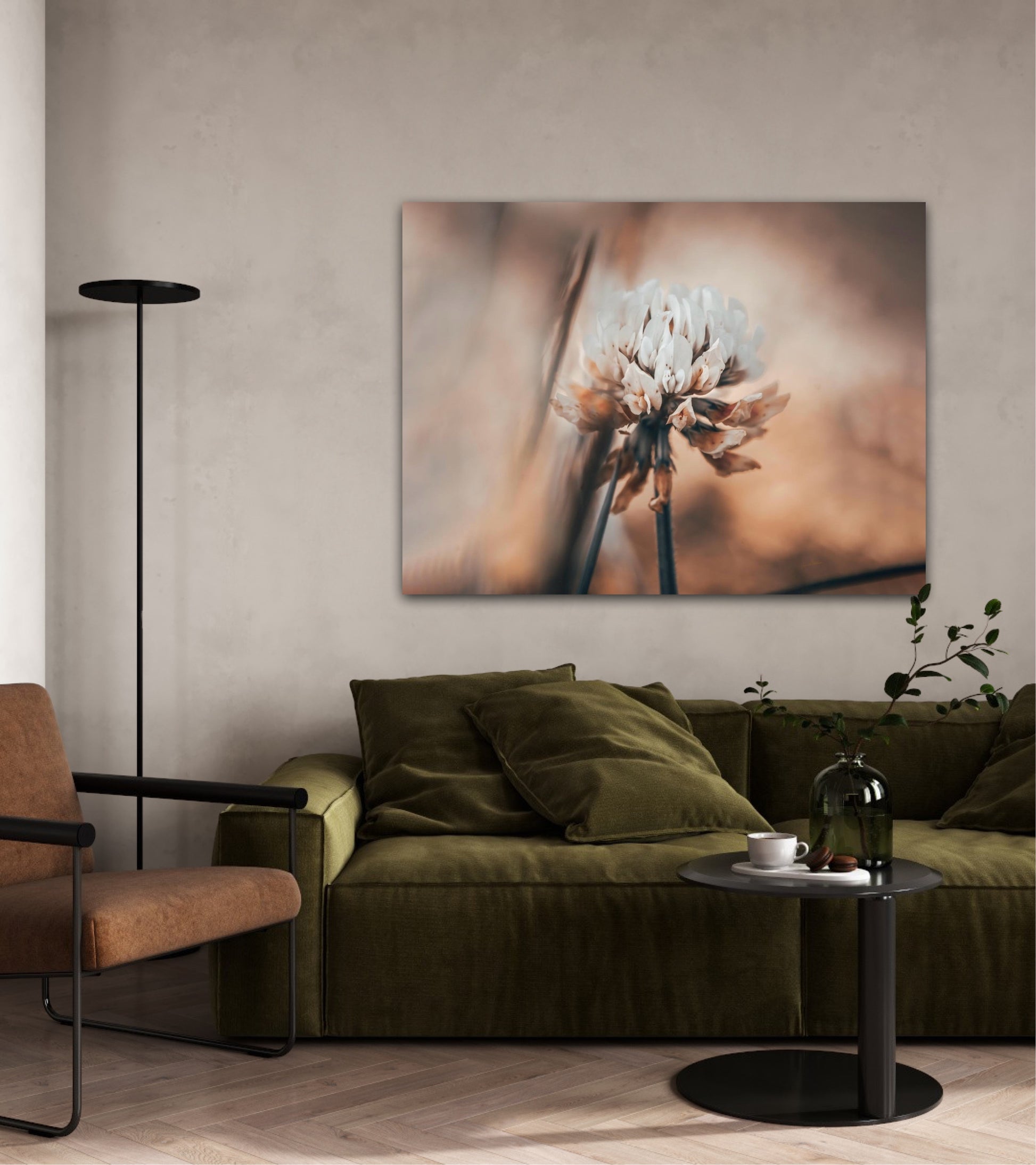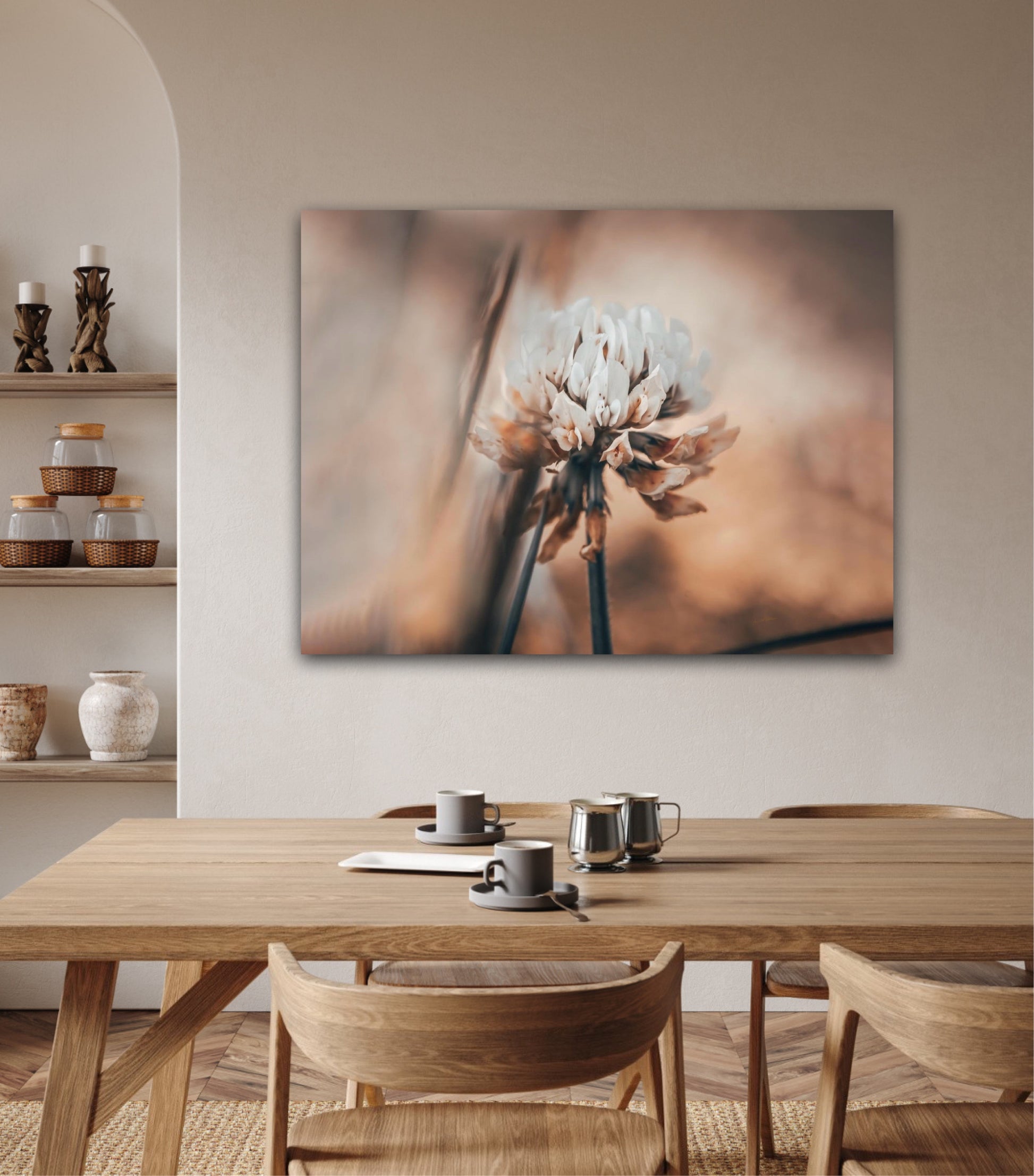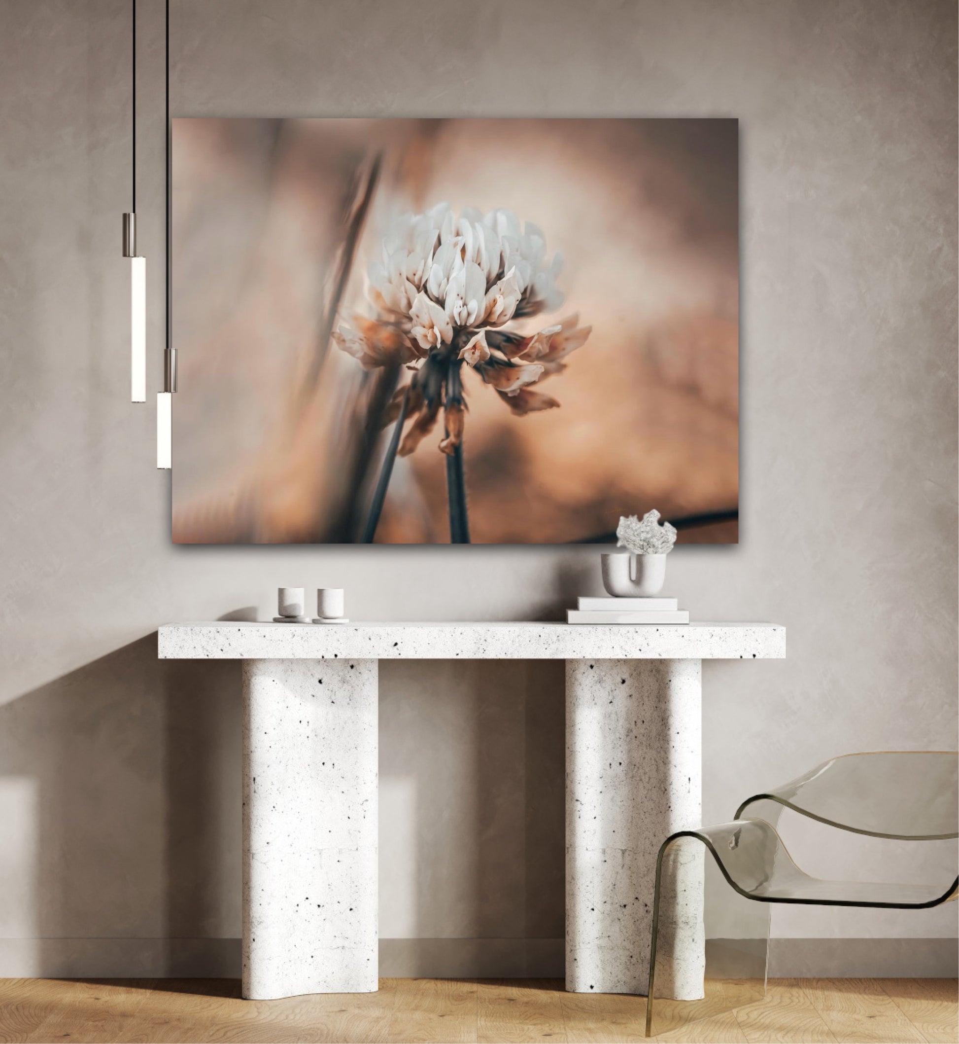 Beautiful photographic wall art of a clower flower in a beautiful golden light. This artwork becomes an eye-catcher on the wall and brings nature into your home. Find the calm and magic of nature with this fine artwork.
