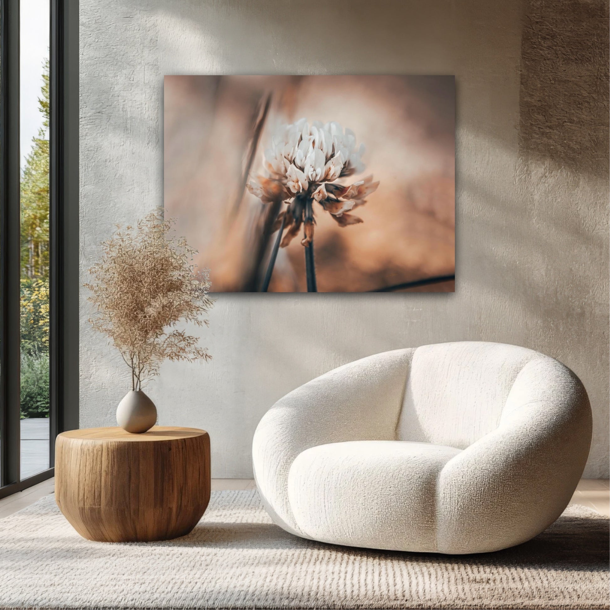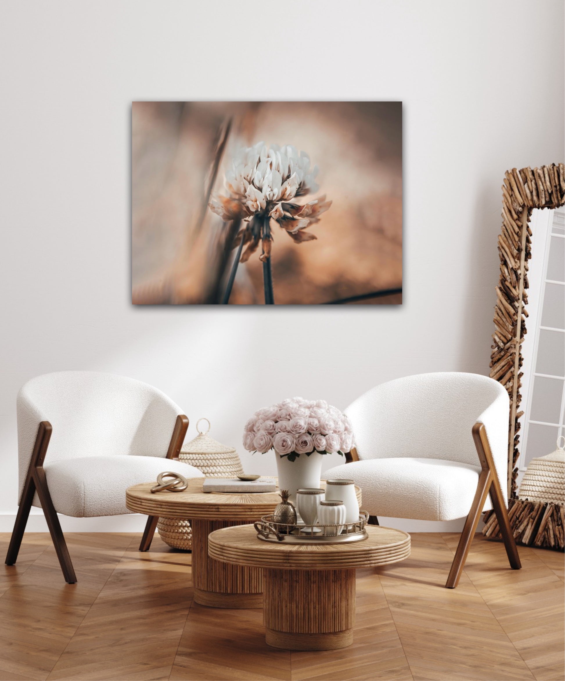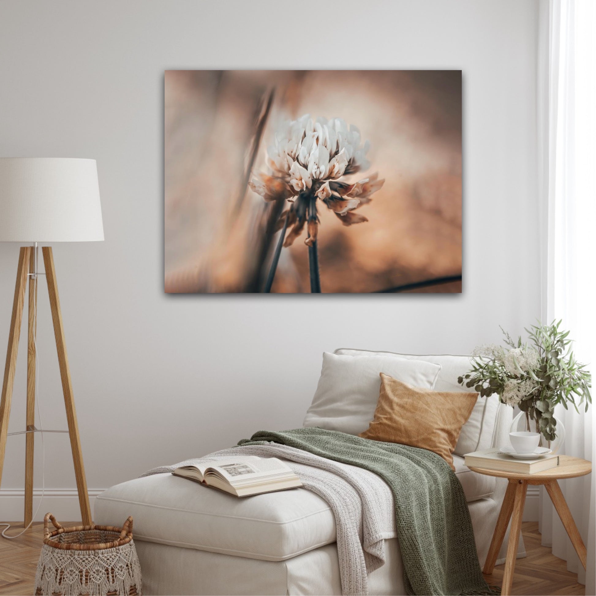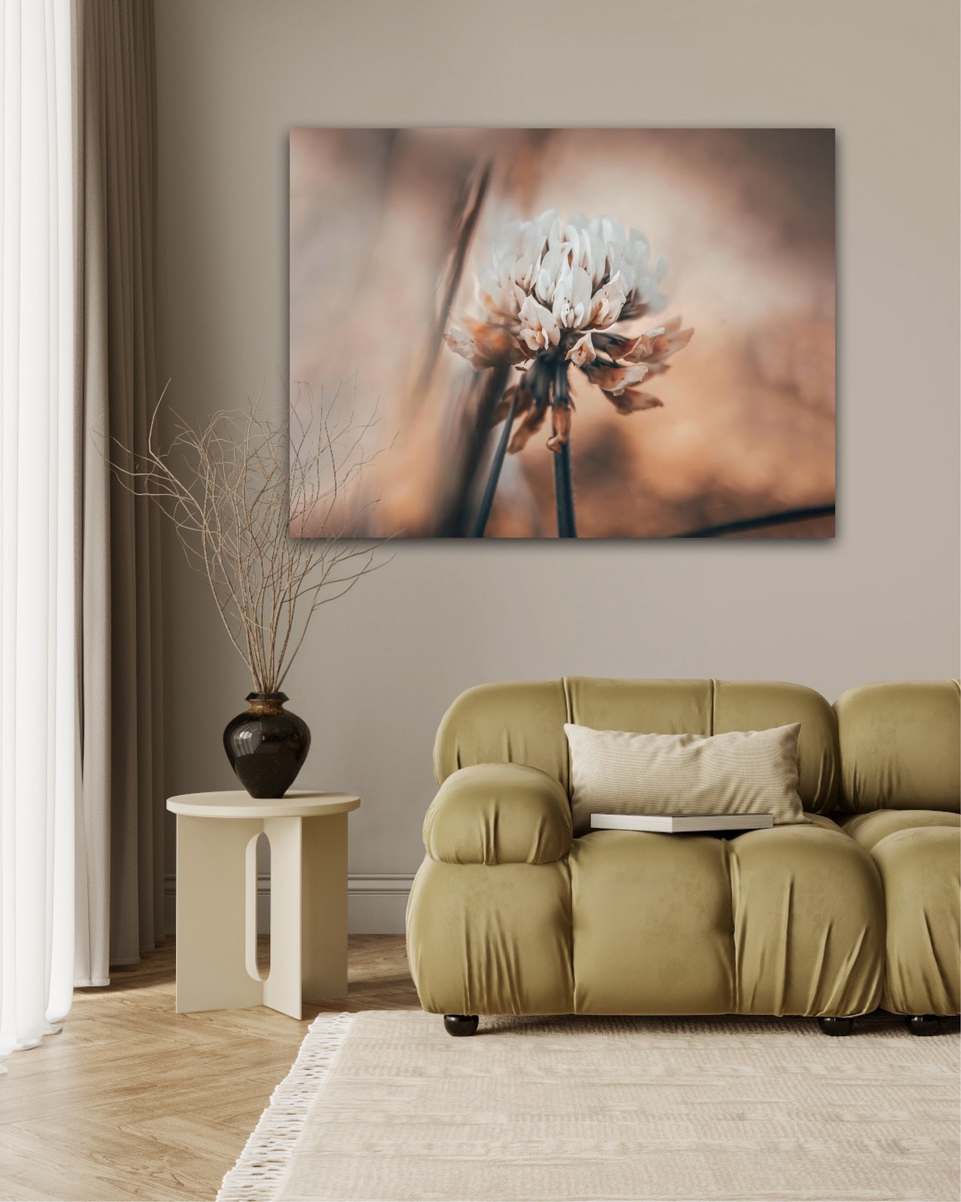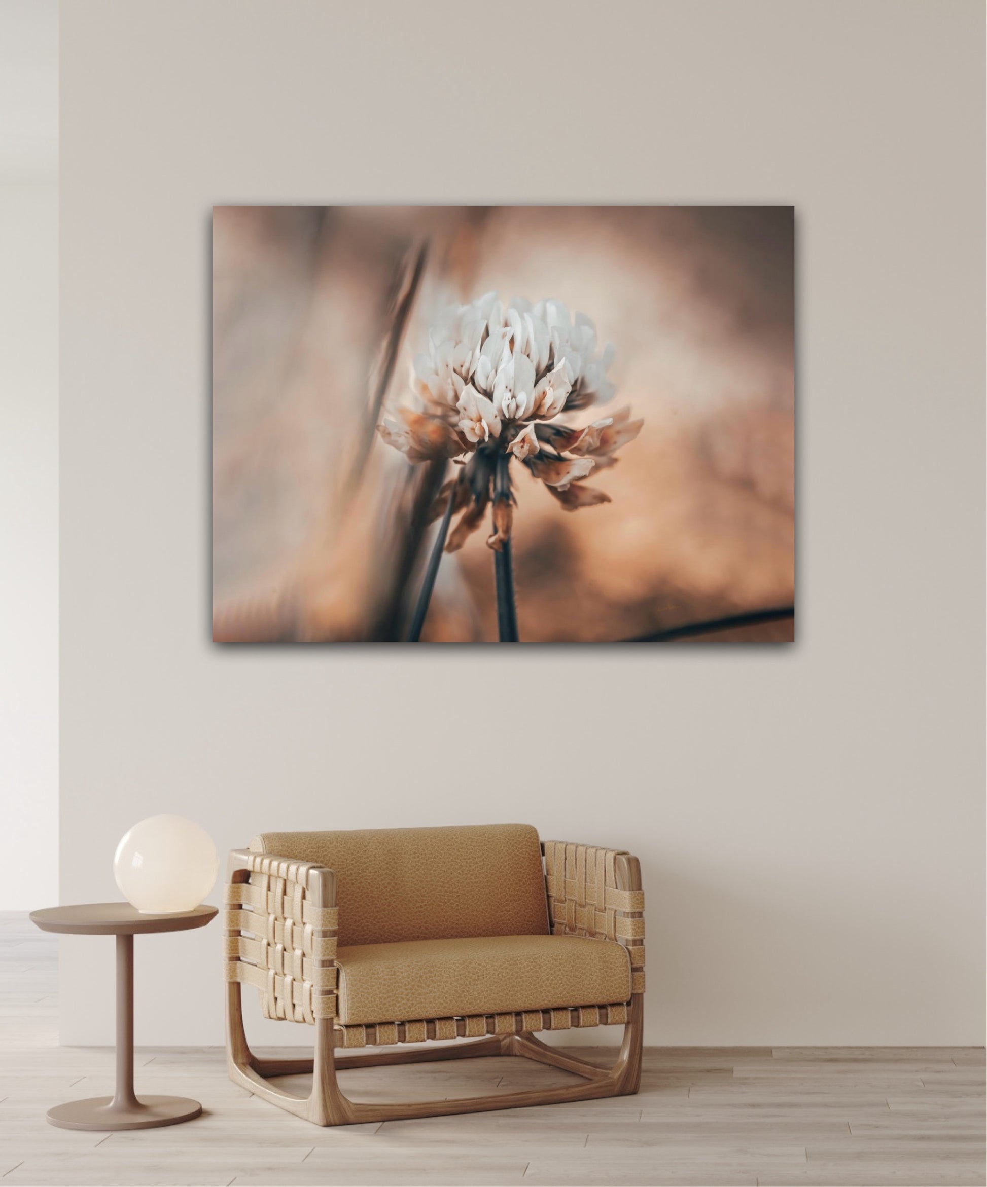 Beautiful photographic wall art of a clower flower in a beautiful golden light. This artwork becomes an eye-catcher on the wall and brings nature into your home. Find the calm and magic of nature with this fine artwork.