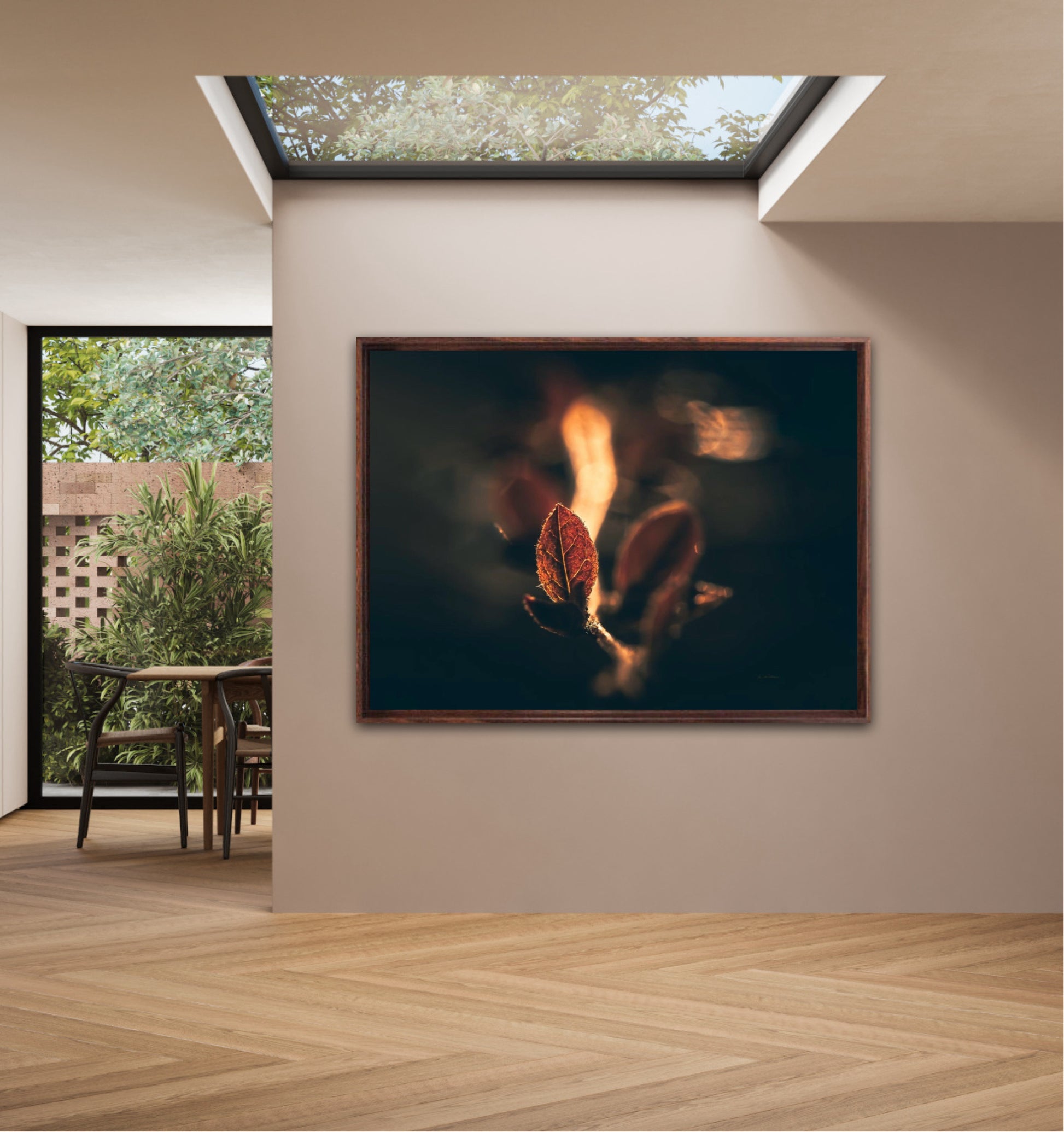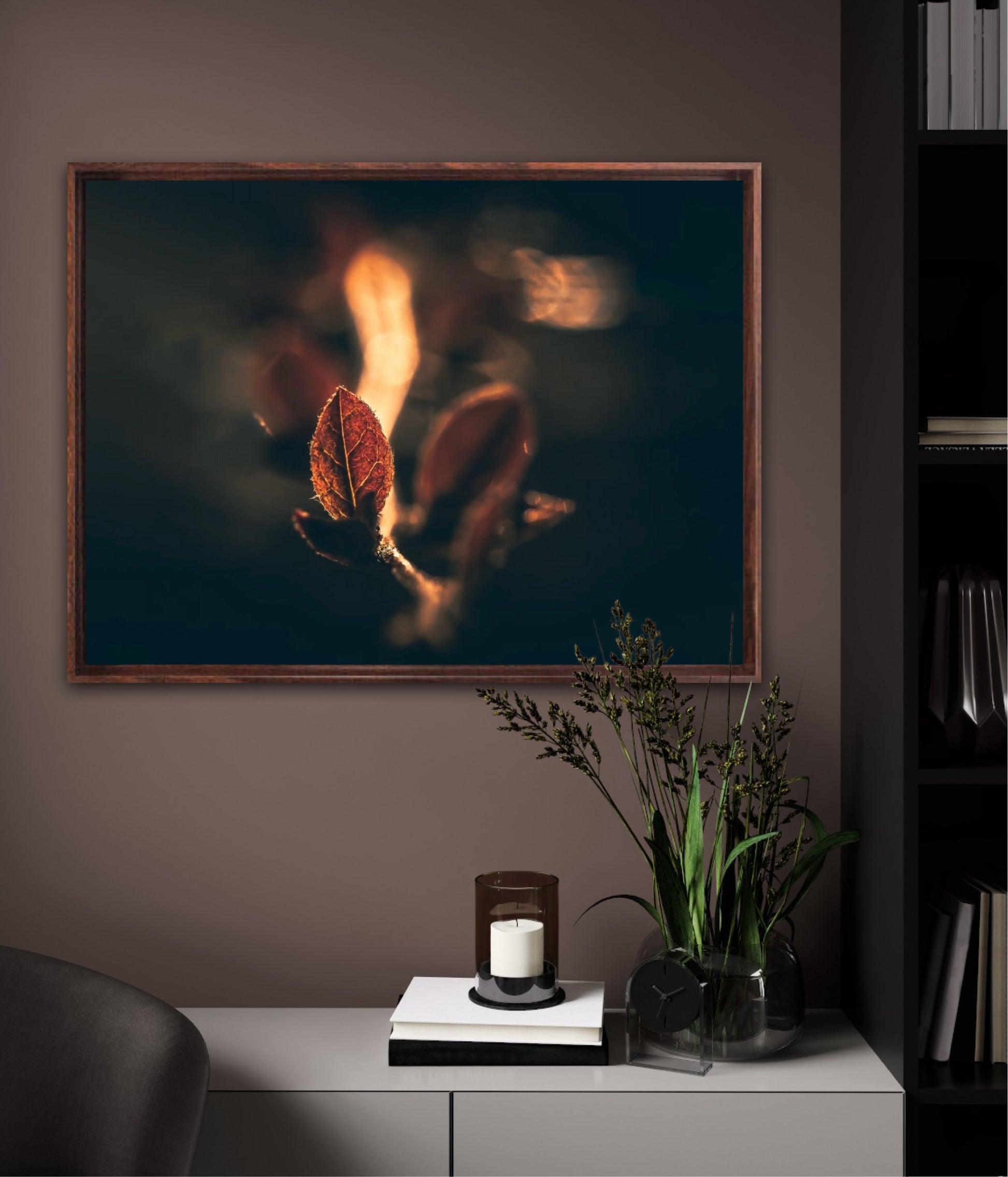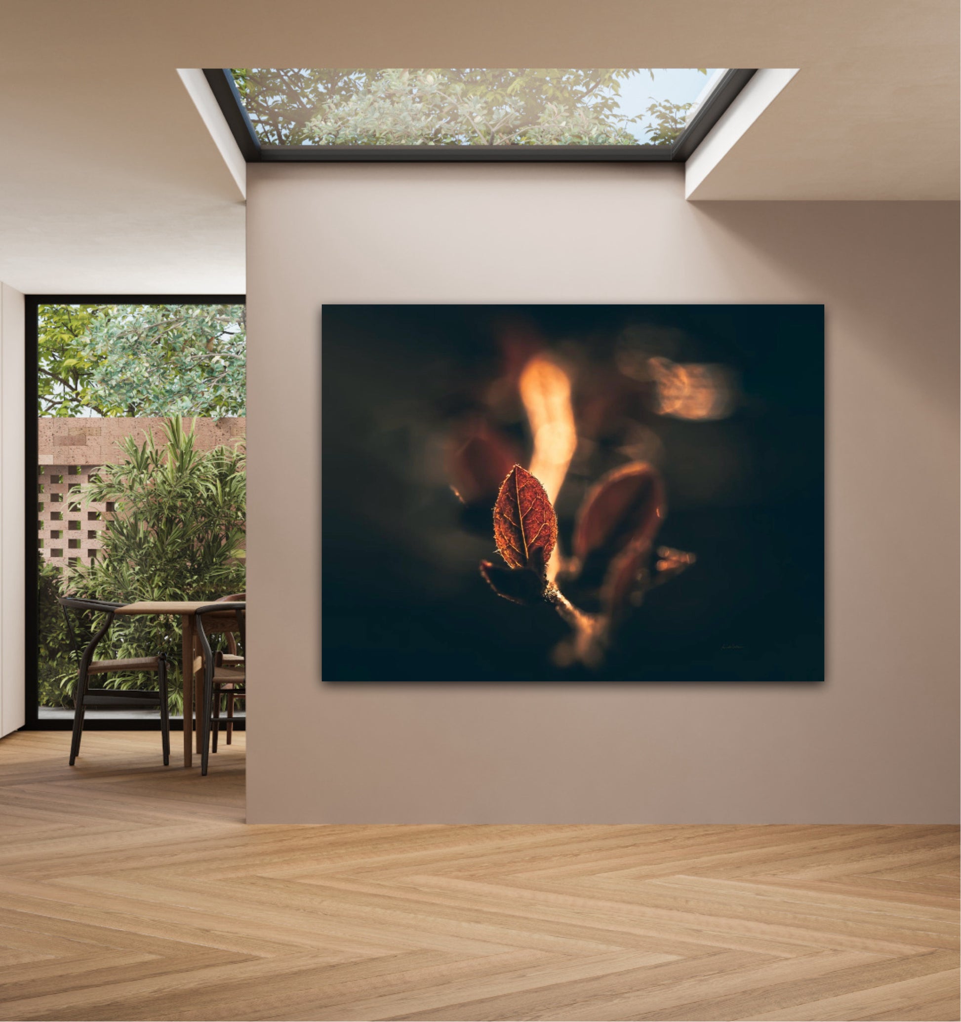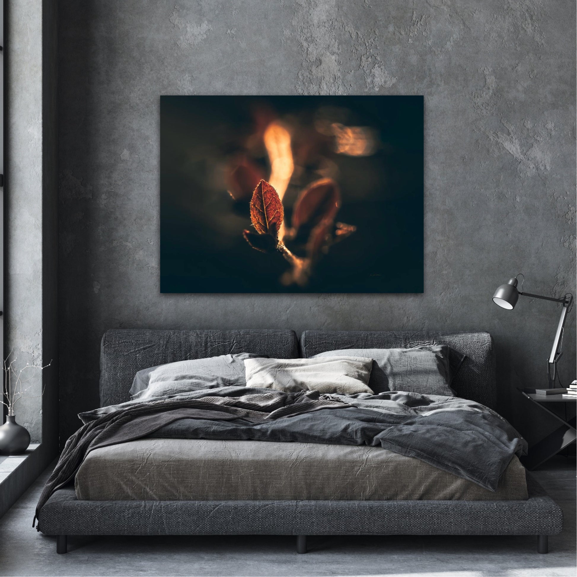 Beautiful photographic wall art of a glowing branch with new leaves against a dark background. This is a wonderful and atmospheric image that will give you strength and warmth for many years.