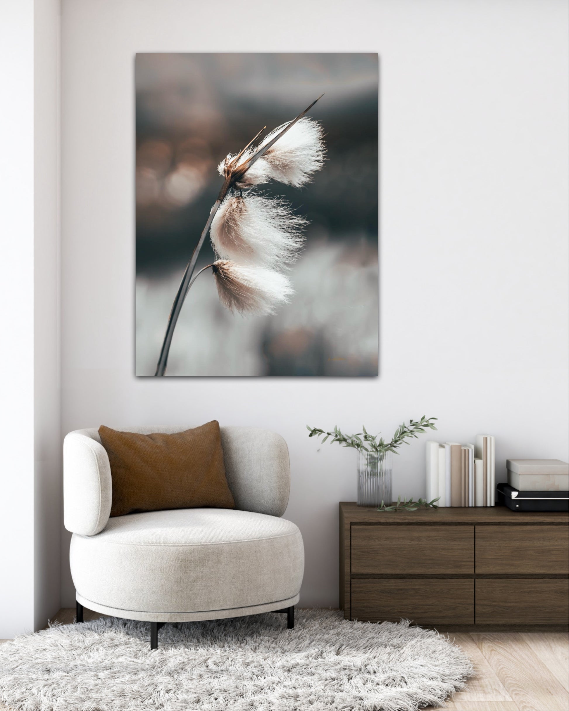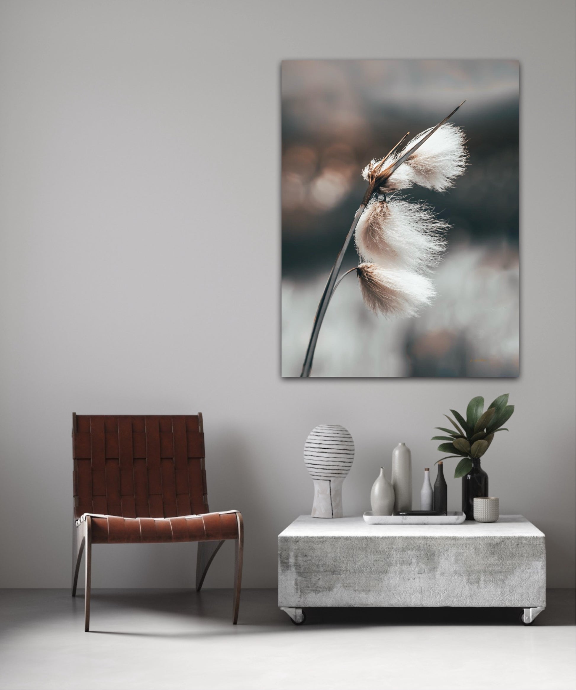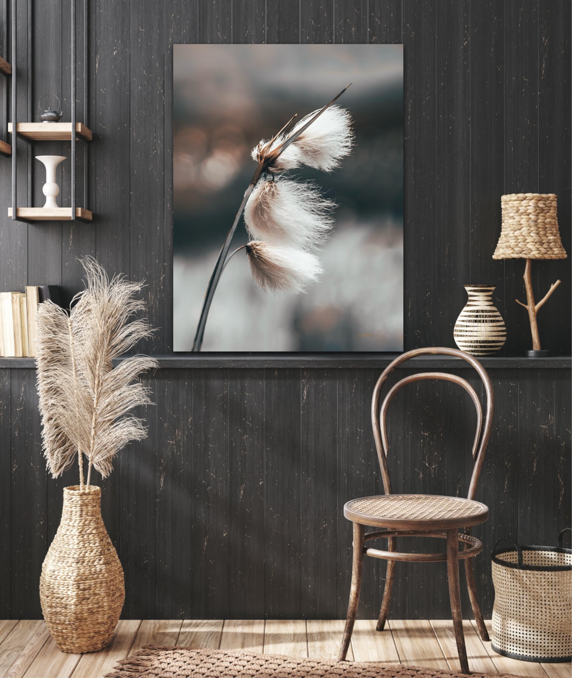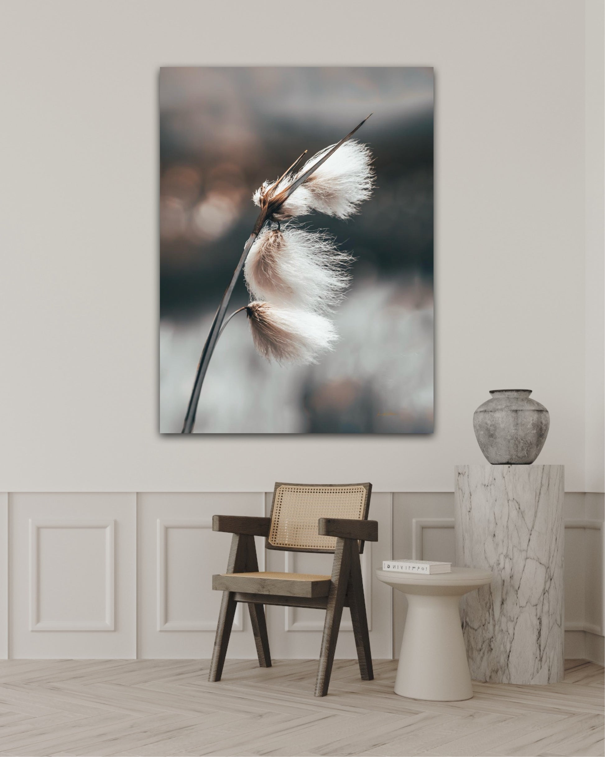 Beautiful and warm photographic art image of cottongrass in the mountain in wonderful earth tones on a dark and light background. Beautiful and peaceful, get the good feeling with this beautiful artwork.