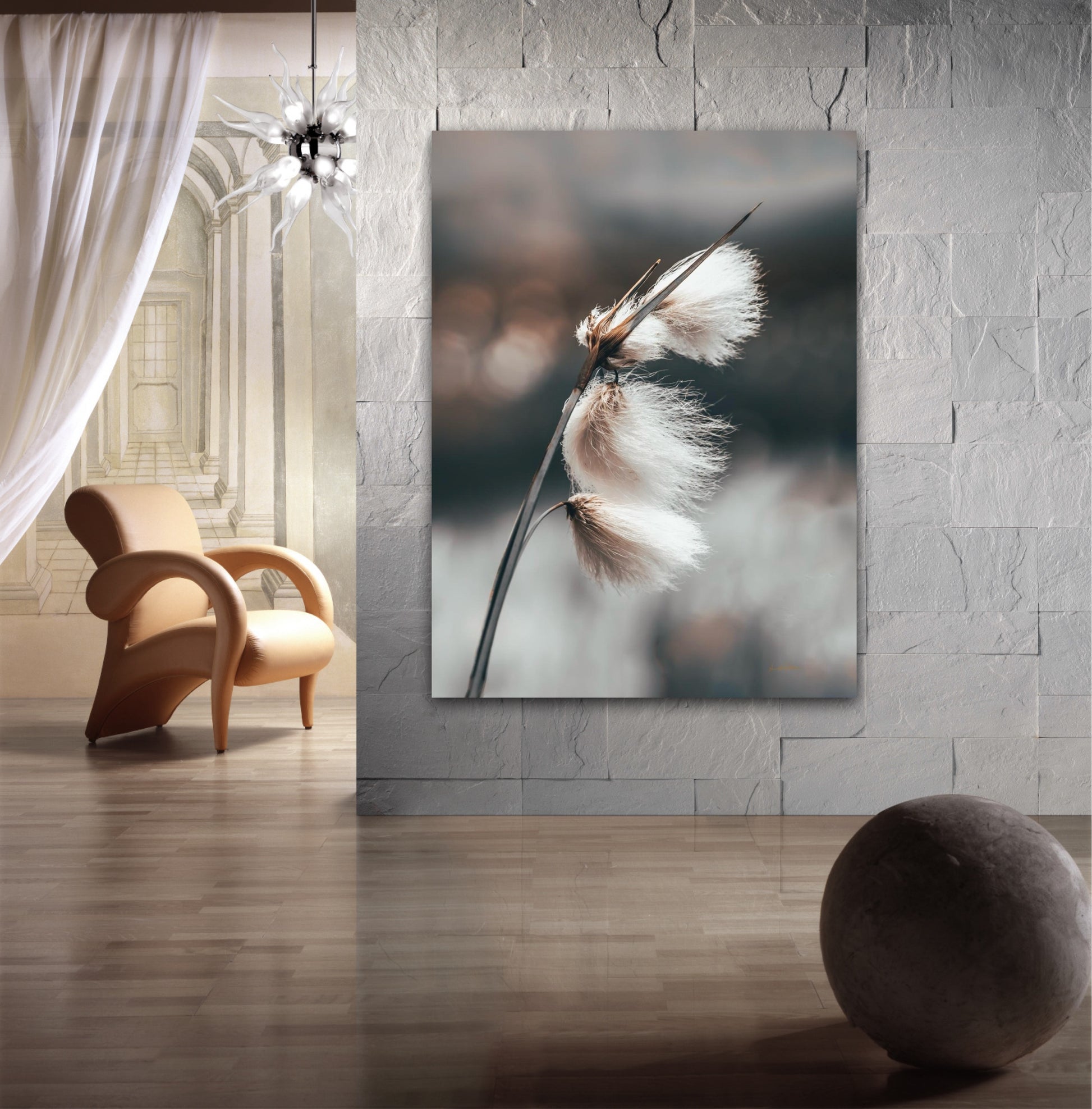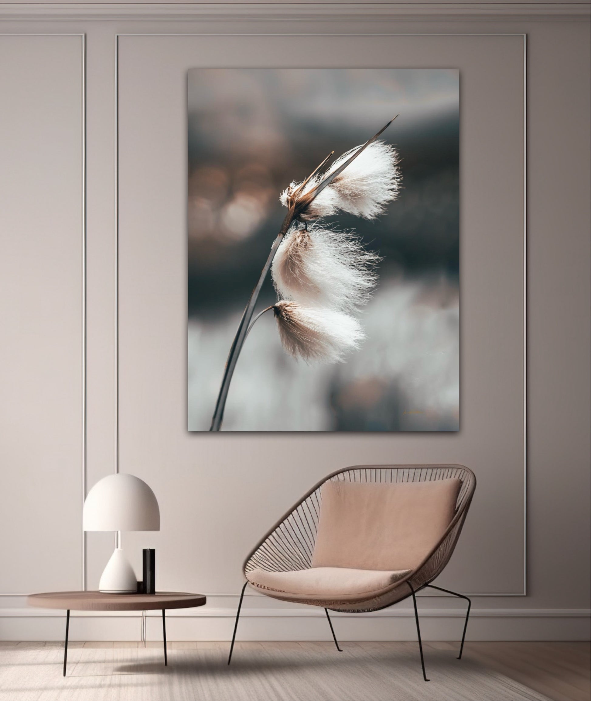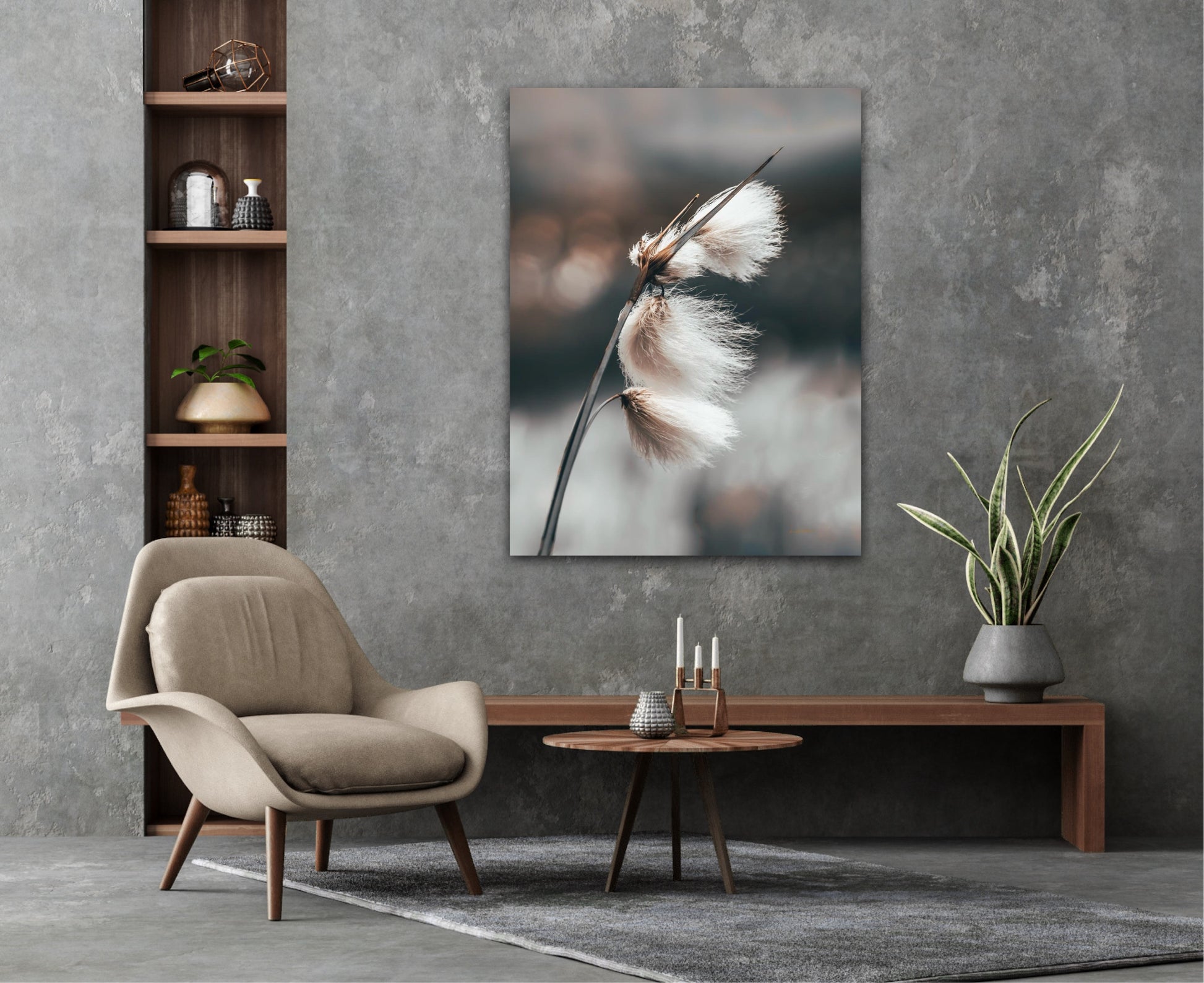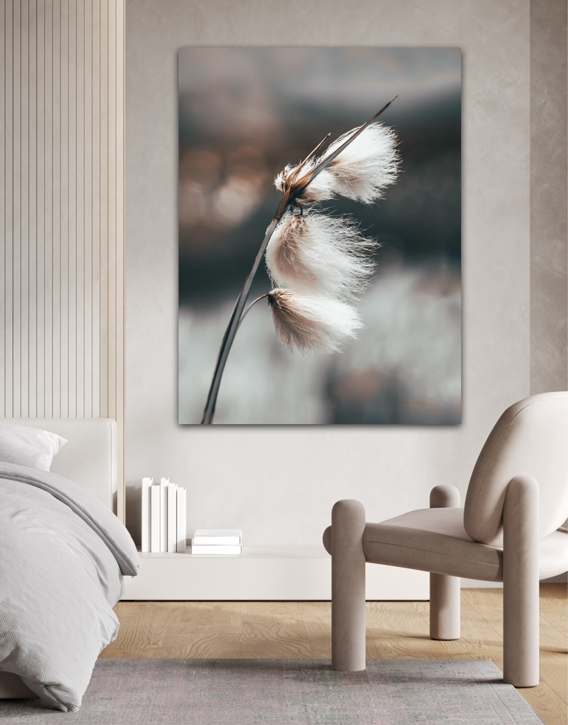 Beautiful and warm photographic art image of cottongrass in the mountain in wonderful earth tones on a dark and light background. Beautiful and peaceful, get the good feeling with this beautiful artwork.