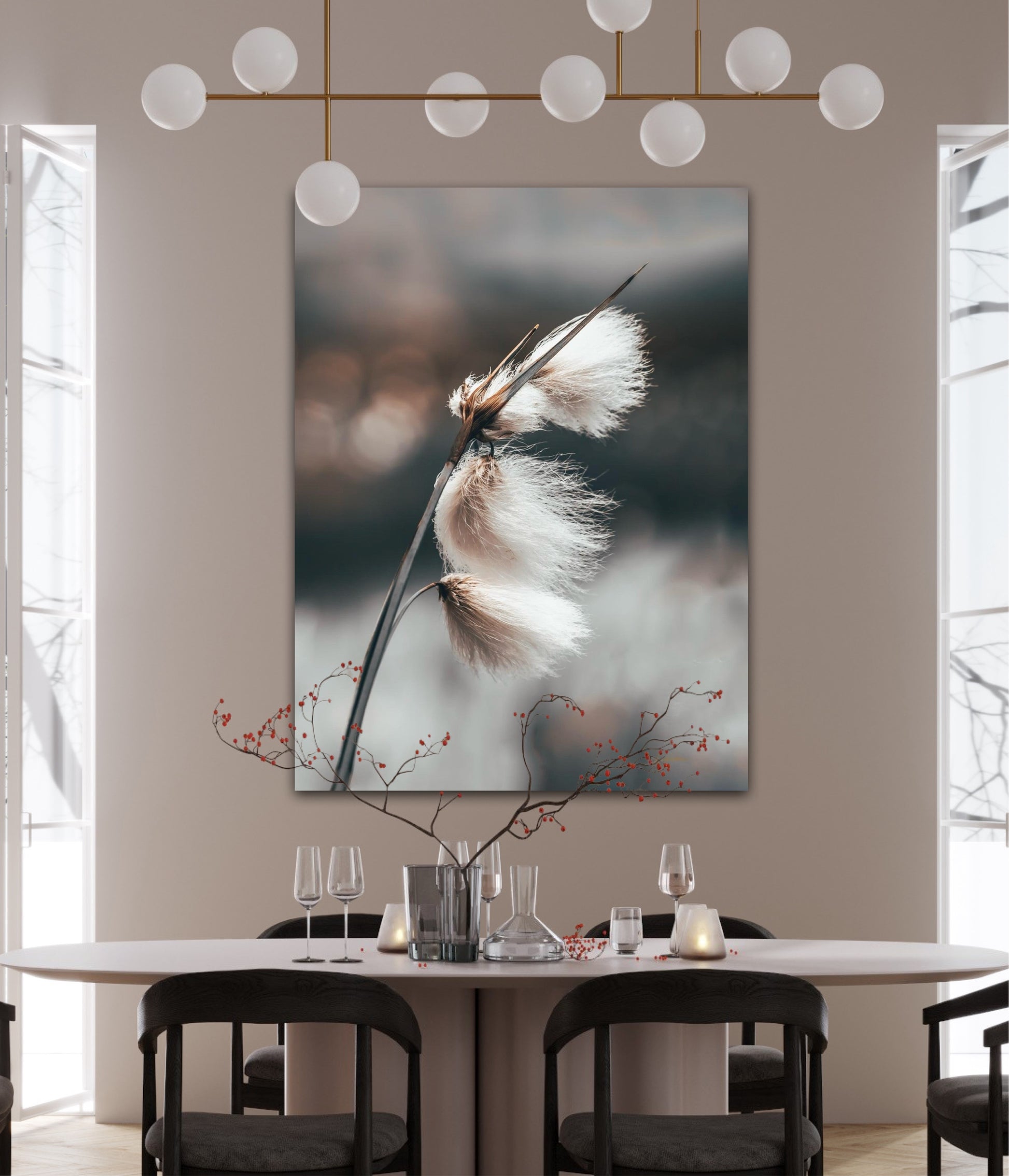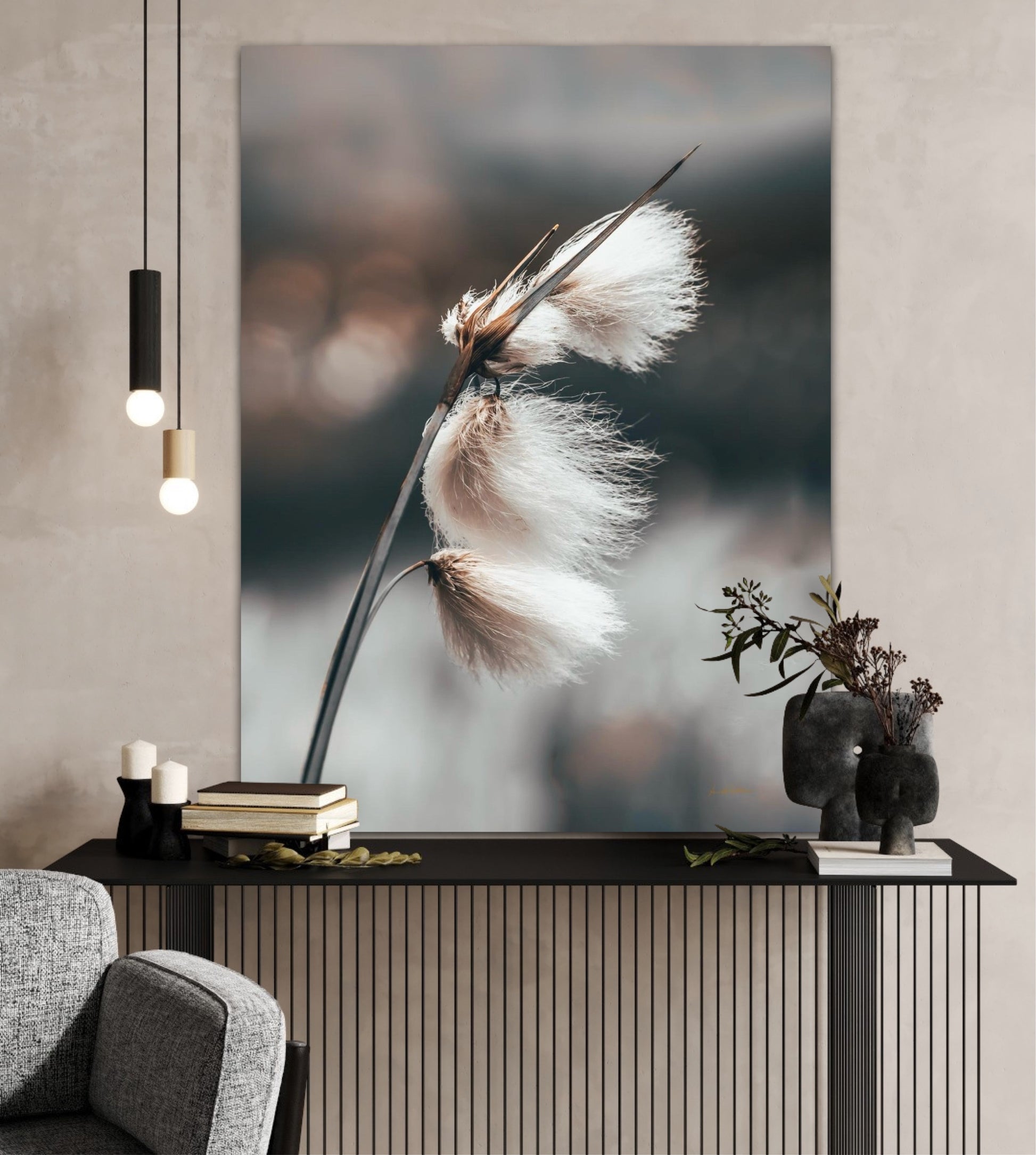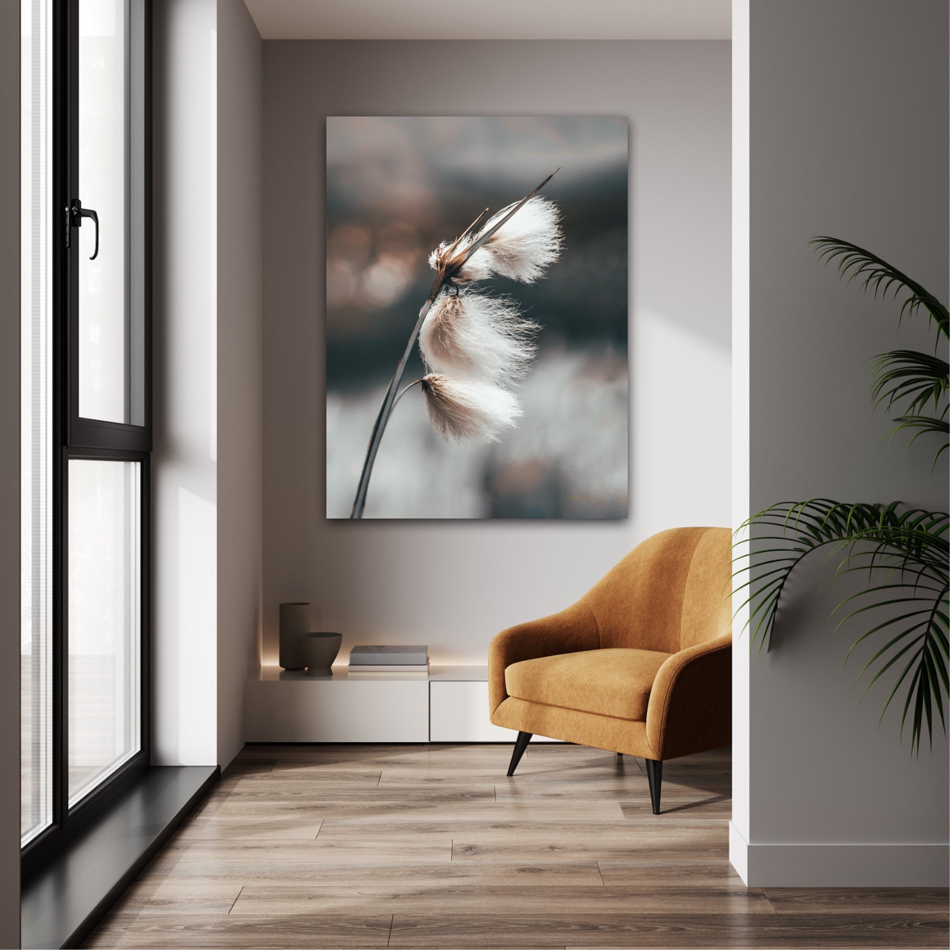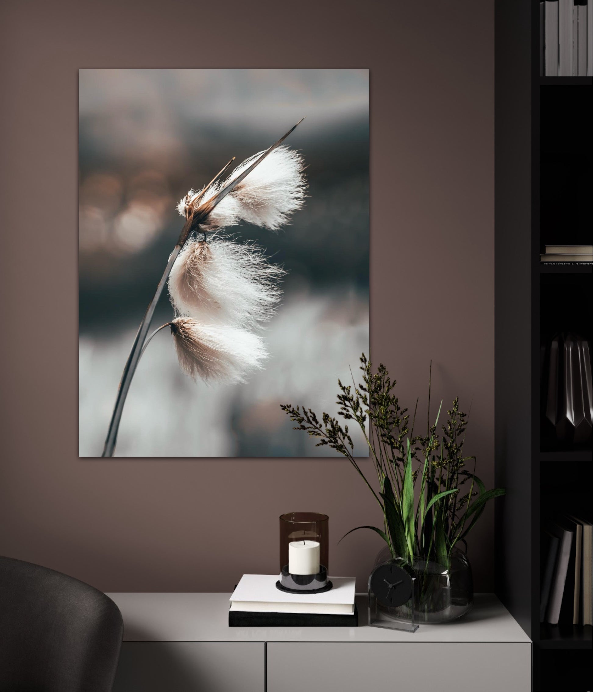 Beautiful and warm photographic art image of cottongrass in the mountain in wonderful earth tones on a dark and light background. Beautiful and peaceful, get the good feeling with this beautiful artwork.