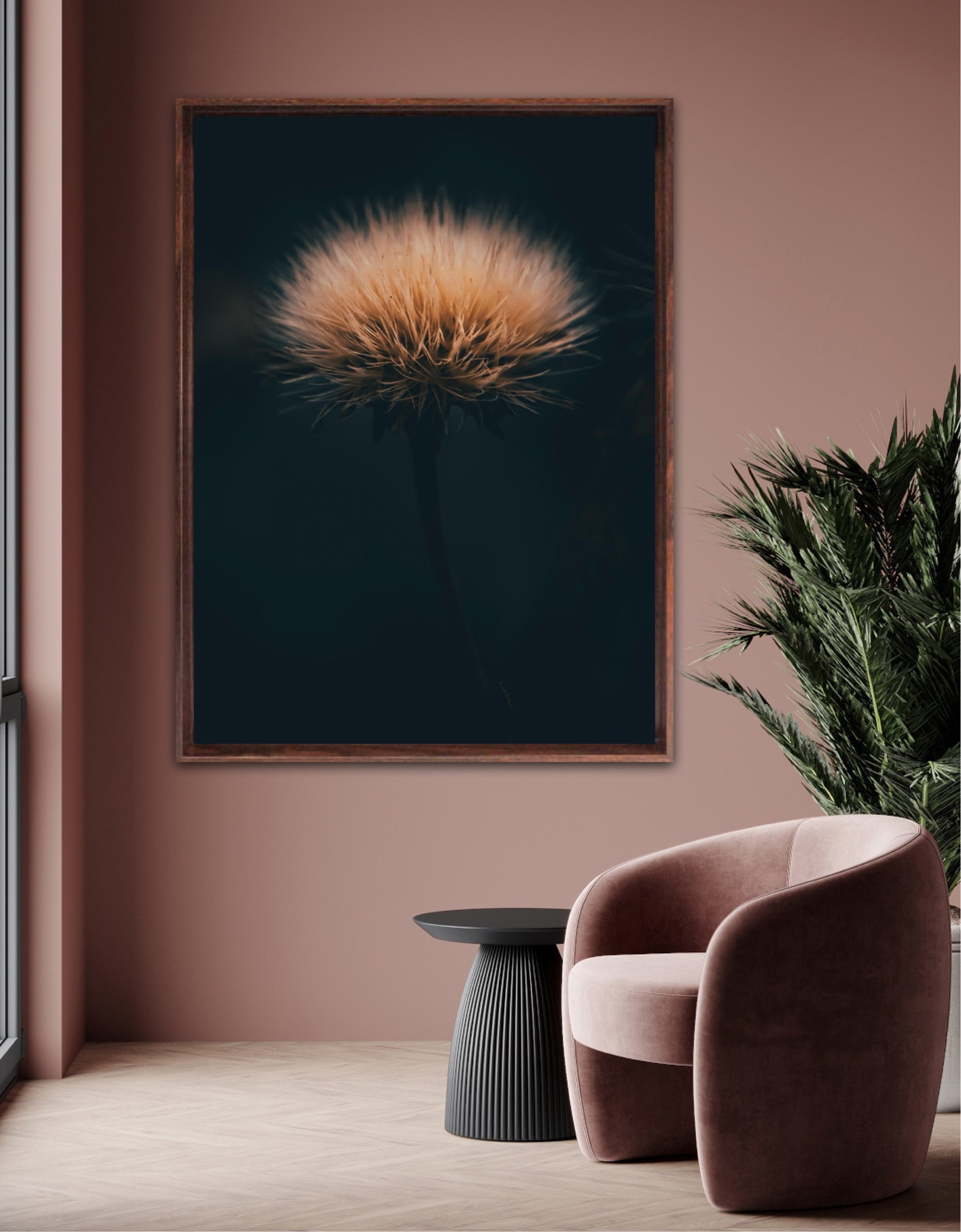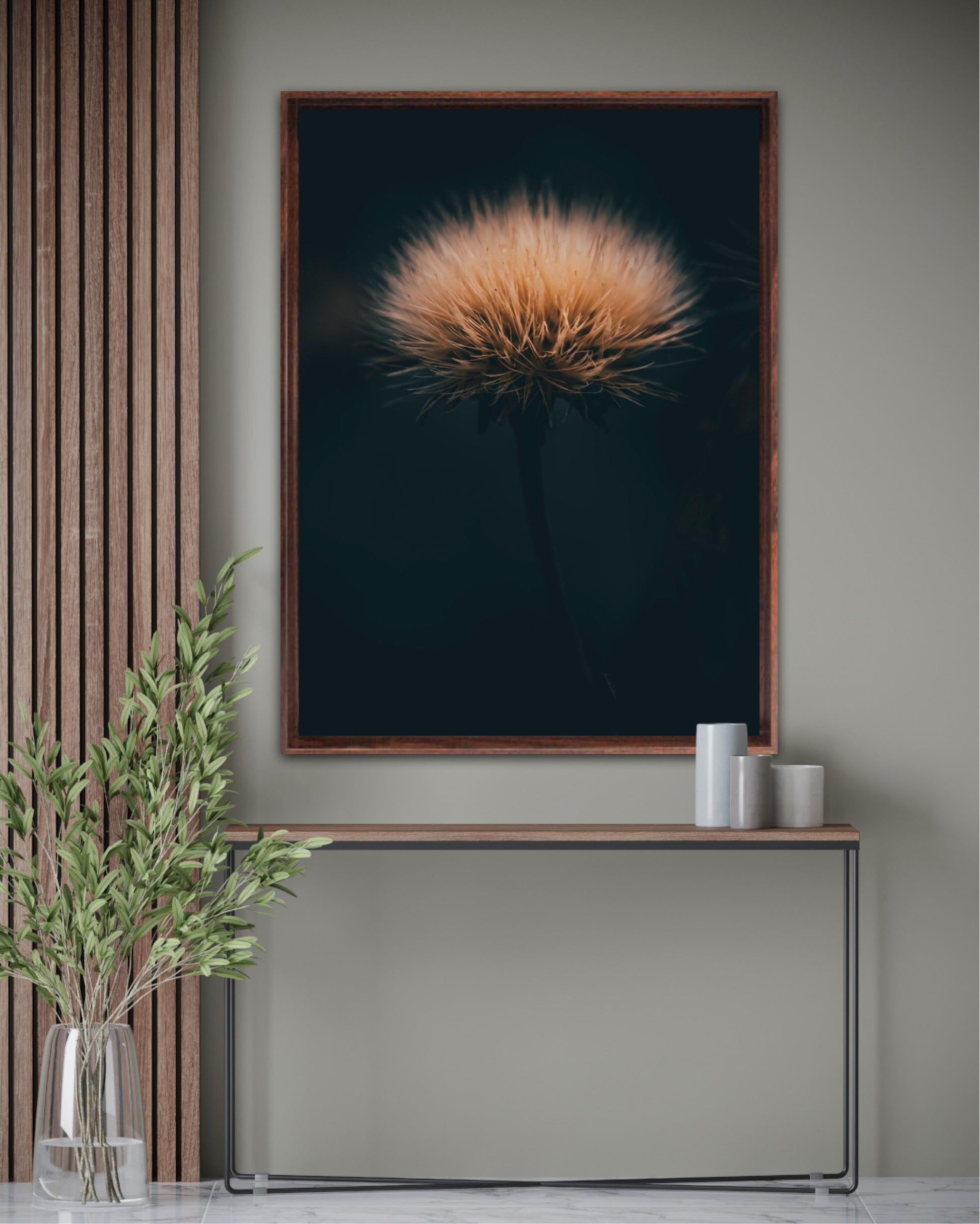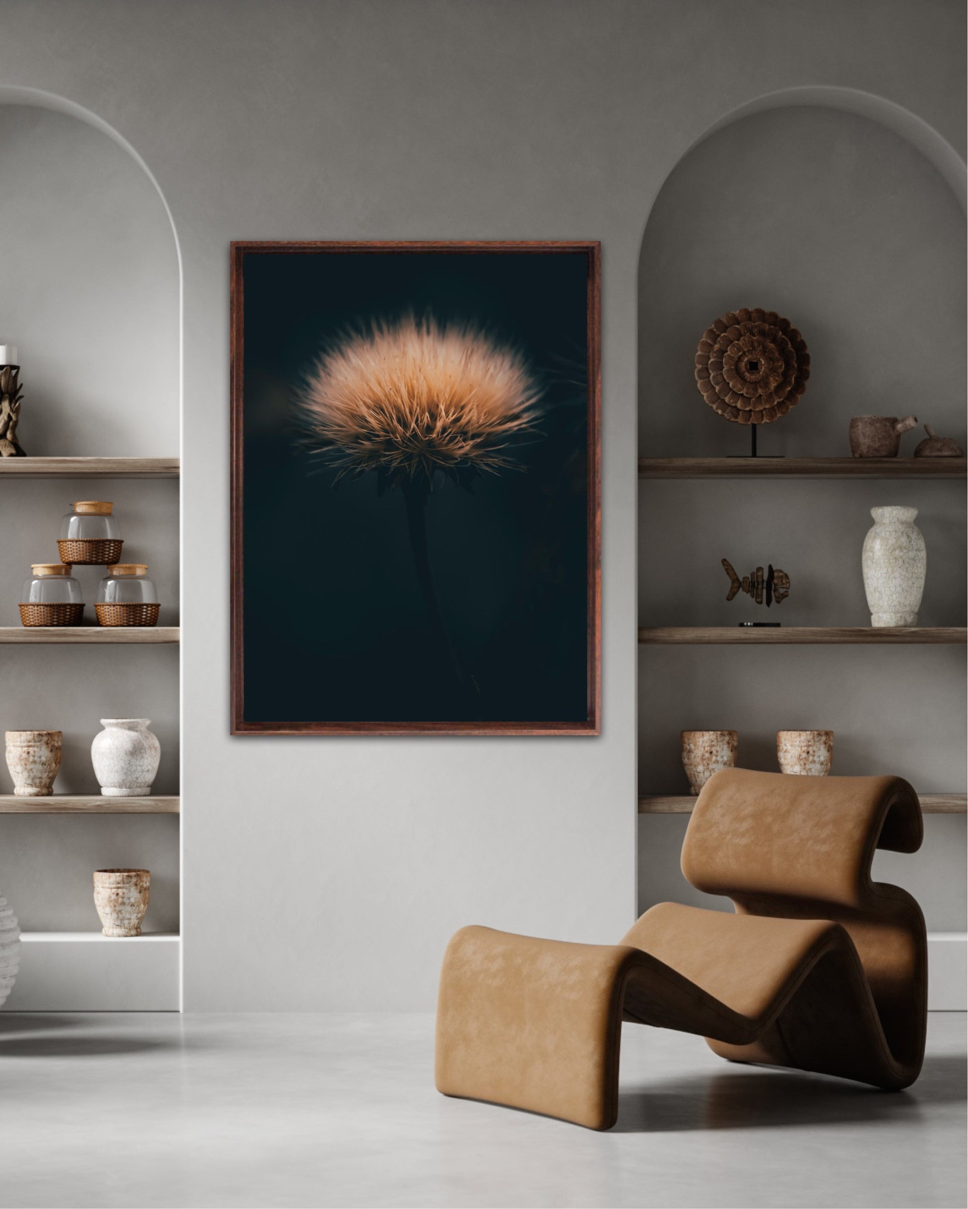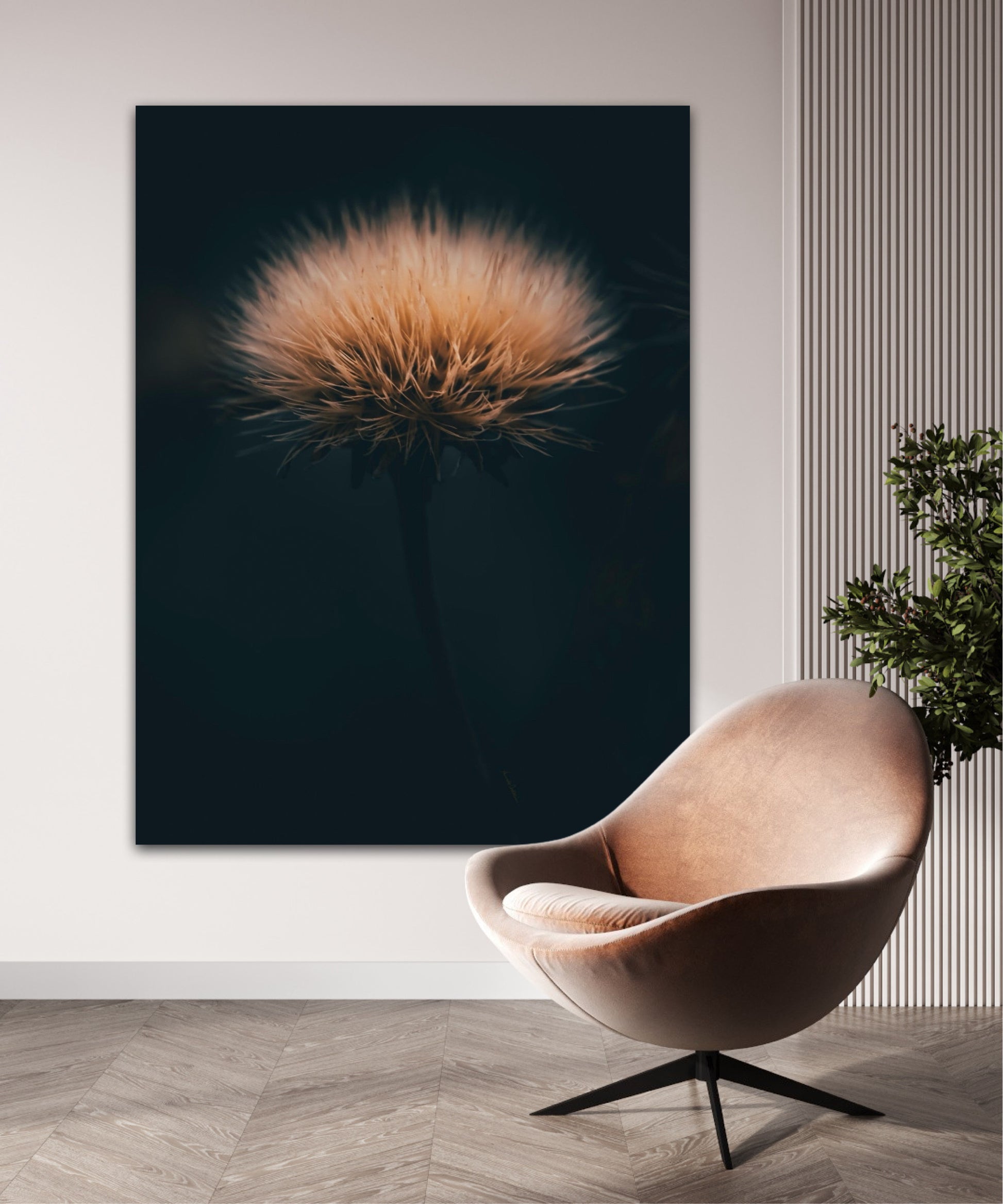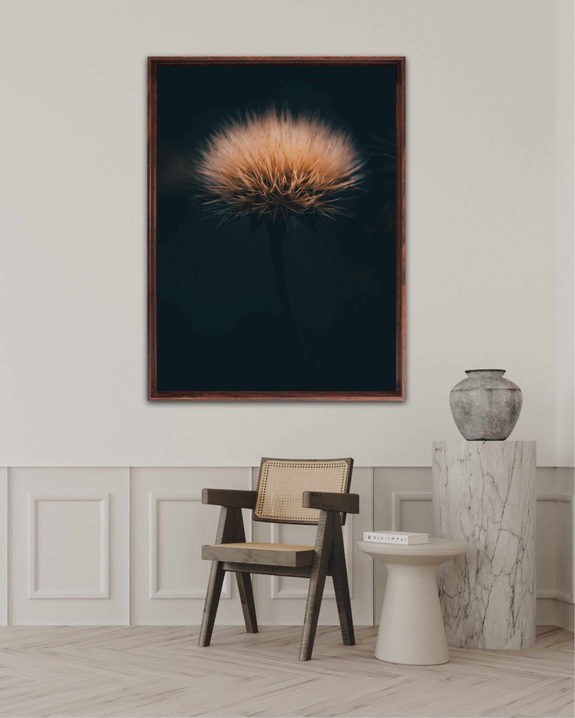 Can you feel how soft it is? Get a unique wall art piece with this beautiful motif, a dandelion seed with lots of fluff. The picture is in earth tones and fits well in modern homes and in the cottage. Get the good feeling and impress your friends and family with this work of art on your wall. Photographic wall art.