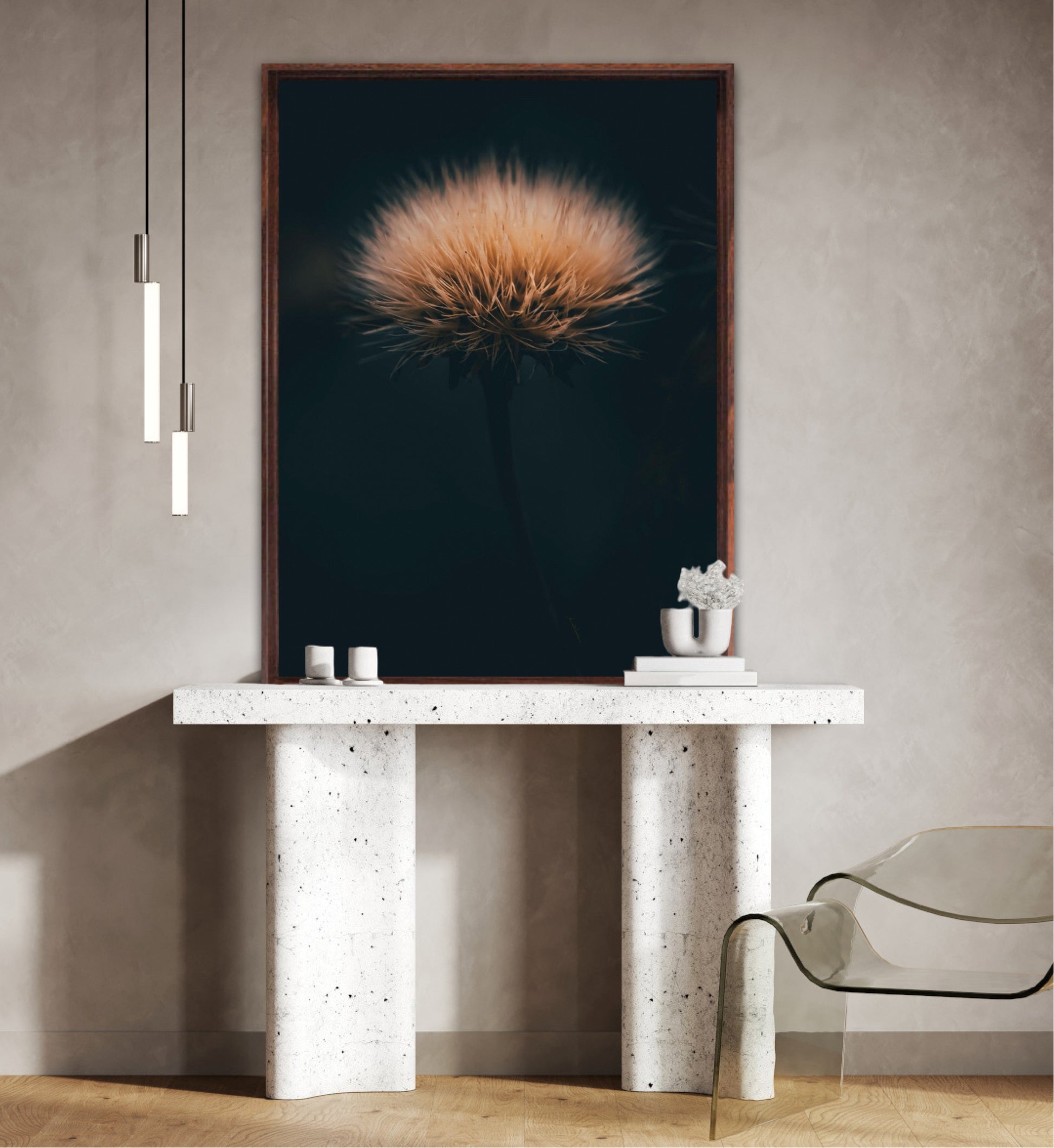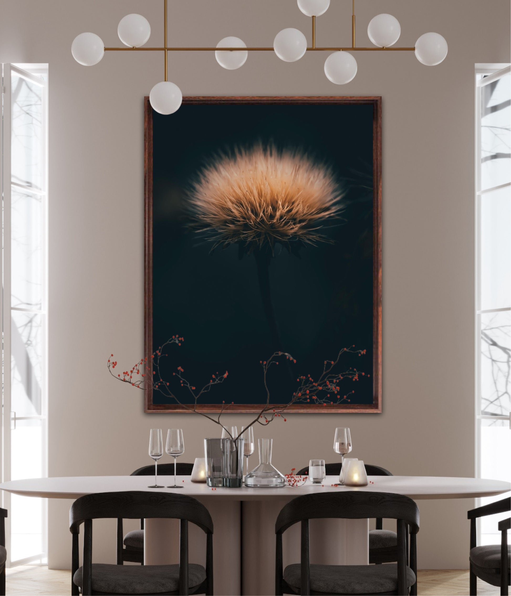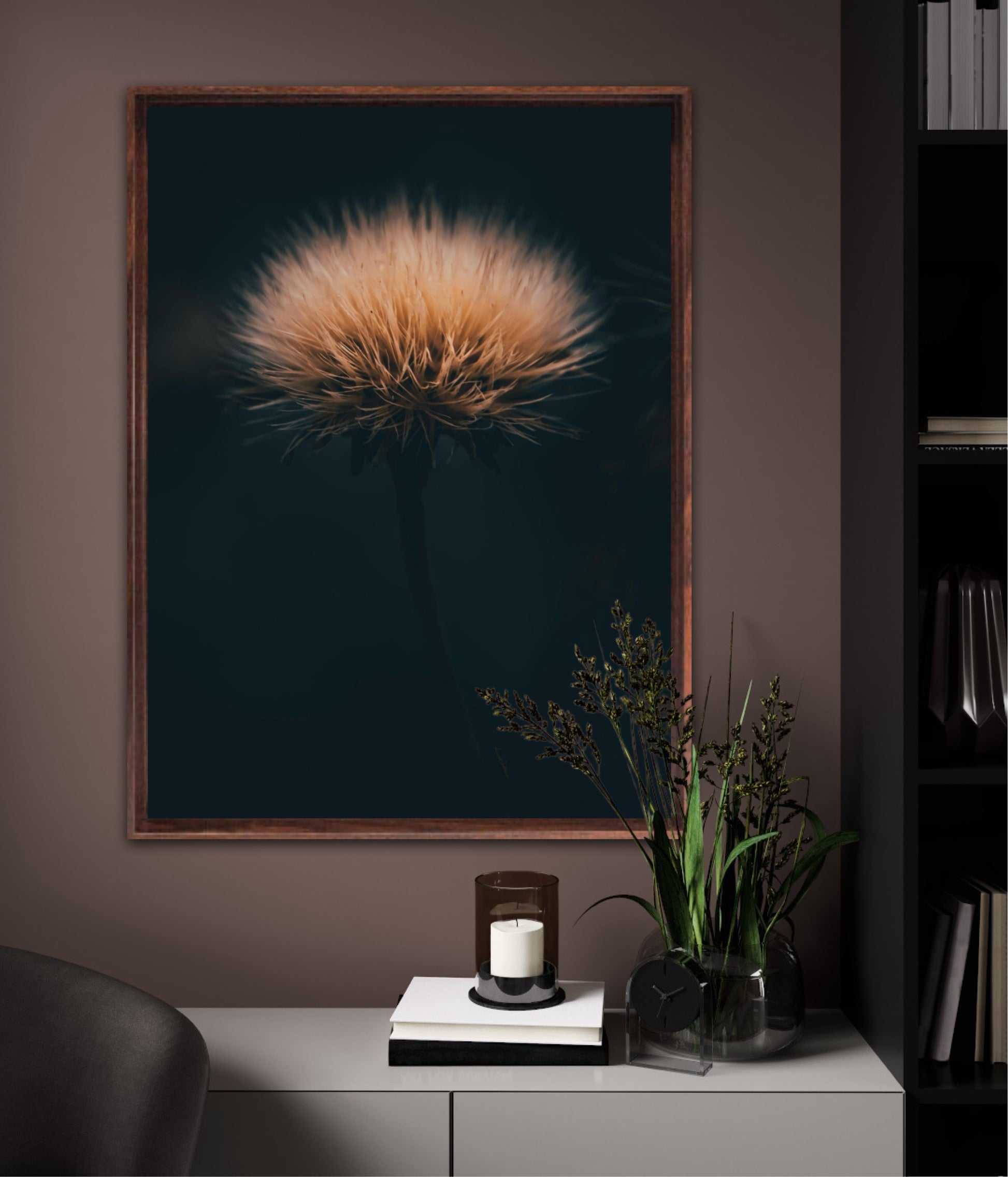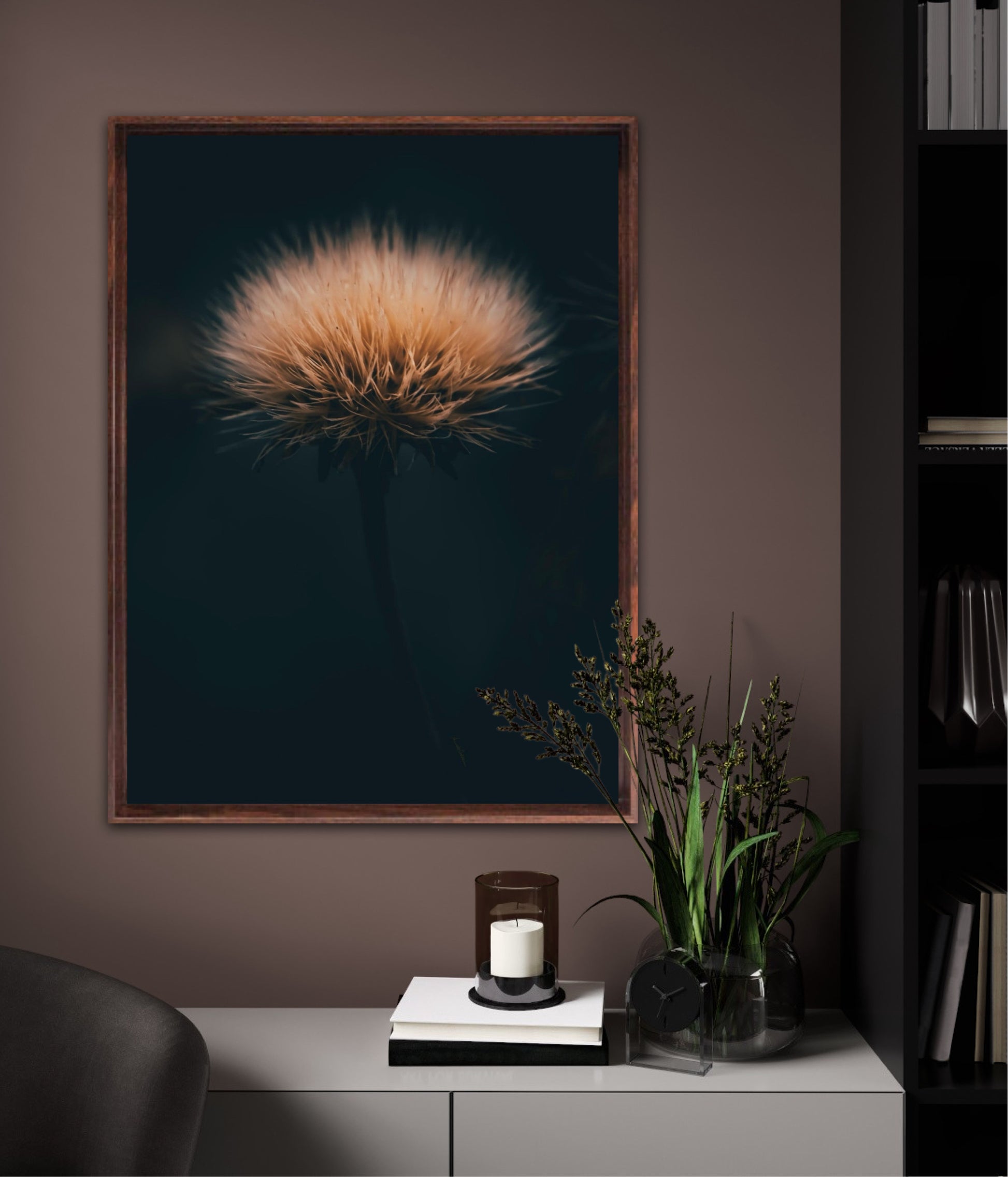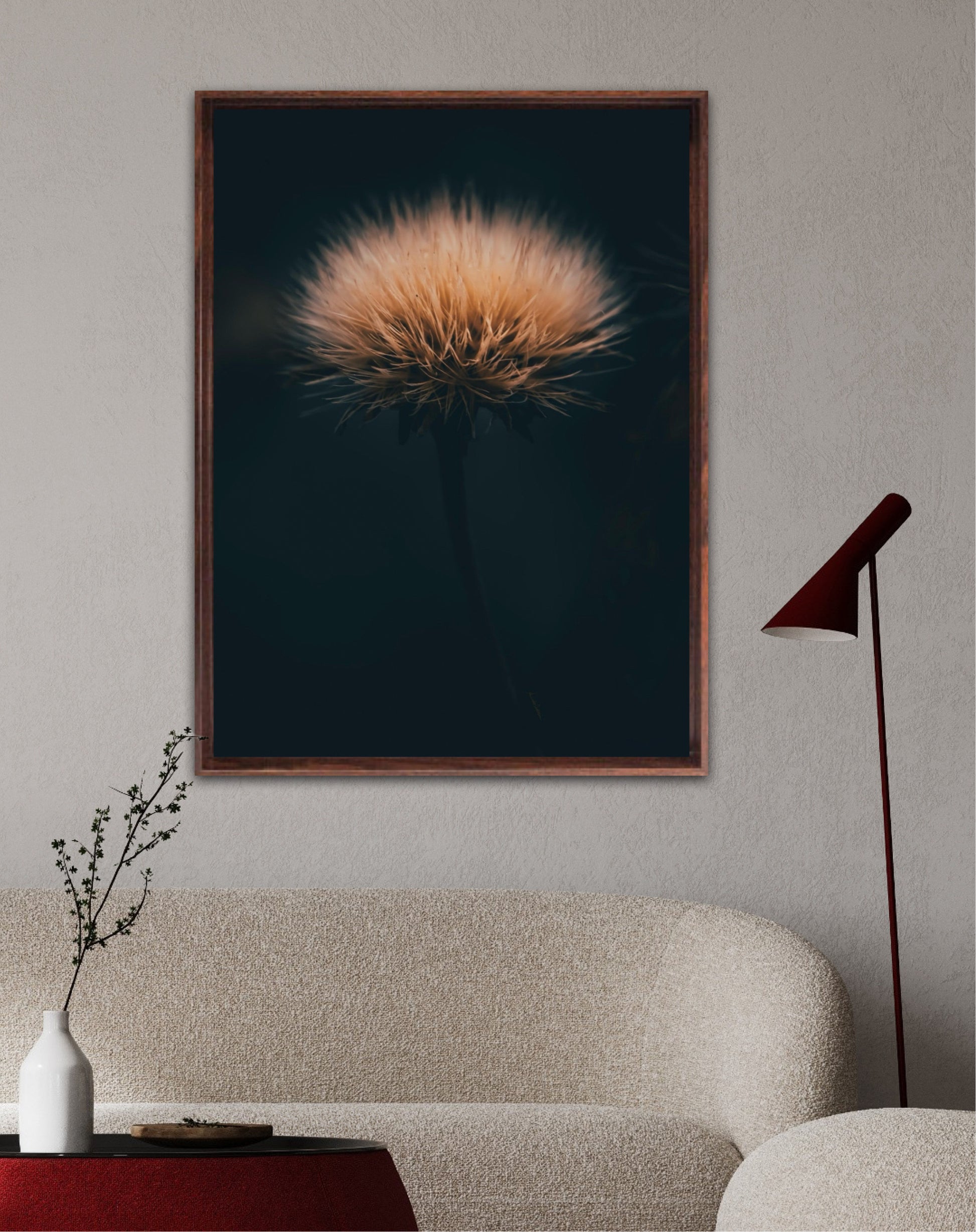 Can you feel how soft it is? Get a unique wall art piece with this beautiful motif, a dandelion seed with lots of fluff. The picture is in earth tones and fits well in modern homes and in the cottage. Get the good feeling and impress your friends and family with this work of art on your wall. Photographic wall art.