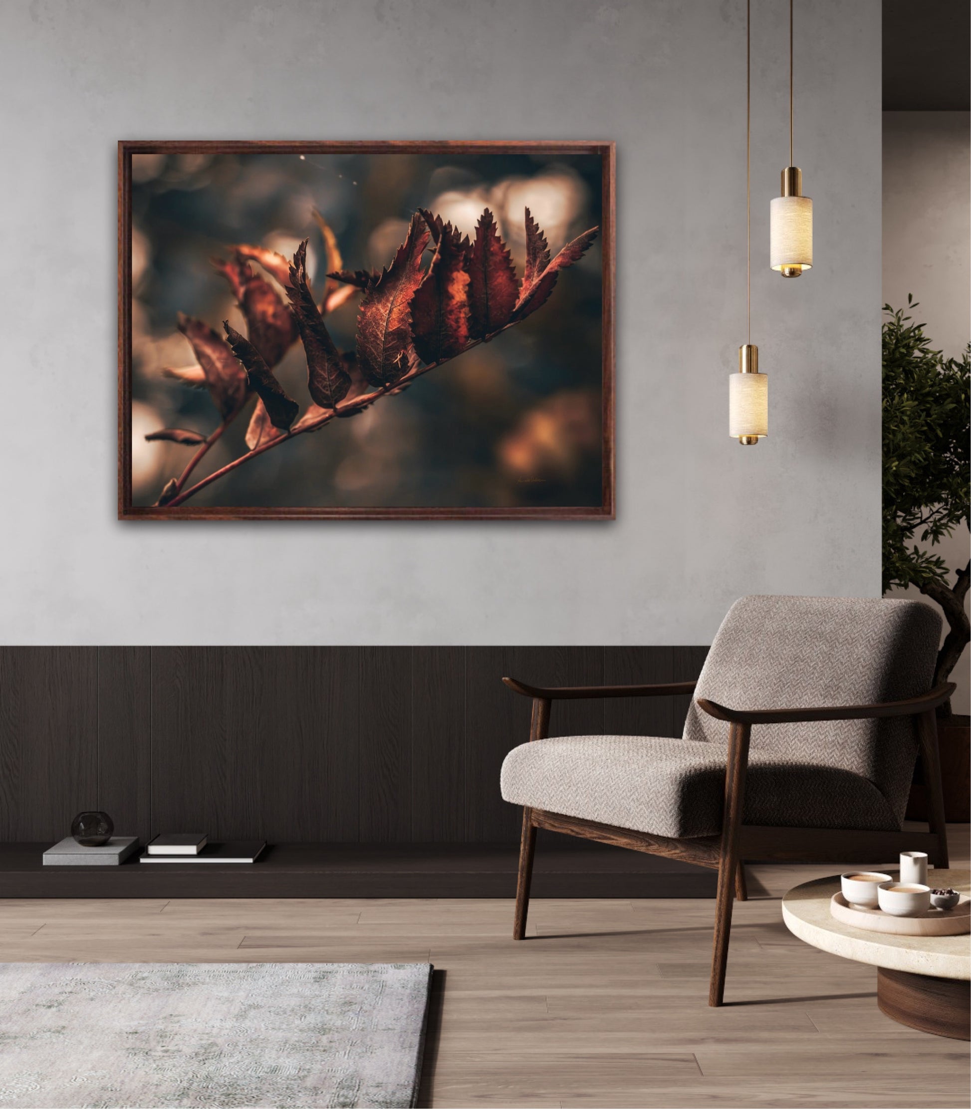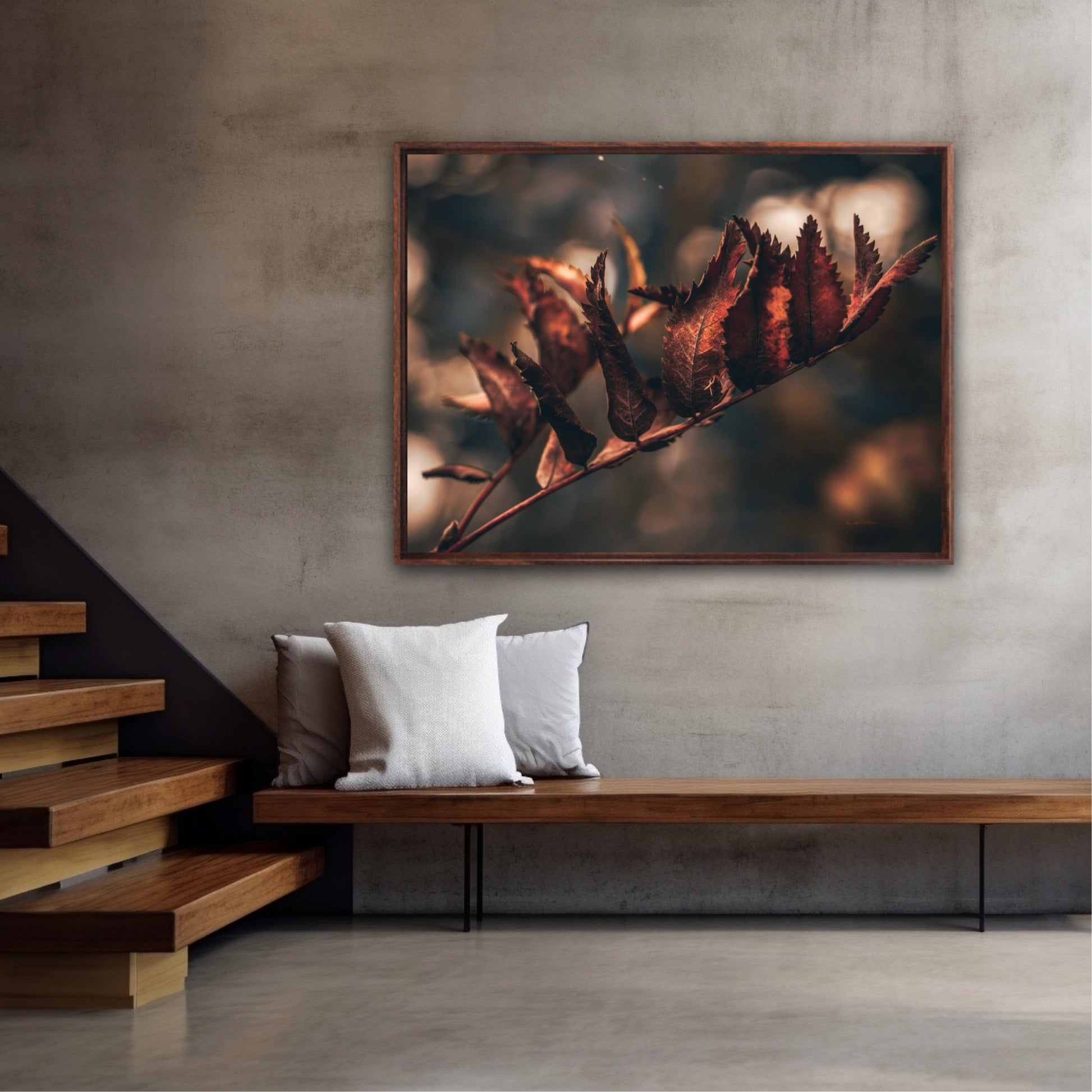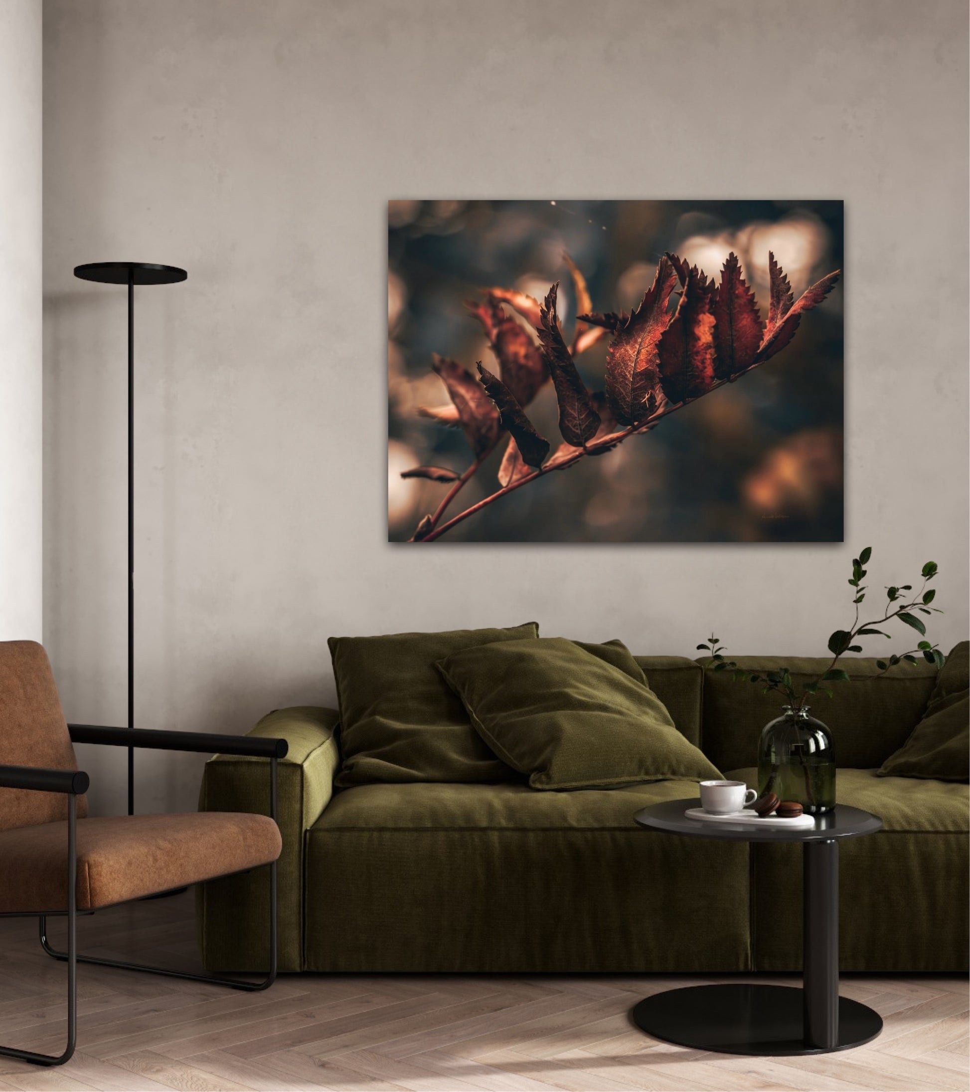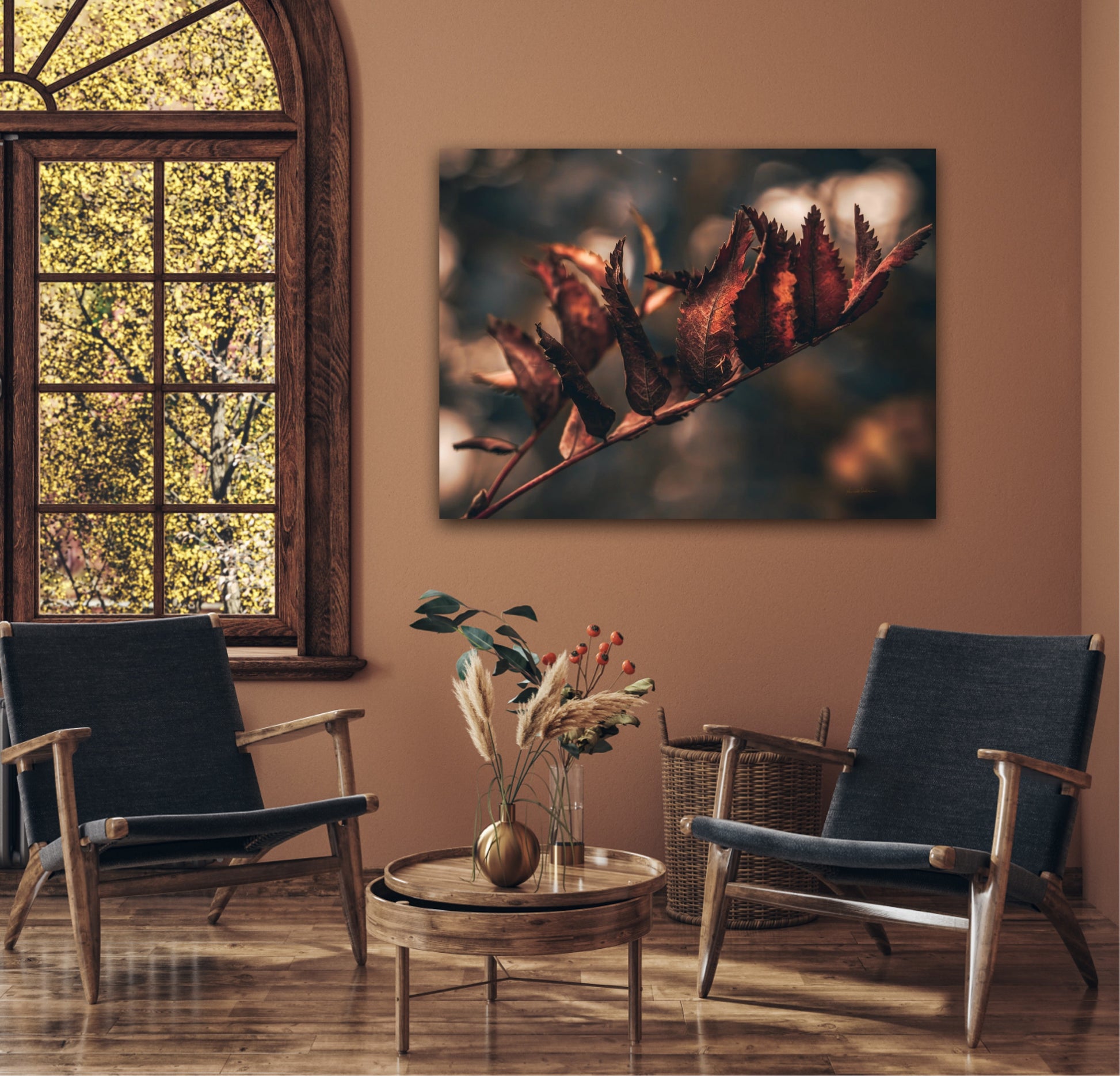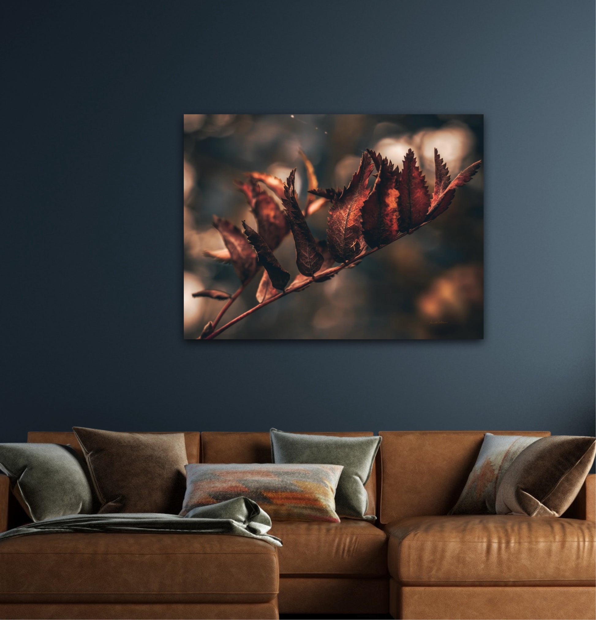 Beautiful photographic wall art of a withered leaves in deep rust colours on a beautiful light in background. This wall art has beautiful colour tones and interesting light and gives your home that little extra.