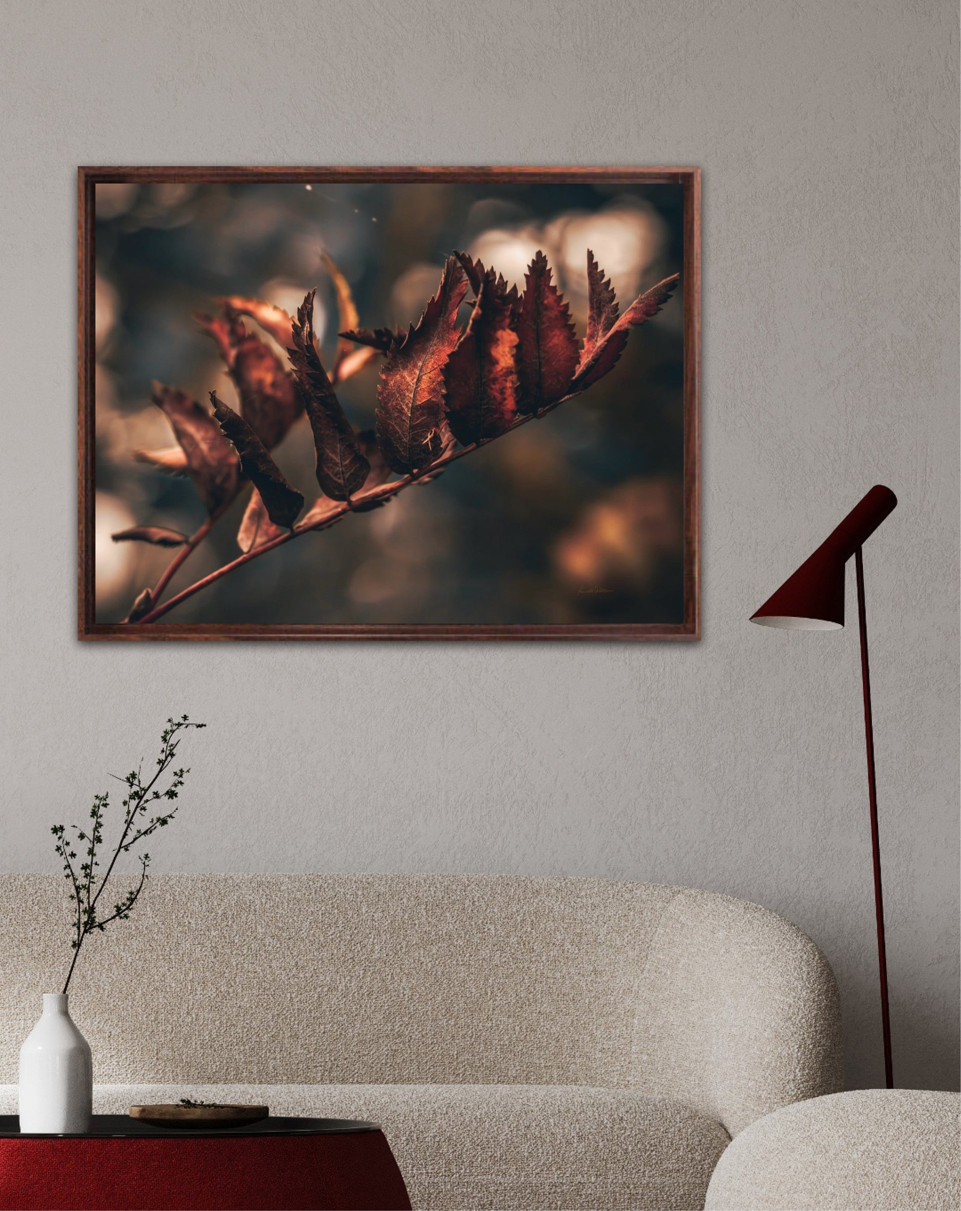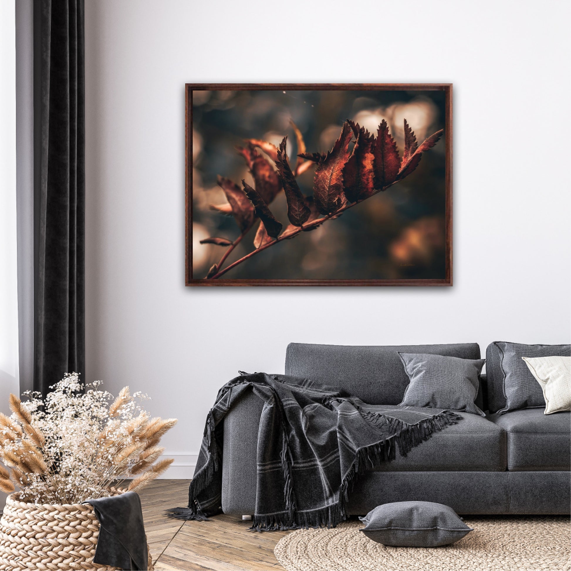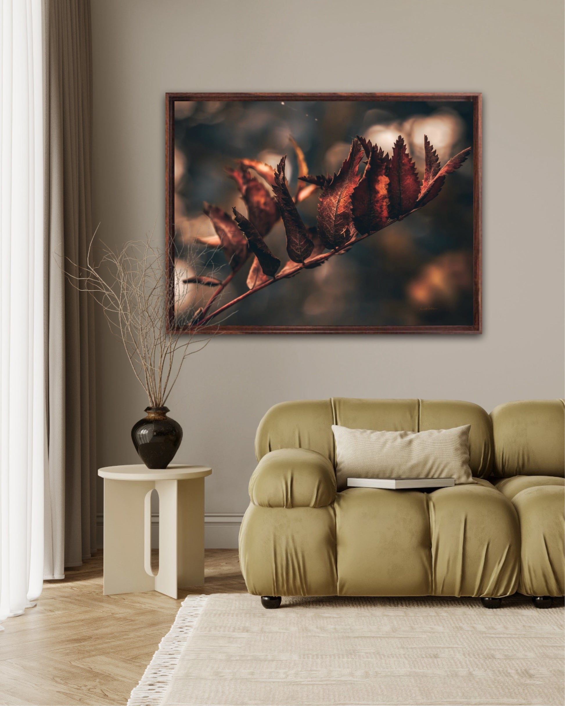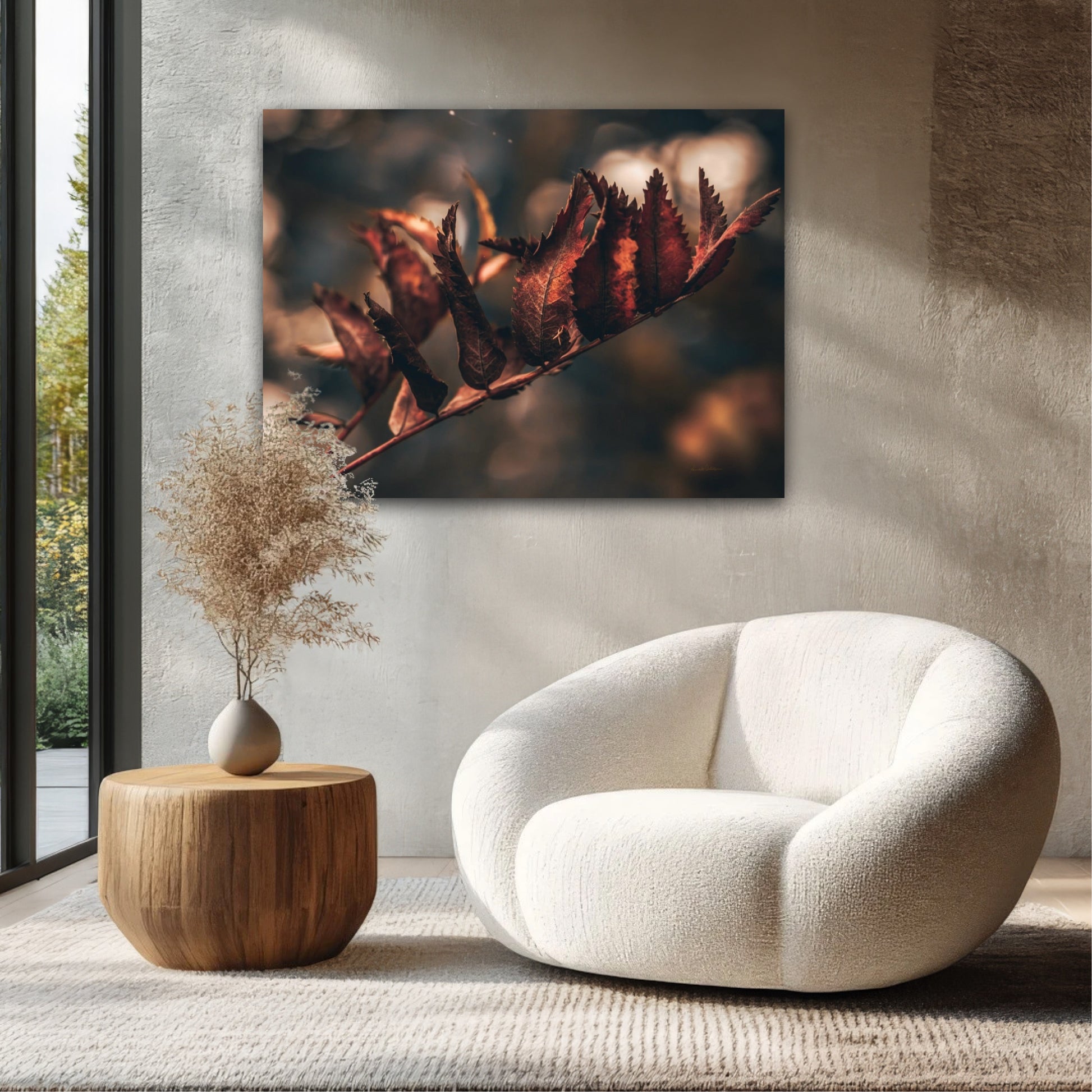 Beautiful photographic wall art of a withered leaves in deep rust colours on a beautiful light in background. This wall art has beautiful colour tones and interesting light and gives your home that little extra.