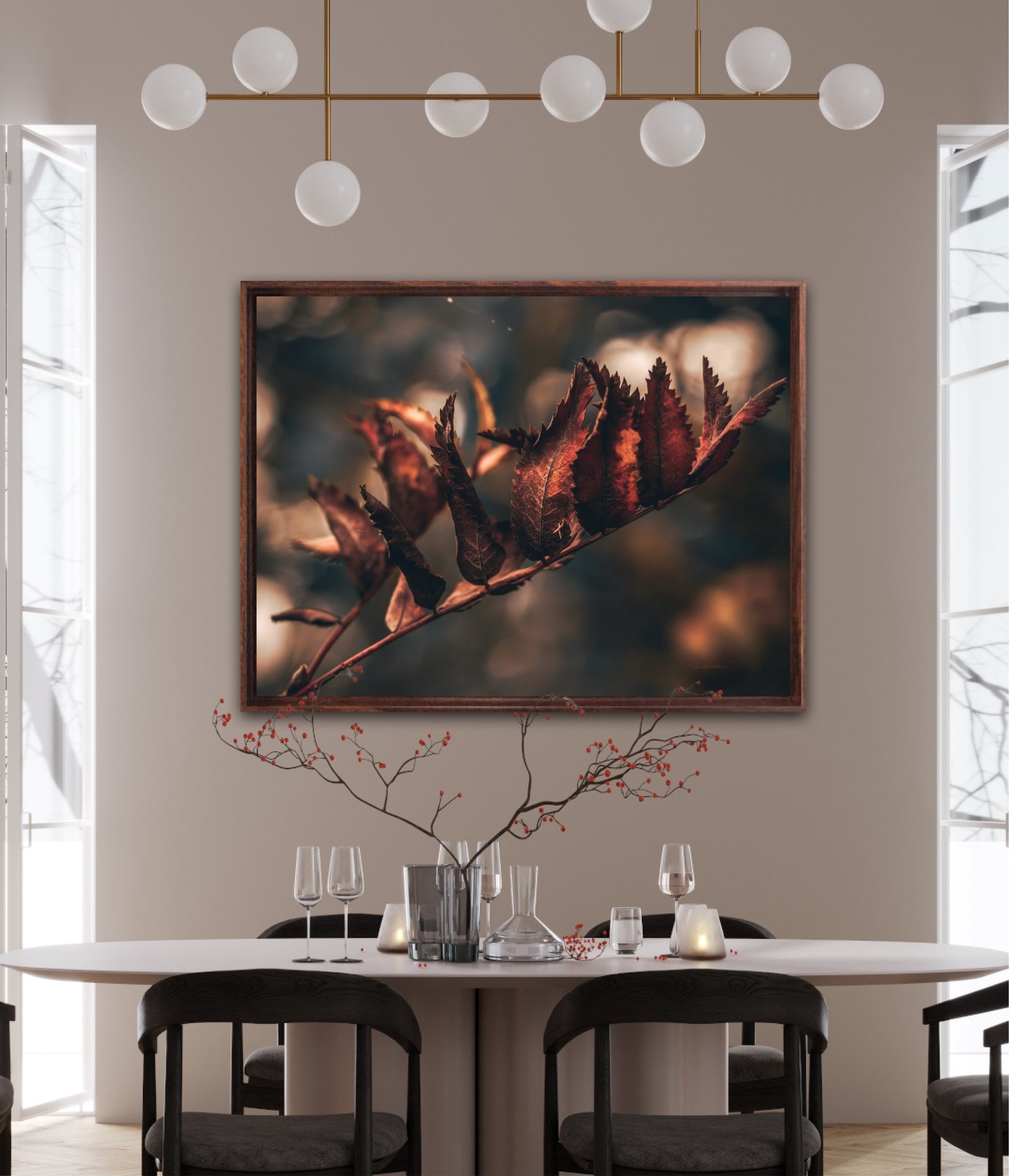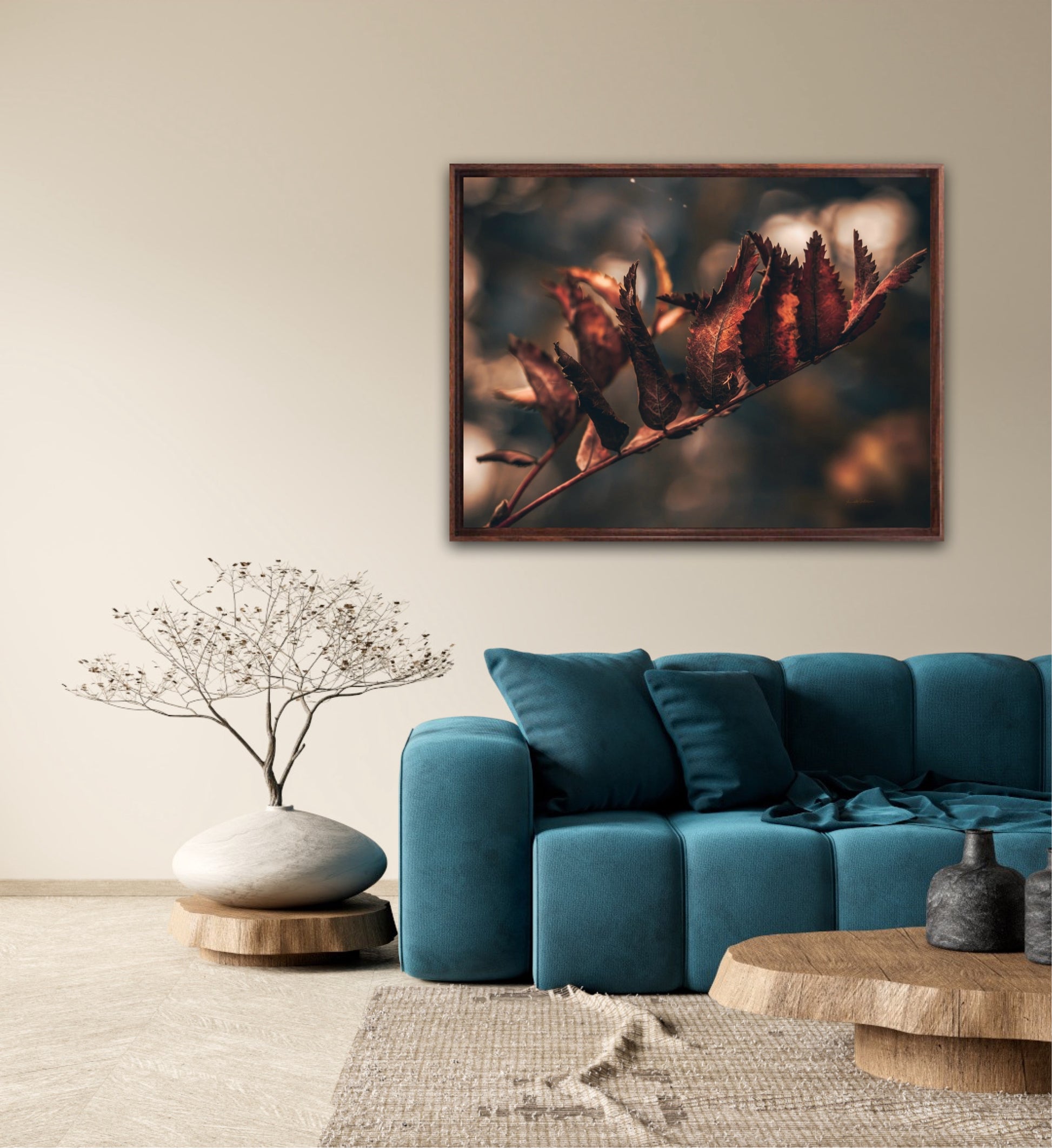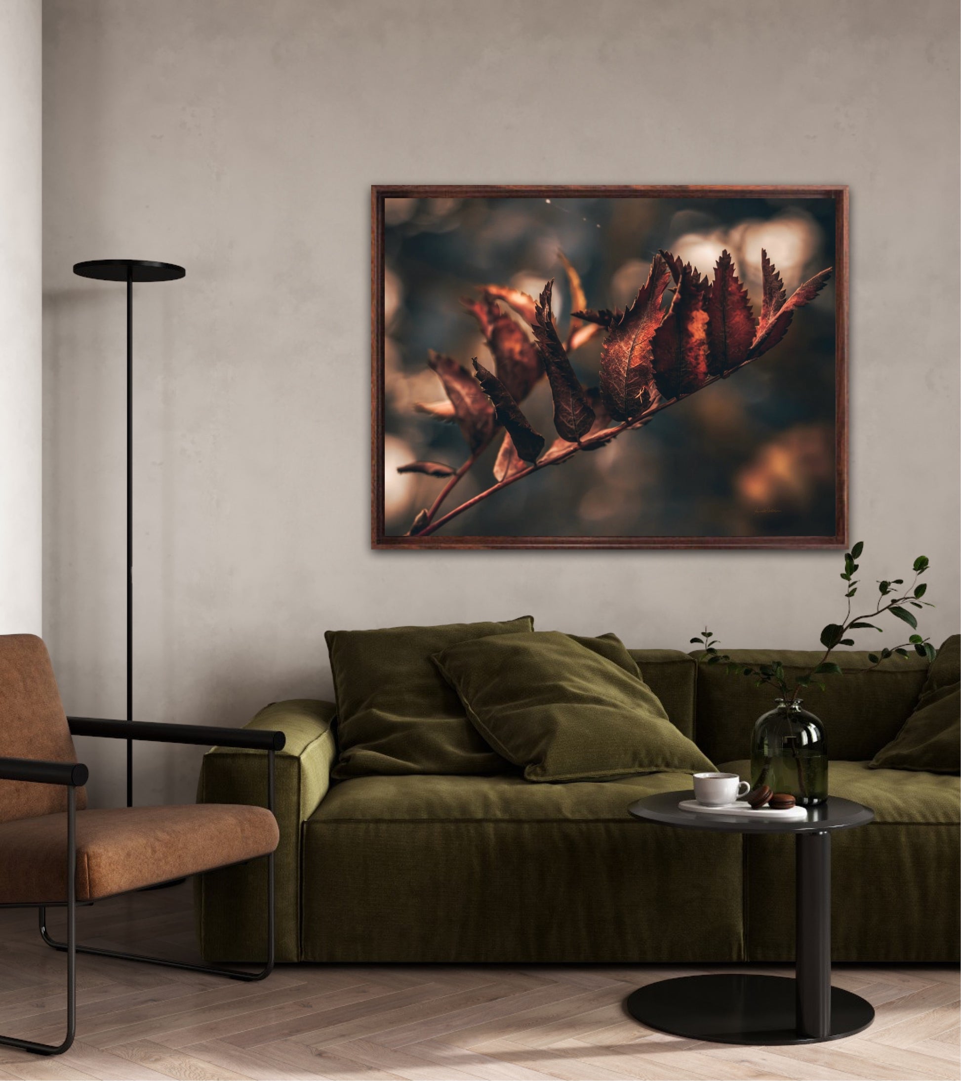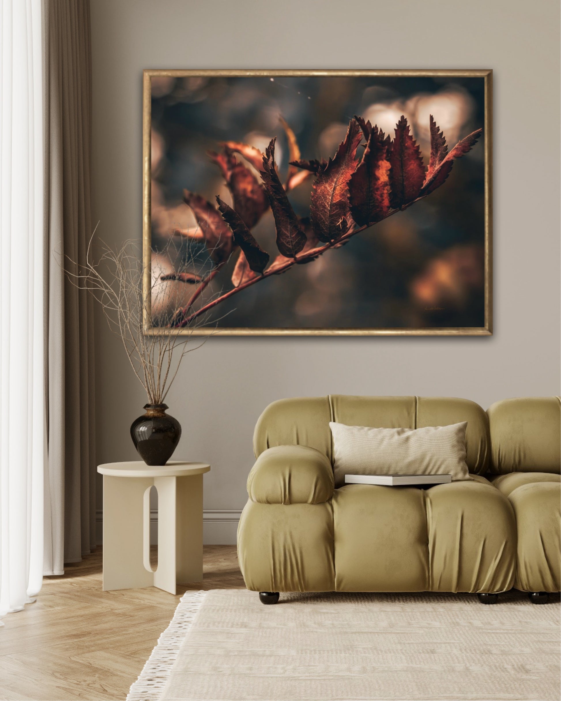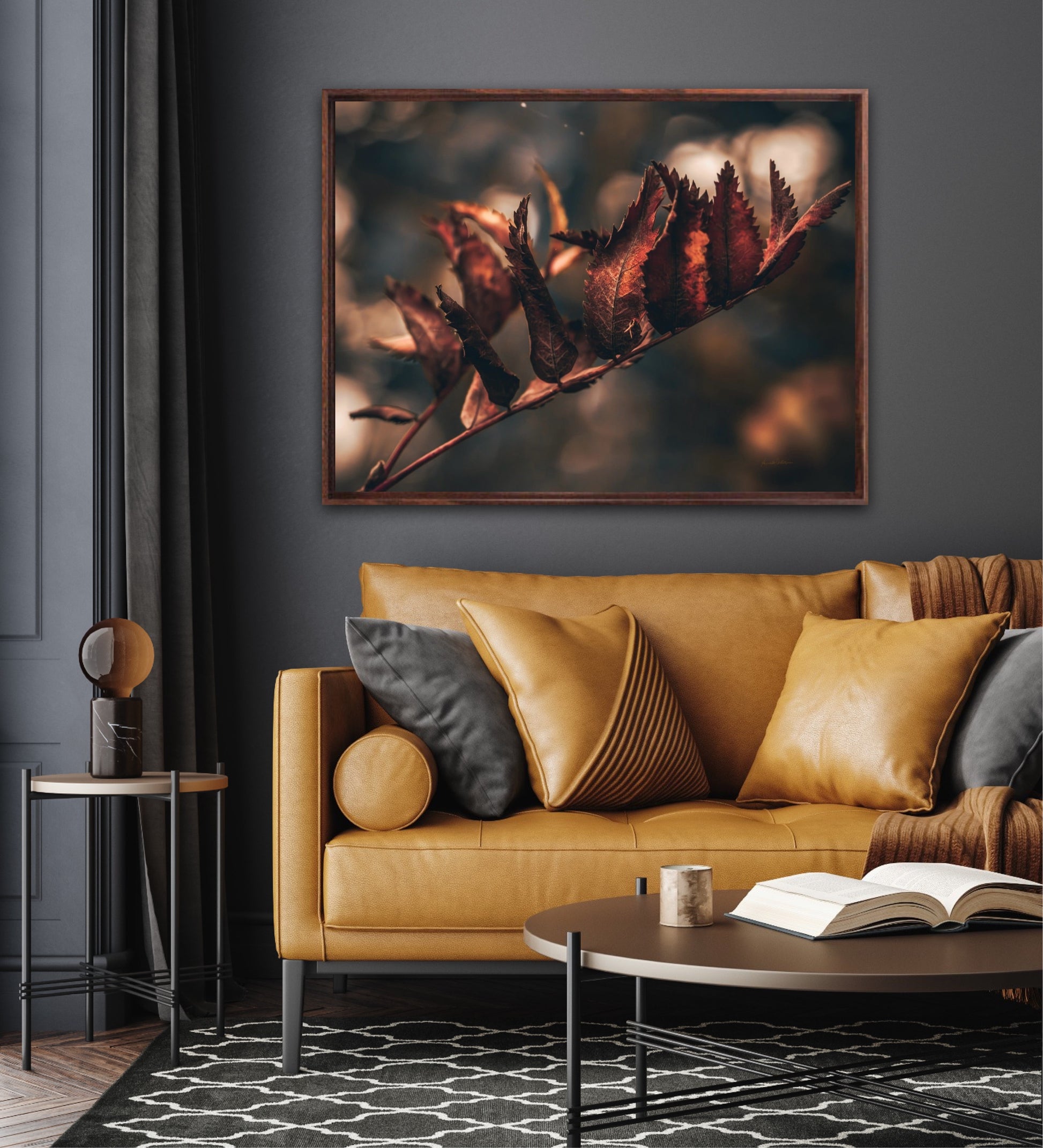 Beautiful photographic wall art of a withered leaves in deep rust colours on a beautiful light in background. This wall art has beautiful colour tones and interesting light and gives your home that little extra.